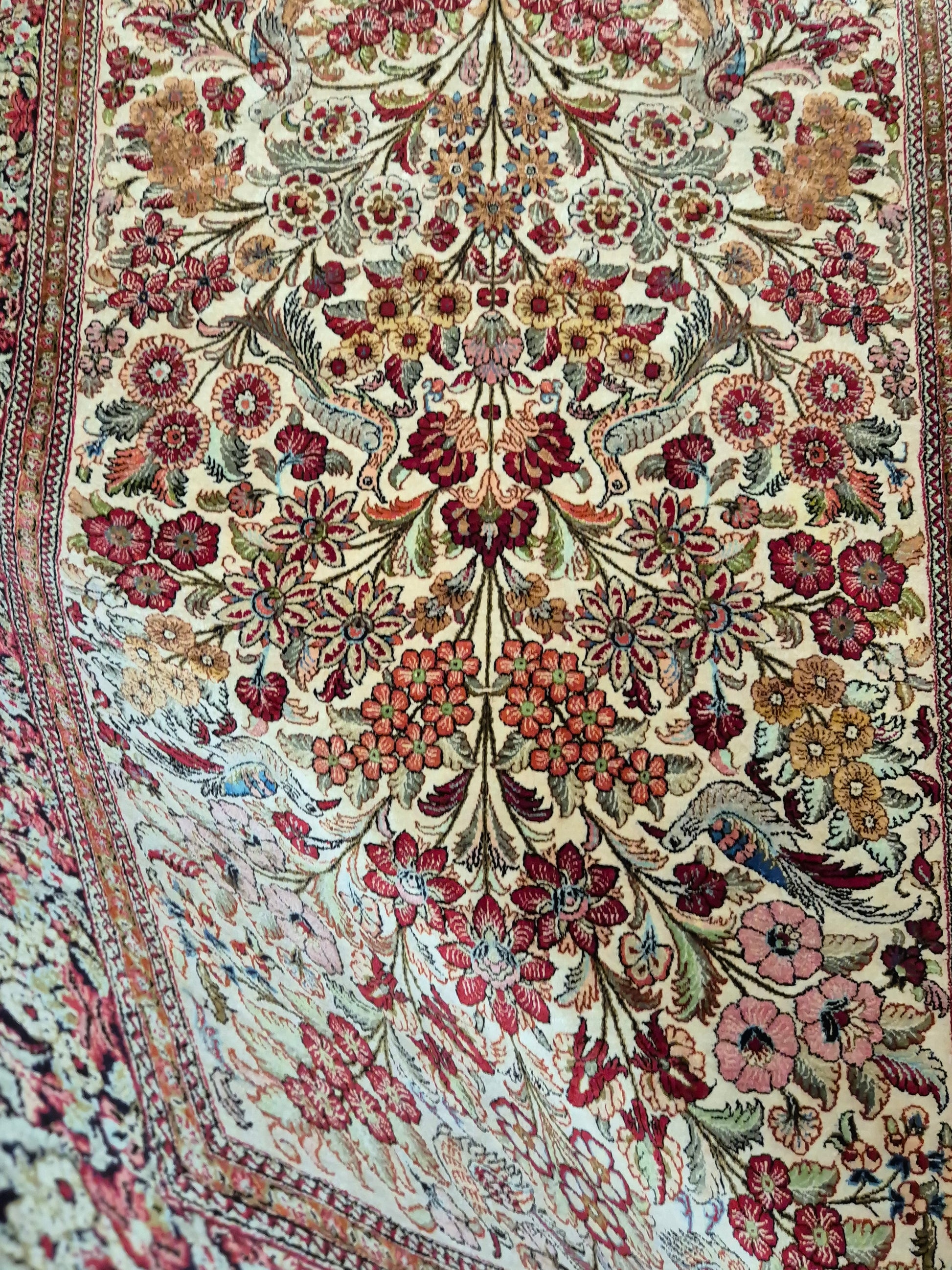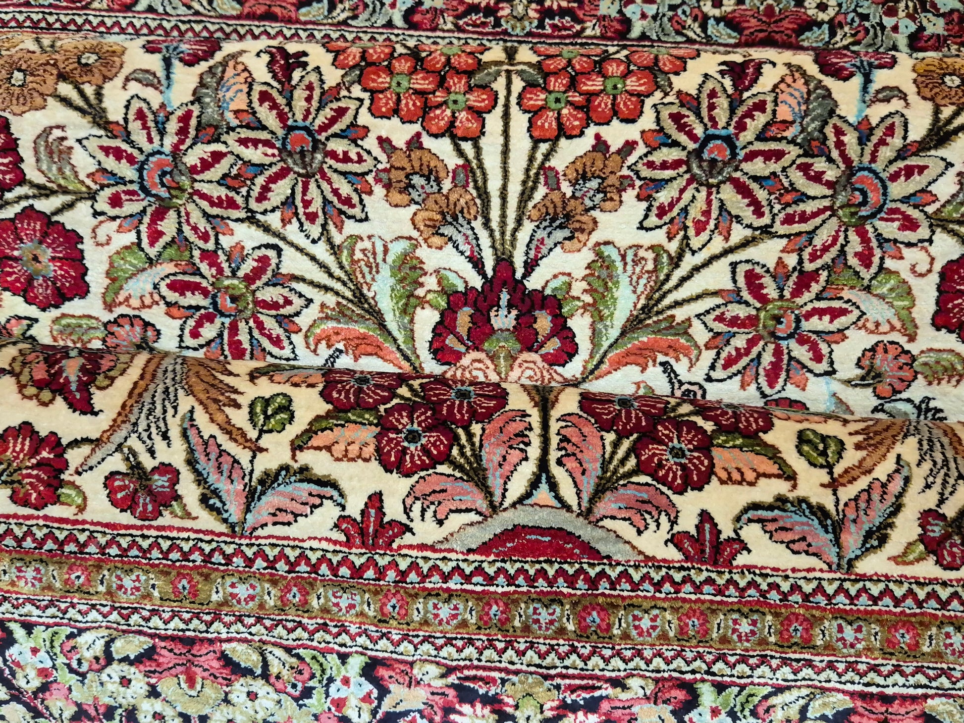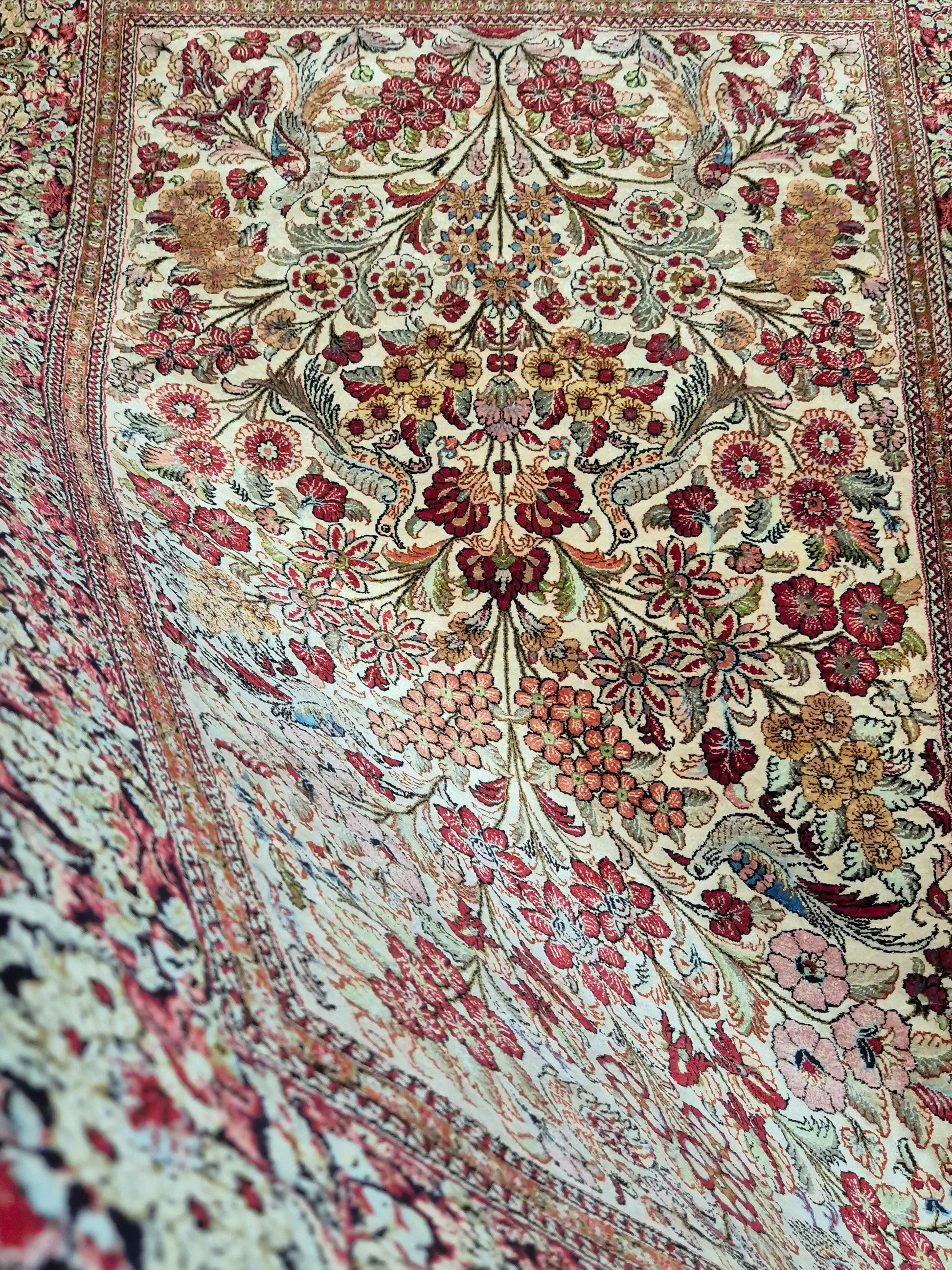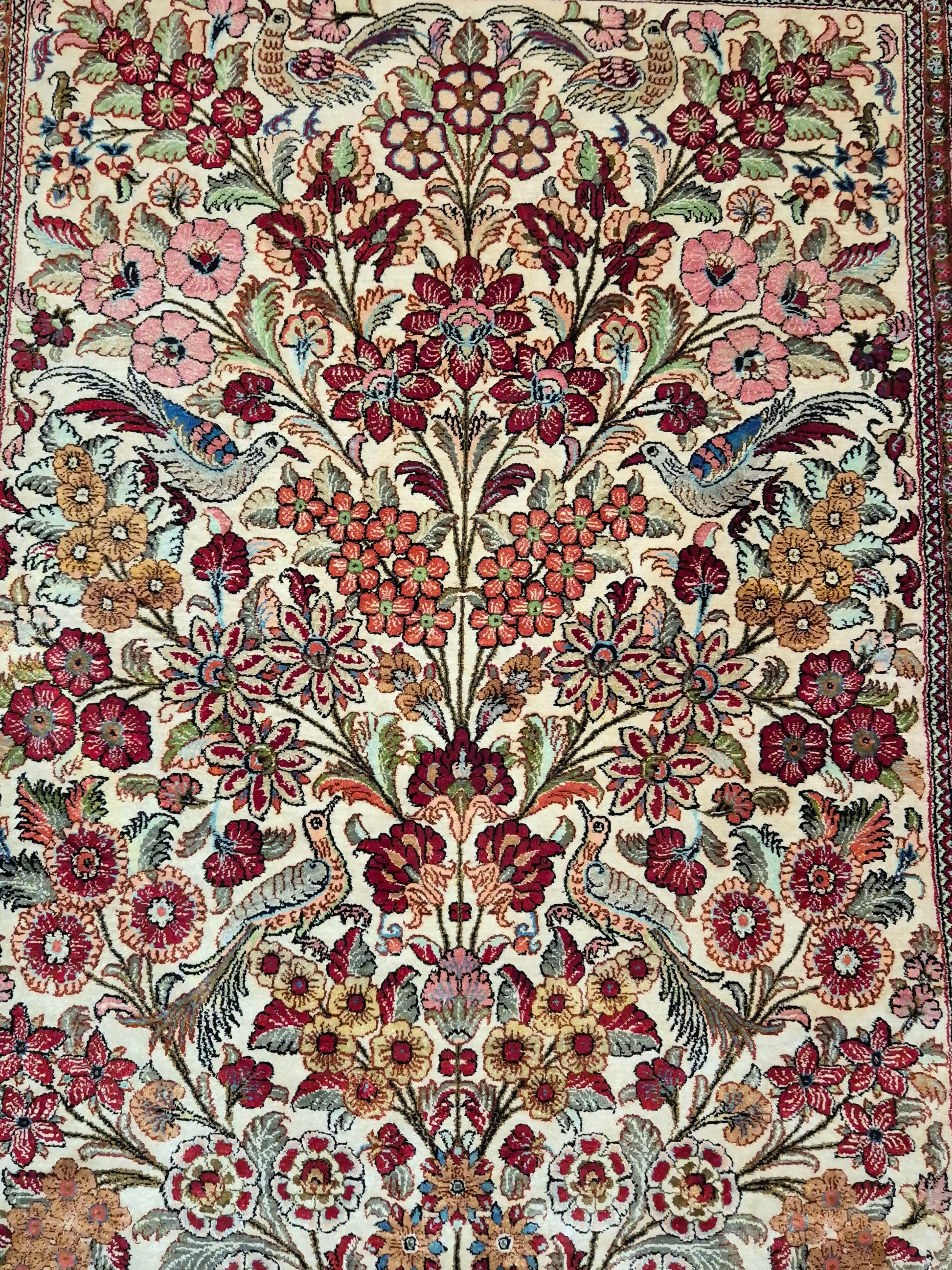angeboten wird ein edler Ghom Teppich aus 100 % Seide auf Seide, handgeknüpft in feiner Ausführung. Das Motiv zeigt den klassischen Lebensbaum, reich geschmückt mit Blüten in kräftigen Farben sowie kunstvoll eingefügten Vögeln. Der helle Fond bringt die detailreichen floralen Motive eindrucksvoll zur Geltung, während die mehrfache Bordüre in warmen Rottönen mit floralen Ornamenten das Bild harmonisch einfasst.
