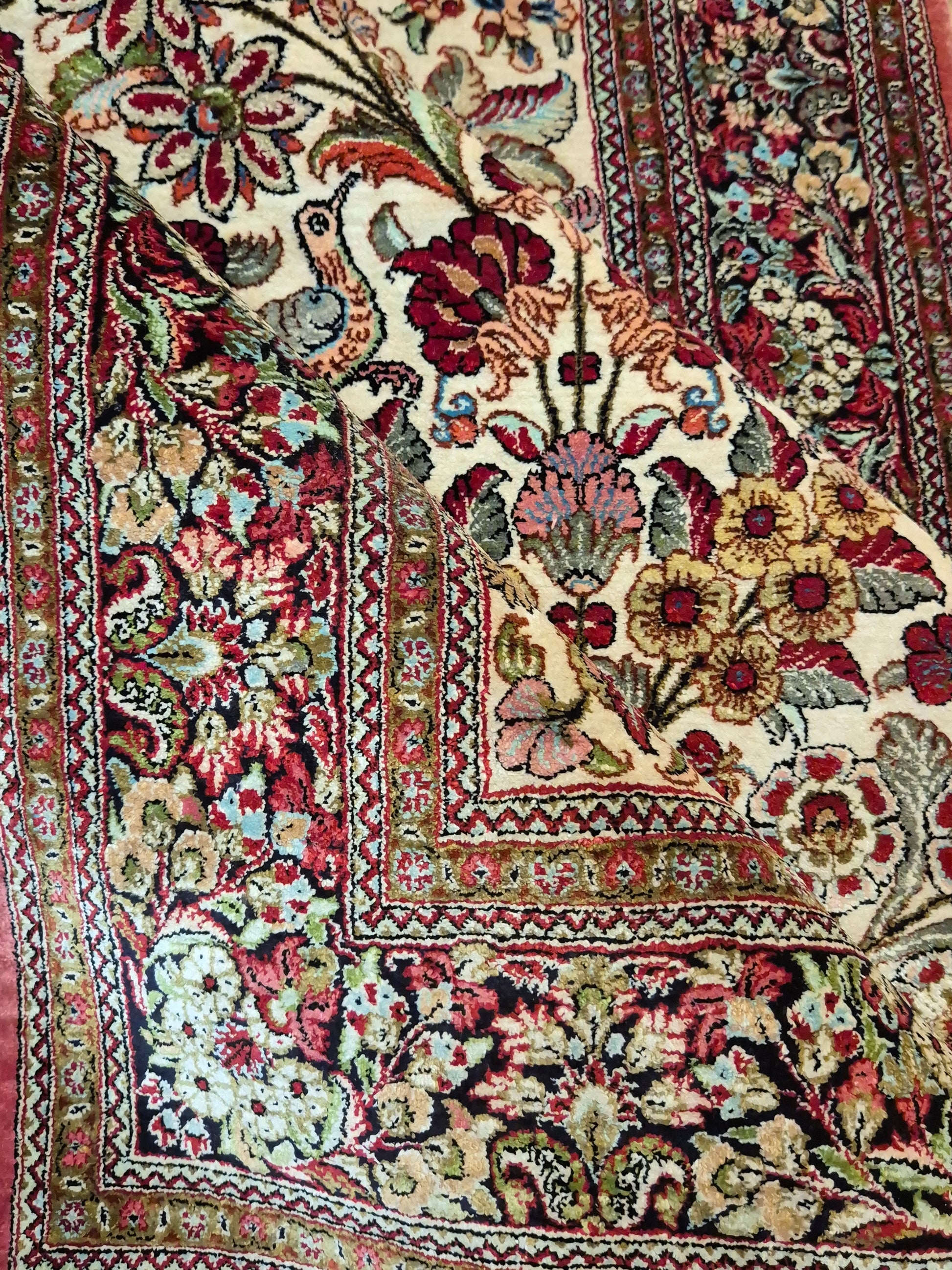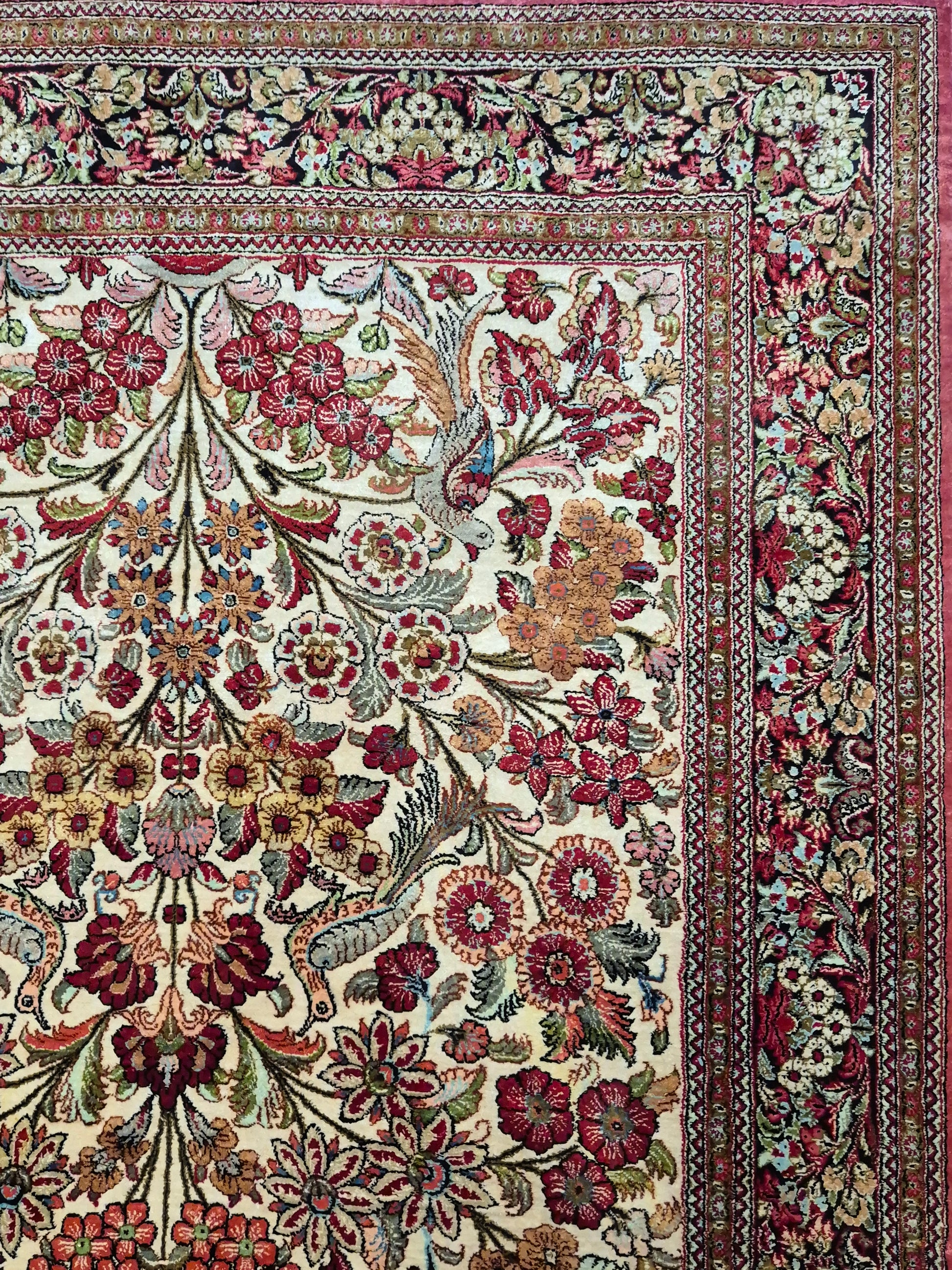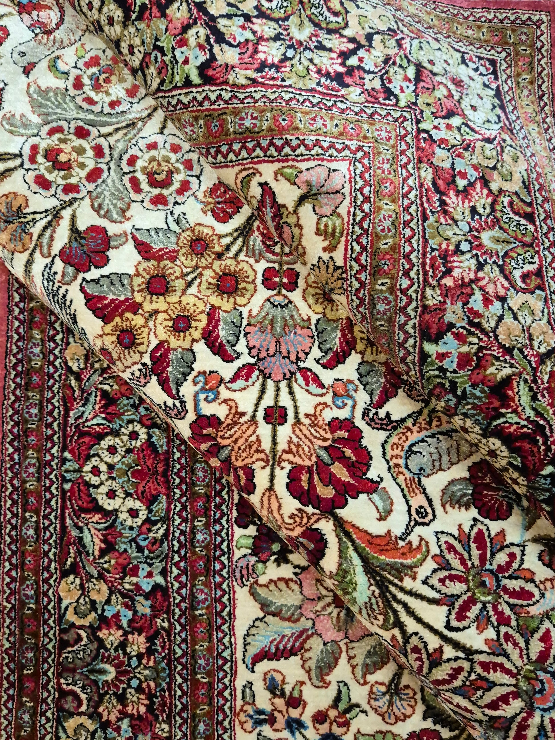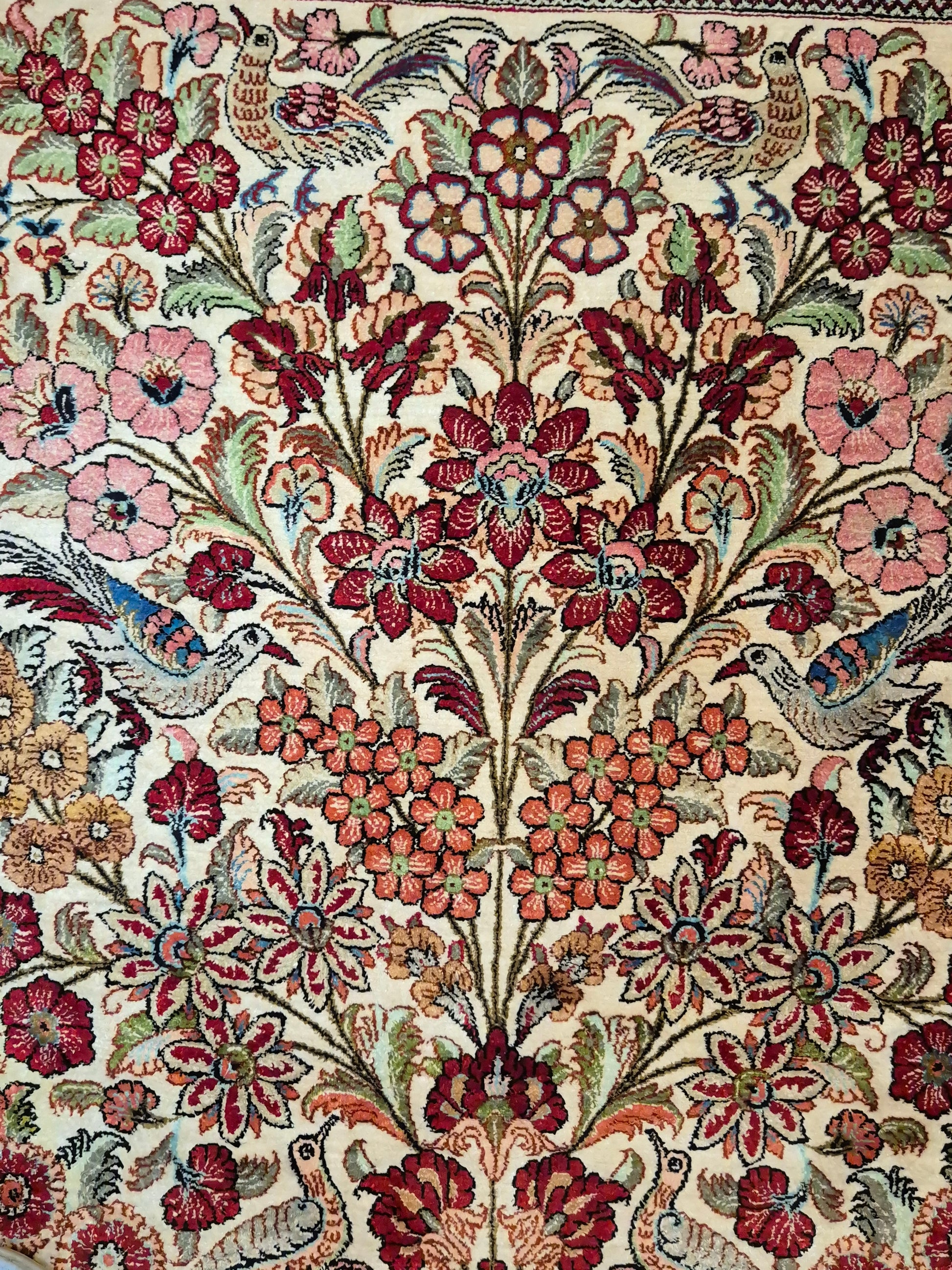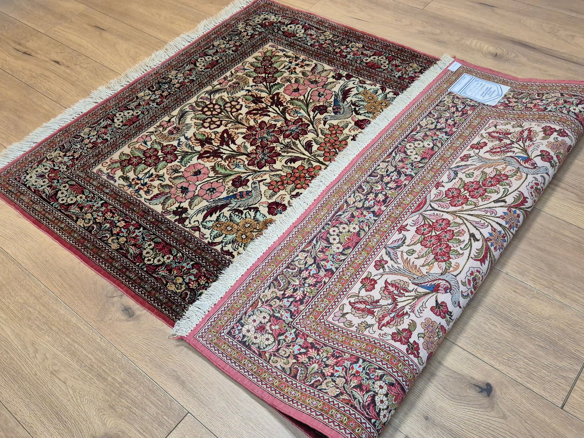 angeboten wird ein edler Ghom Teppich aus 100 % Seide auf Seide, handgeknüpft in feiner Ausführung. Das Motiv zeigt den klassischen Lebensbaum, reich geschmückt mit Blüten in kräftigen Farben sowie kunstvoll eingefügten Vögeln. Der helle Fond bringt die detailreichen floralen Motive eindrucksvoll zur Geltung, während die mehrfache Bordüre in warmen Rottönen mit floralen Ornamenten das Bild harmonisch einfasst.