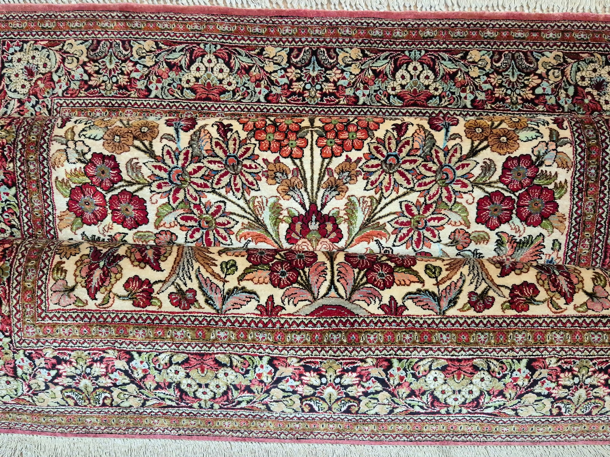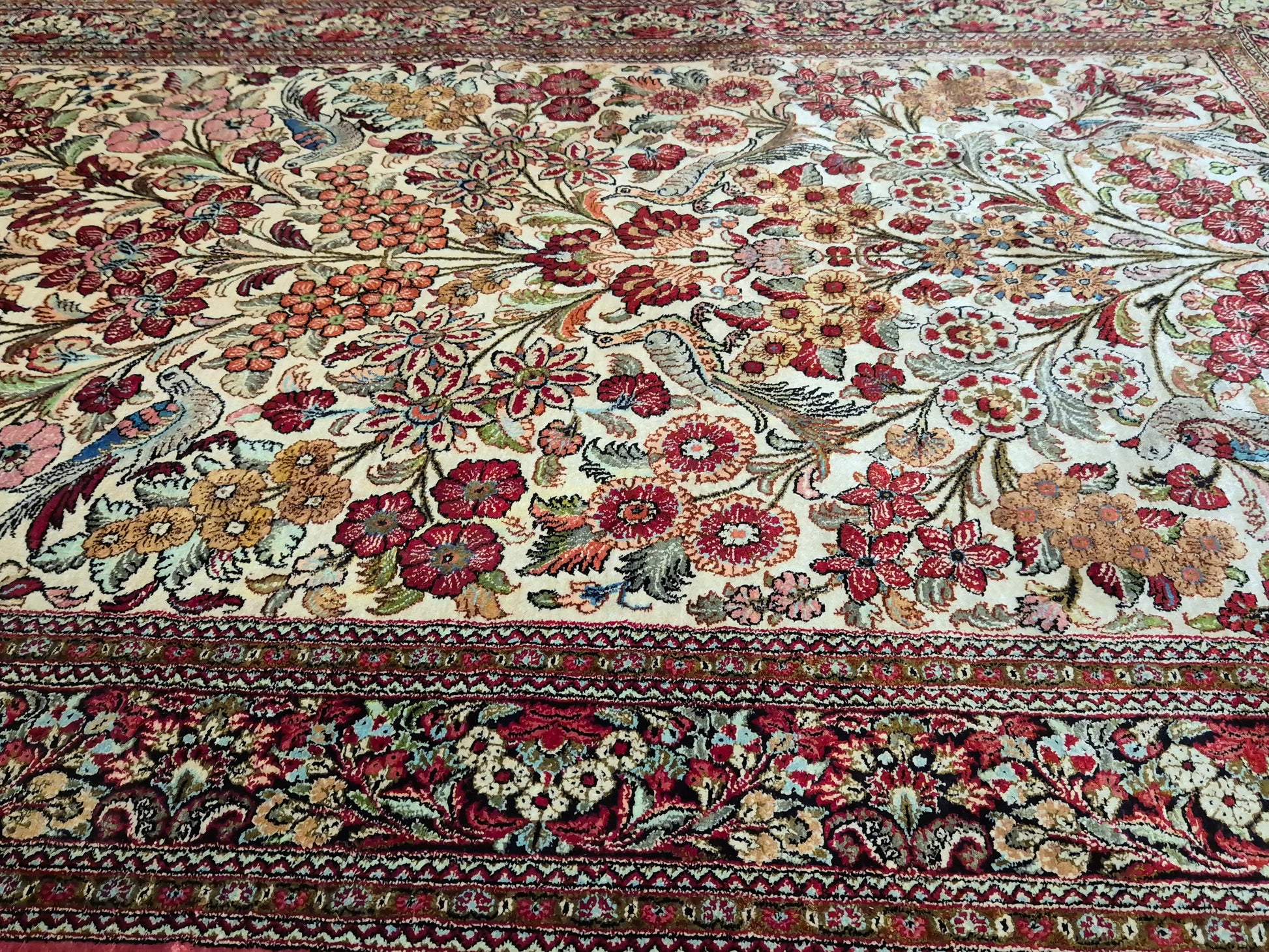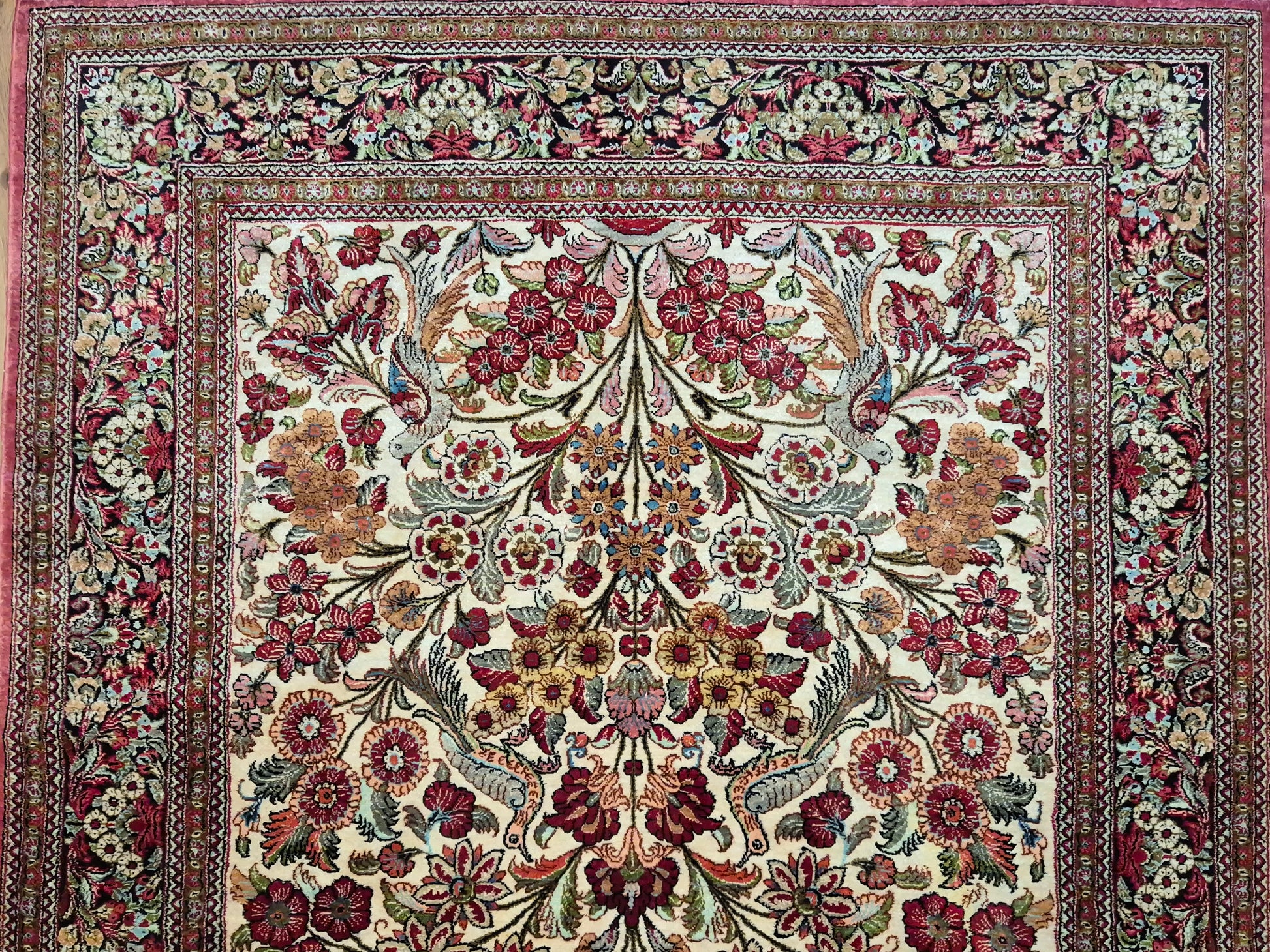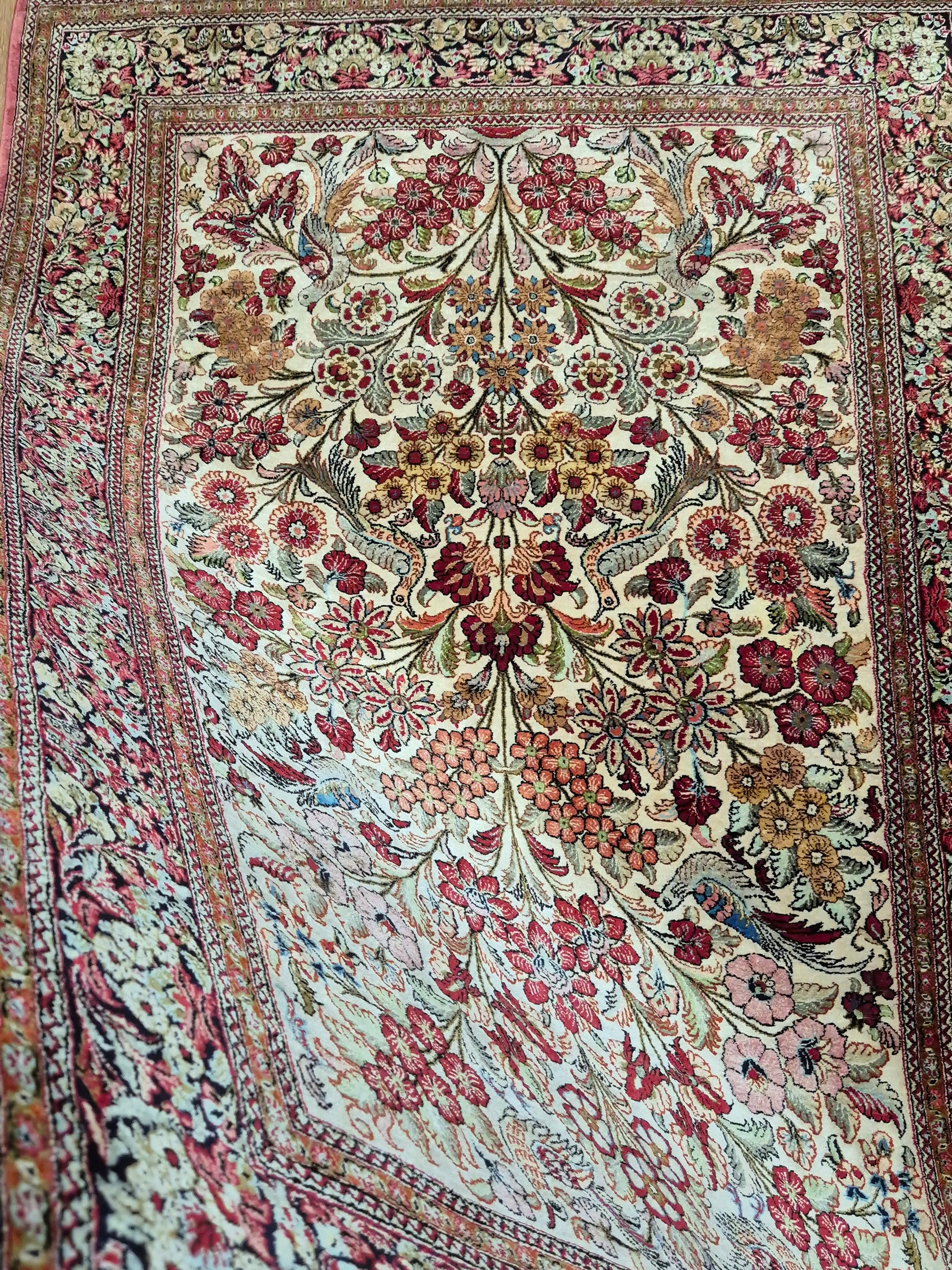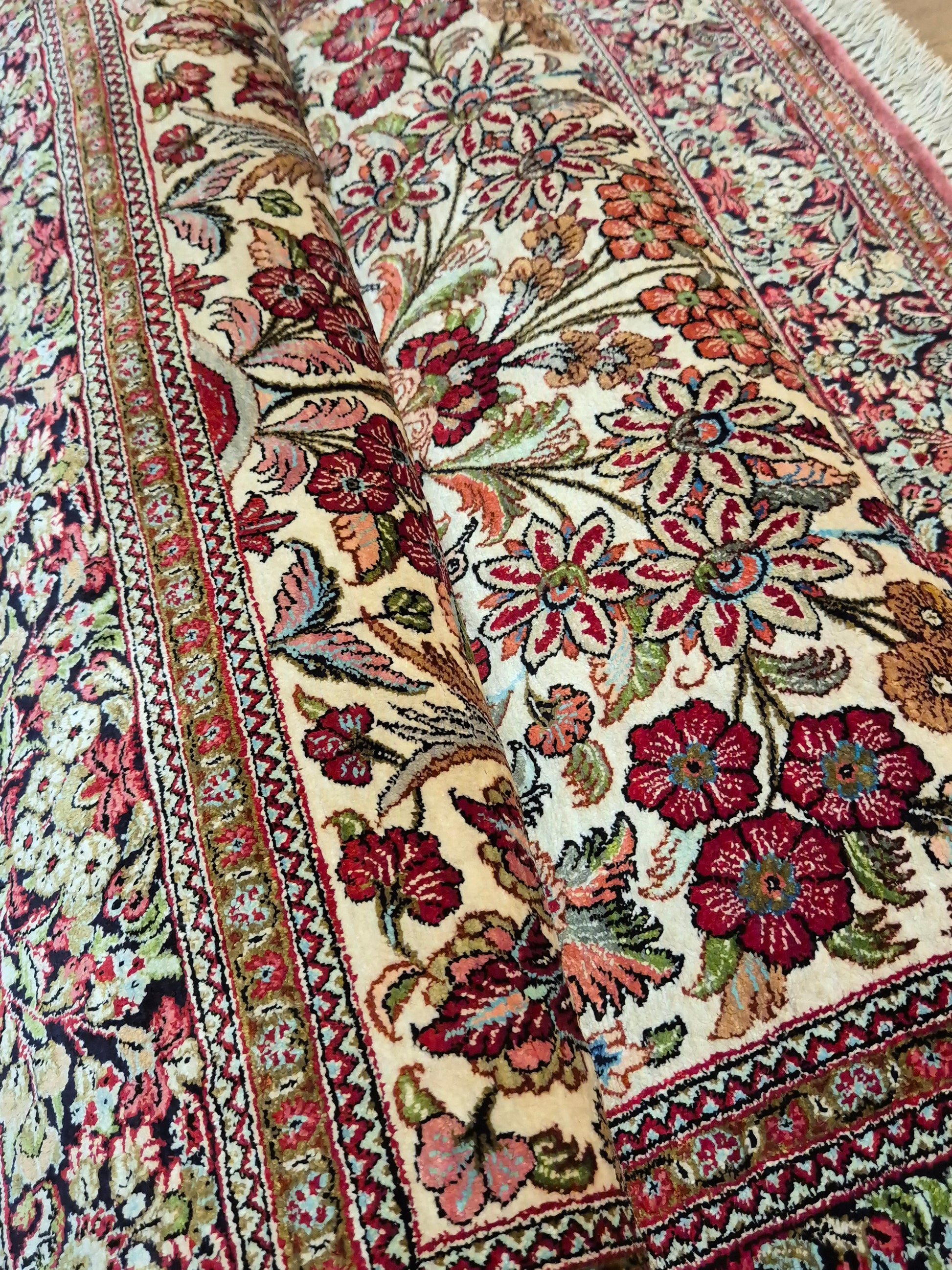 angeboten wird ein edler Ghom Teppich aus 100 % Seide auf Seide, handgeknüpft in feiner Ausführung. Das Motiv zeigt den klassischen Lebensbaum, reich geschmückt mit Blüten in kräftigen Farben sowie kunstvoll eingefügten Vögeln. Der helle Fond bringt die detailreichen floralen Motive eindrucksvoll zur Geltung, während die mehrfache Bordüre in warmen Rottönen mit floralen Ornamenten das Bild harmonisch einfasst.