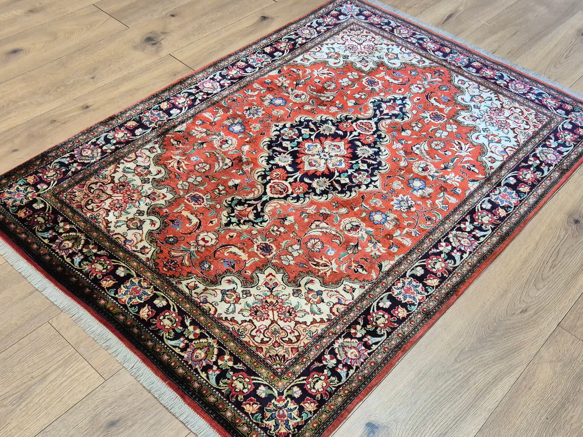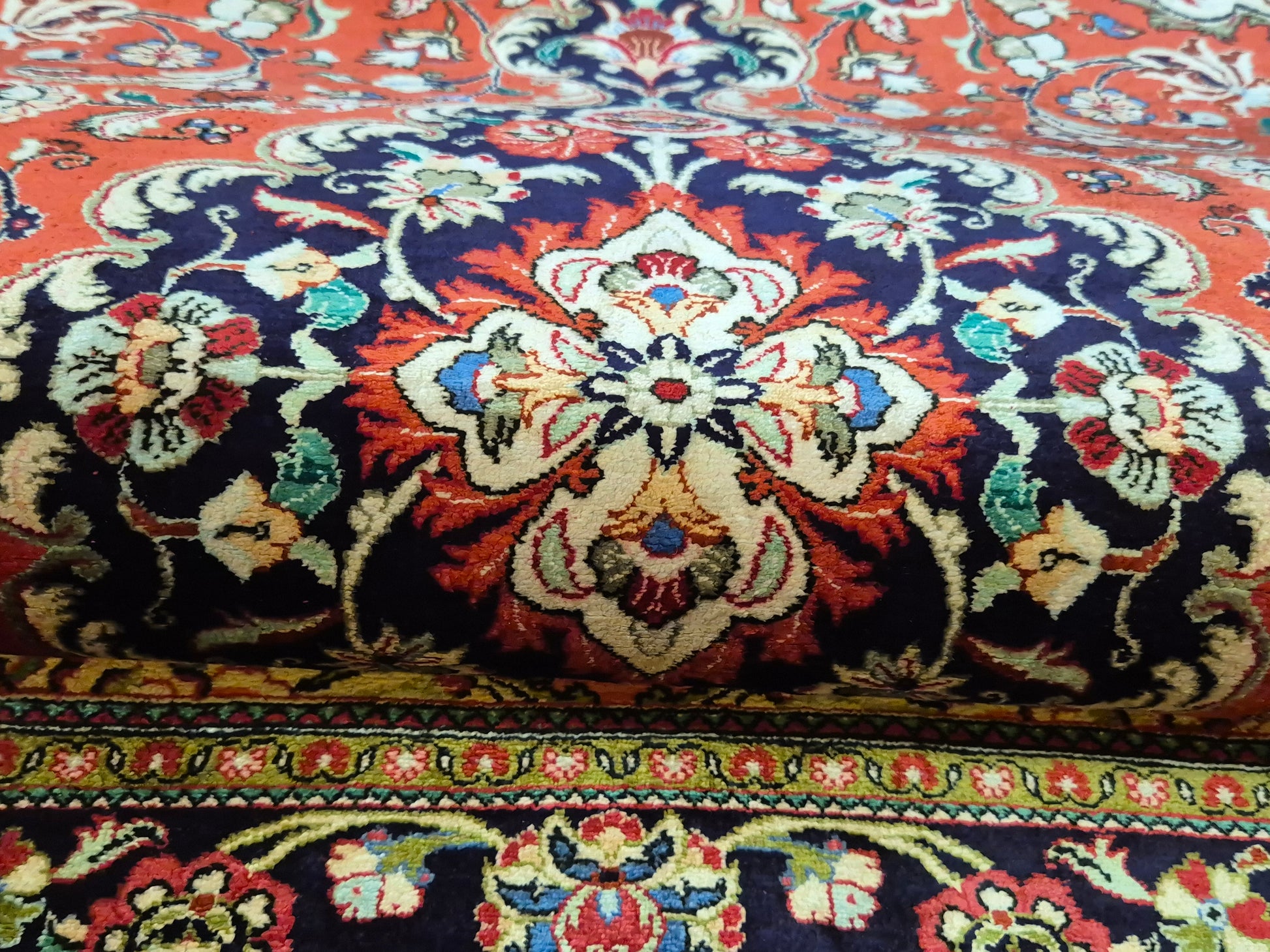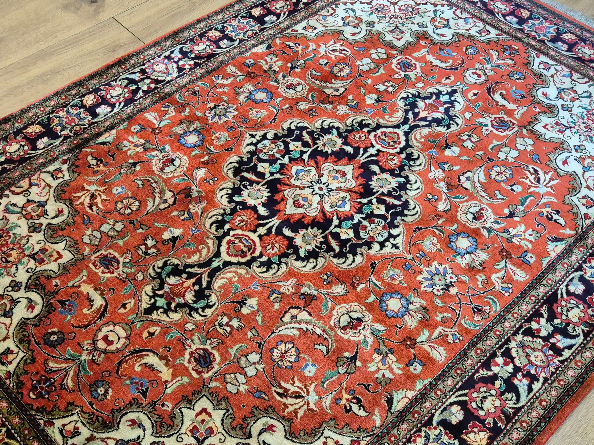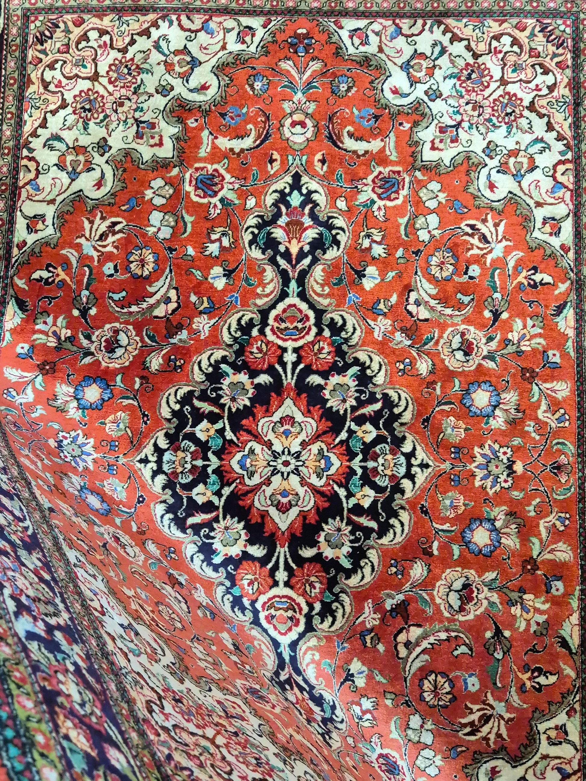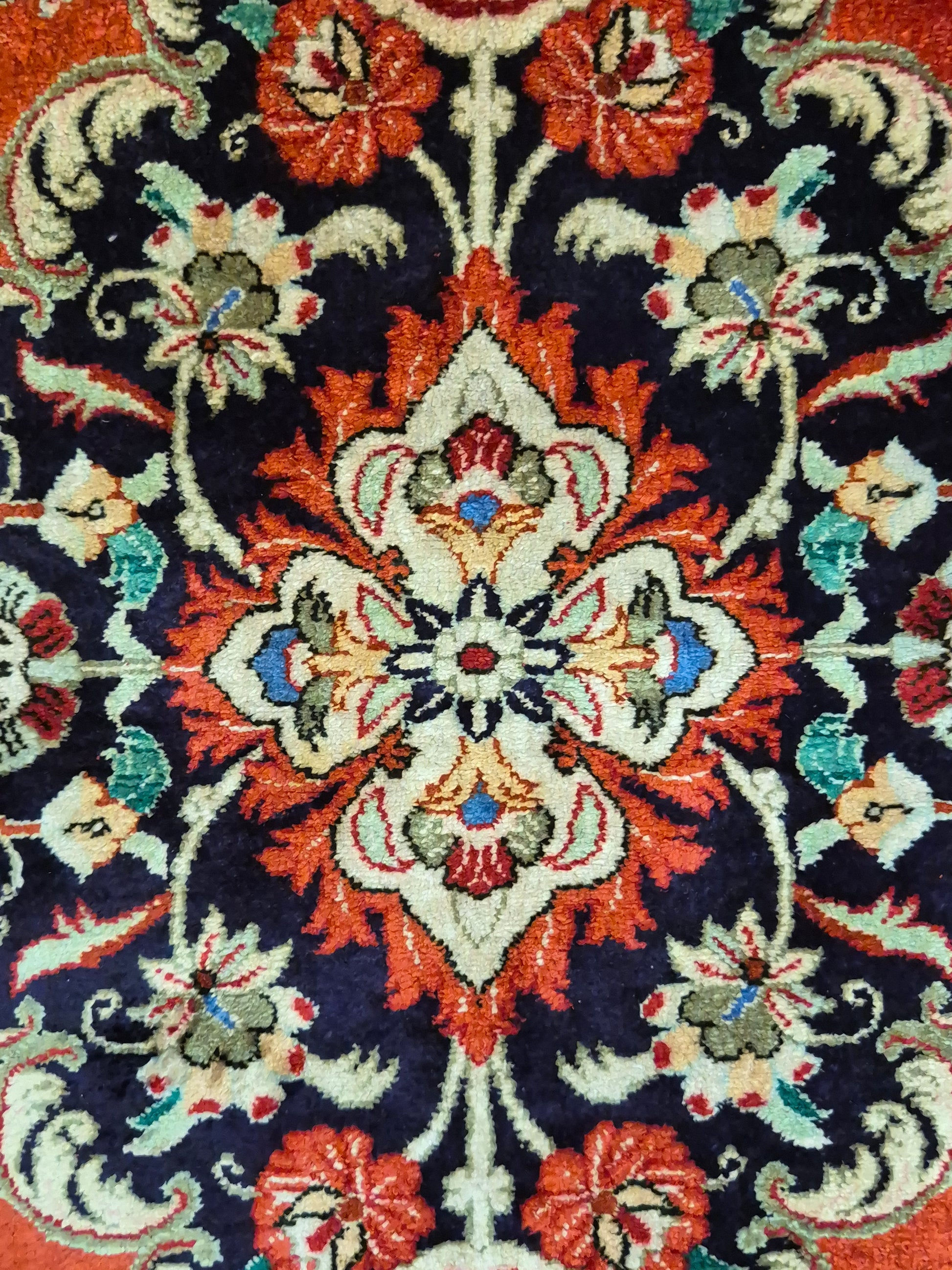 angeboten wird ein edler Ghom Teppich aus reiner Seide auf Seide, handgeknüpft in meisterhafter Ausführung. Das Teppichbild zeigt ein kunstvolles Medaillon im Zentrum, umgeben von einer harmonischen floralen Gestaltung auf leuchtendem Fond. Die filigranen Blütenranken, geschwungenen Arabesken und die kontrastreiche Bordüre unterstreichen die außergewöhnliche Feinheit dieses Stückes.