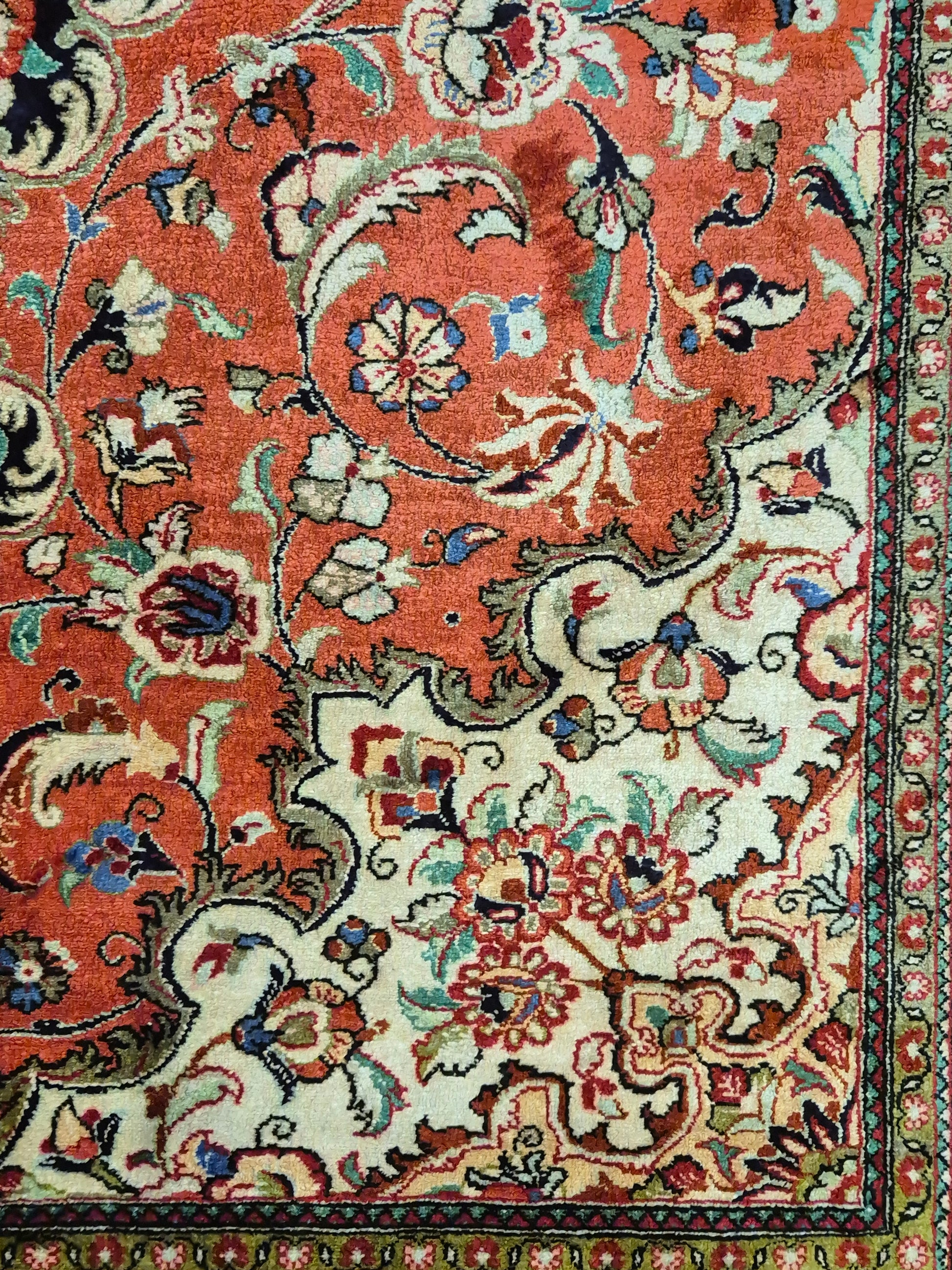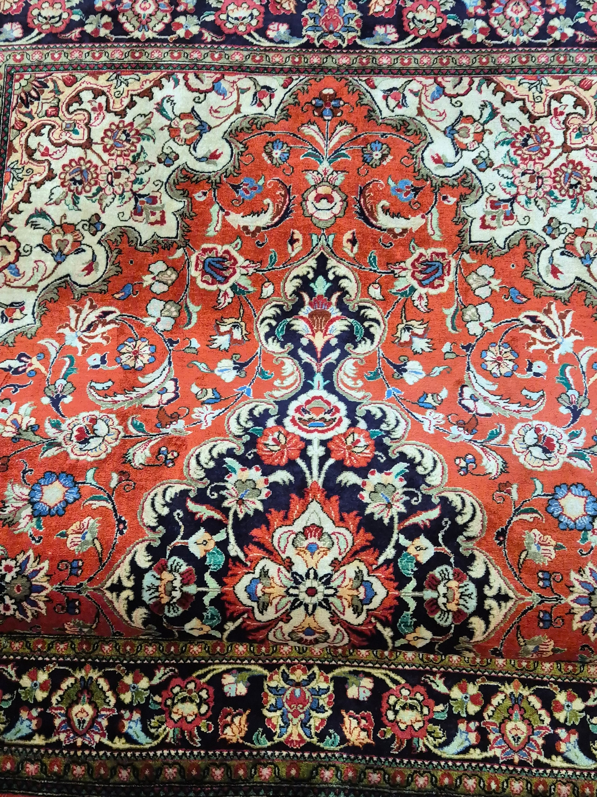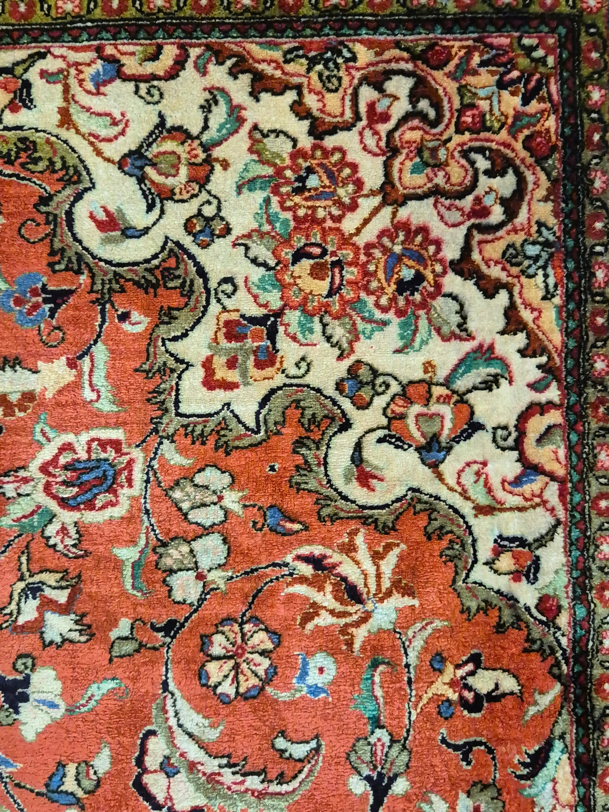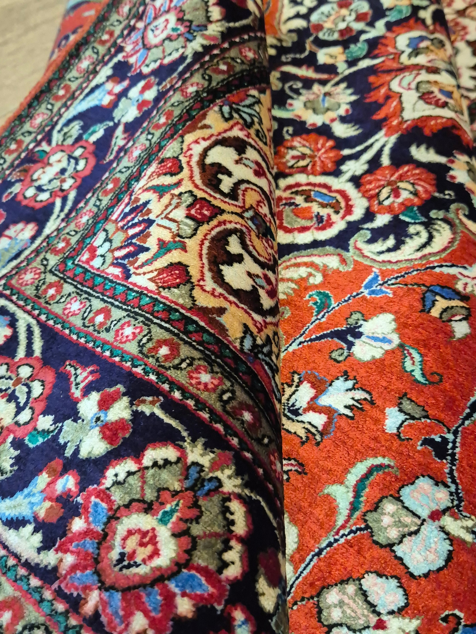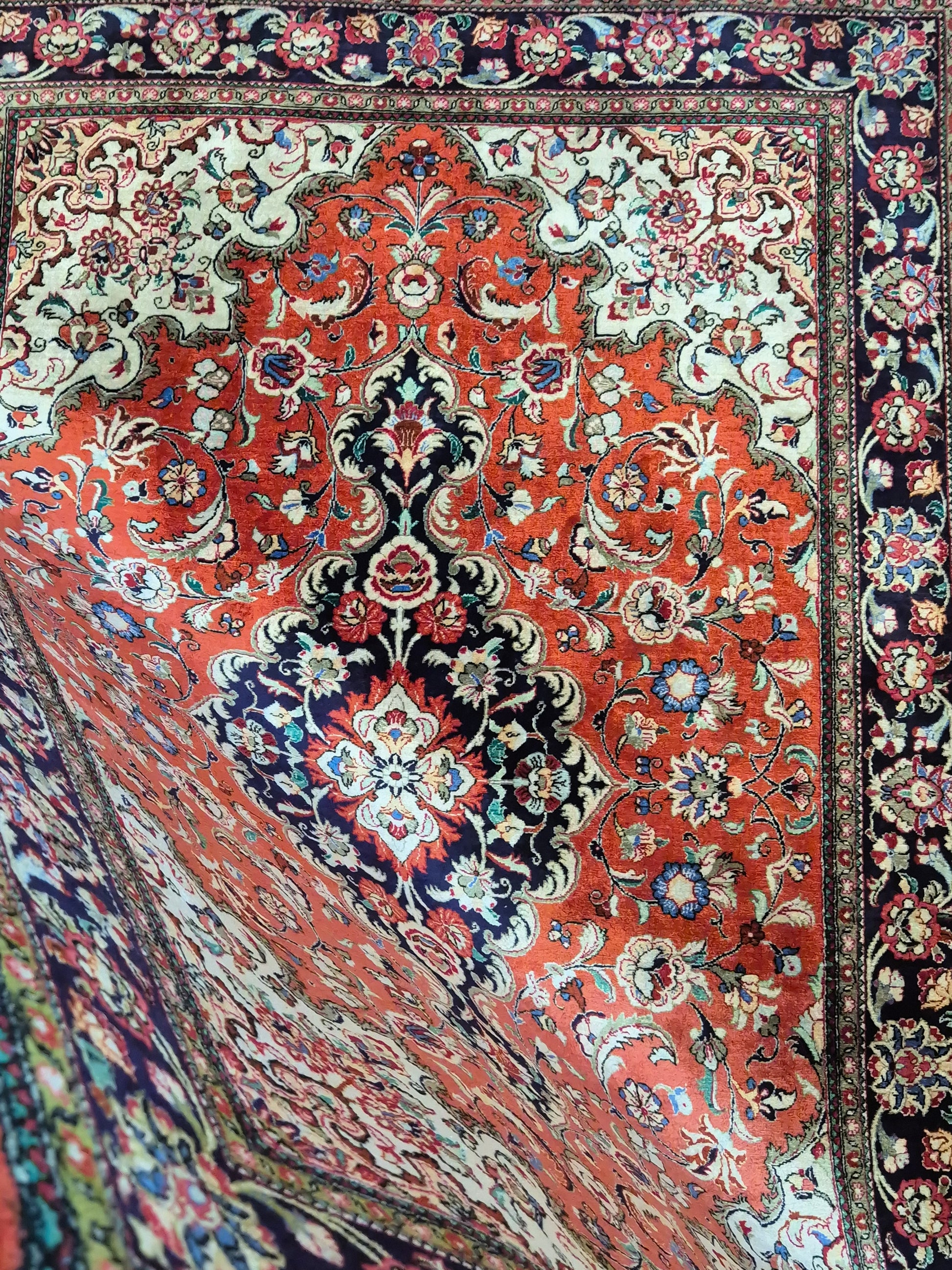 angeboten wird ein edler Ghom Teppich aus reiner Seide auf Seide, handgeknüpft in meisterhafter Ausführung. Das Teppichbild zeigt ein kunstvolles Medaillon im Zentrum, umgeben von einer harmonischen floralen Gestaltung auf leuchtendem Fond. Die filigranen Blütenranken, geschwungenen Arabesken und die kontrastreiche Bordüre unterstreichen die außergewöhnliche Feinheit dieses Stückes.