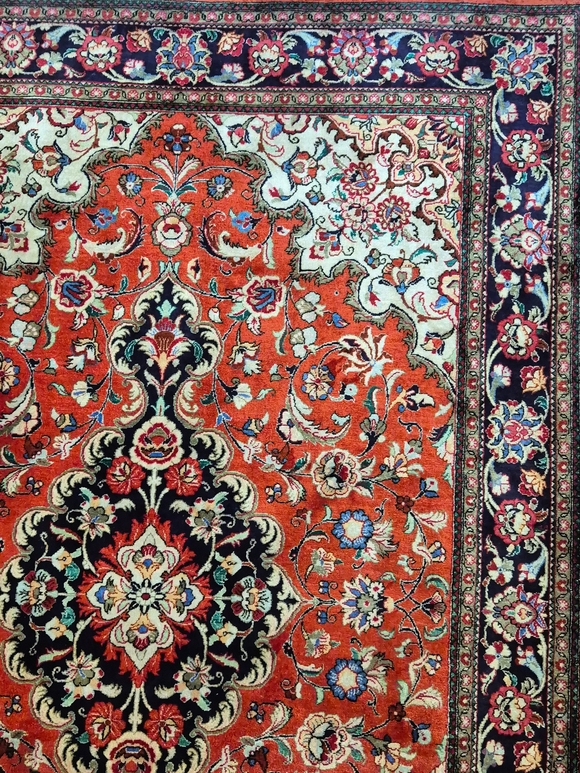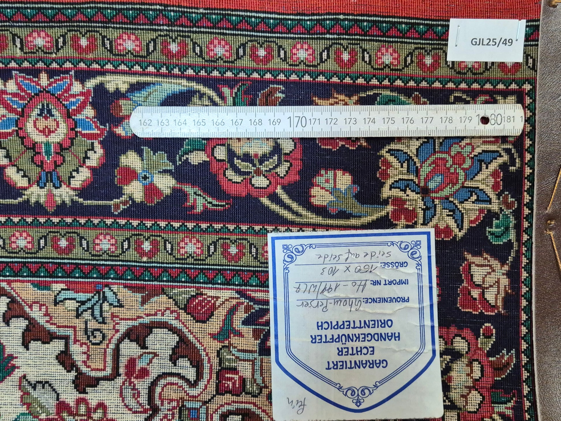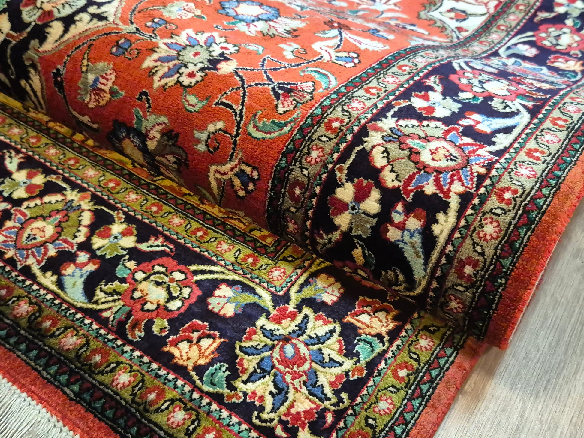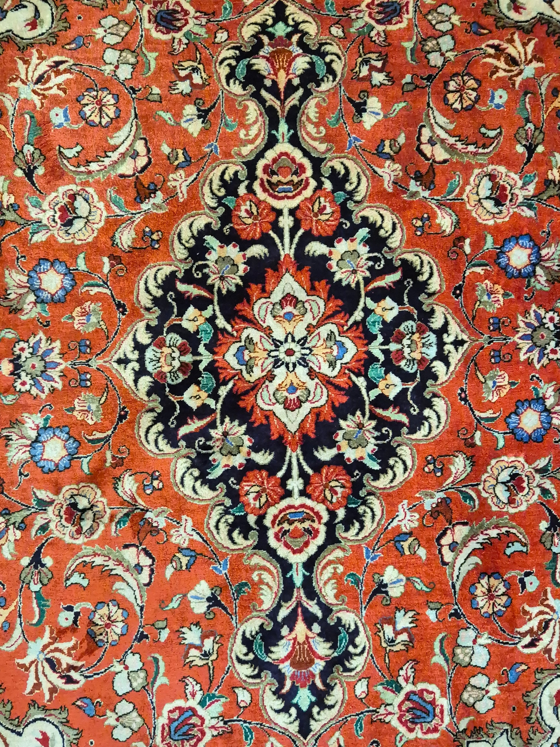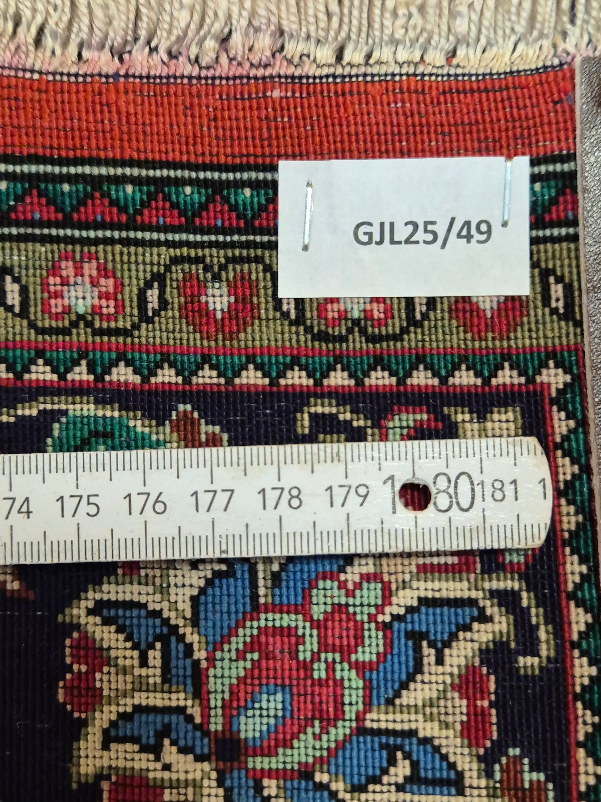 angeboten wird ein edler Ghom Teppich aus reiner Seide auf Seide, handgeknüpft in meisterhafter Ausführung. Das Teppichbild zeigt ein kunstvolles Medaillon im Zentrum, umgeben von einer harmonischen floralen Gestaltung auf leuchtendem Fond. Die filigranen Blütenranken, geschwungenen Arabesken und die kontrastreiche Bordüre unterstreichen die außergewöhnliche Feinheit dieses Stückes.