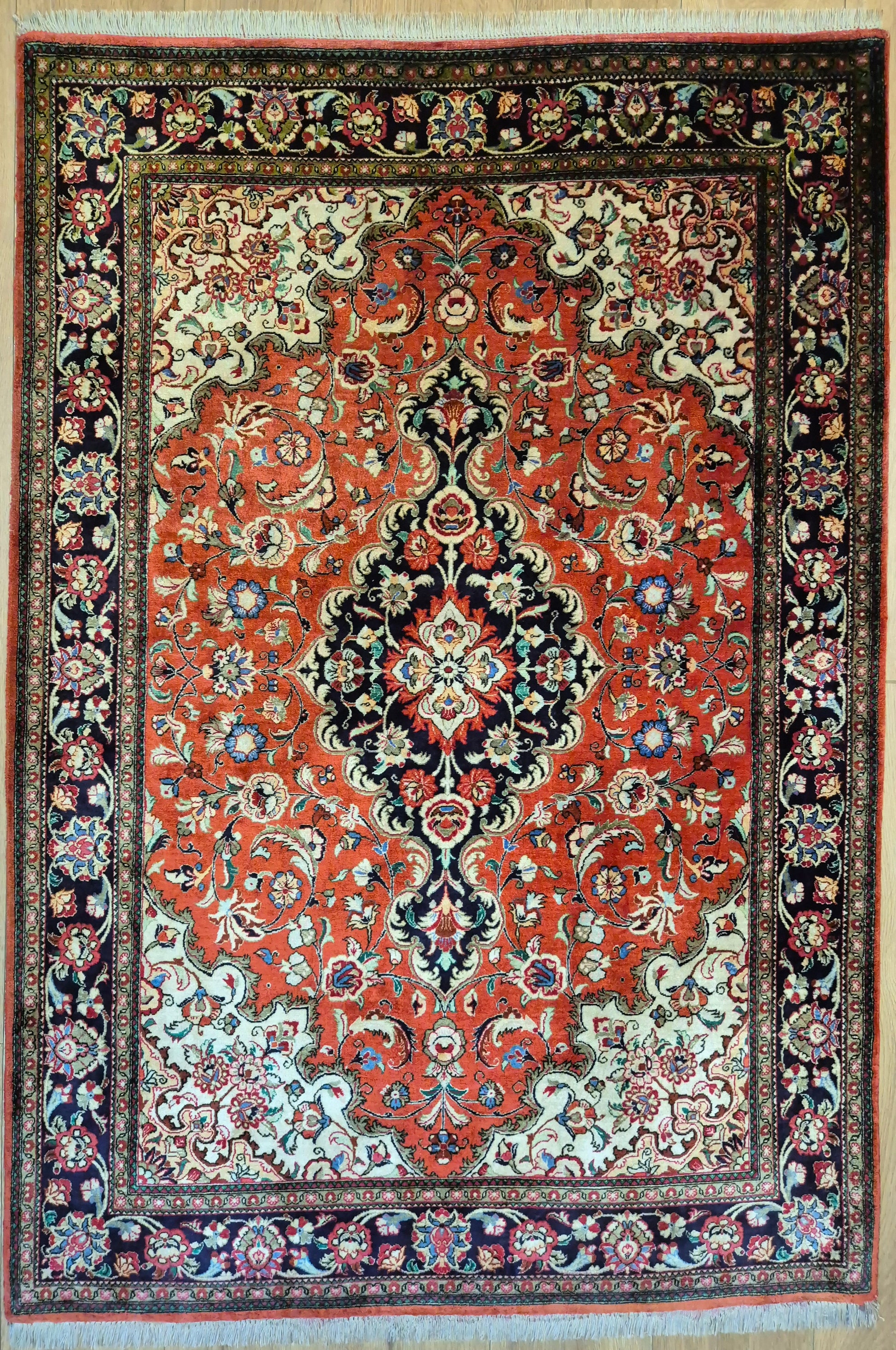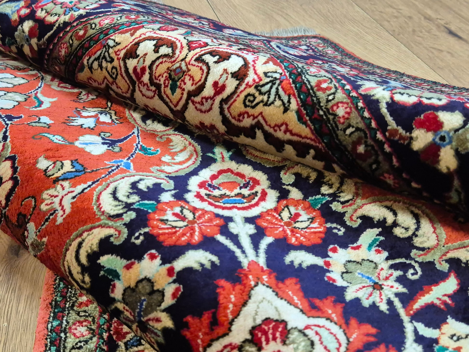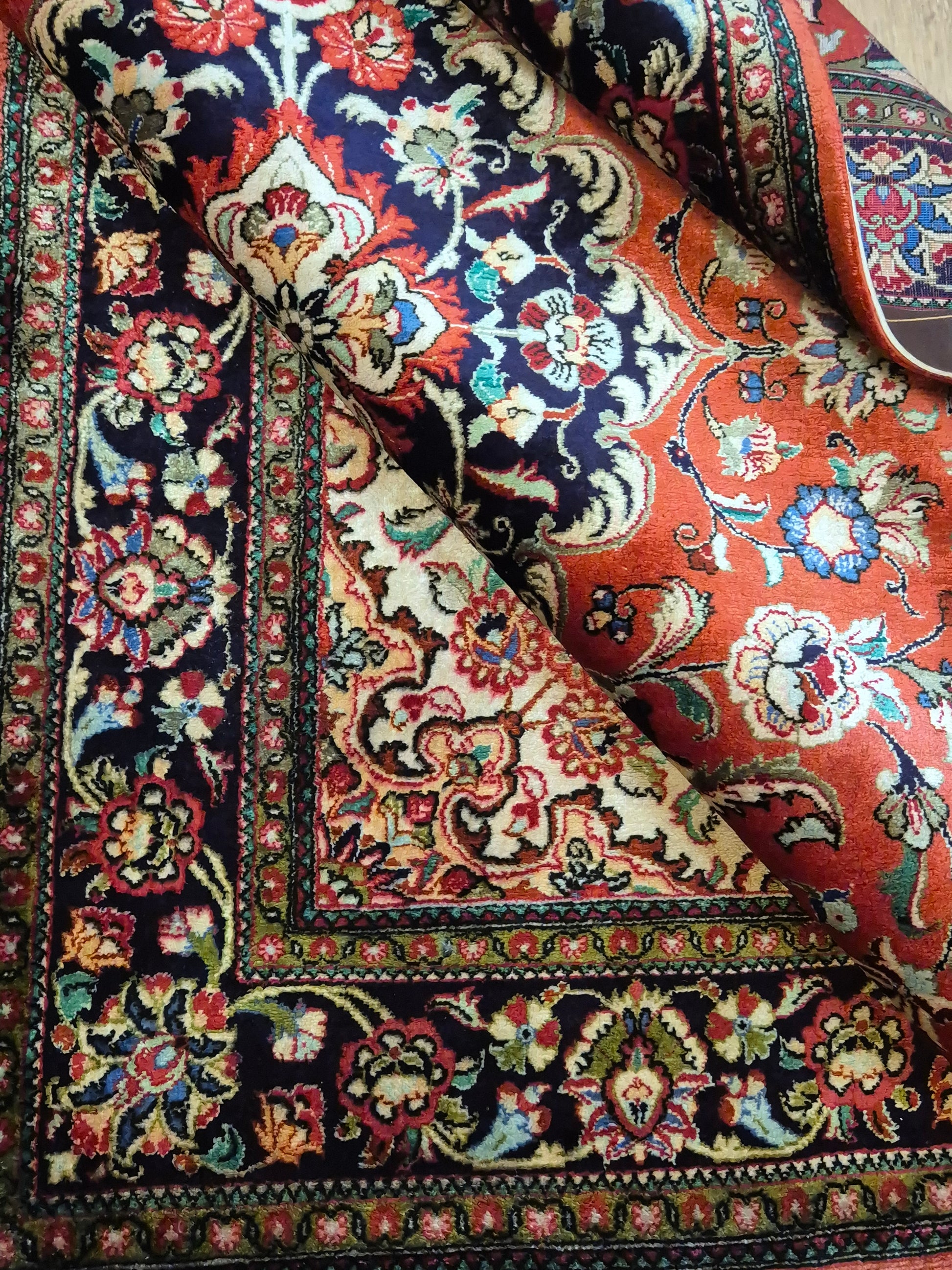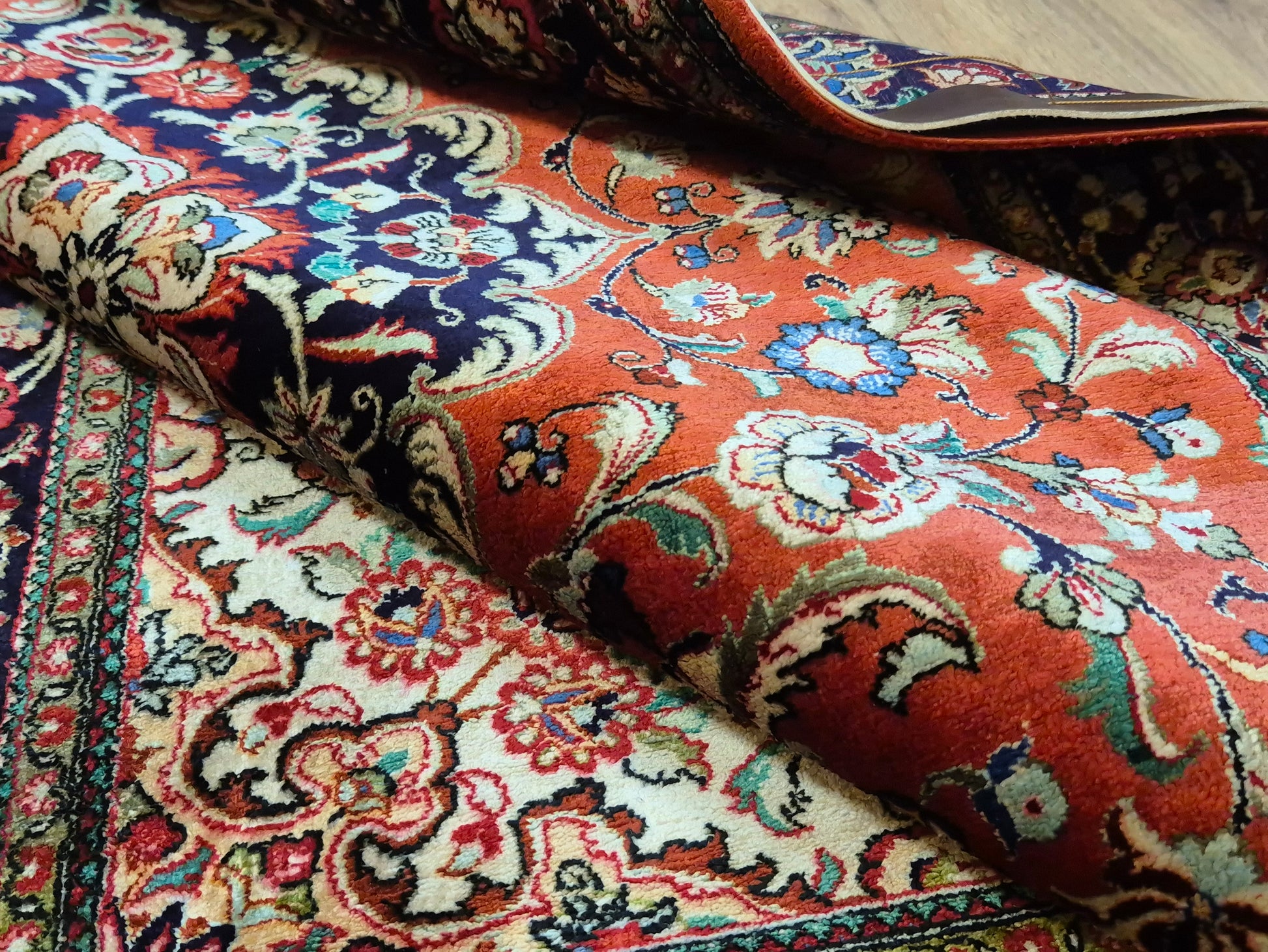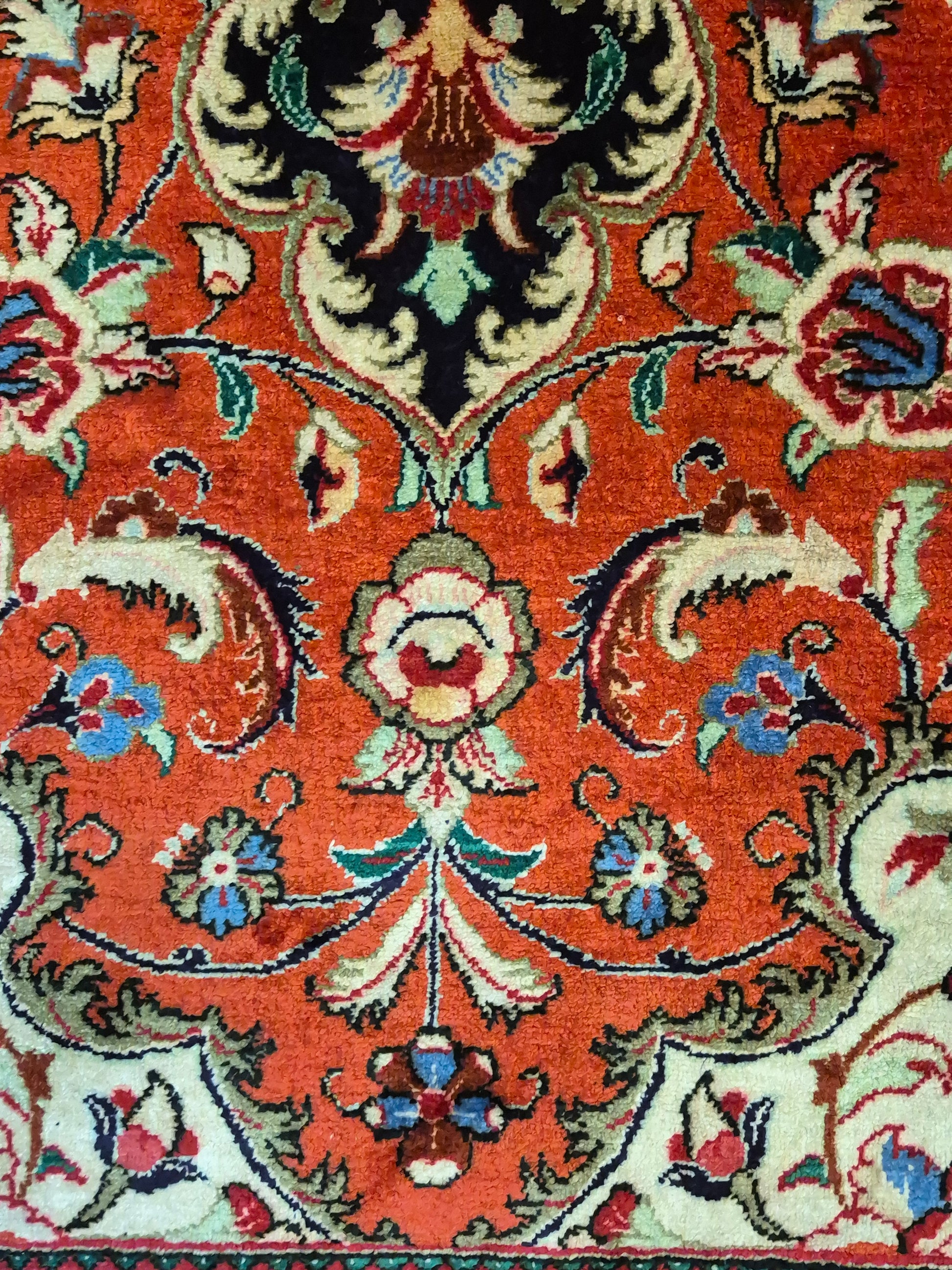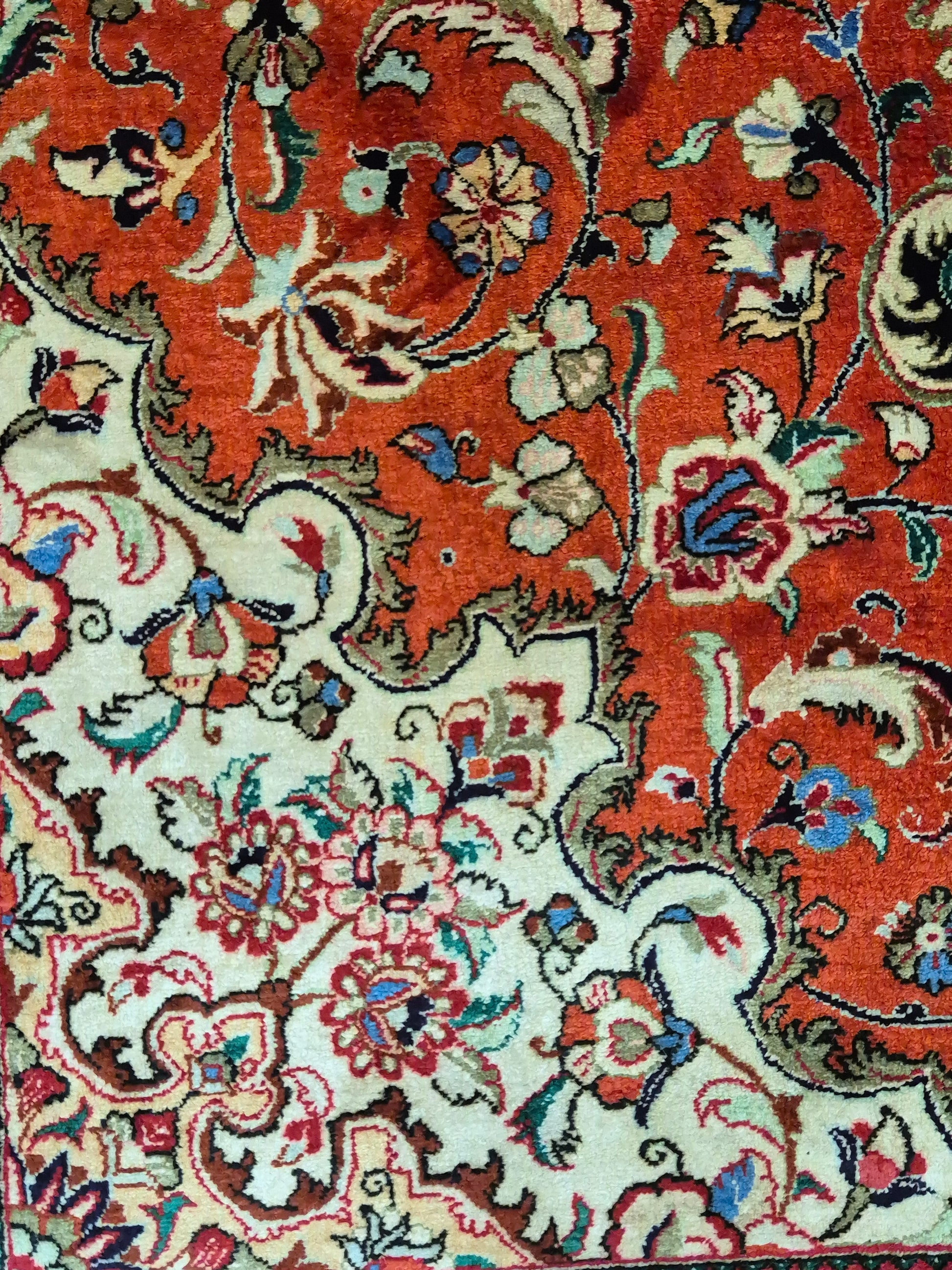 angeboten wird ein edler Ghom Teppich aus reiner Seide auf Seide, handgeknüpft in meisterhafter Ausführung. Das Teppichbild zeigt ein kunstvolles Medaillon im Zentrum, umgeben von einer harmonischen floralen Gestaltung auf leuchtendem Fond. Die filigranen Blütenranken, geschwungenen Arabesken und die kontrastreiche Bordüre unterstreichen die außergewöhnliche Feinheit dieses Stückes.