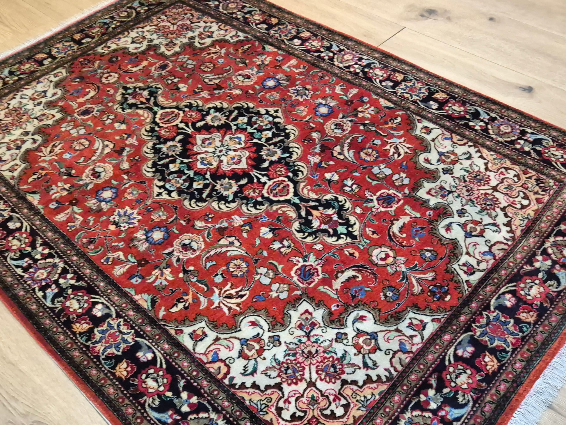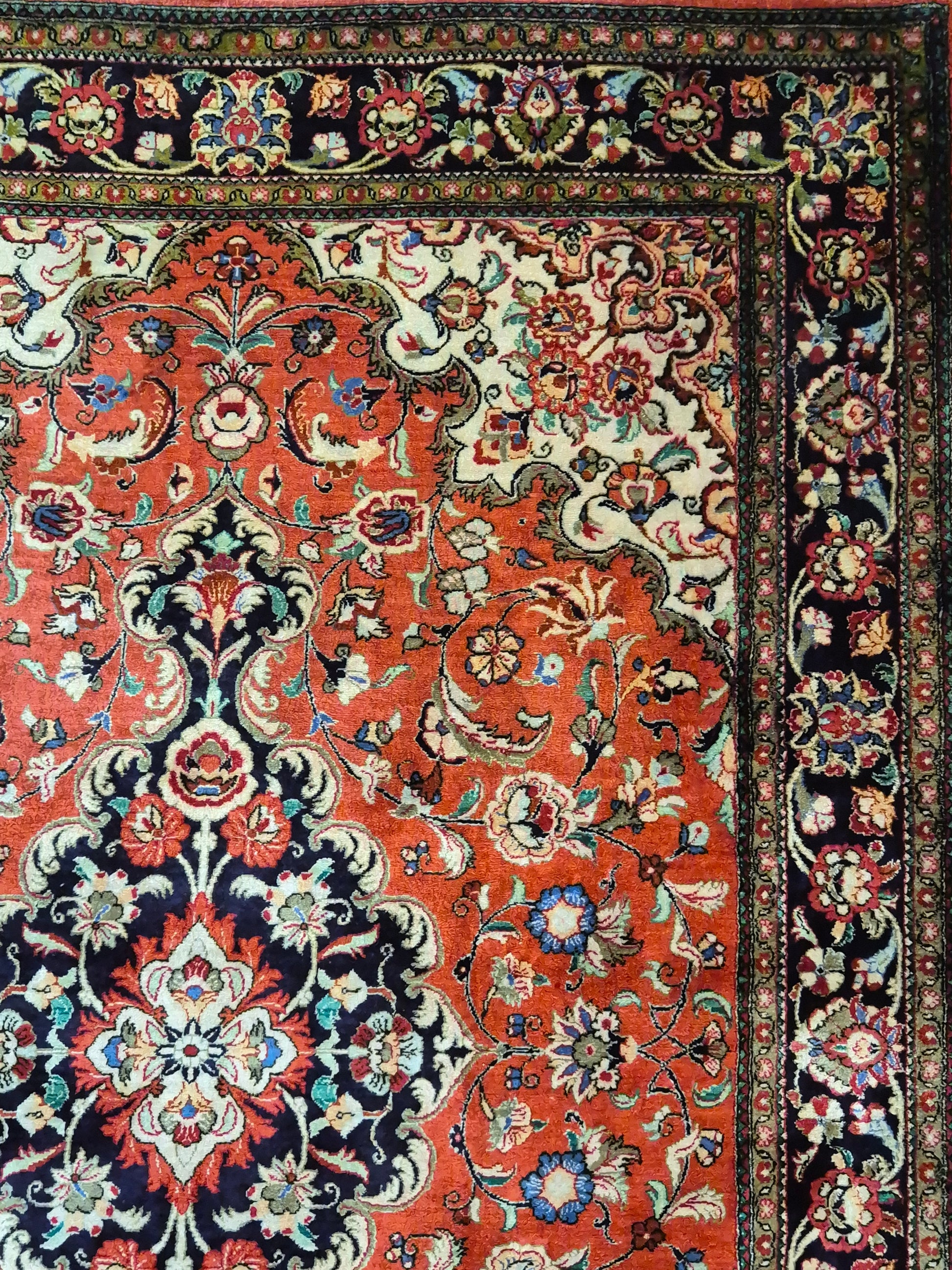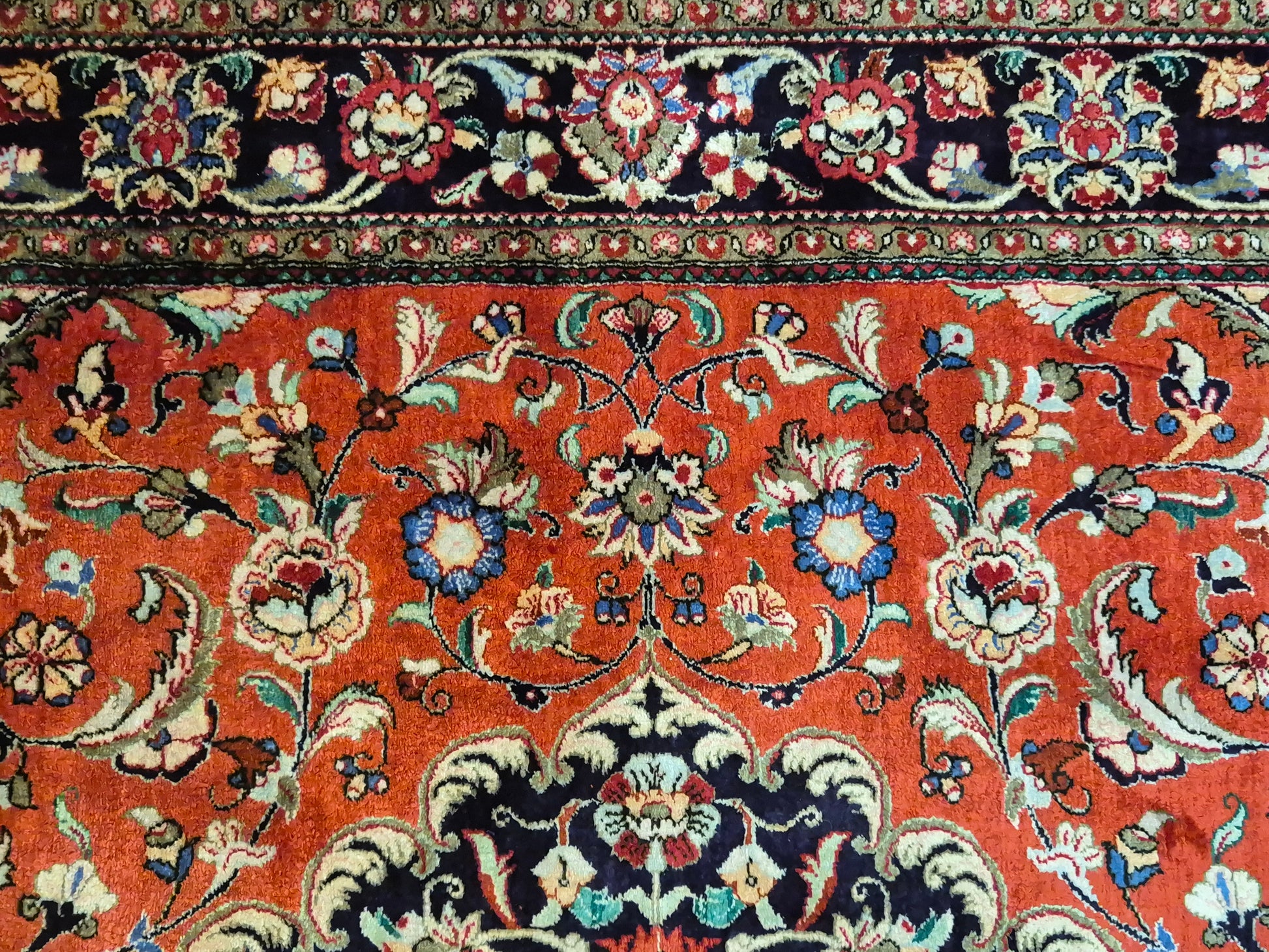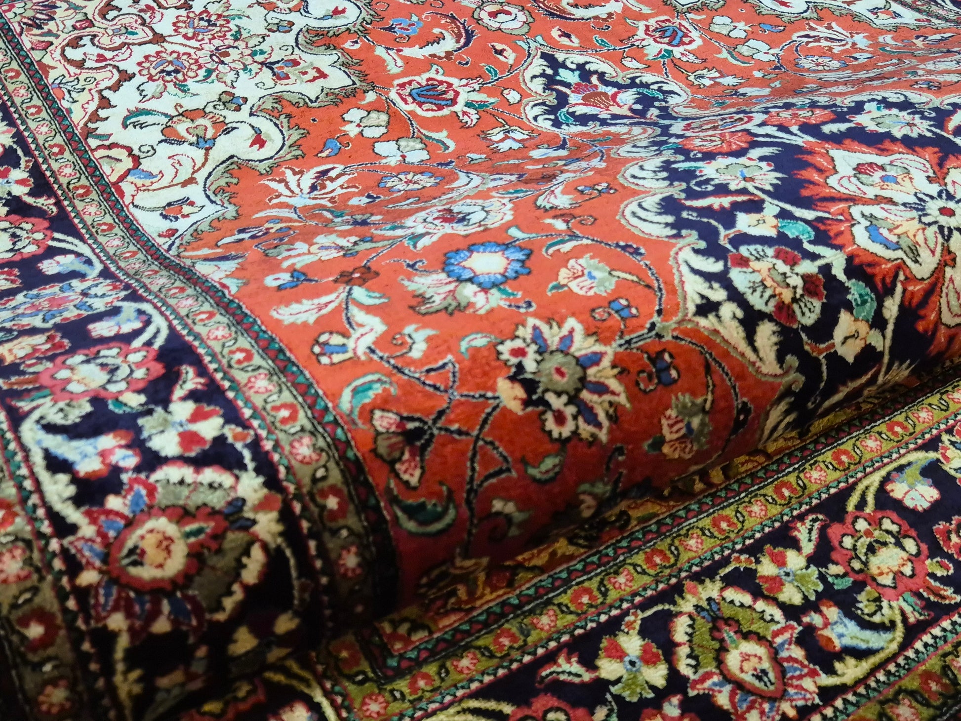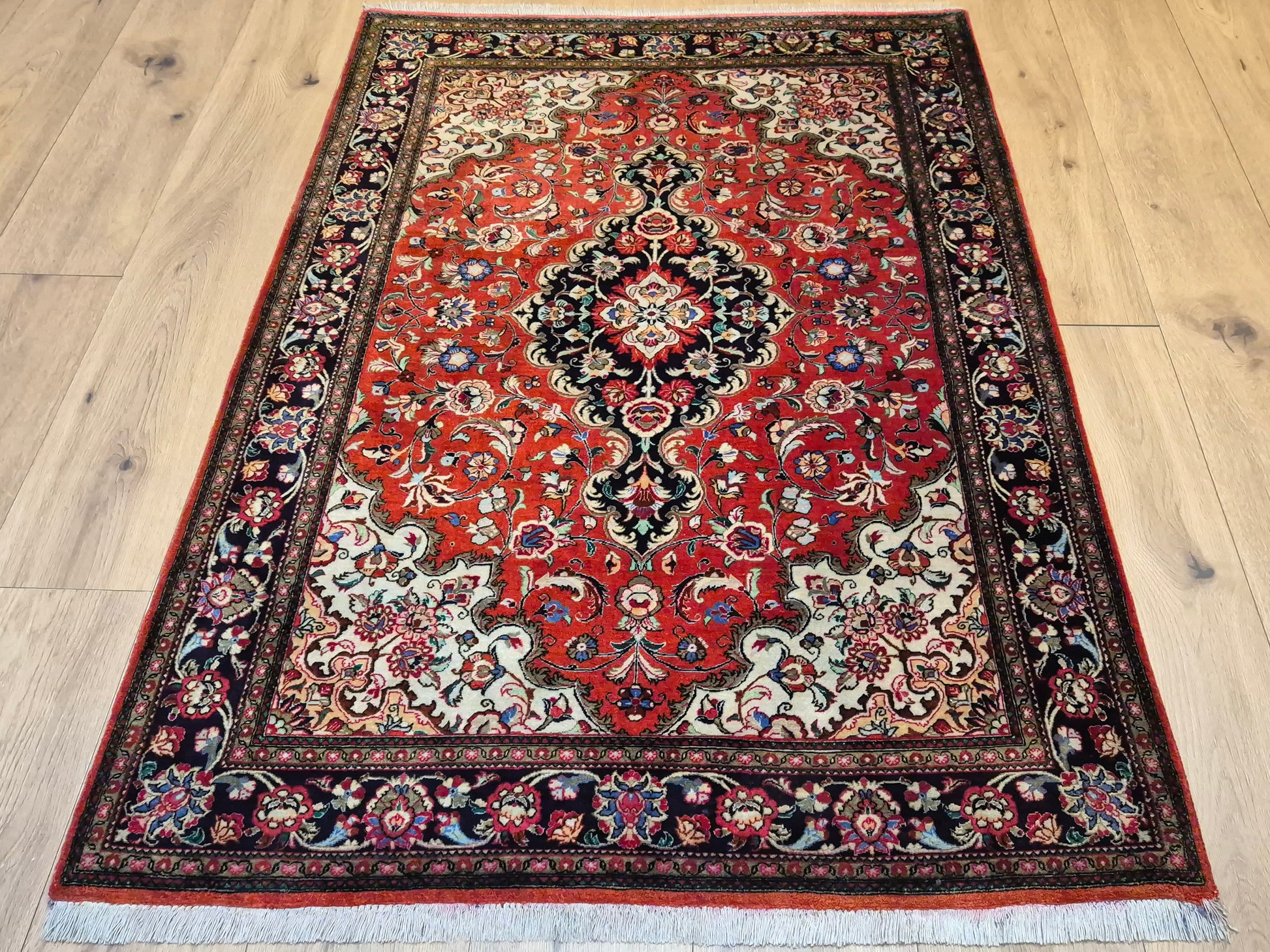 angeboten wird ein edler Ghom Teppich aus reiner Seide auf Seide, handgeknüpft in meisterhafter Ausführung. Das Teppichbild zeigt ein kunstvolles Medaillon im Zentrum, umgeben von einer harmonischen floralen Gestaltung auf leuchtendem Fond. Die filigranen Blütenranken, geschwungenen Arabesken und die kontrastreiche Bordüre unterstreichen die außergewöhnliche Feinheit dieses Stückes.