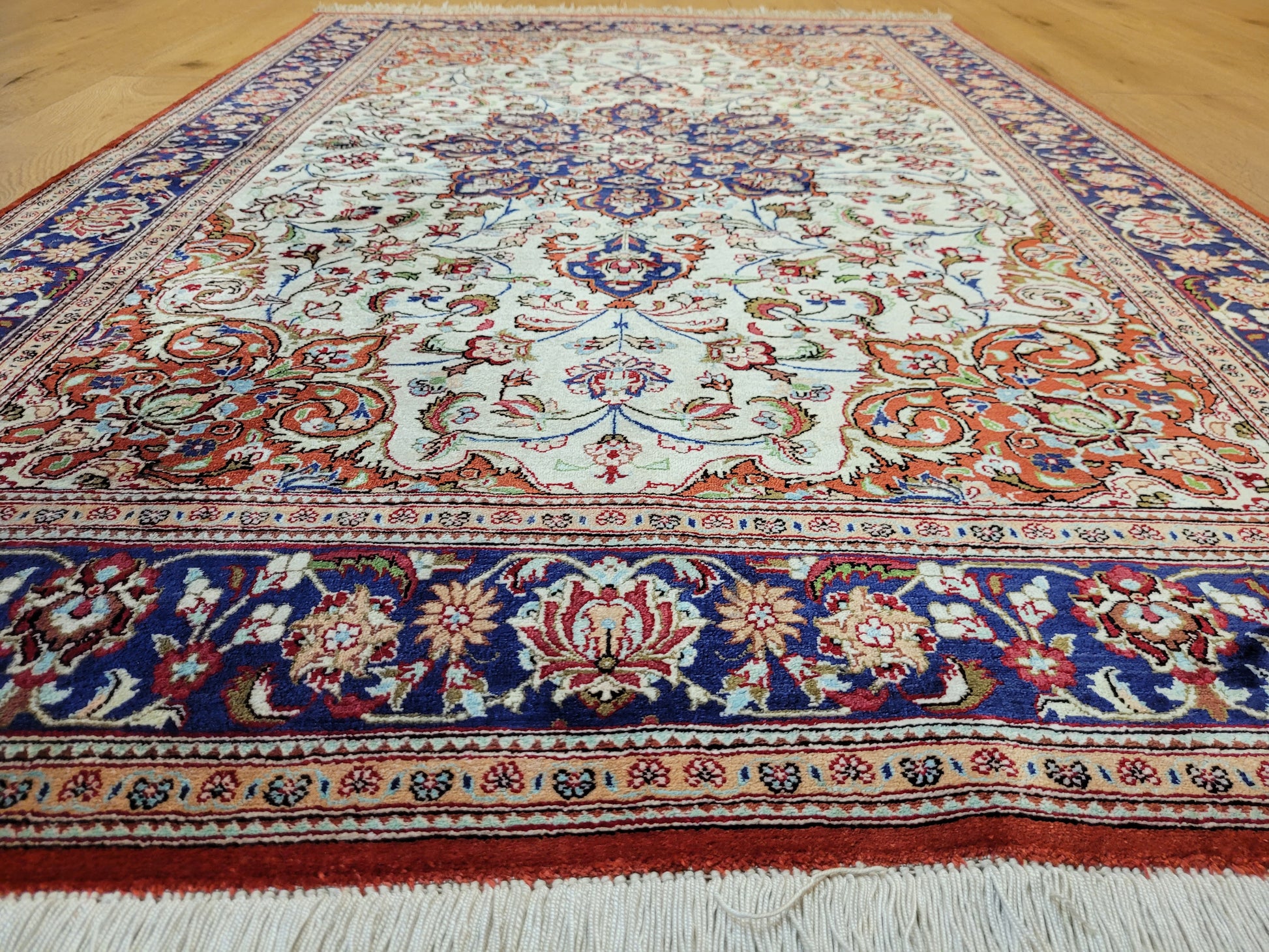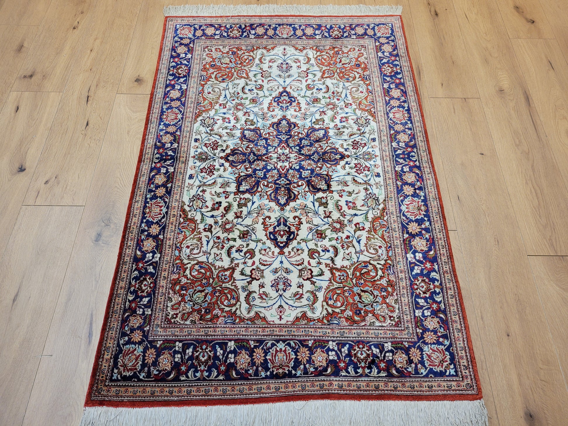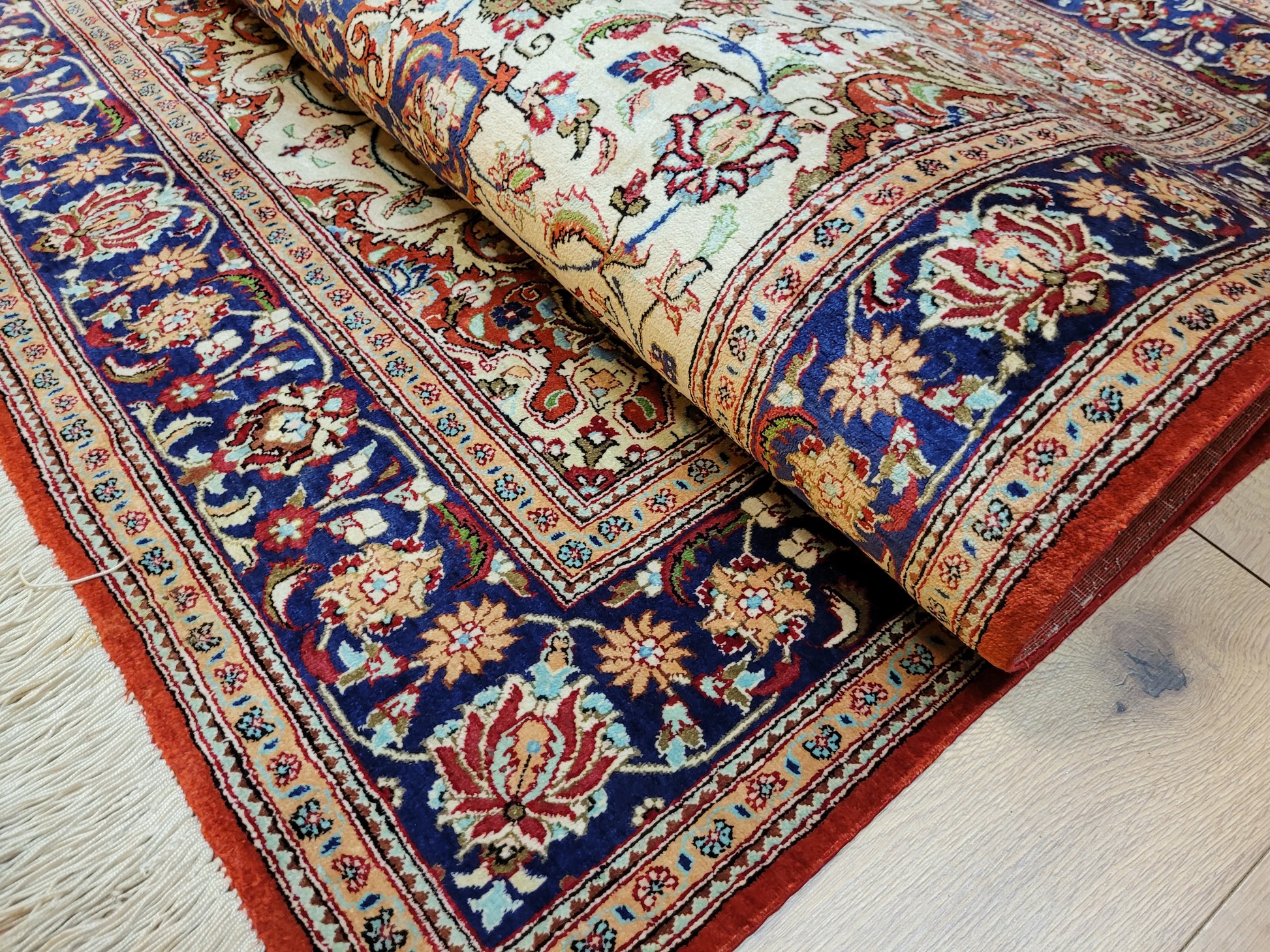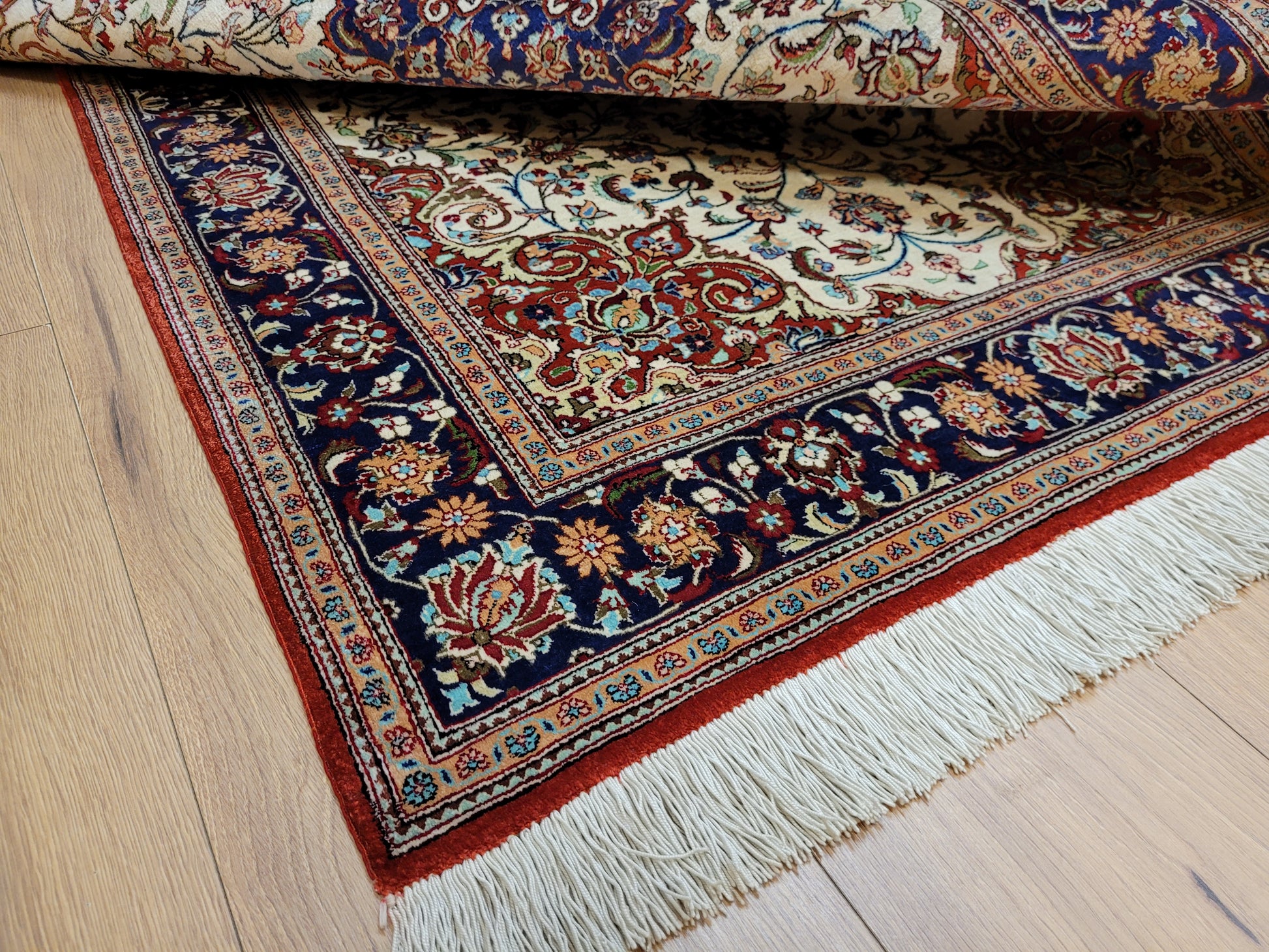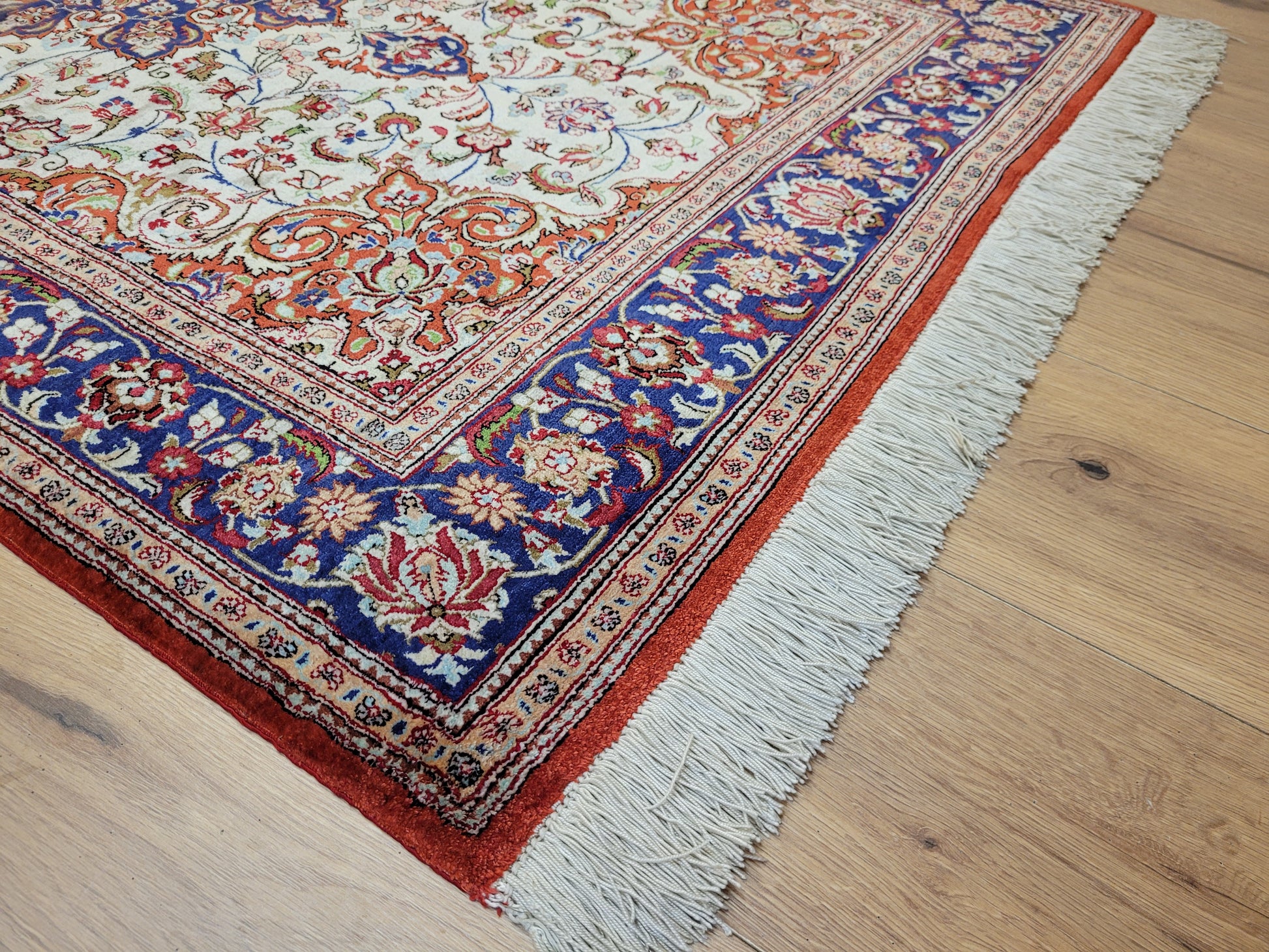 angeboten wird ein edler Ghom Teppich aus feiner Seide auf Seide, handgeknüpft in meisterhafter Ausführung. Im Zentrum des Teppichs befindet sich ein reich verziertes, symmetrisches Medaillon auf hellem Fond. Umgeben wird es von detailreichen Ranken, Blüten und Palmetten in harmonischer Komposition. Die tiefblaue Hauptbordüre mit roten Blütenranken bildet einen markanten Kontrast und verleiht dem Teppich eine elegante Rahmung.