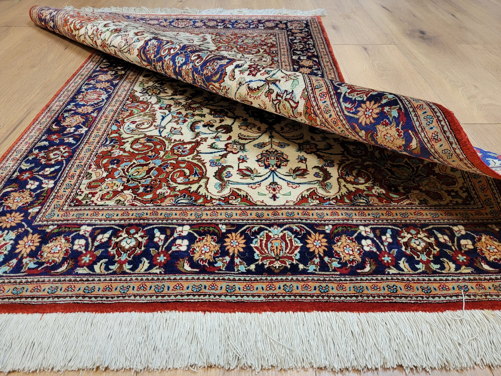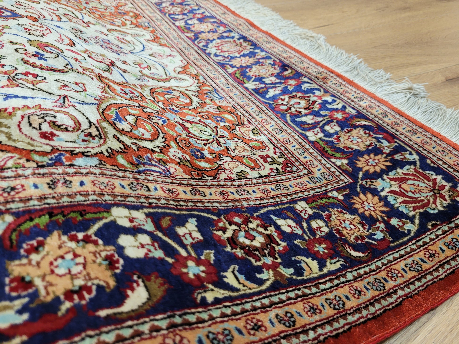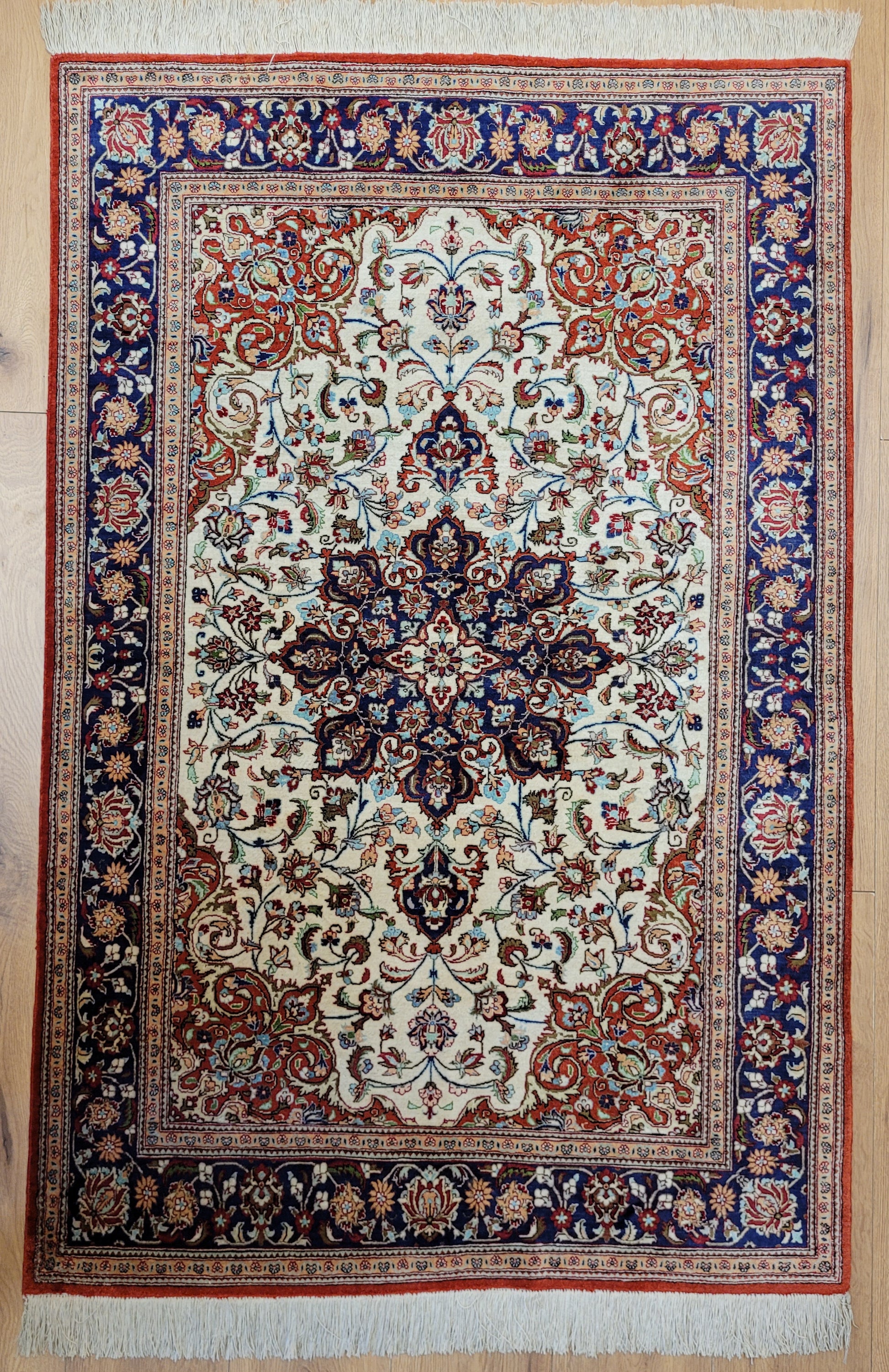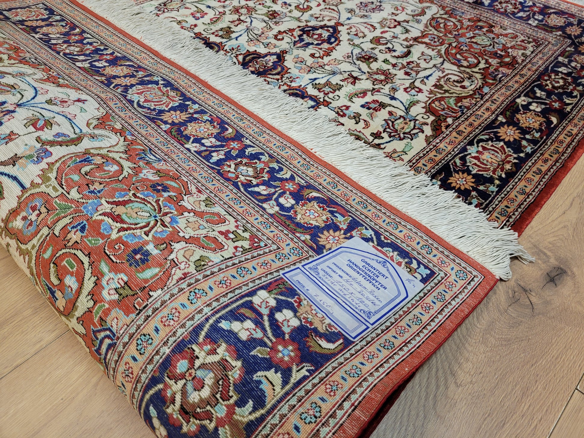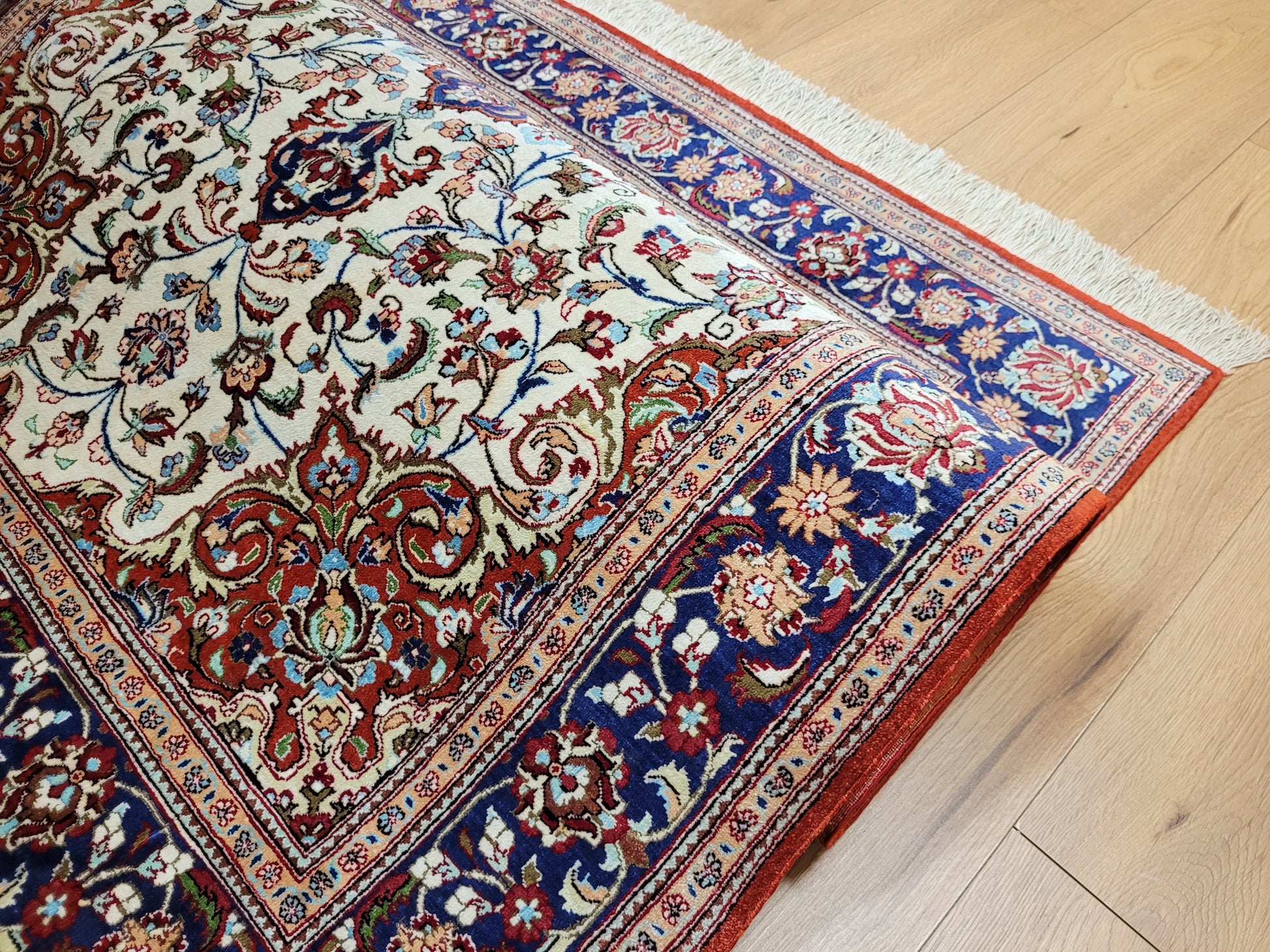 angeboten wird ein edler Ghom Teppich aus feiner Seide auf Seide, handgeknüpft in meisterhafter Ausführung. Im Zentrum des Teppichs befindet sich ein reich verziertes, symmetrisches Medaillon auf hellem Fond. Umgeben wird es von detailreichen Ranken, Blüten und Palmetten in harmonischer Komposition. Die tiefblaue Hauptbordüre mit roten Blütenranken bildet einen markanten Kontrast und verleiht dem Teppich eine elegante Rahmung.