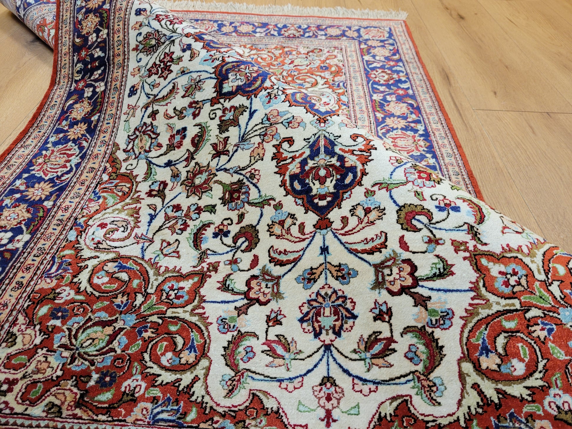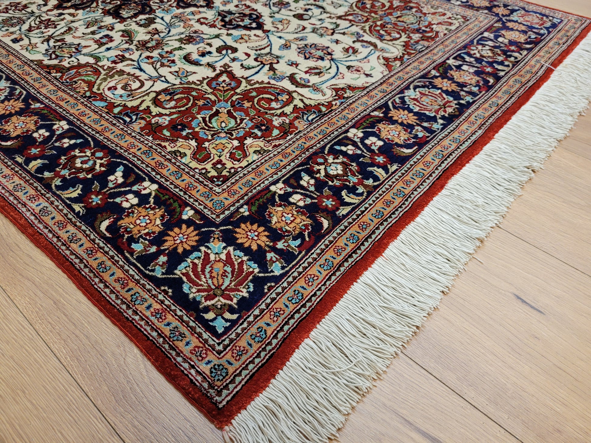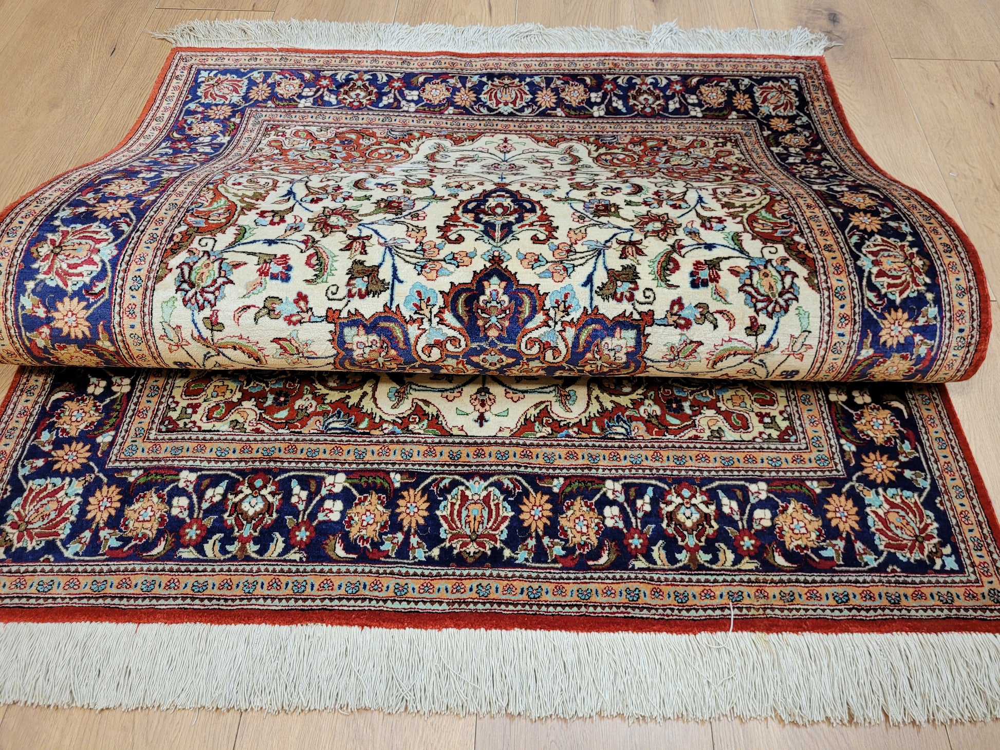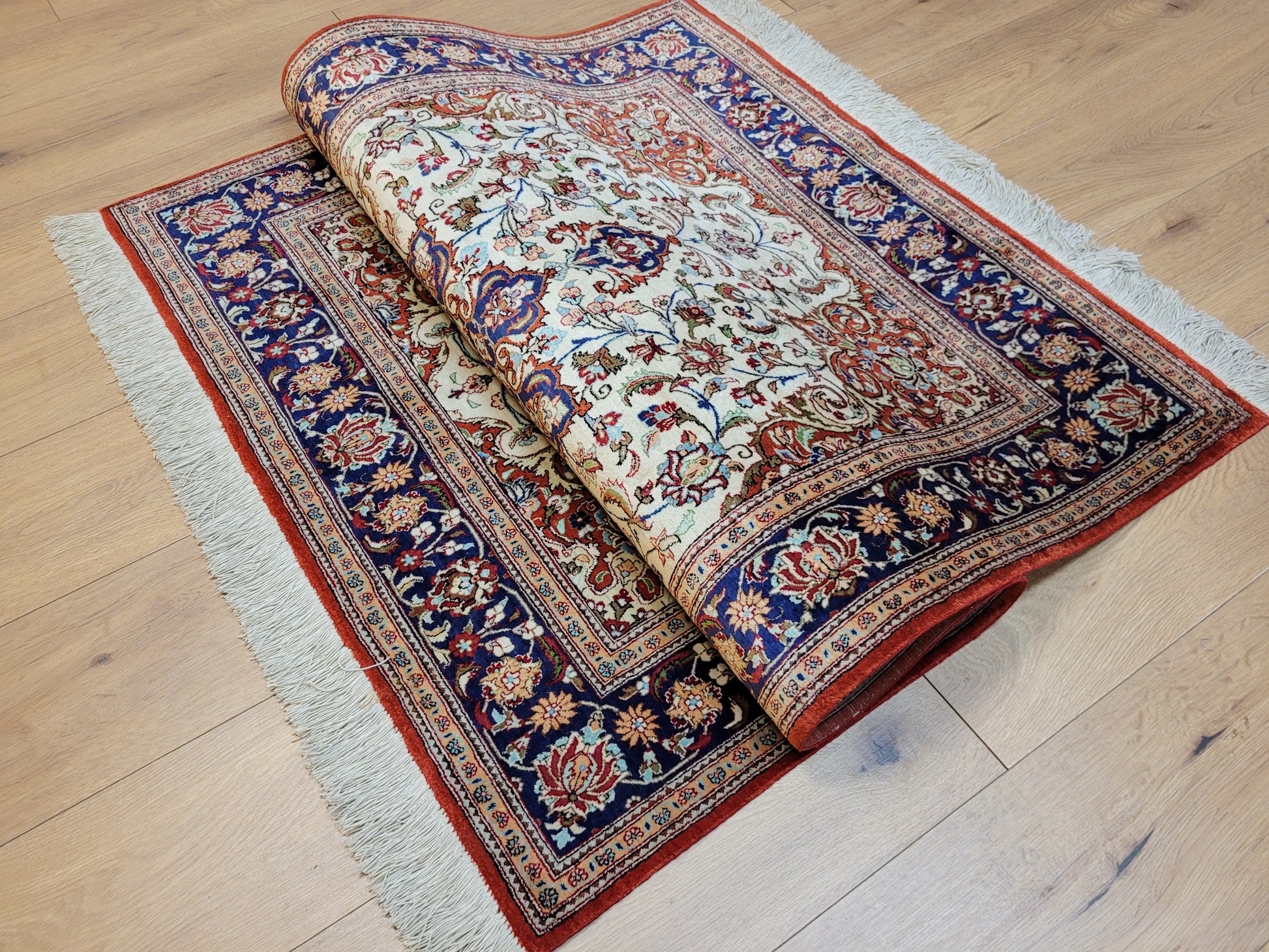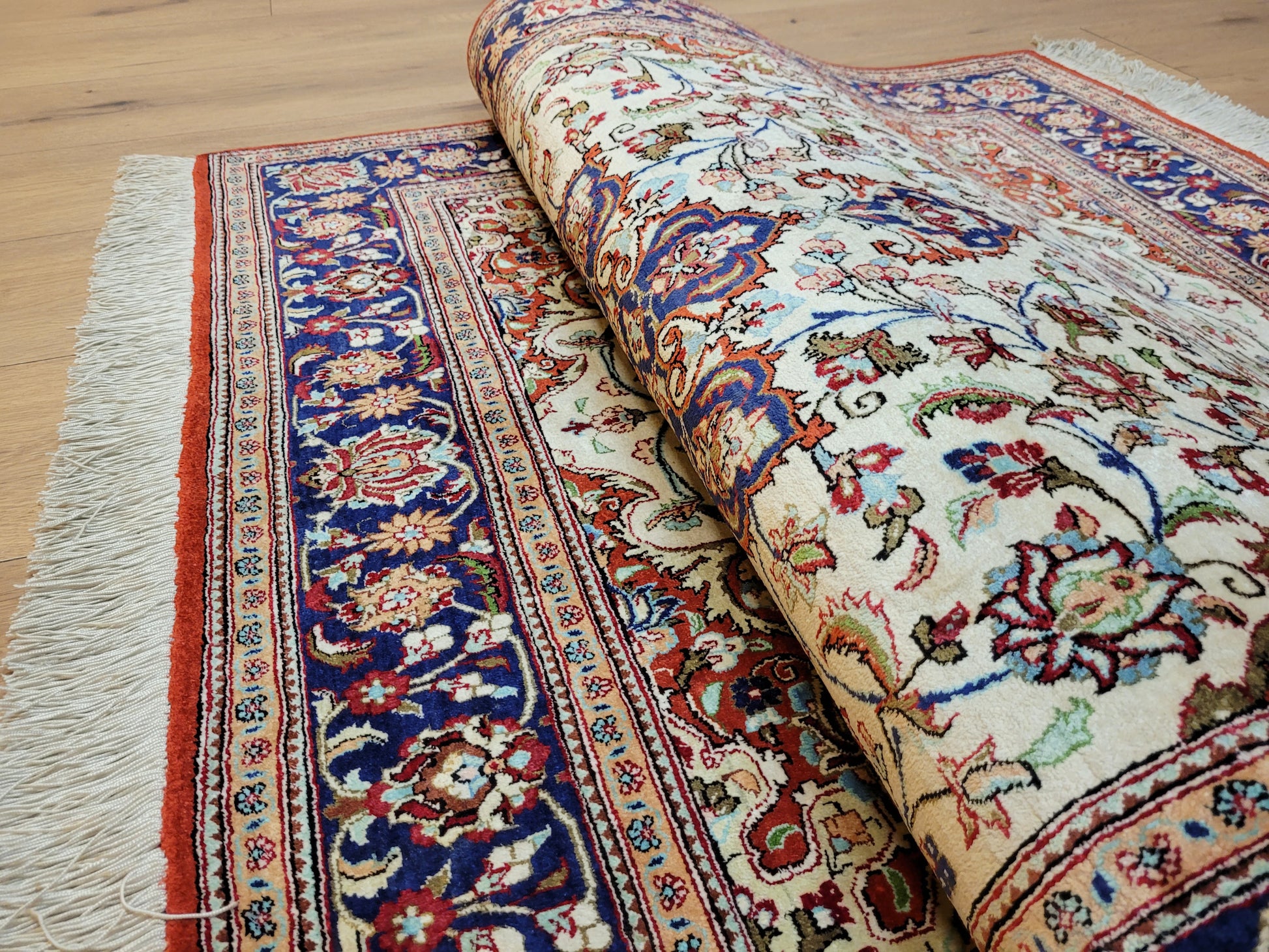 angeboten wird ein edler Ghom Teppich aus feiner Seide auf Seide, handgeknüpft in meisterhafter Ausführung. Im Zentrum des Teppichs befindet sich ein reich verziertes, symmetrisches Medaillon auf hellem Fond. Umgeben wird es von detailreichen Ranken, Blüten und Palmetten in harmonischer Komposition. Die tiefblaue Hauptbordüre mit roten Blütenranken bildet einen markanten Kontrast und verleiht dem Teppich eine elegante Rahmung.