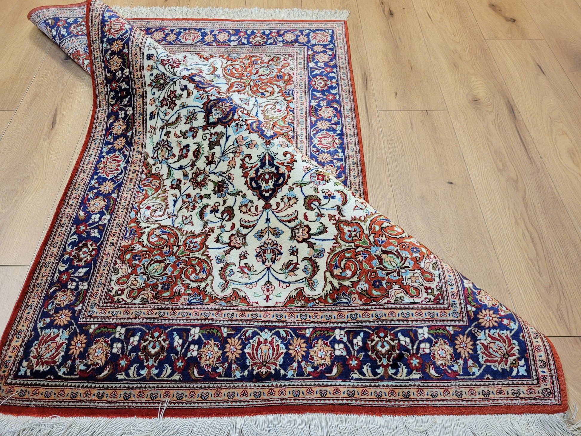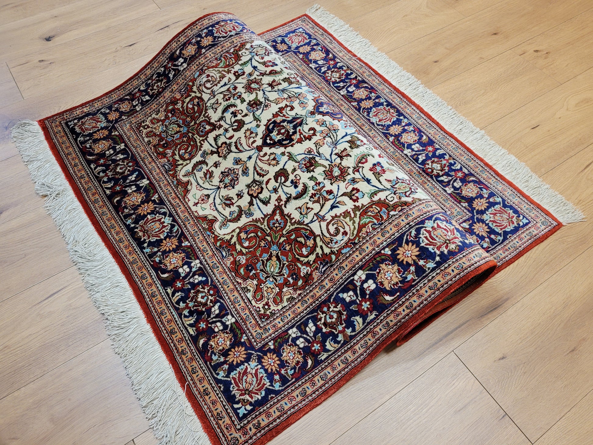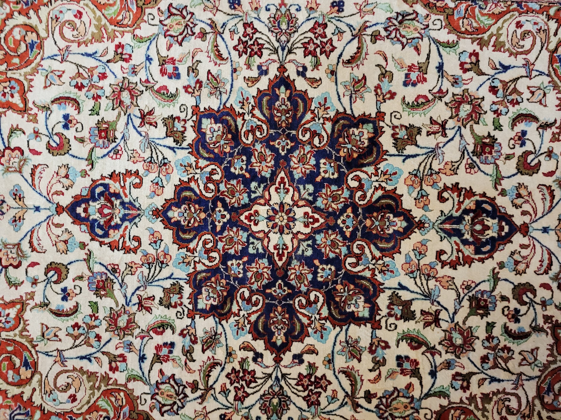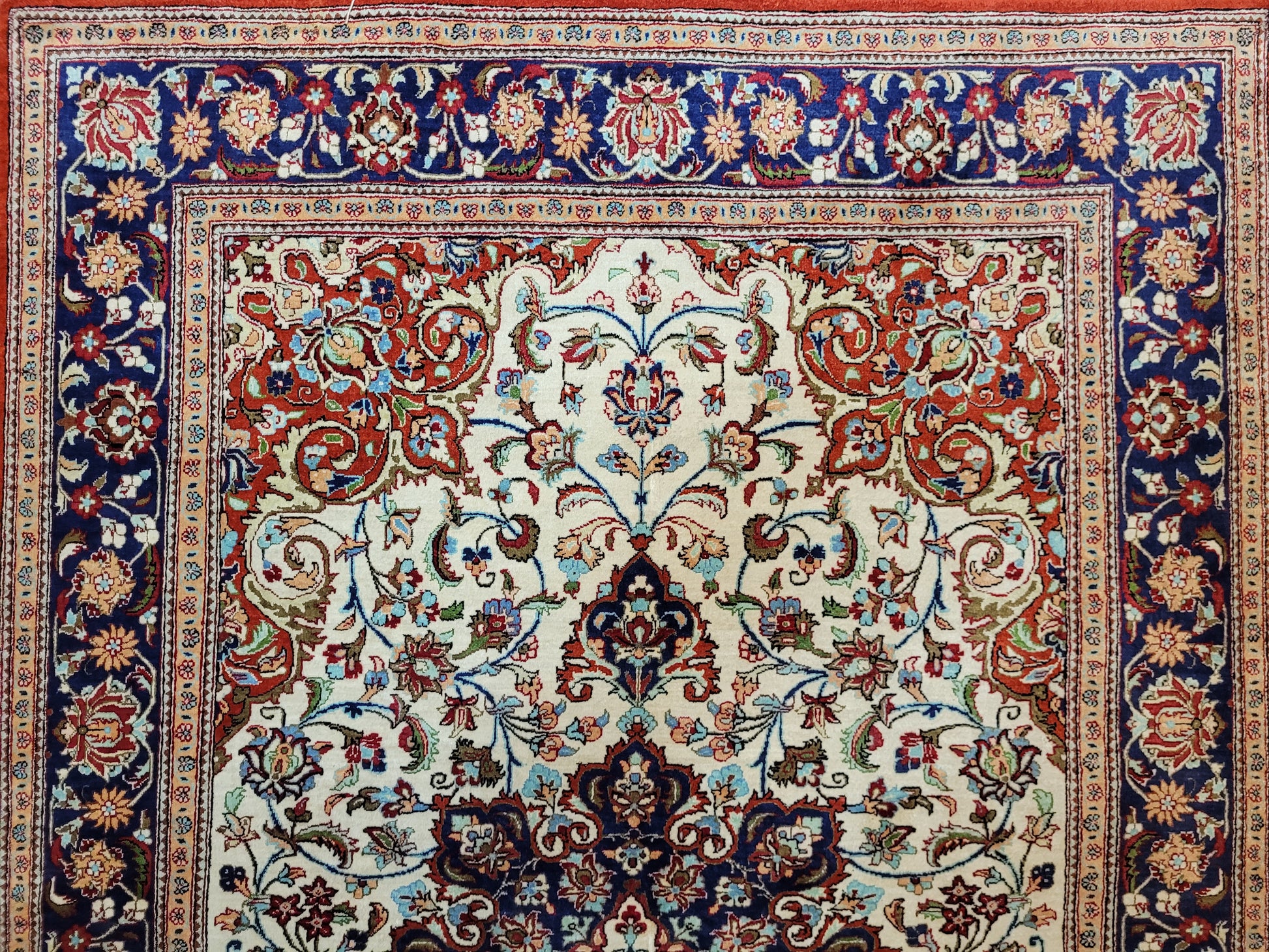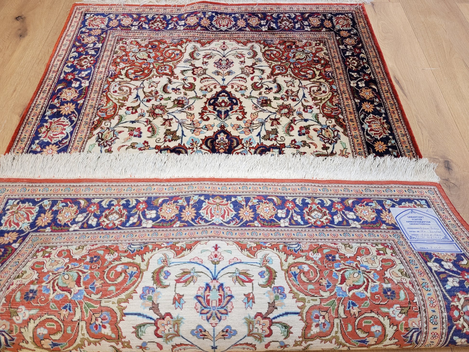 angeboten wird ein edler Ghom Teppich aus feiner Seide auf Seide, handgeknüpft in meisterhafter Ausführung. Im Zentrum des Teppichs befindet sich ein reich verziertes, symmetrisches Medaillon auf hellem Fond. Umgeben wird es von detailreichen Ranken, Blüten und Palmetten in harmonischer Komposition. Die tiefblaue Hauptbordüre mit roten Blütenranken bildet einen markanten Kontrast und verleiht dem Teppich eine elegante Rahmung.