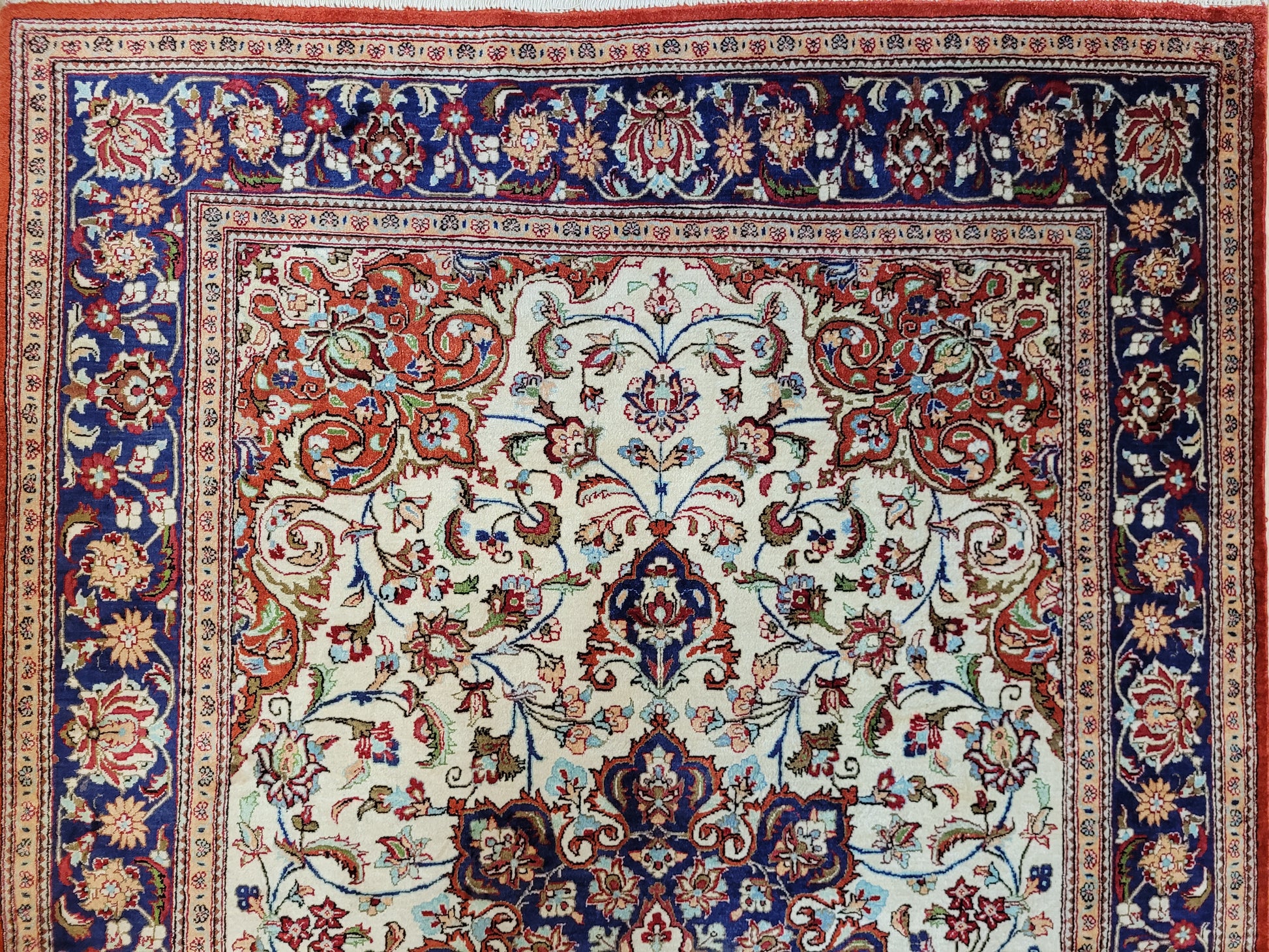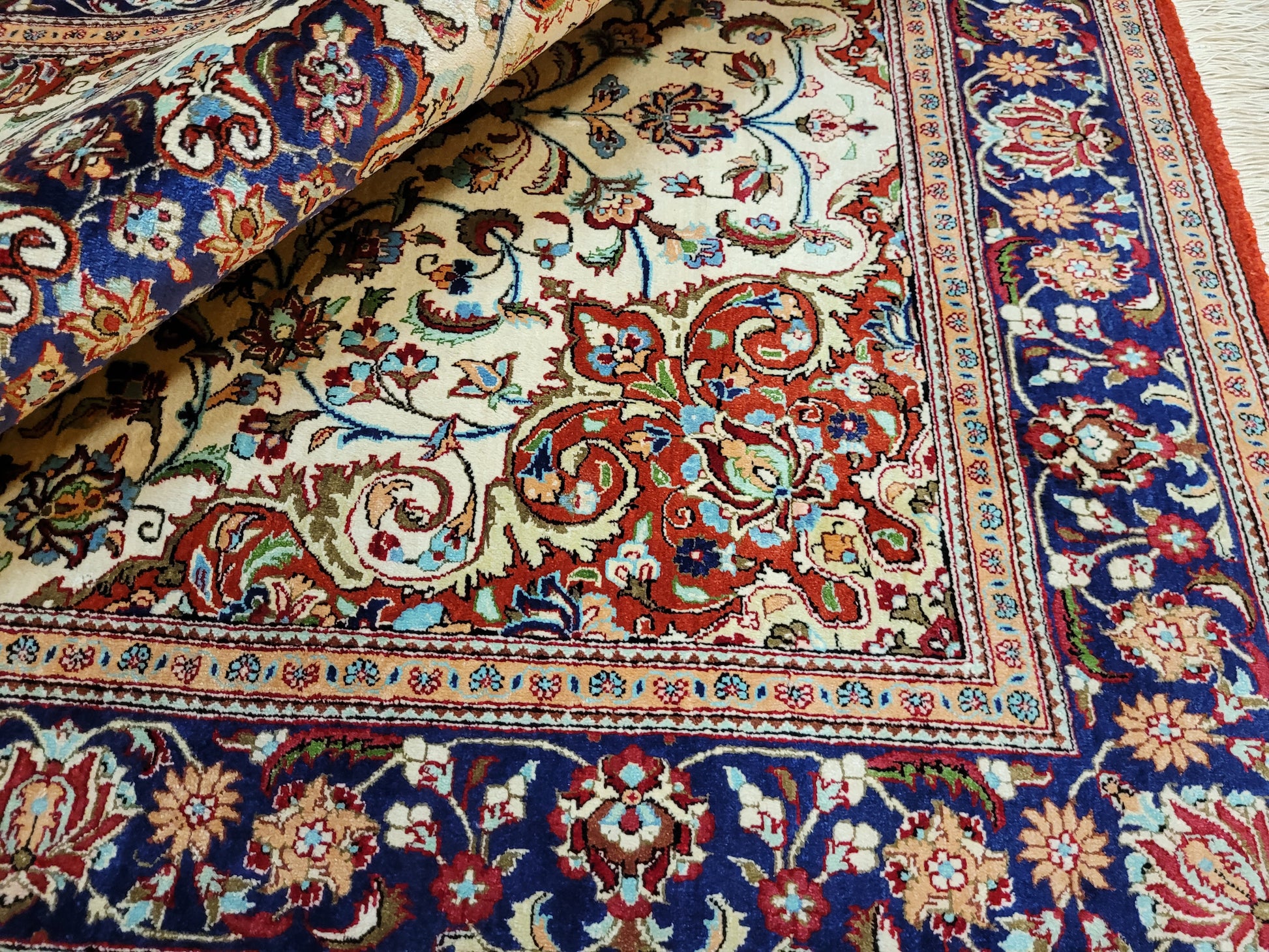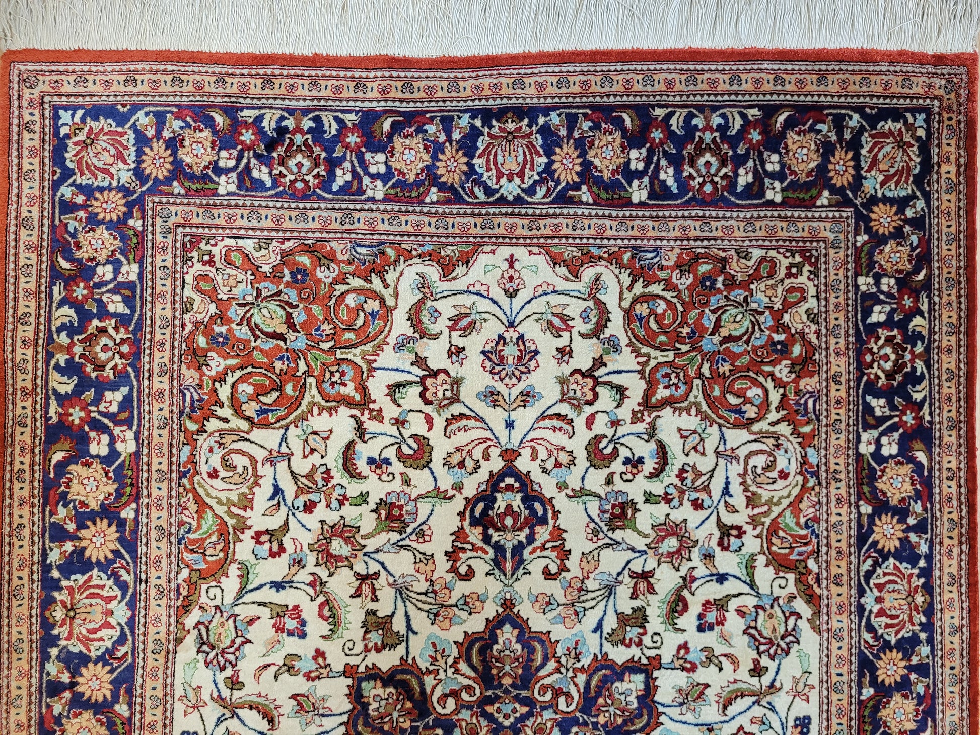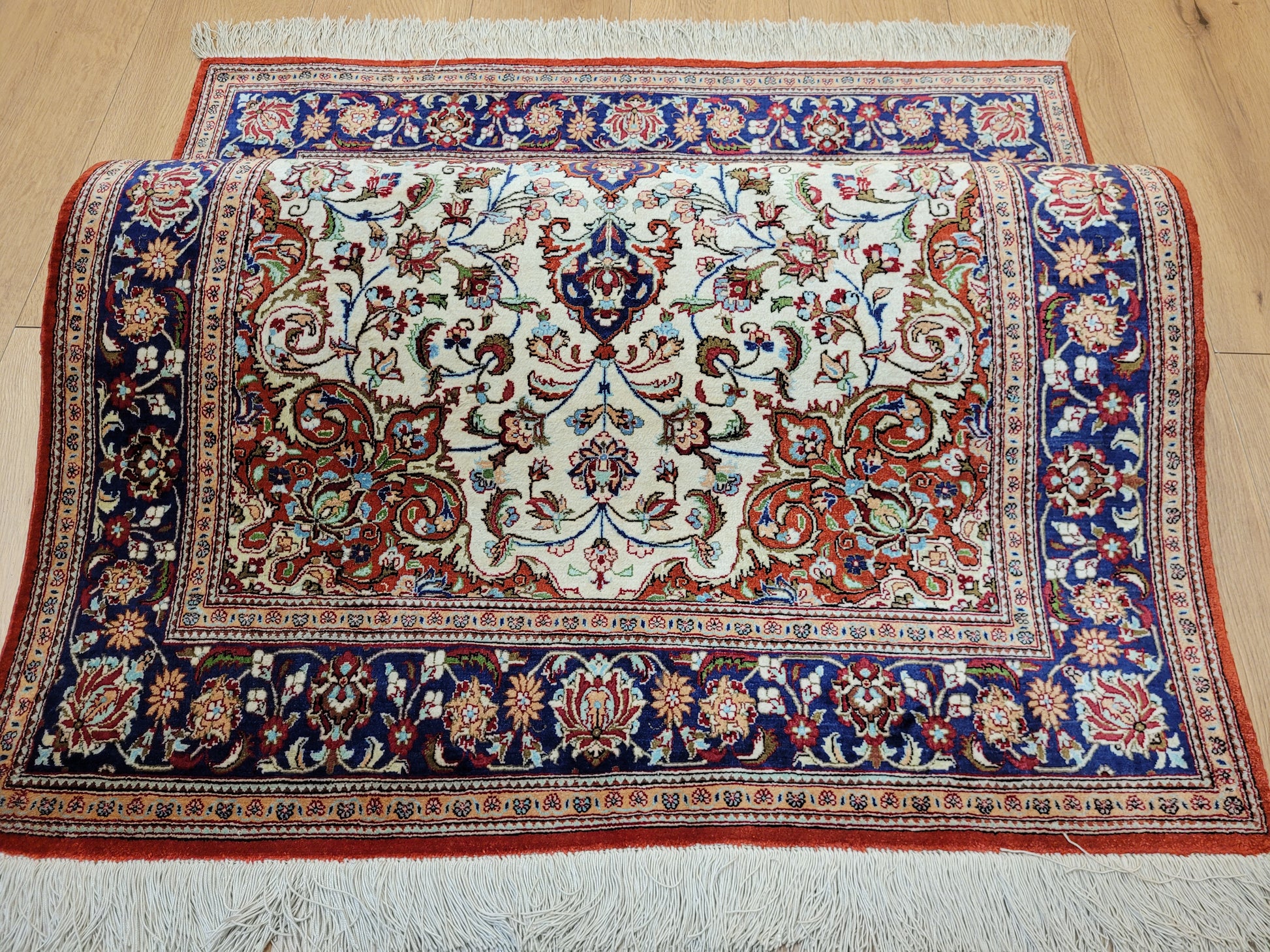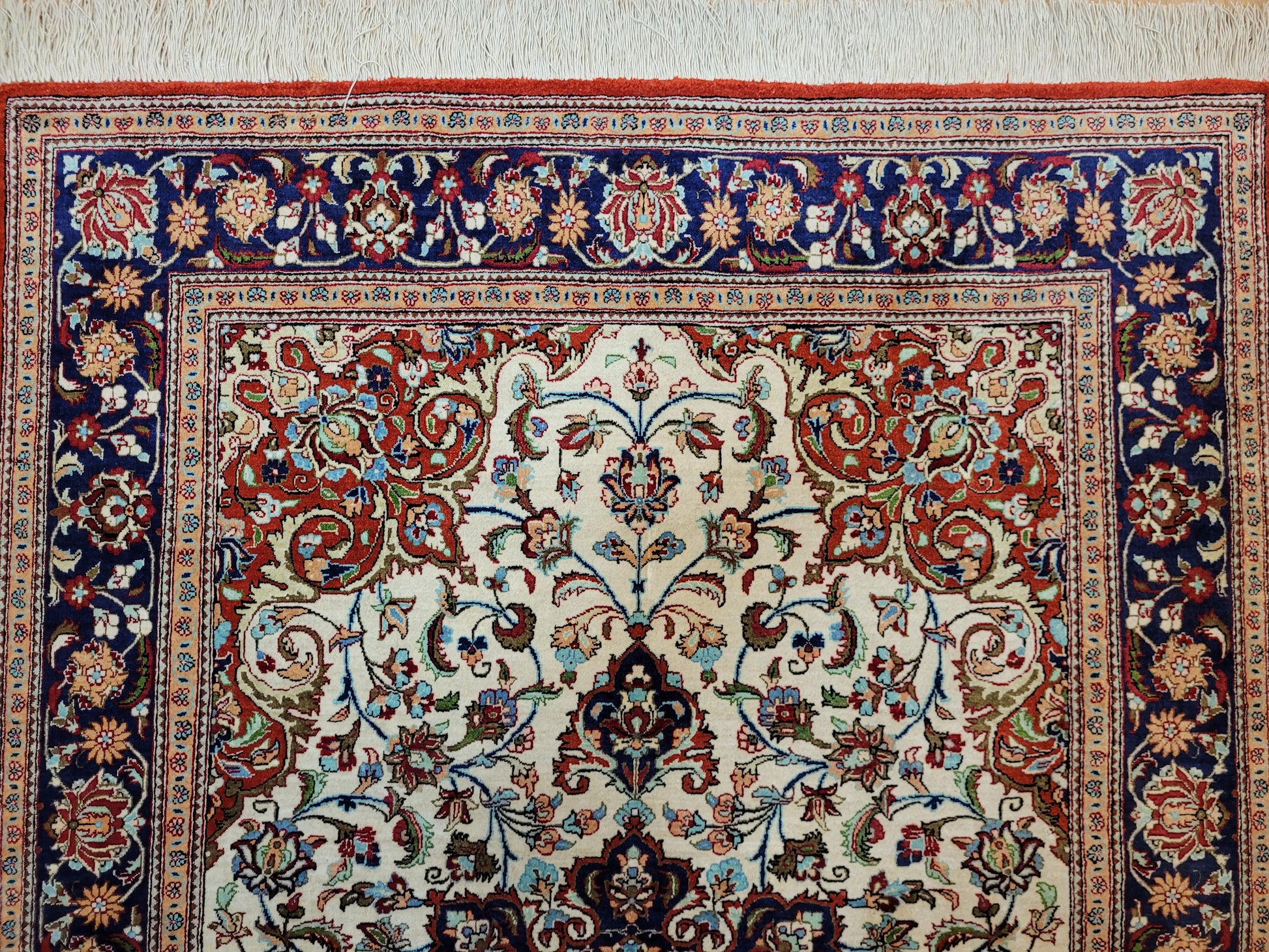 angeboten wird ein edler Ghom Teppich aus feiner Seide auf Seide, handgeknüpft in meisterhafter Ausführung. Im Zentrum des Teppichs befindet sich ein reich verziertes, symmetrisches Medaillon auf hellem Fond. Umgeben wird es von detailreichen Ranken, Blüten und Palmetten in harmonischer Komposition. Die tiefblaue Hauptbordüre mit roten Blütenranken bildet einen markanten Kontrast und verleiht dem Teppich eine elegante Rahmung.