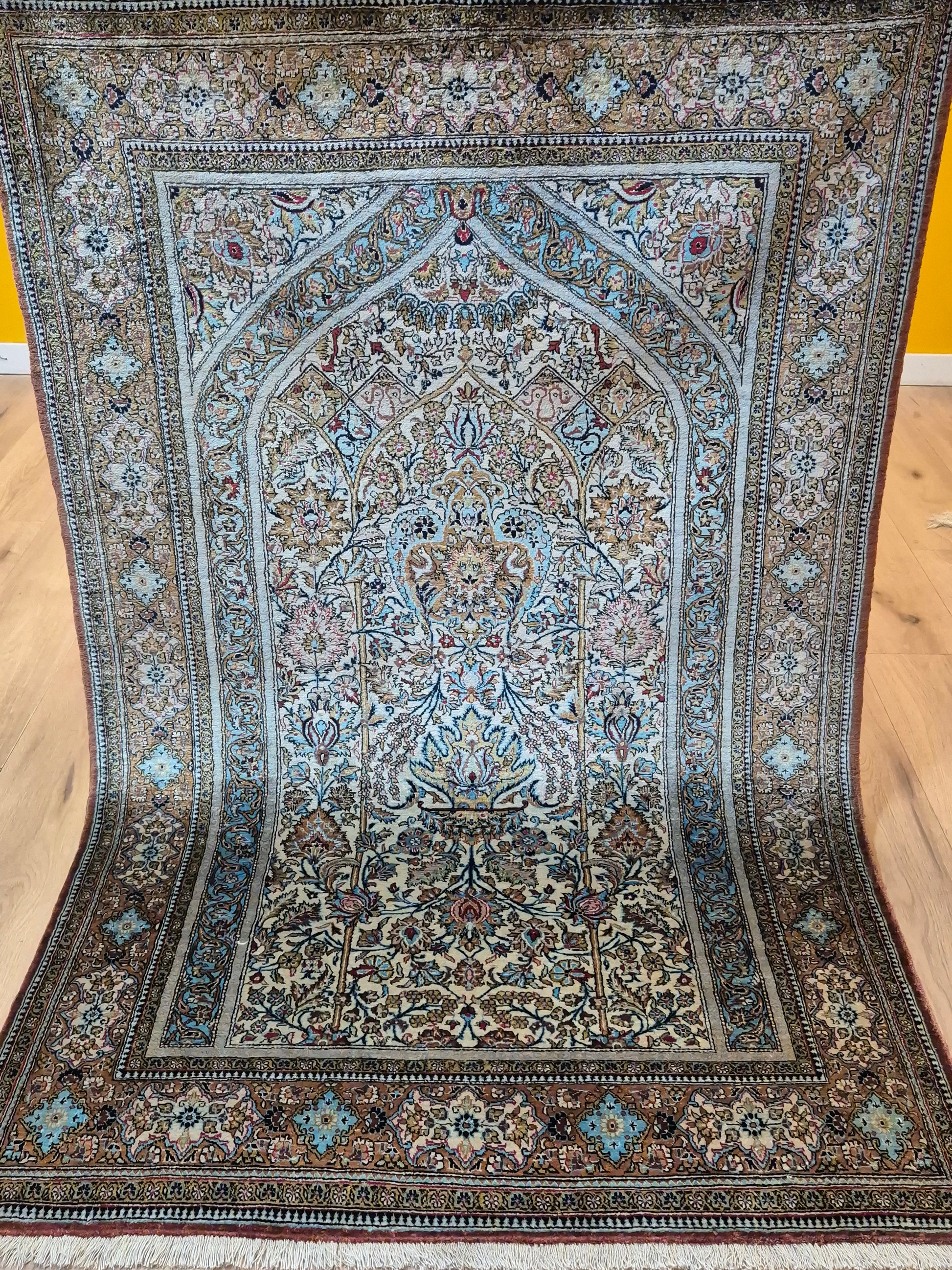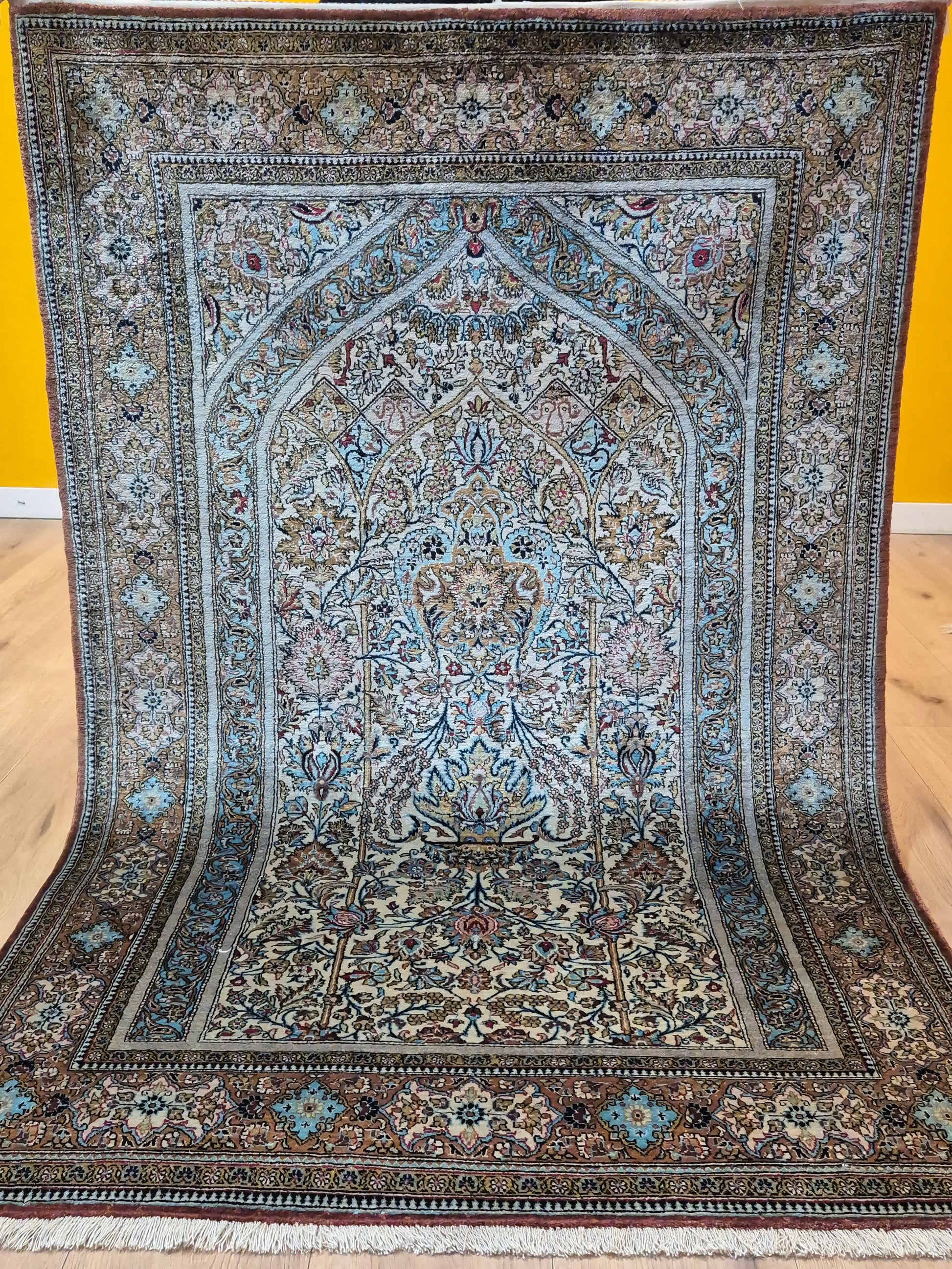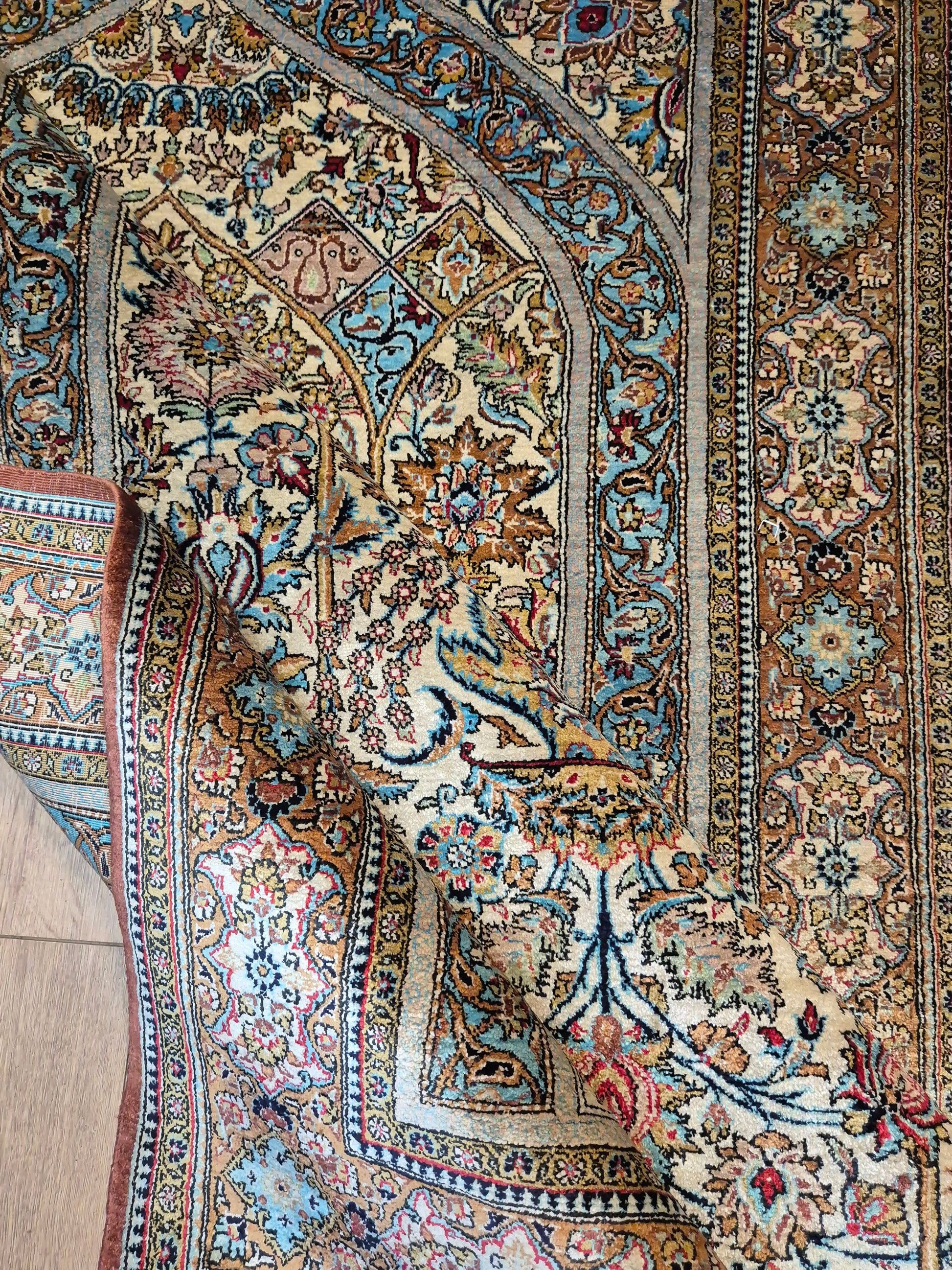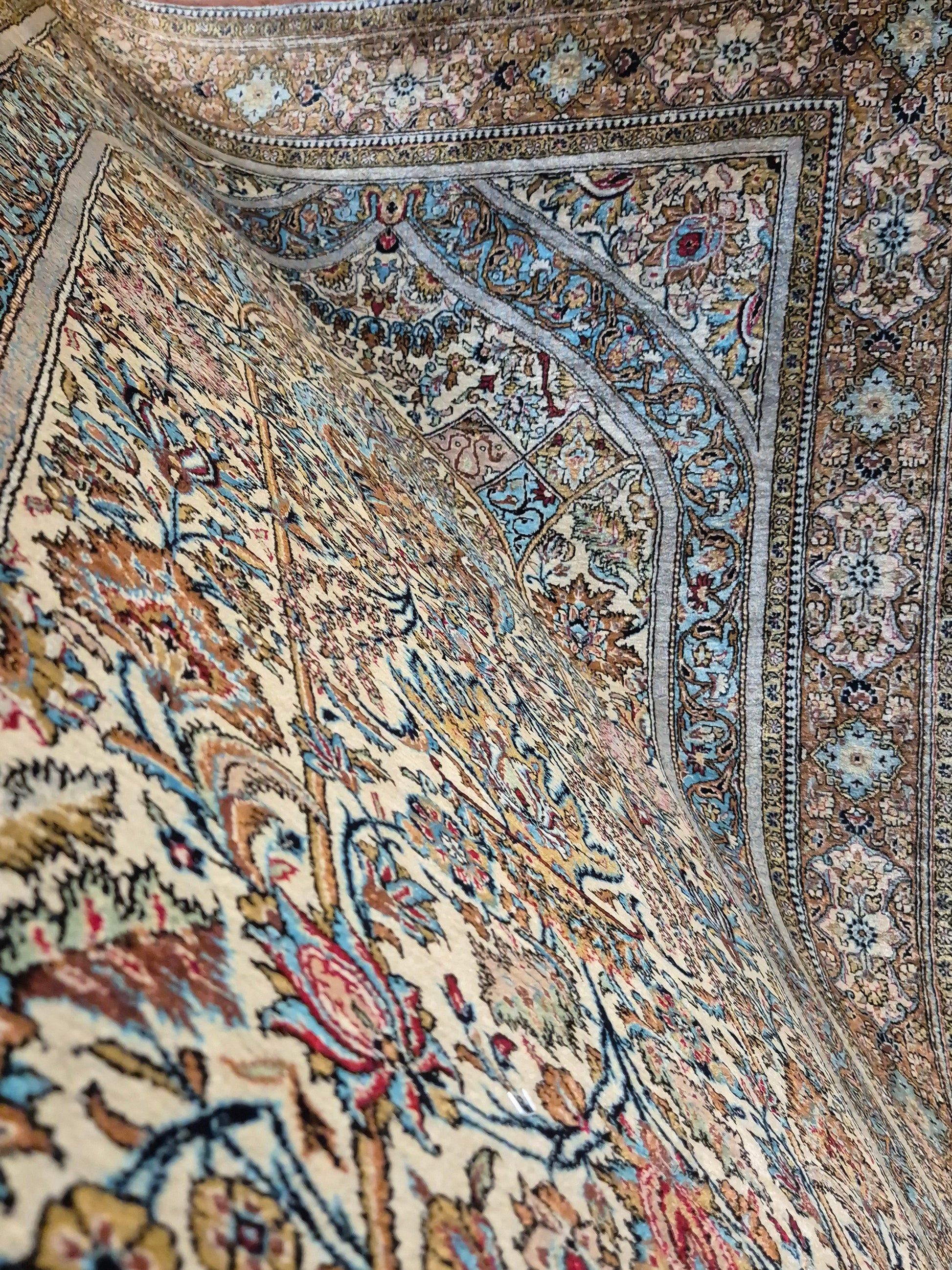 angeboten wird ein edler Ghom Teppich aus reiner Seide auf Seide, handgeknüpft in feinster Ausführung. Das Design zeigt ein klassisches Mihrab-Motiv mit kunstvoll geschwungenem Bogenfeld, gefüllt mit detailreich ausgearbeiteten Blütenranken, Rosetten und floralen Arabesken. Die Farbkomposition aus zarten Pastelltönen, kräftigem Blau, warmem Goldbraun und Akzenten in Rot und Rosa verleiht dem Teppich eine harmonische Eleganz.