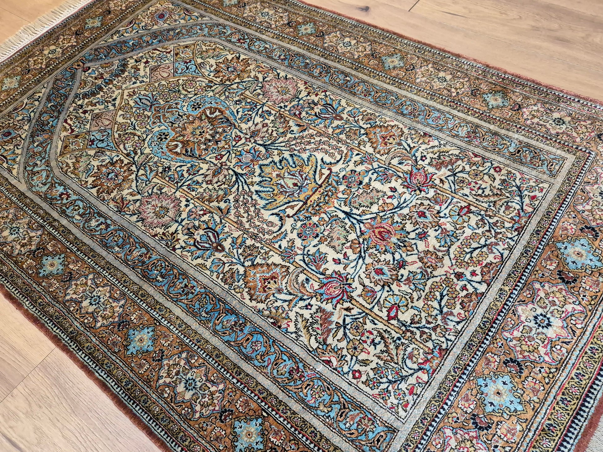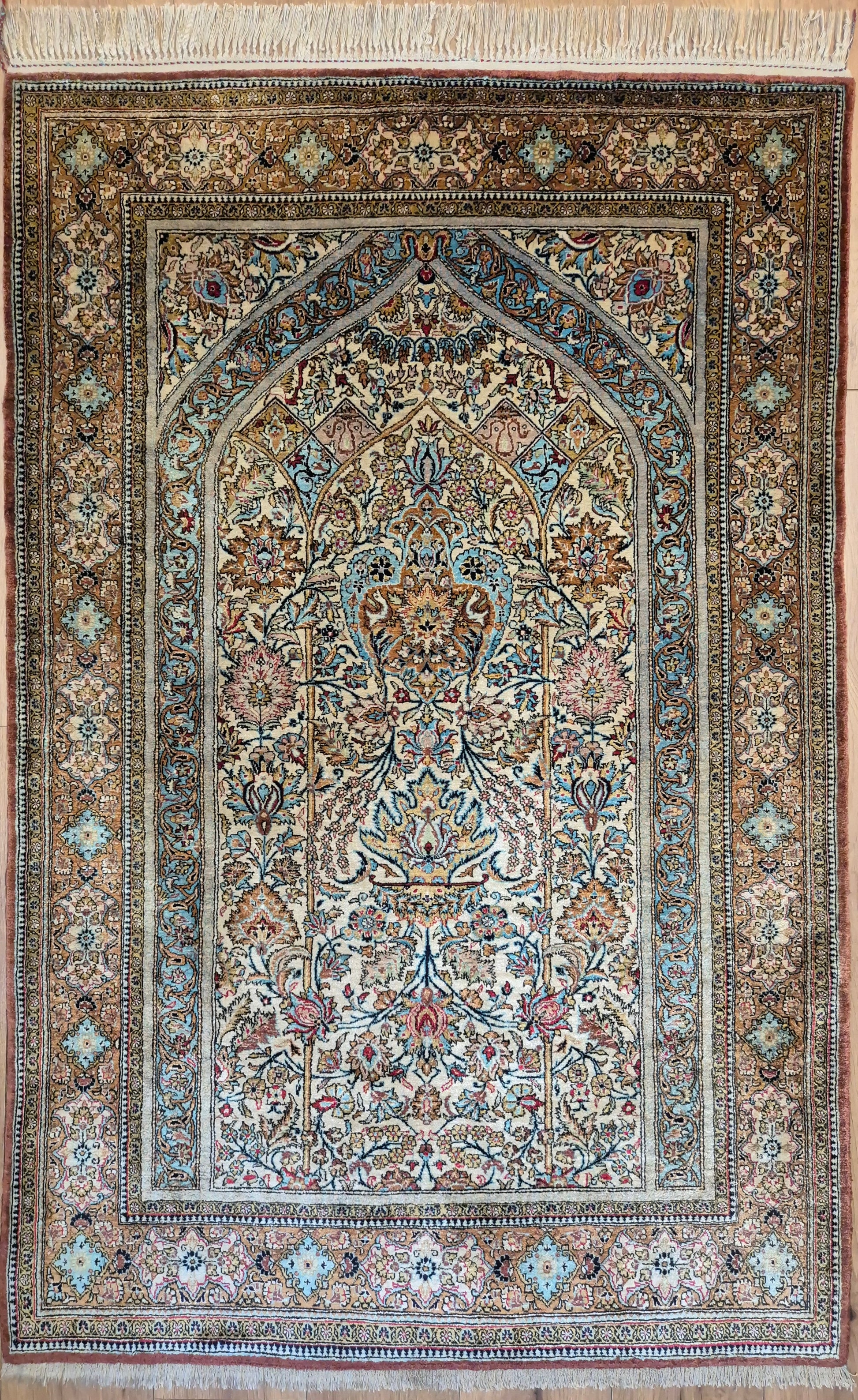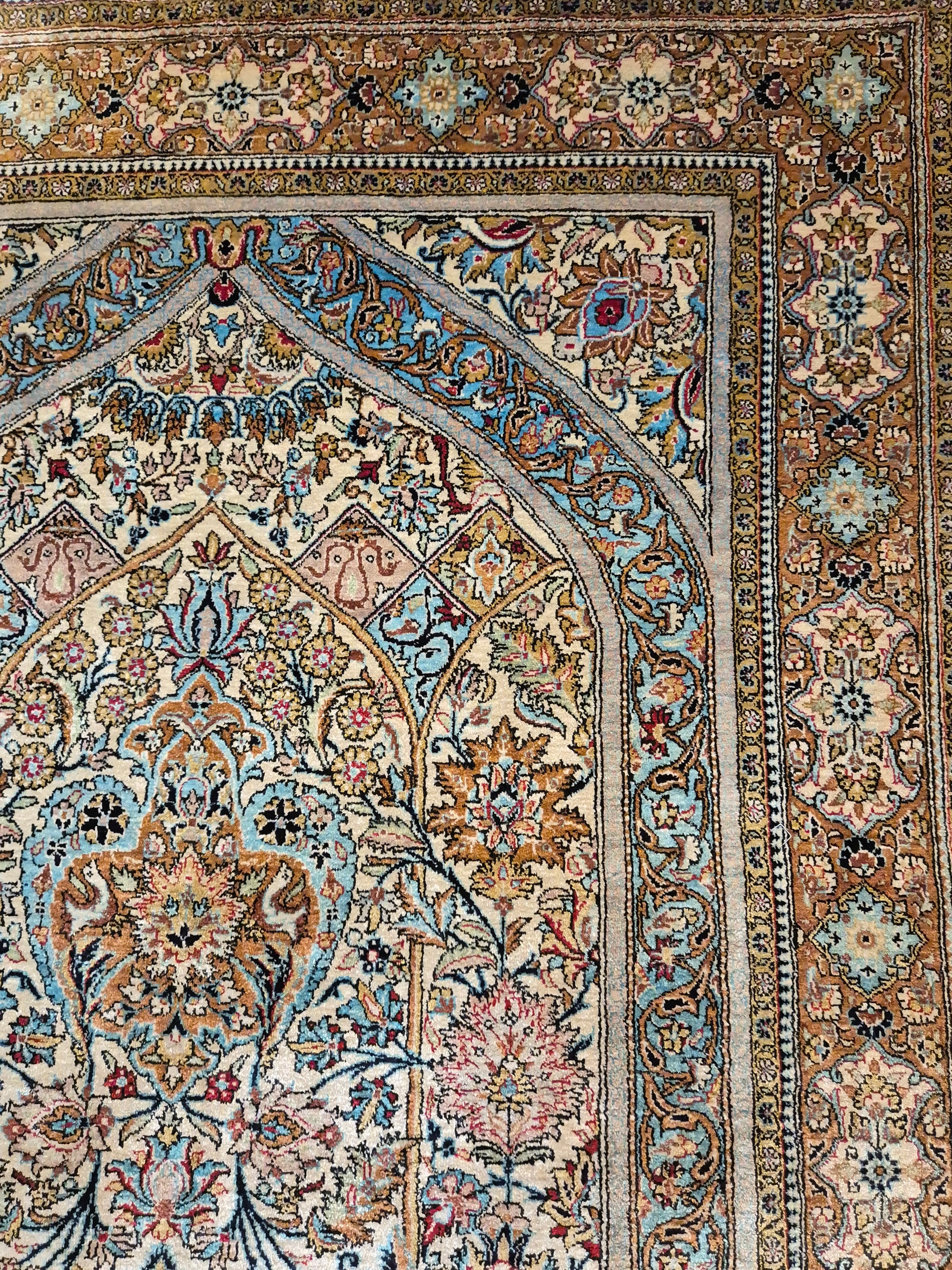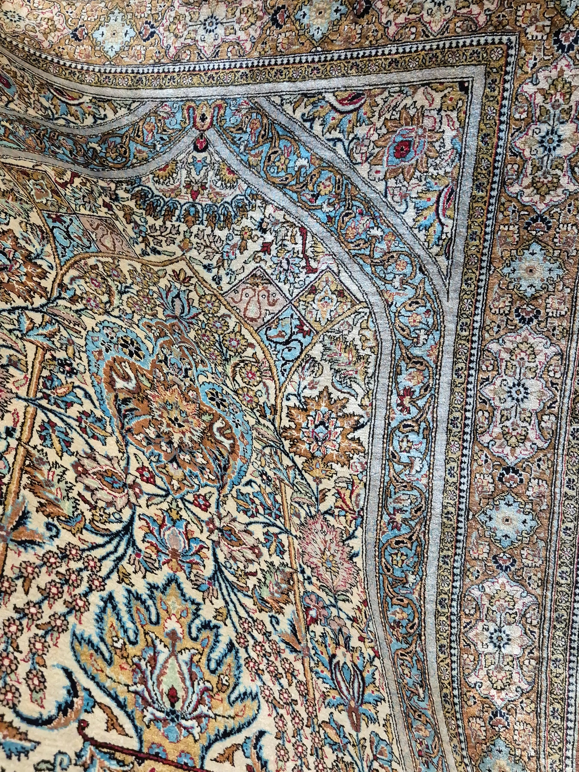 angeboten wird ein edler Ghom Teppich aus reiner Seide auf Seide, handgeknüpft in feinster Ausführung. Das Design zeigt ein klassisches Mihrab-Motiv mit kunstvoll geschwungenem Bogenfeld, gefüllt mit detailreich ausgearbeiteten Blütenranken, Rosetten und floralen Arabesken. Die Farbkomposition aus zarten Pastelltönen, kräftigem Blau, warmem Goldbraun und Akzenten in Rot und Rosa verleiht dem Teppich eine harmonische Eleganz.