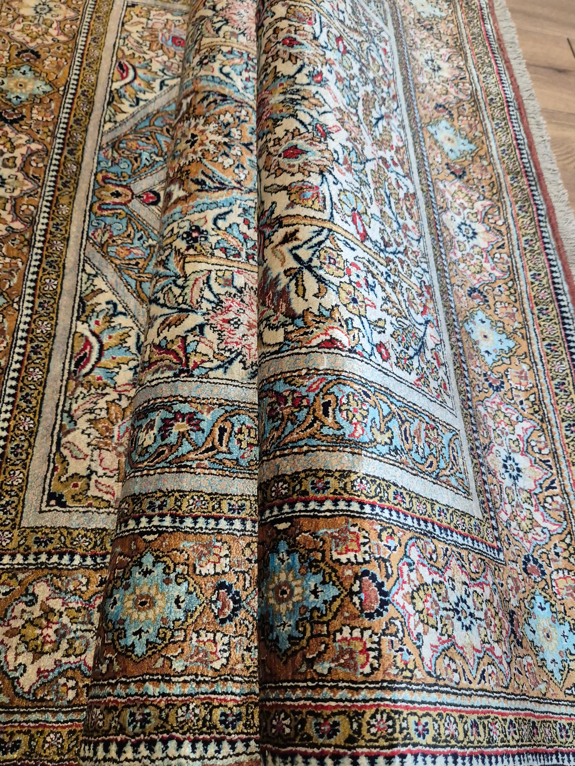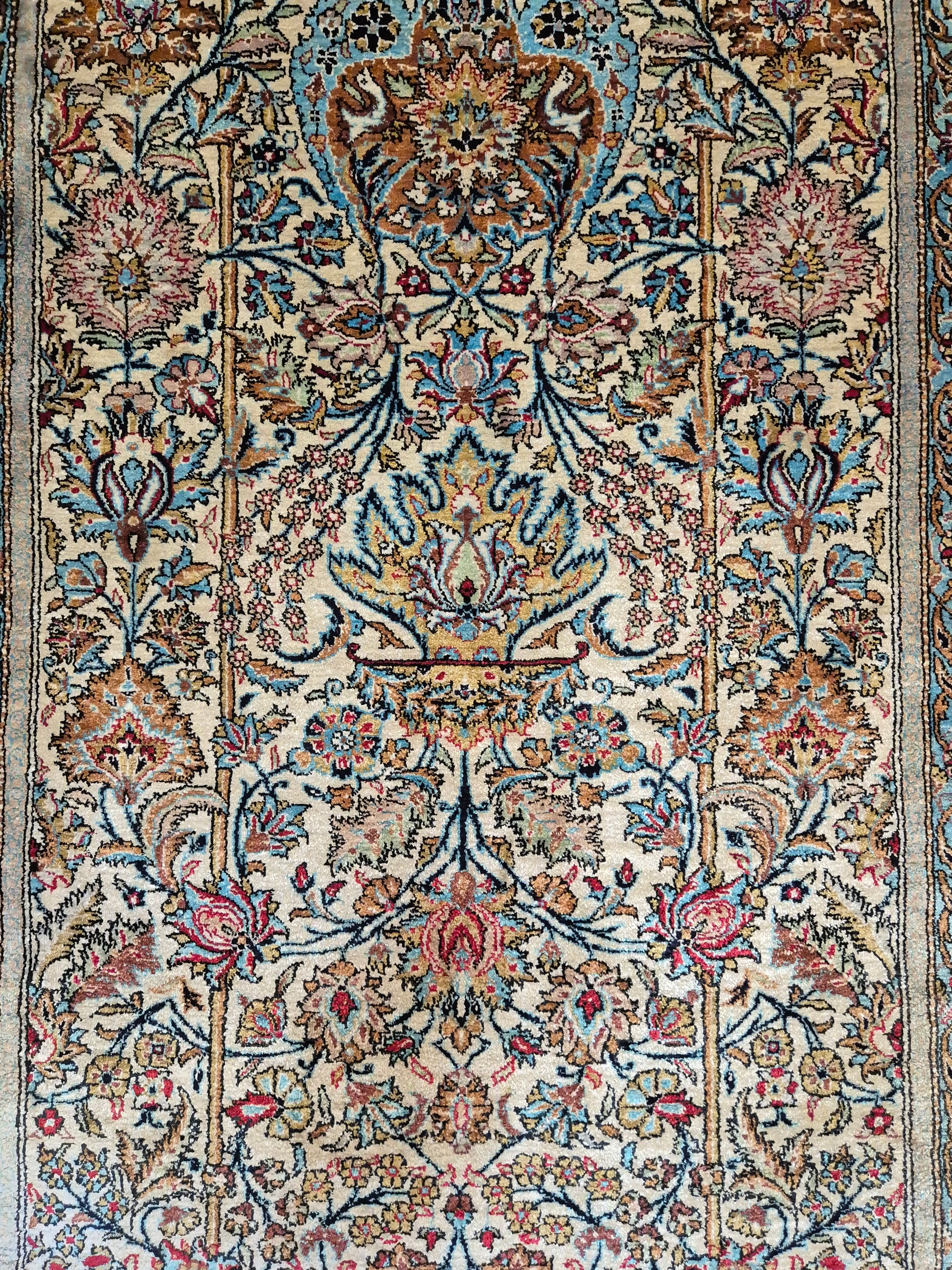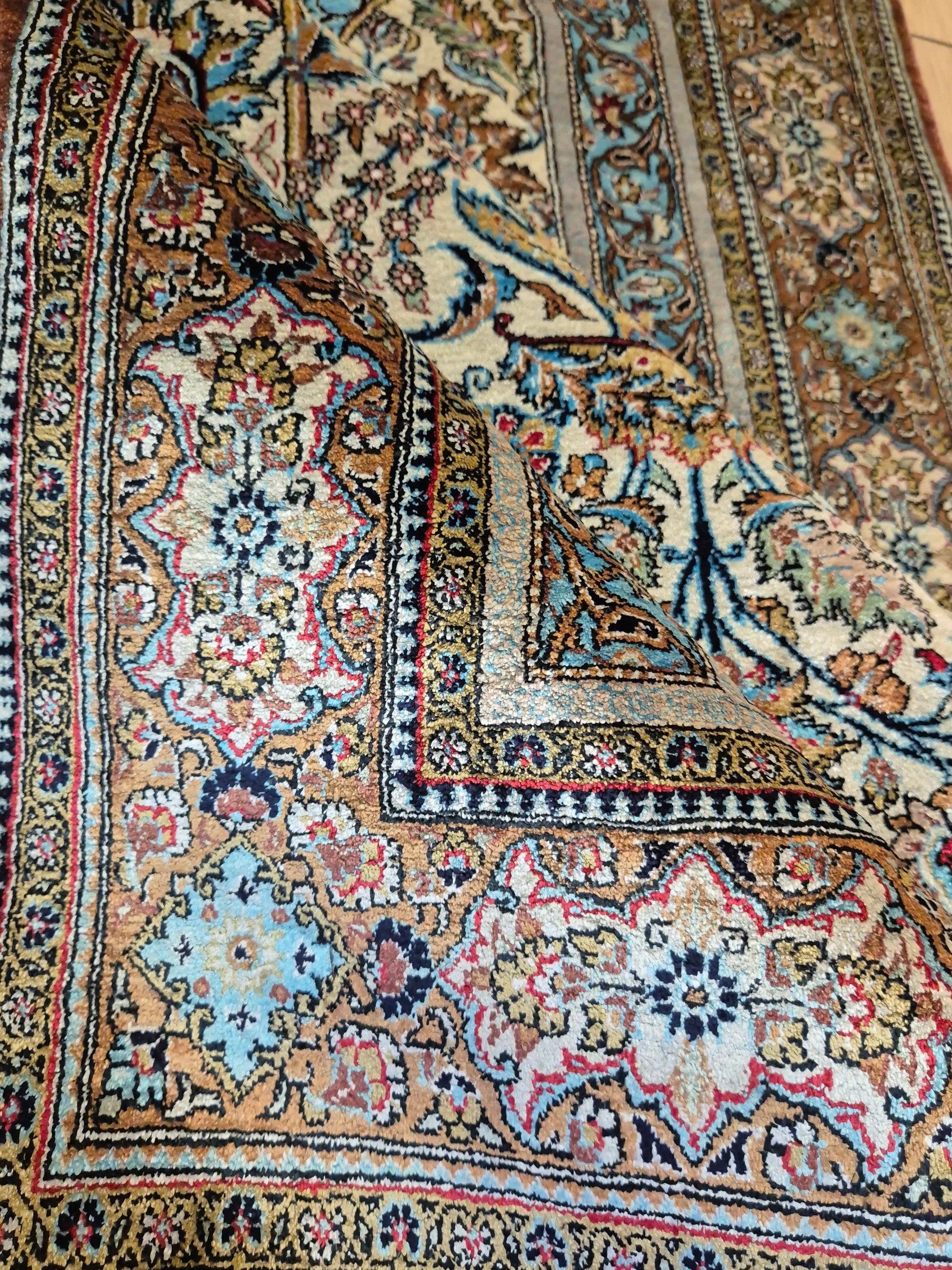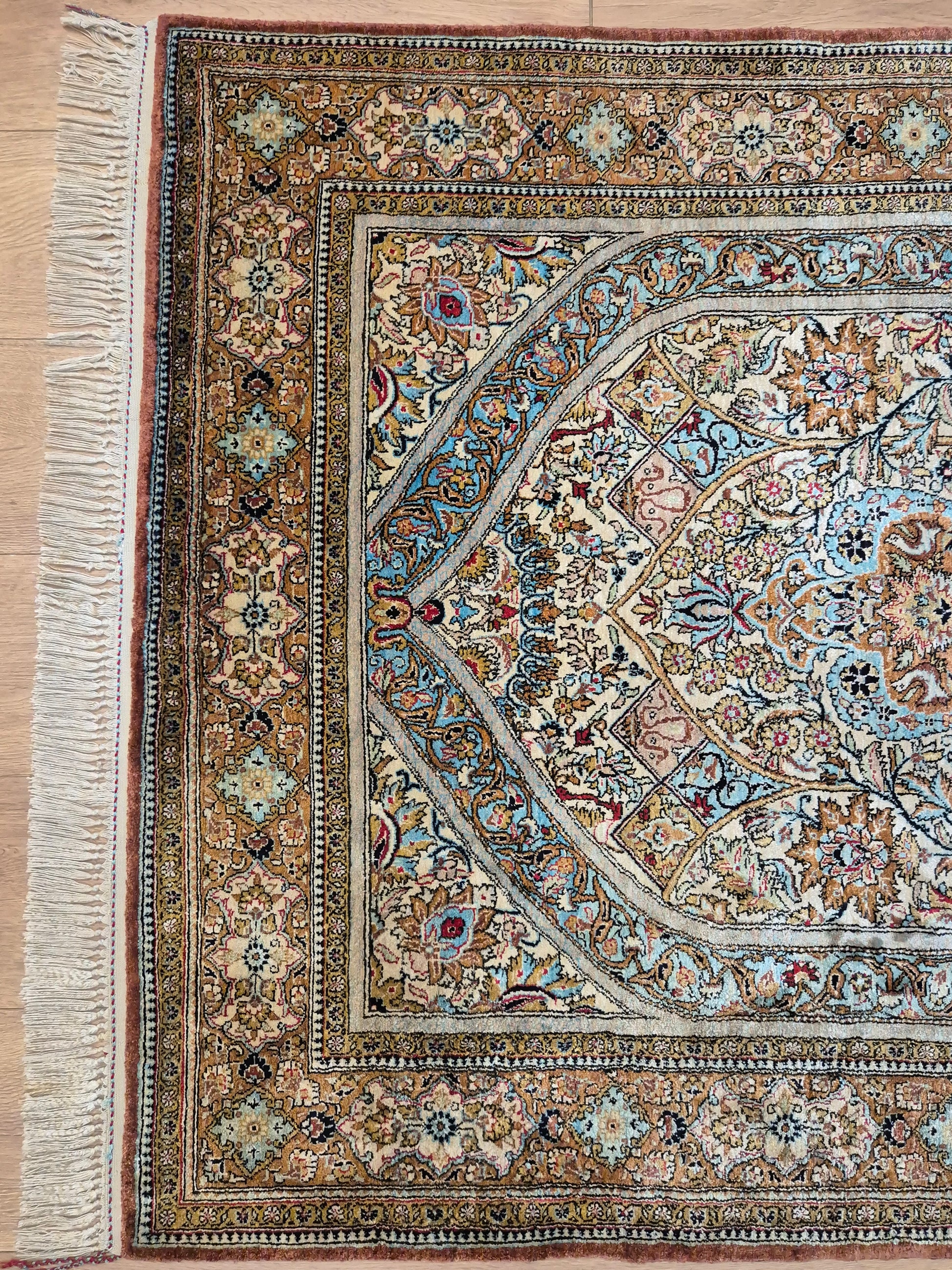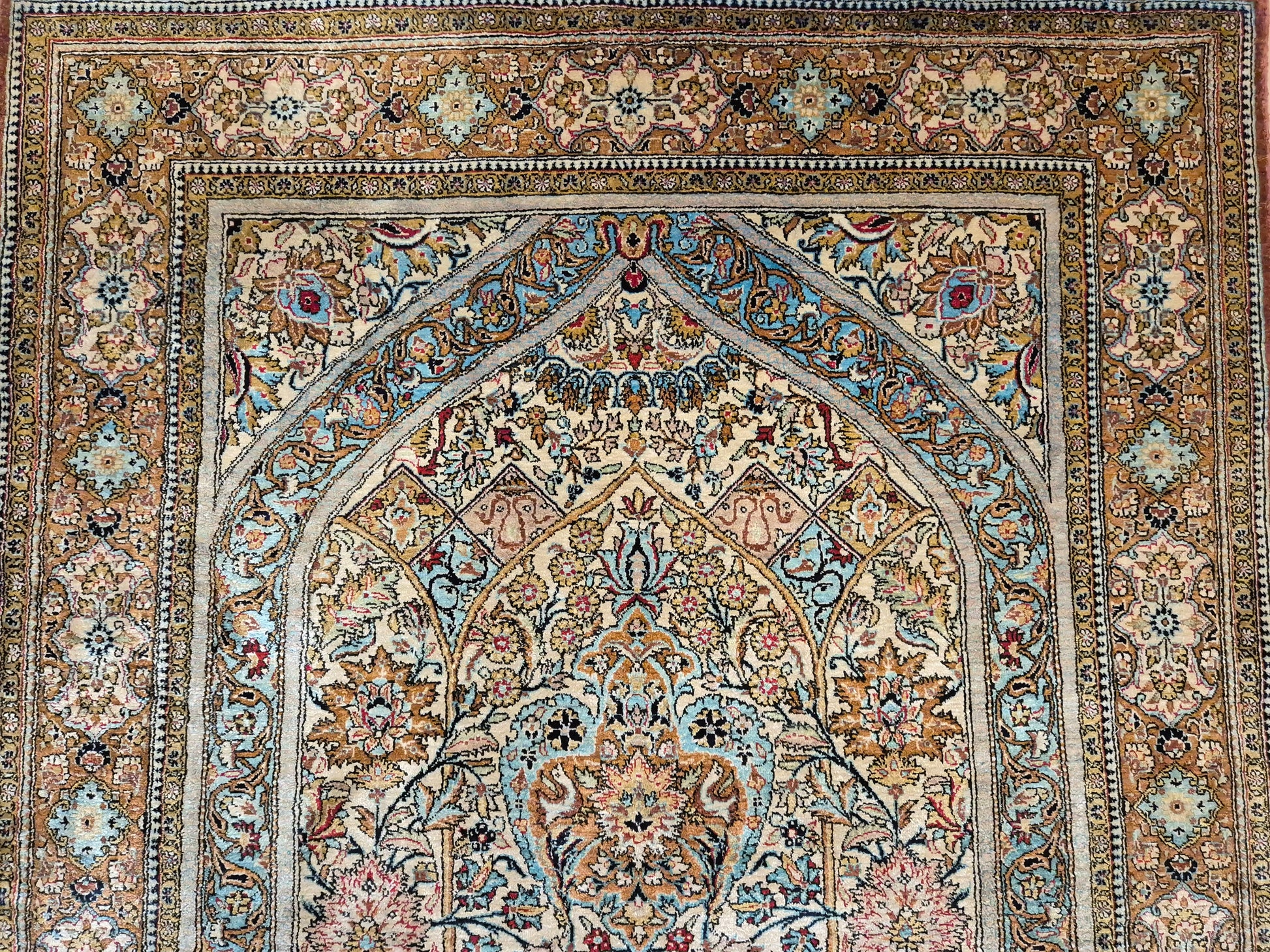 angeboten wird ein edler Ghom Teppich aus reiner Seide auf Seide, handgeknüpft in feinster Ausführung. Das Design zeigt ein klassisches Mihrab-Motiv mit kunstvoll geschwungenem Bogenfeld, gefüllt mit detailreich ausgearbeiteten Blütenranken, Rosetten und floralen Arabesken. Die Farbkomposition aus zarten Pastelltönen, kräftigem Blau, warmem Goldbraun und Akzenten in Rot und Rosa verleiht dem Teppich eine harmonische Eleganz.