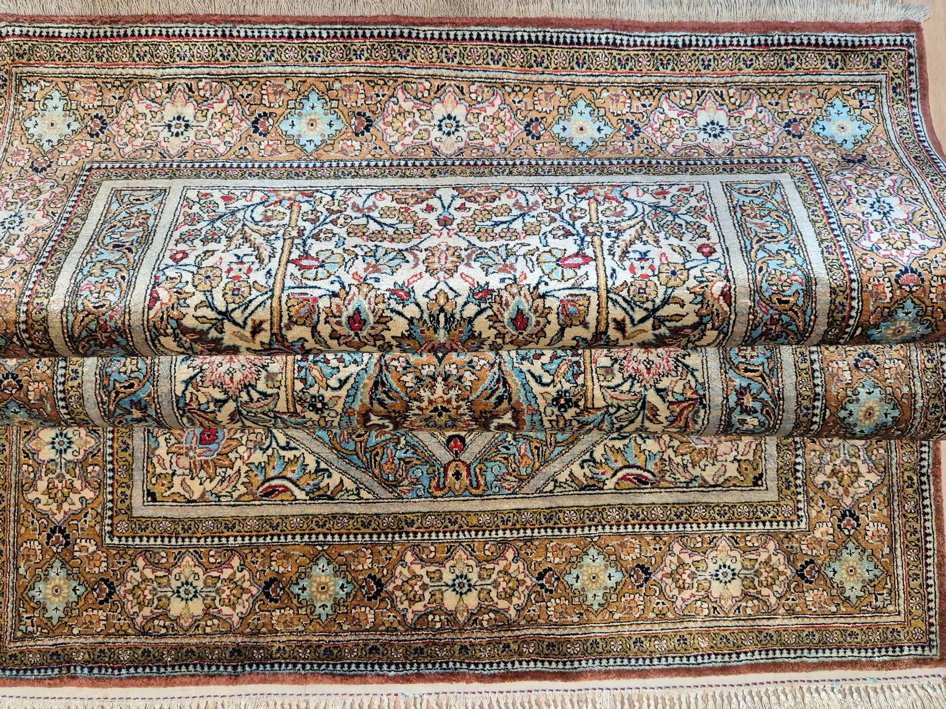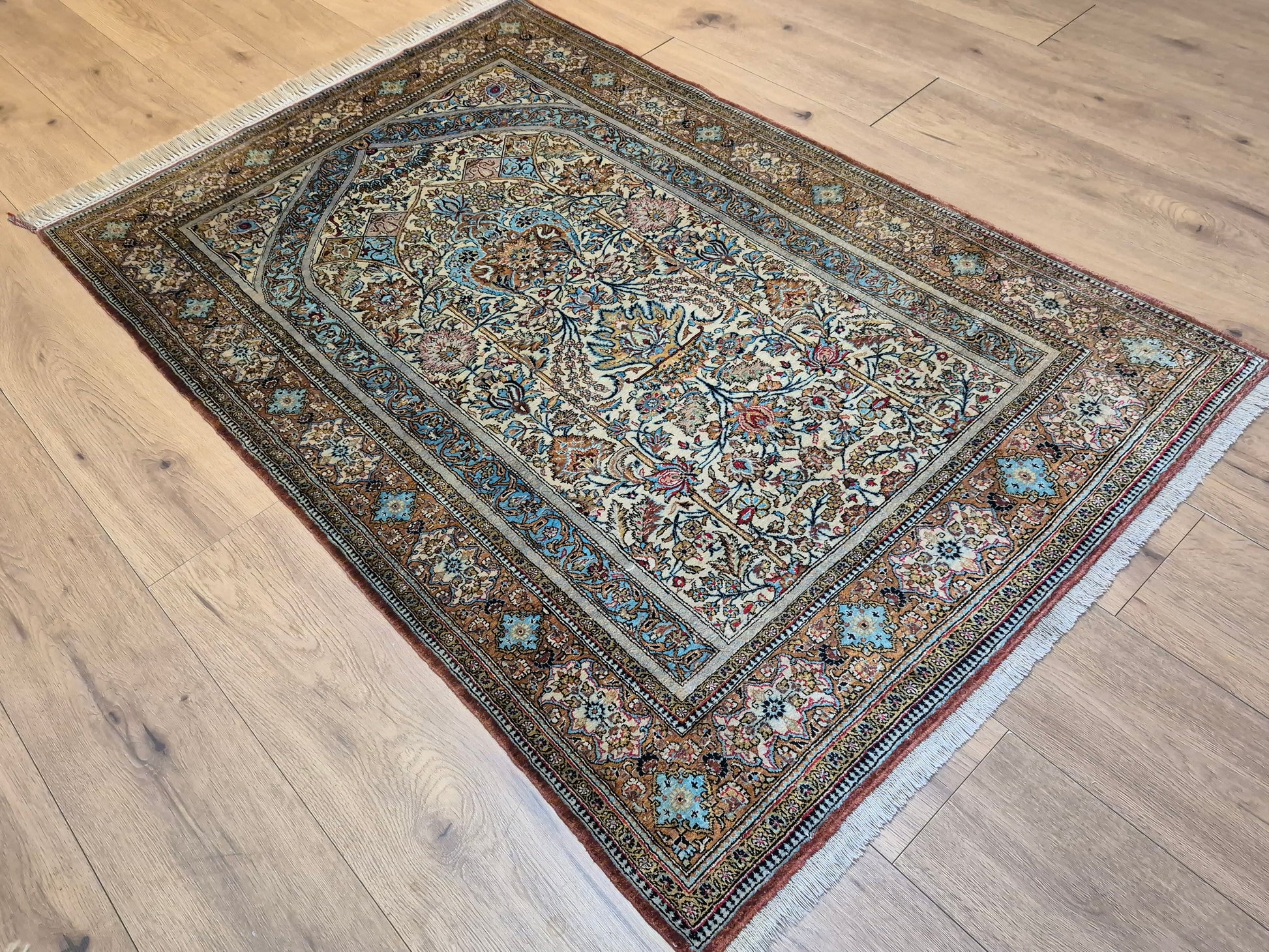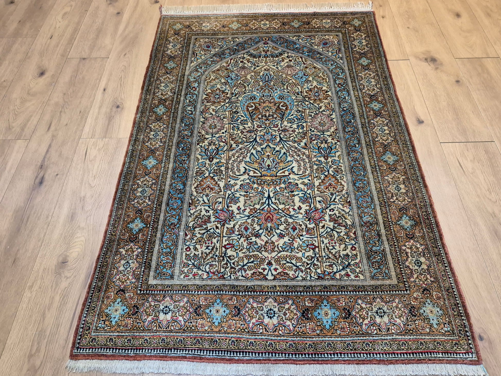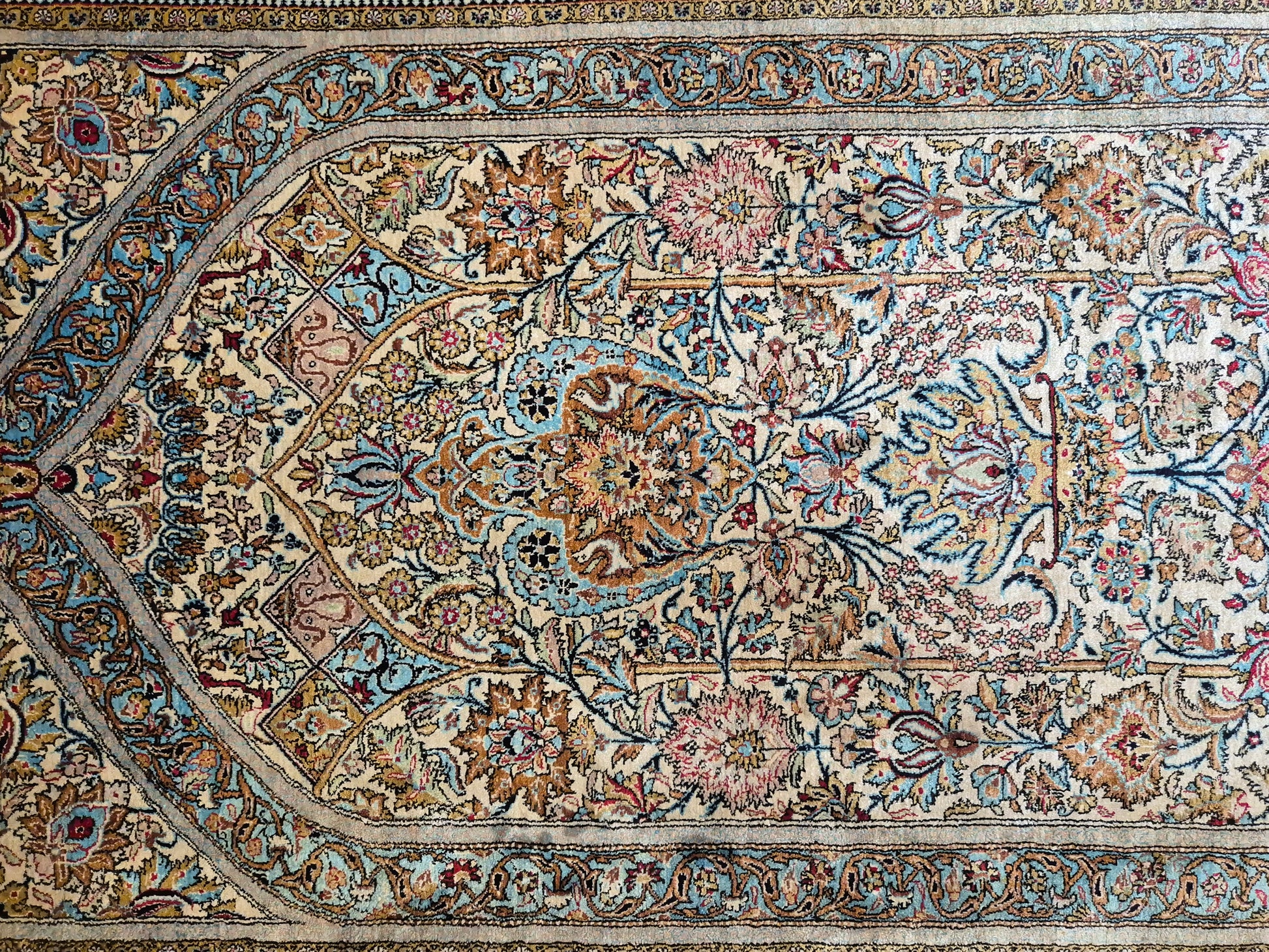 angeboten wird ein edler Ghom Teppich aus reiner Seide auf Seide, handgeknüpft in feinster Ausführung. Das Design zeigt ein klassisches Mihrab-Motiv mit kunstvoll geschwungenem Bogenfeld, gefüllt mit detailreich ausgearbeiteten Blütenranken, Rosetten und floralen Arabesken. Die Farbkomposition aus zarten Pastelltönen, kräftigem Blau, warmem Goldbraun und Akzenten in Rot und Rosa verleiht dem Teppich eine harmonische Eleganz.