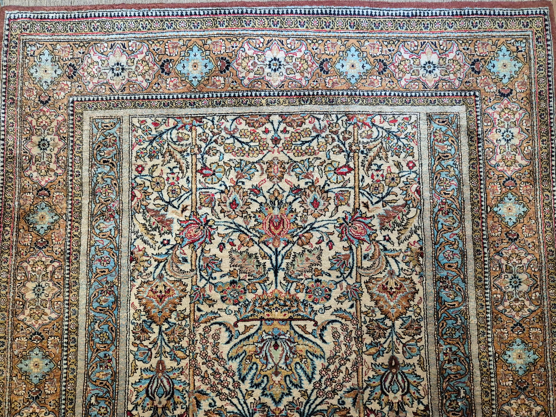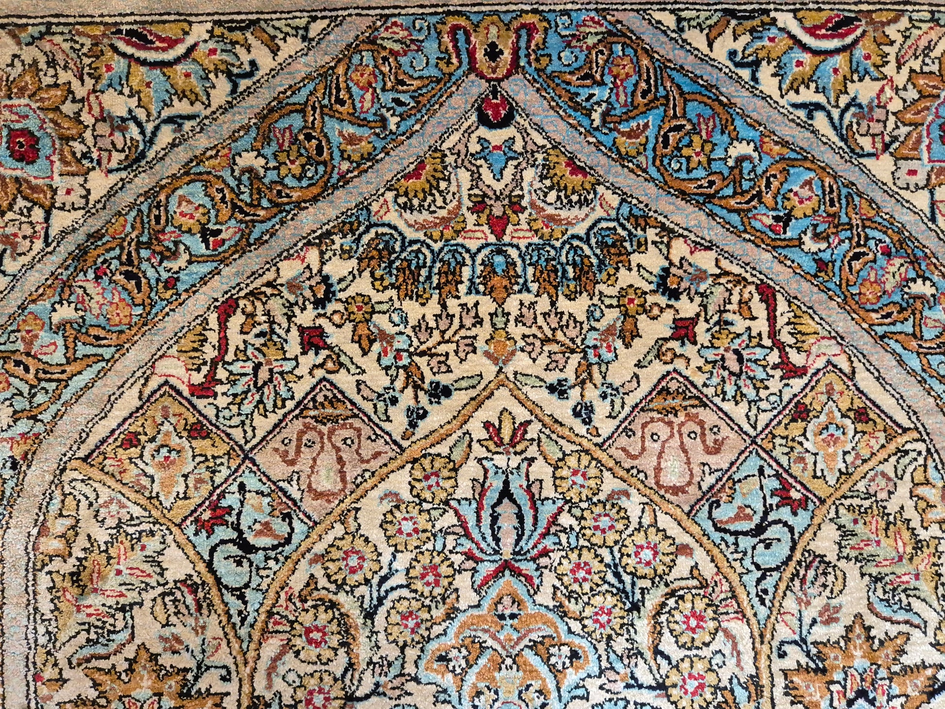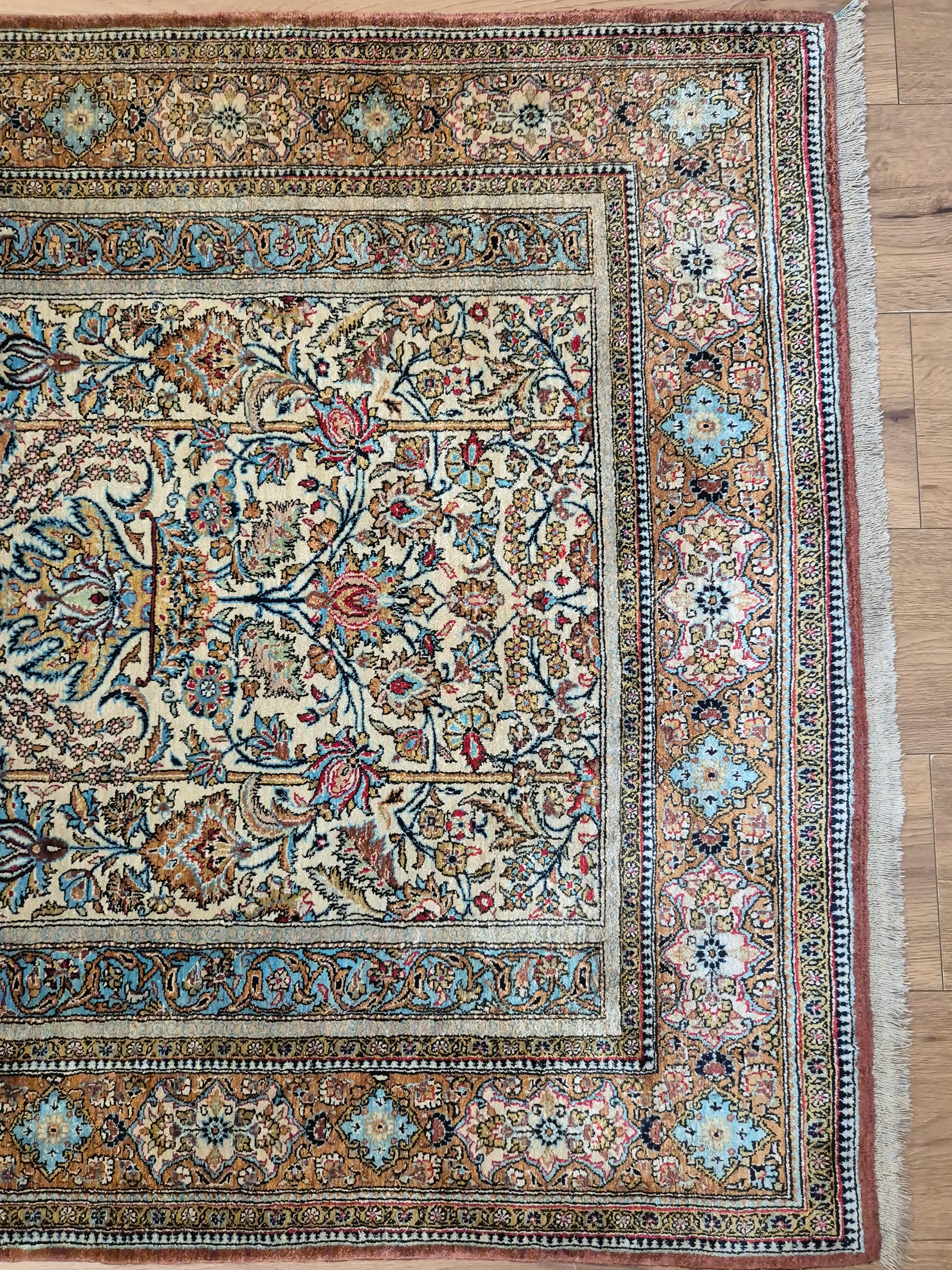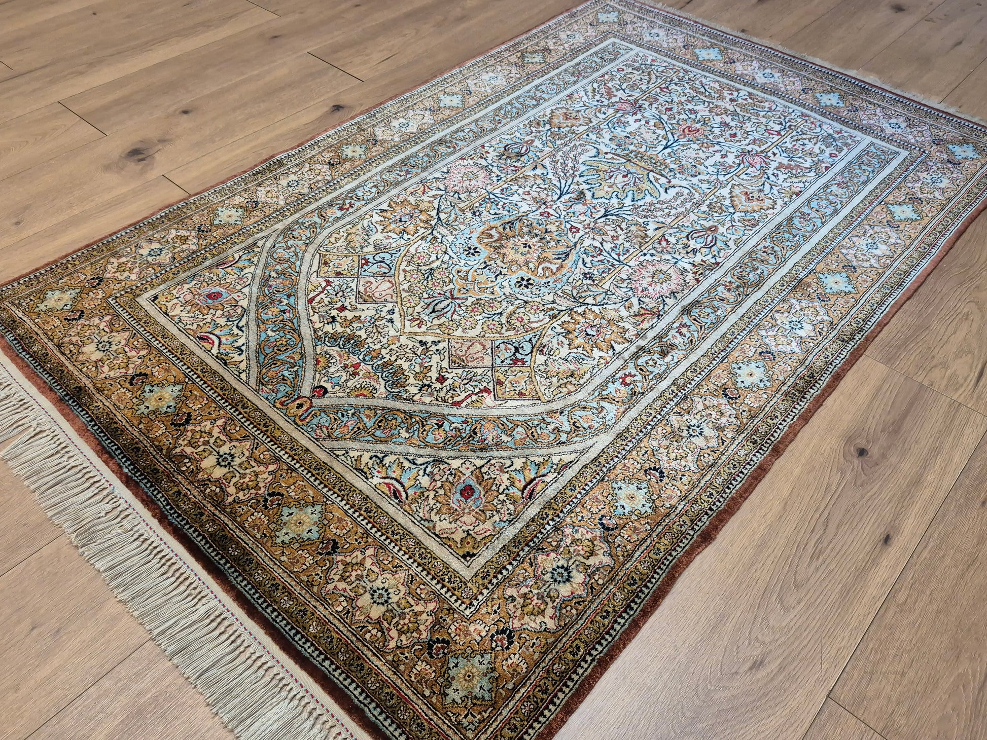 angeboten wird ein edler Ghom Teppich aus reiner Seide auf Seide, handgeknüpft in feinster Ausführung. Das Design zeigt ein klassisches Mihrab-Motiv mit kunstvoll geschwungenem Bogenfeld, gefüllt mit detailreich ausgearbeiteten Blütenranken, Rosetten und floralen Arabesken. Die Farbkomposition aus zarten Pastelltönen, kräftigem Blau, warmem Goldbraun und Akzenten in Rot und Rosa verleiht dem Teppich eine harmonische Eleganz.
