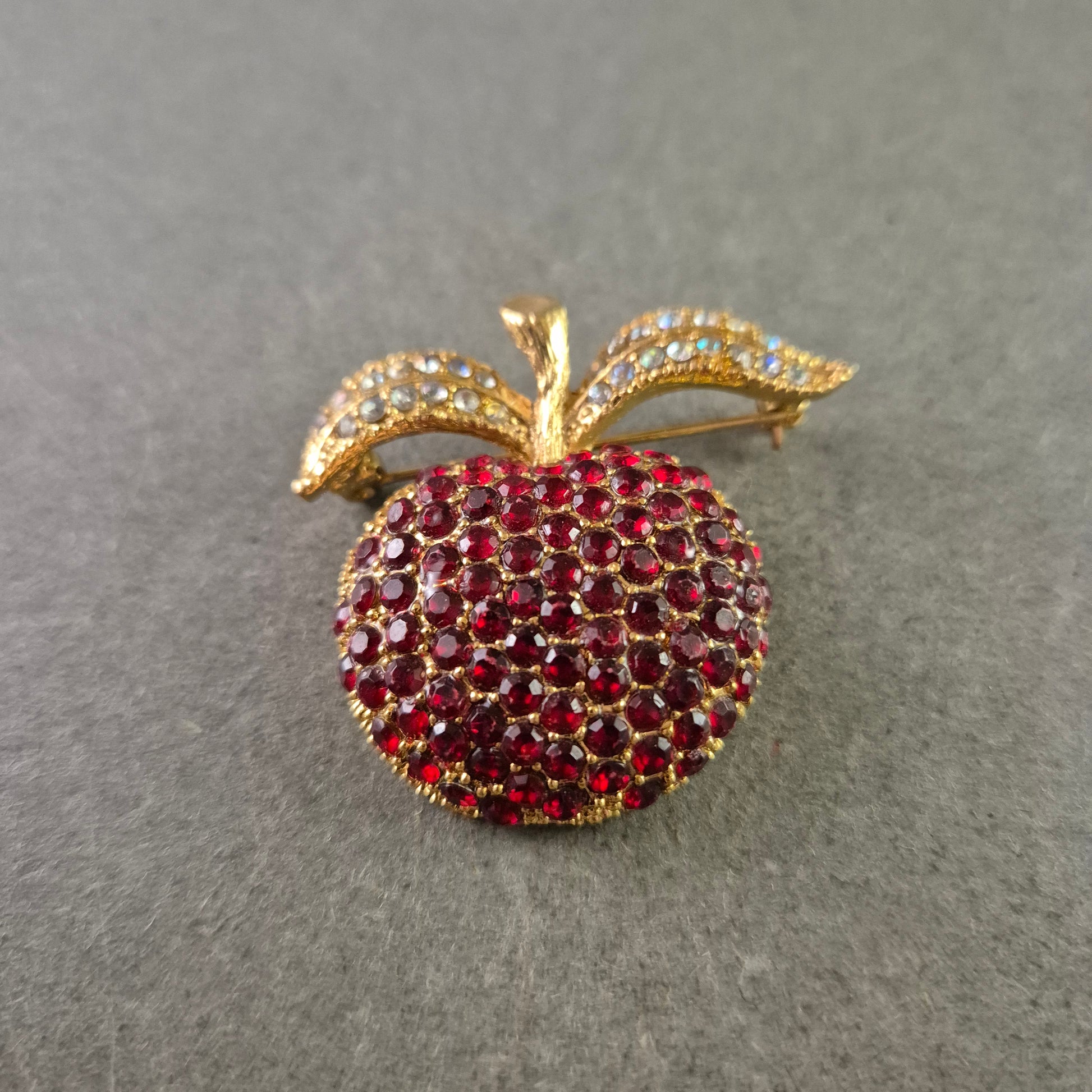 Diese auffällige Brosche ist in Form eines Apfels gestaltet und reich mit funkelnden Strasssteinen besetzt. Der Apfel ist vollständig mit roten Steinen verziert, während die Blätter mit klaren Strasssteinen besetzt sind und in einer goldfarbenen Fassung erstrahlen. Das Schmuckstück vereint verspieltes Design mit glamourösem Glanz und eignet sich perfekt als Blickfang für Jacken, Schals oder Blusen.