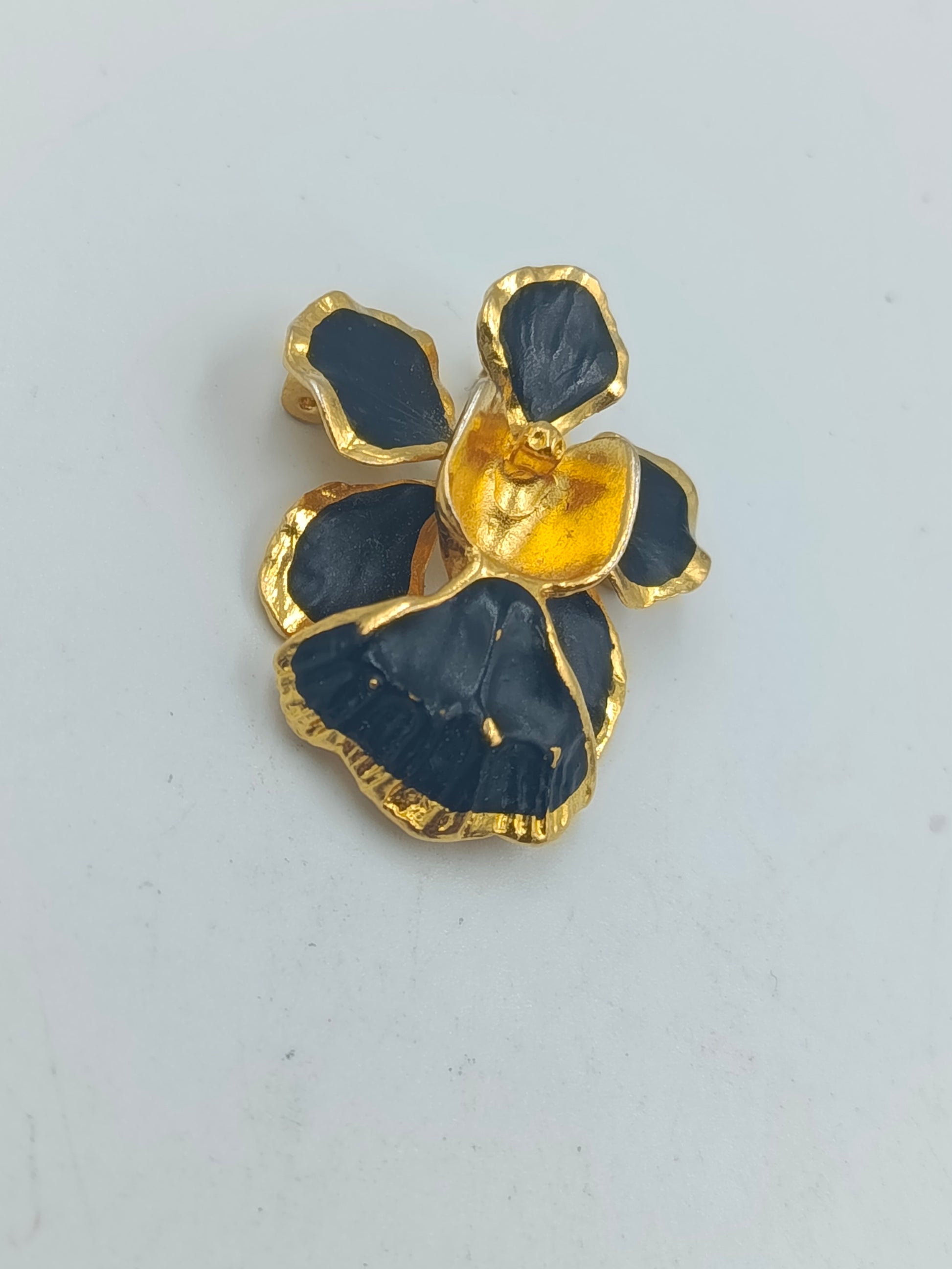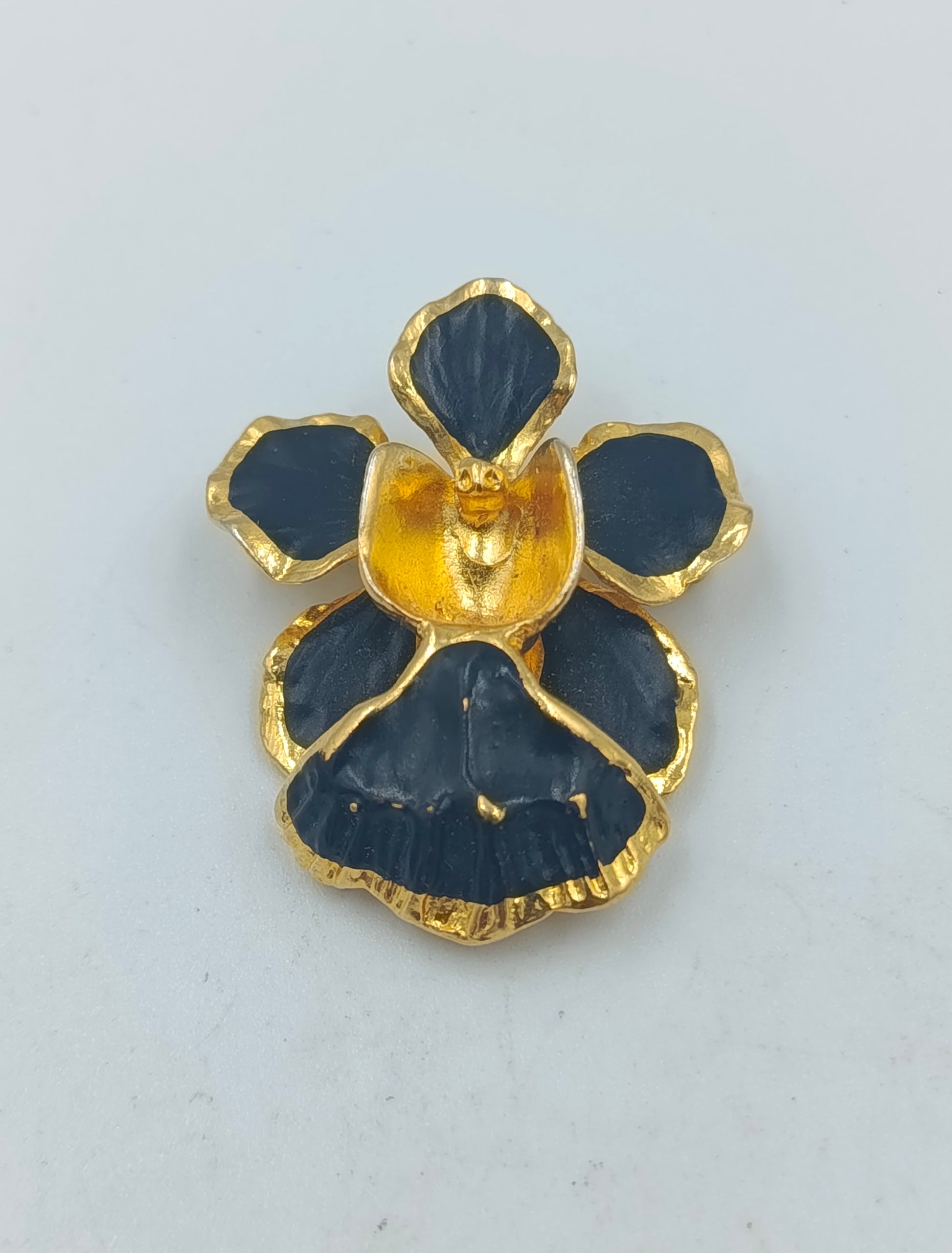 Goldfarbene Blütenbrosche mit schwarzer Emaille