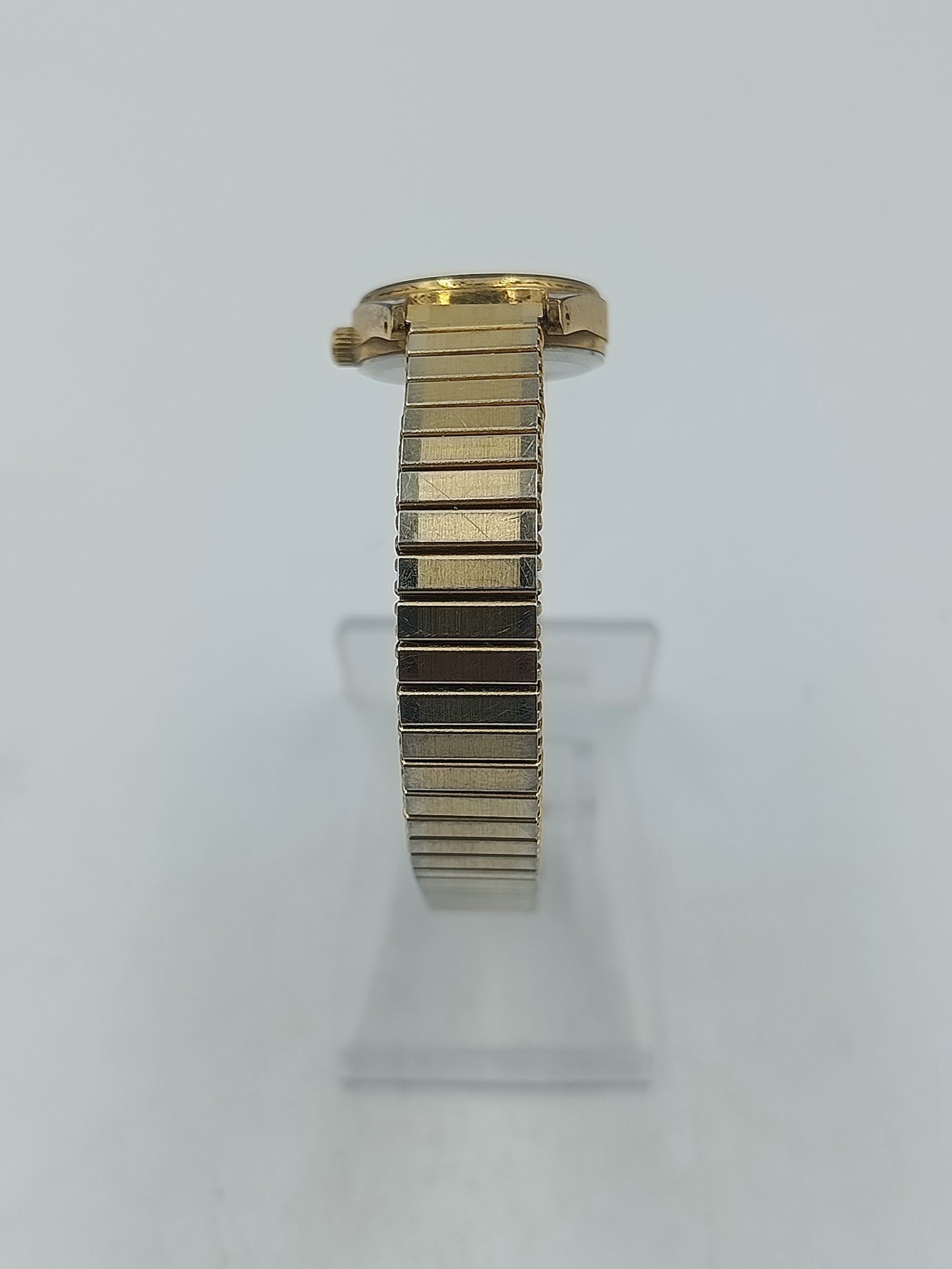 Goldfarbene Damenuhr mit elastischem Metallarmband und klassischem Zifferblatt