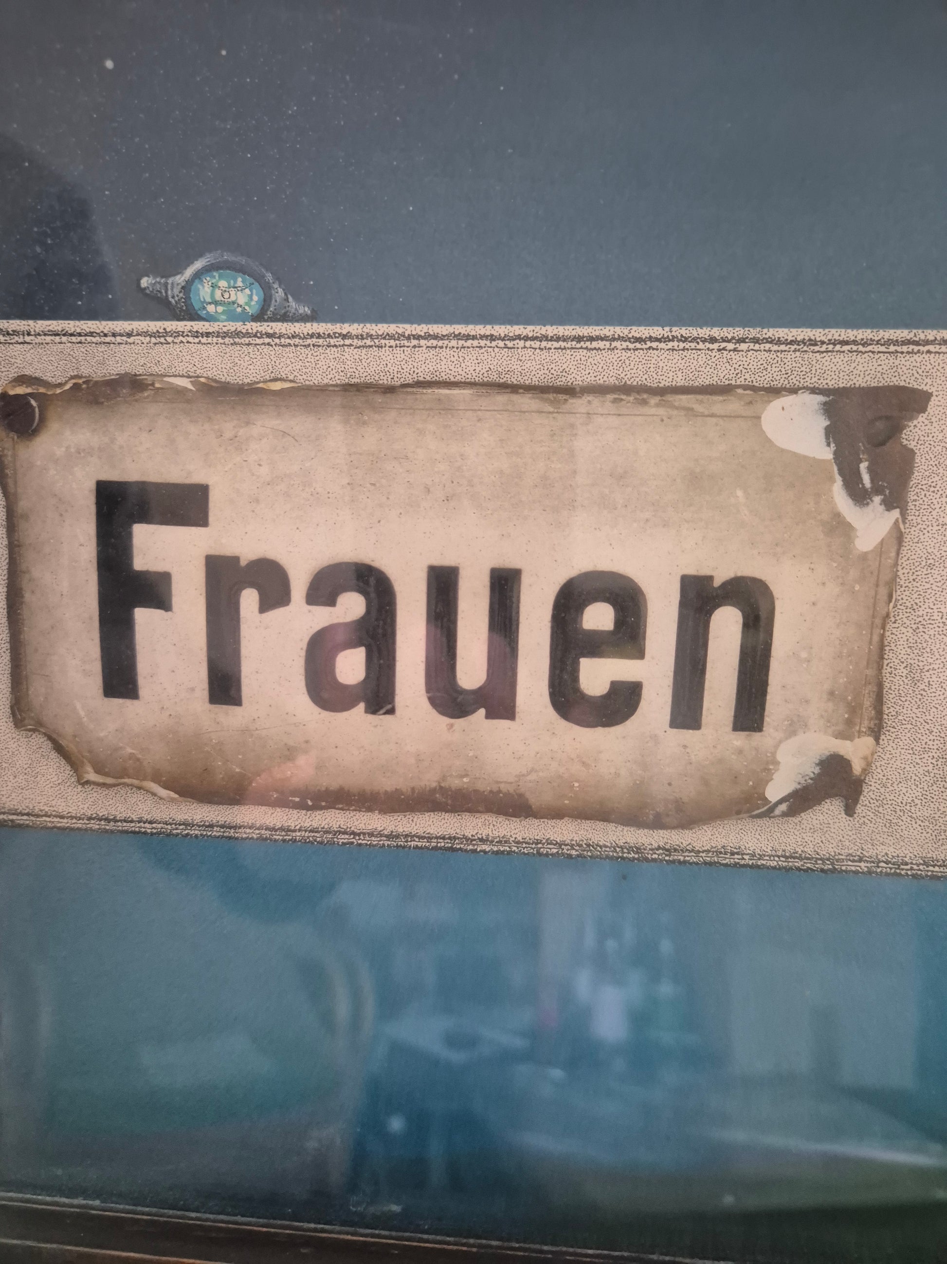 • Hintergrund: Blauer Hintergrund, Wort „Frauen“ groß geschrieben