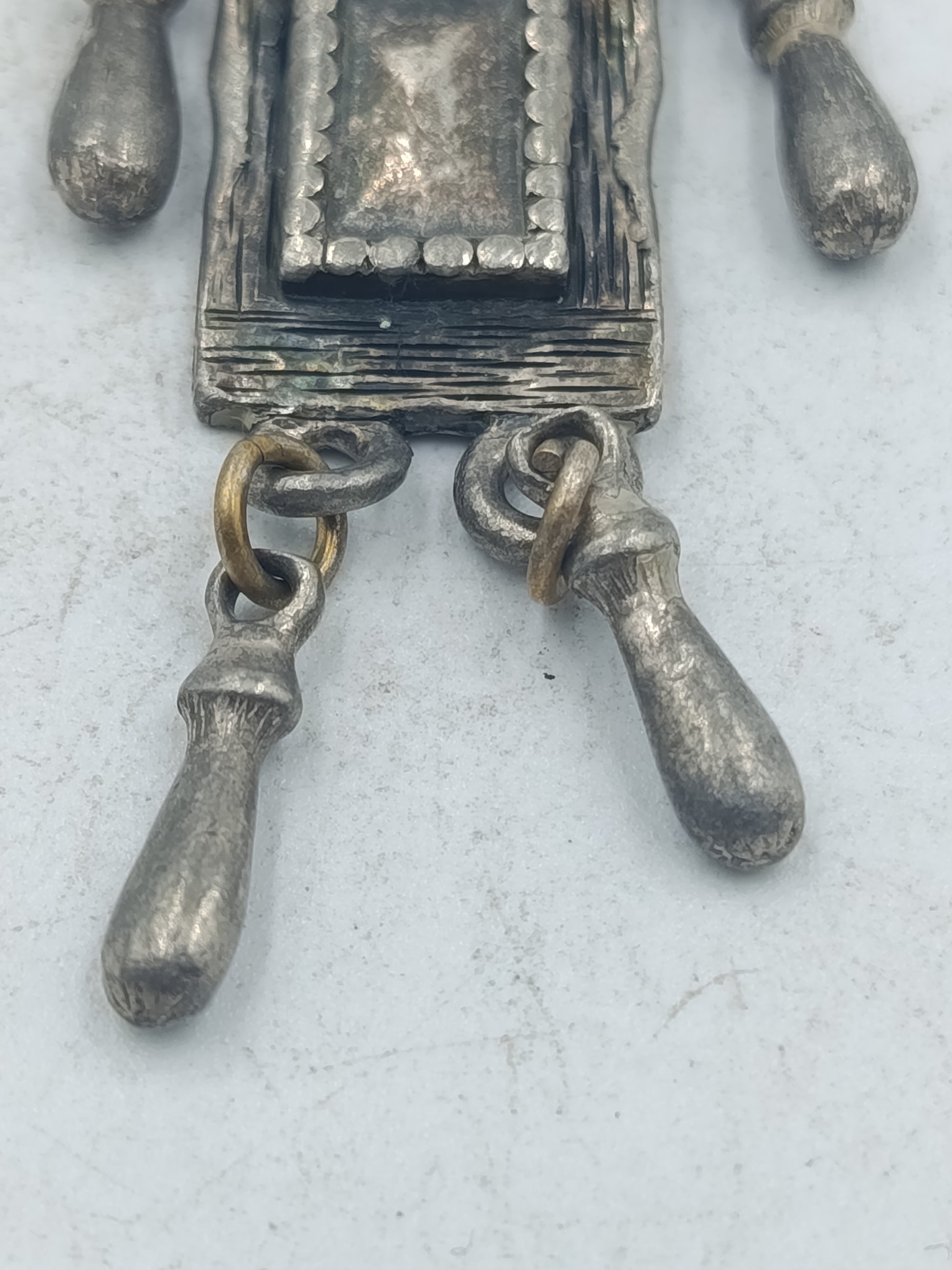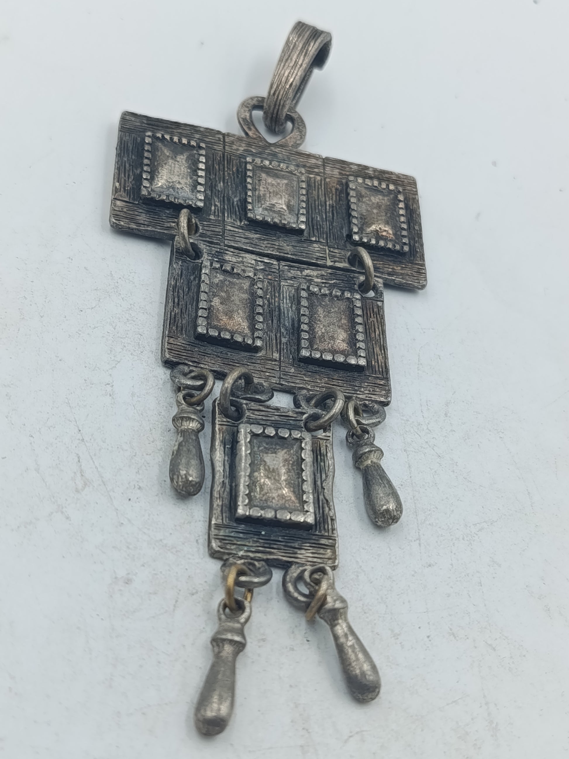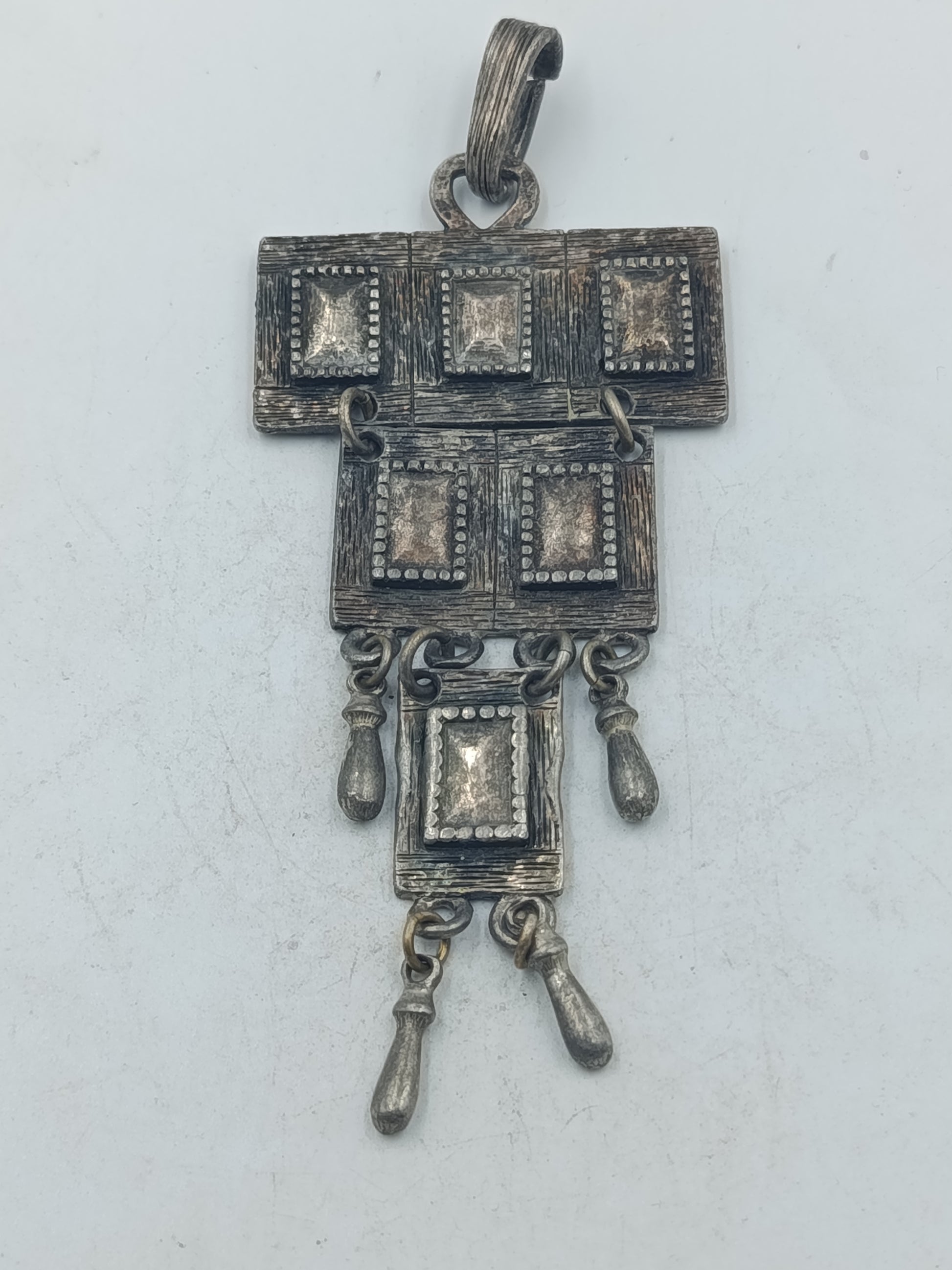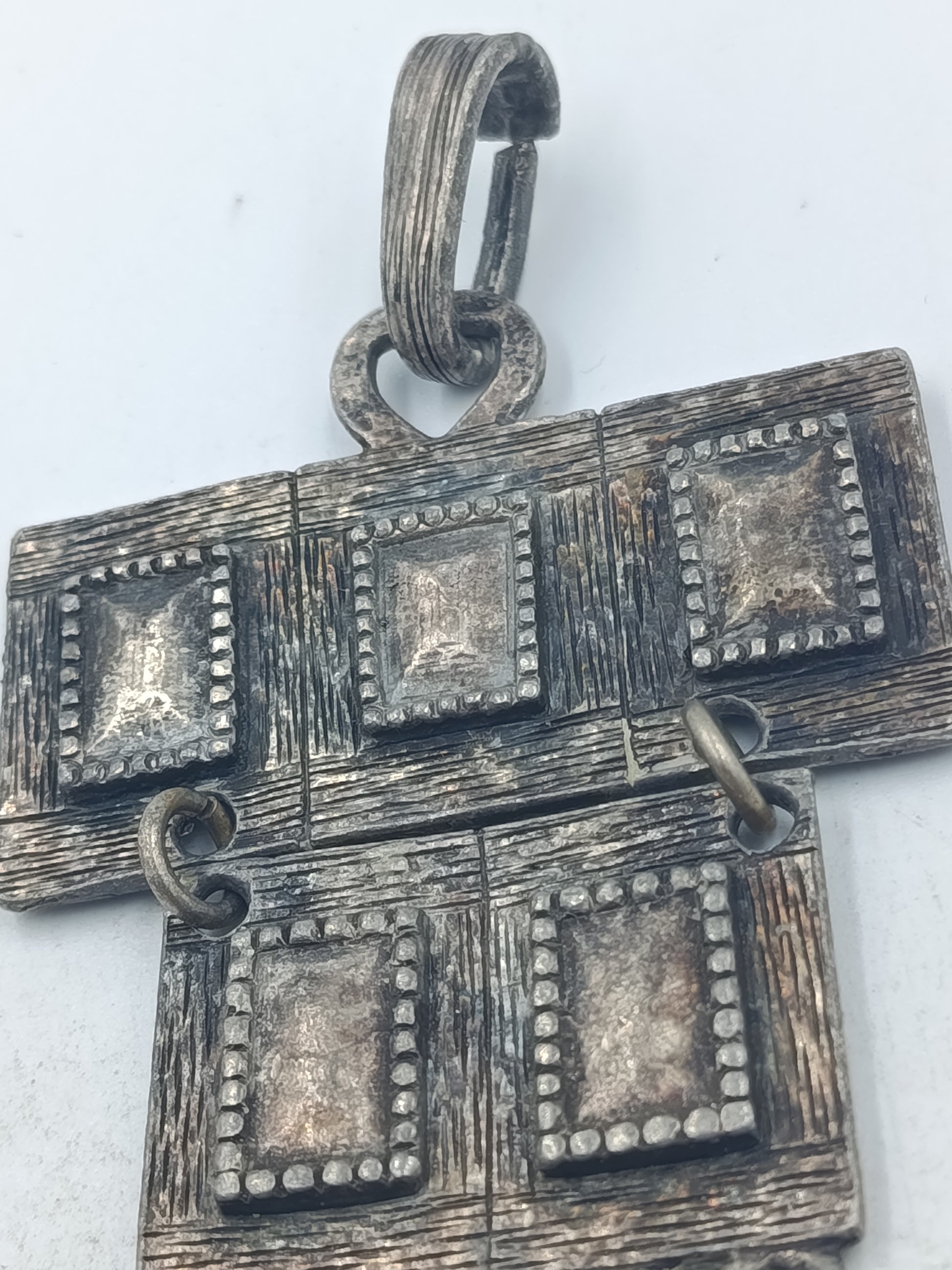 Dieser auffällige versilberte Anhänger besticht durch sein geometrisches Design mit mehreren quadratischen Elementen und frei beweglichen Zieranhängern. Die Form ist rein dekorativ und hat keinerlei religiöse Bedeutung. Die strukturierte Oberfläche und die sichtbare Patina verleihen dem Schmuckstück einen markanten Vintage Charakter. Ideal als Statement Anhänger für Ketten oder Schmuckbänder und für Liebhaber außergewöhnlicher Schmuckformen.