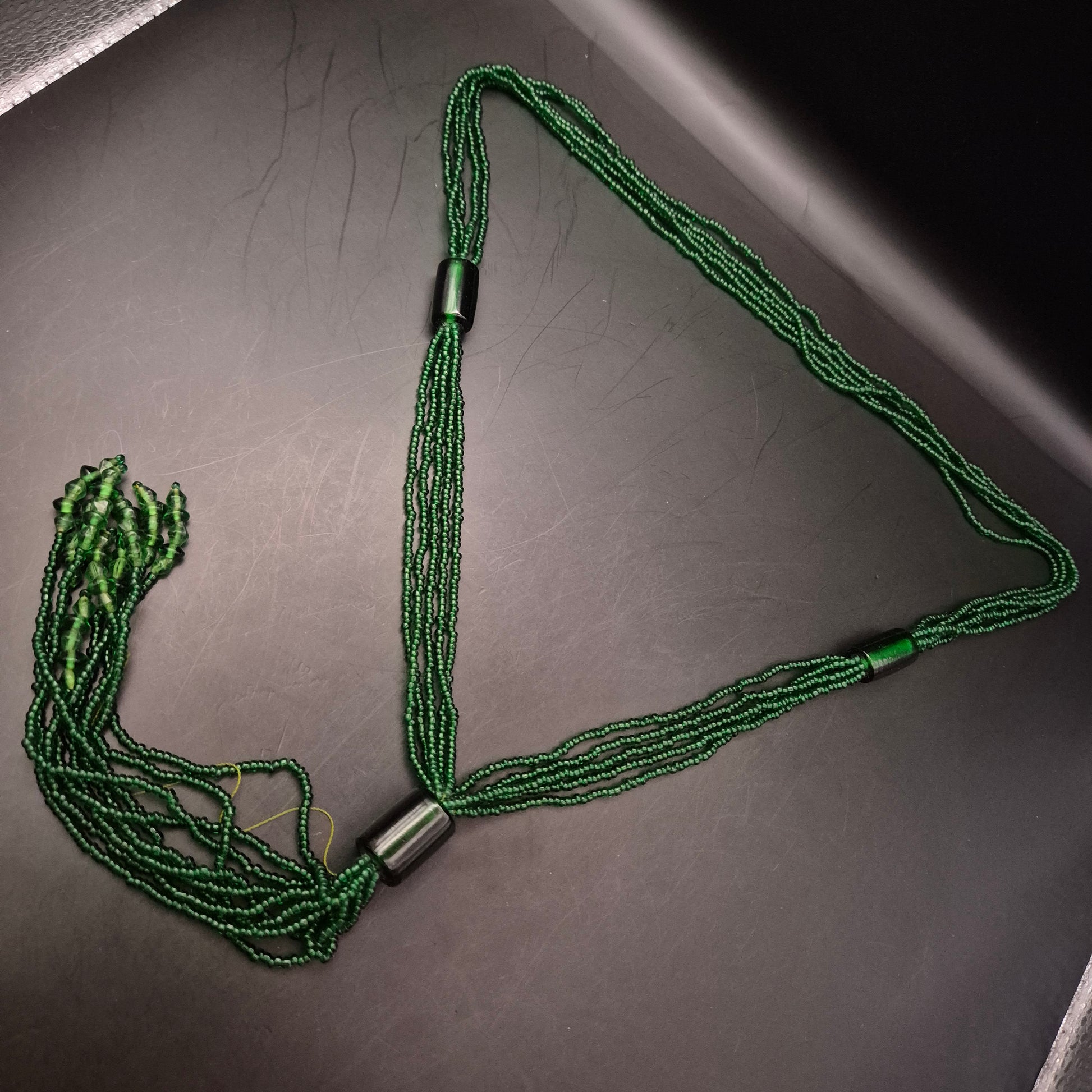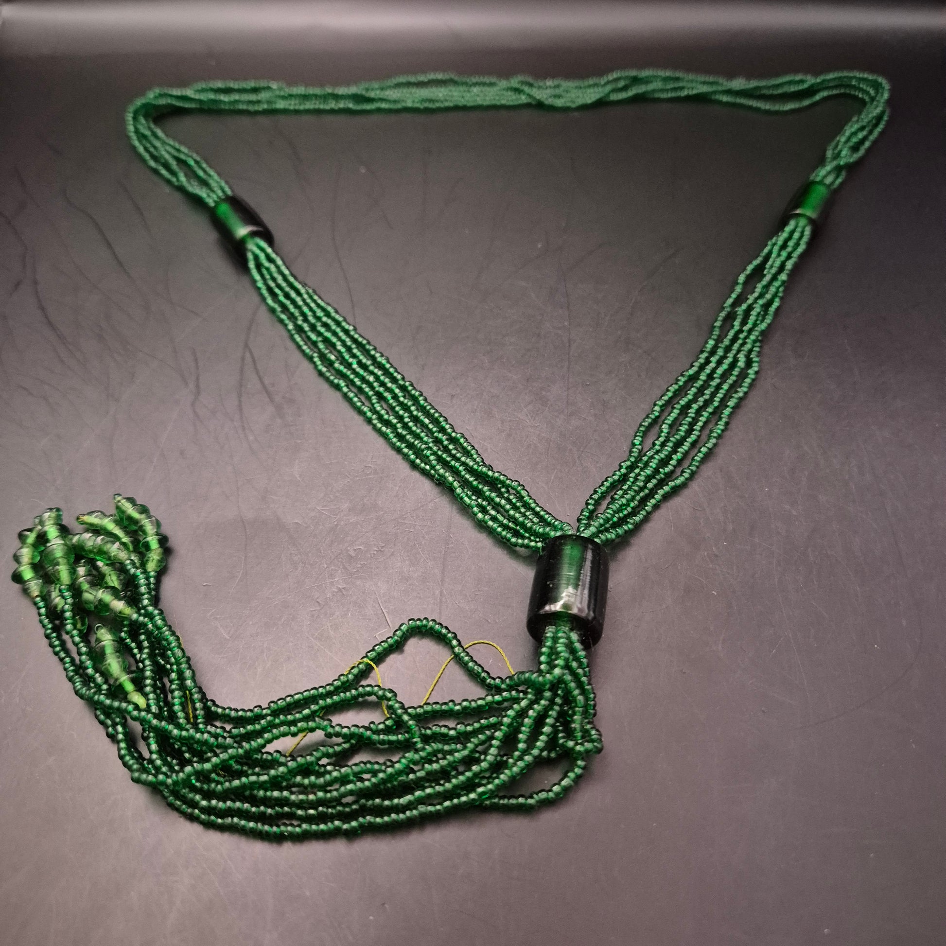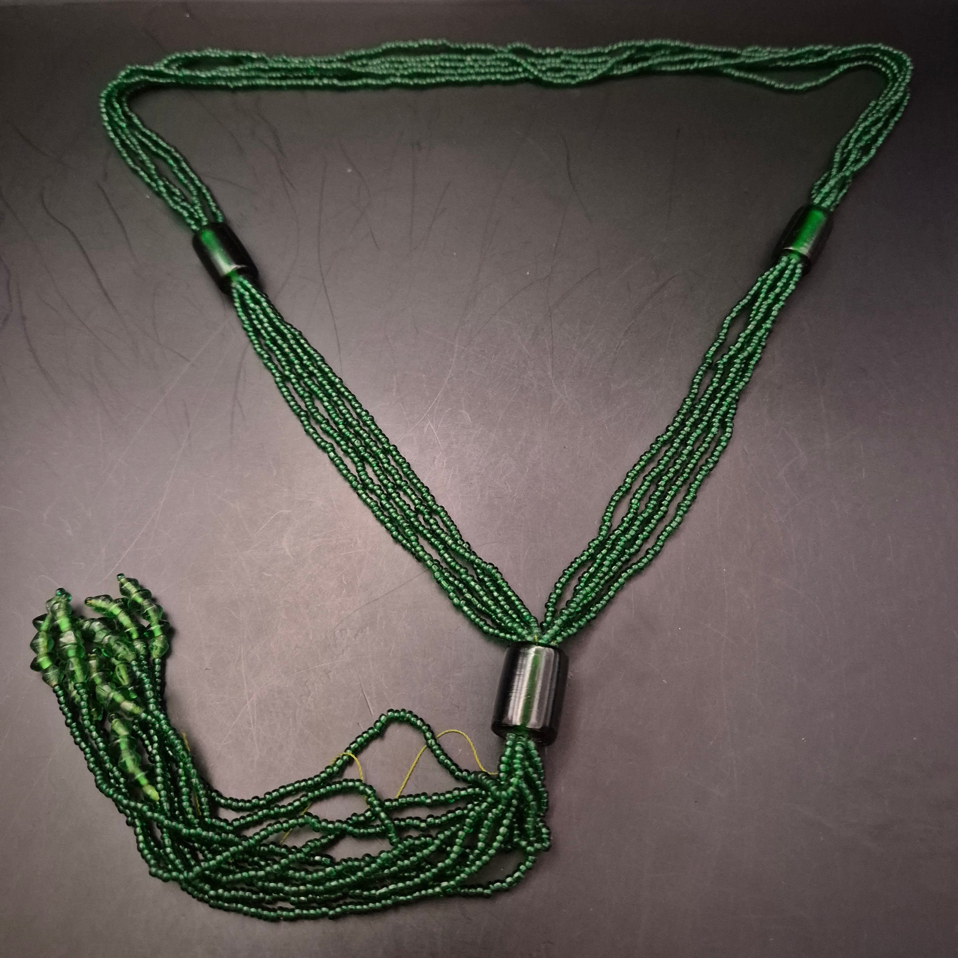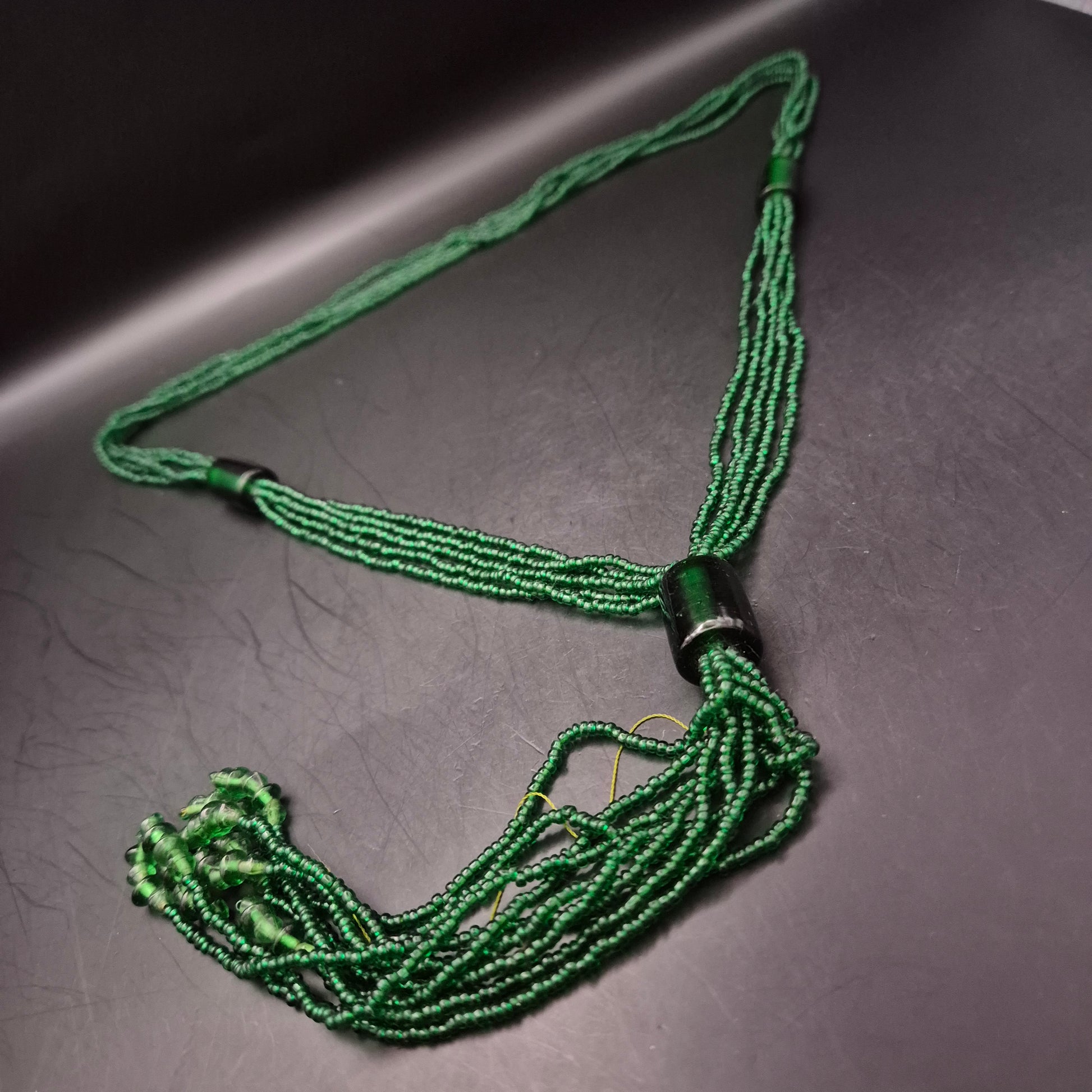 Diese auffällige grüne Halskette besteht aus mehreren Reihen kleiner Glasperlen und einem zentralen zylinderförmigen Verbindungselement. Der dekorative Fransenabschluss verleiht ihr einen einzigartigen Ethno-Look. Ideal für ausdrucksstarke Outfits oder als Akzent zu schlichten Oberteilen. Ein echter Hingucker mit kunsthandwerklichem Charme.