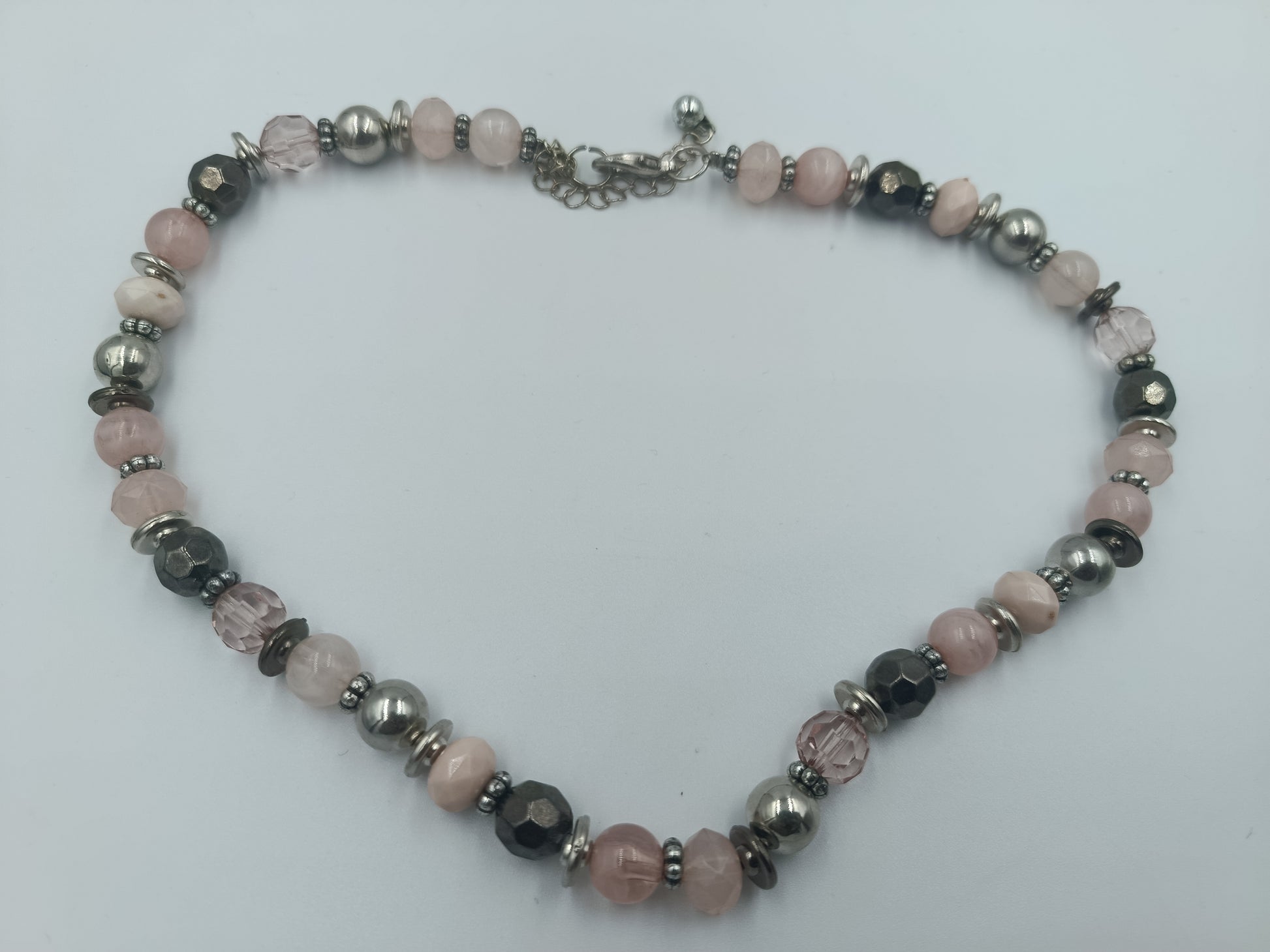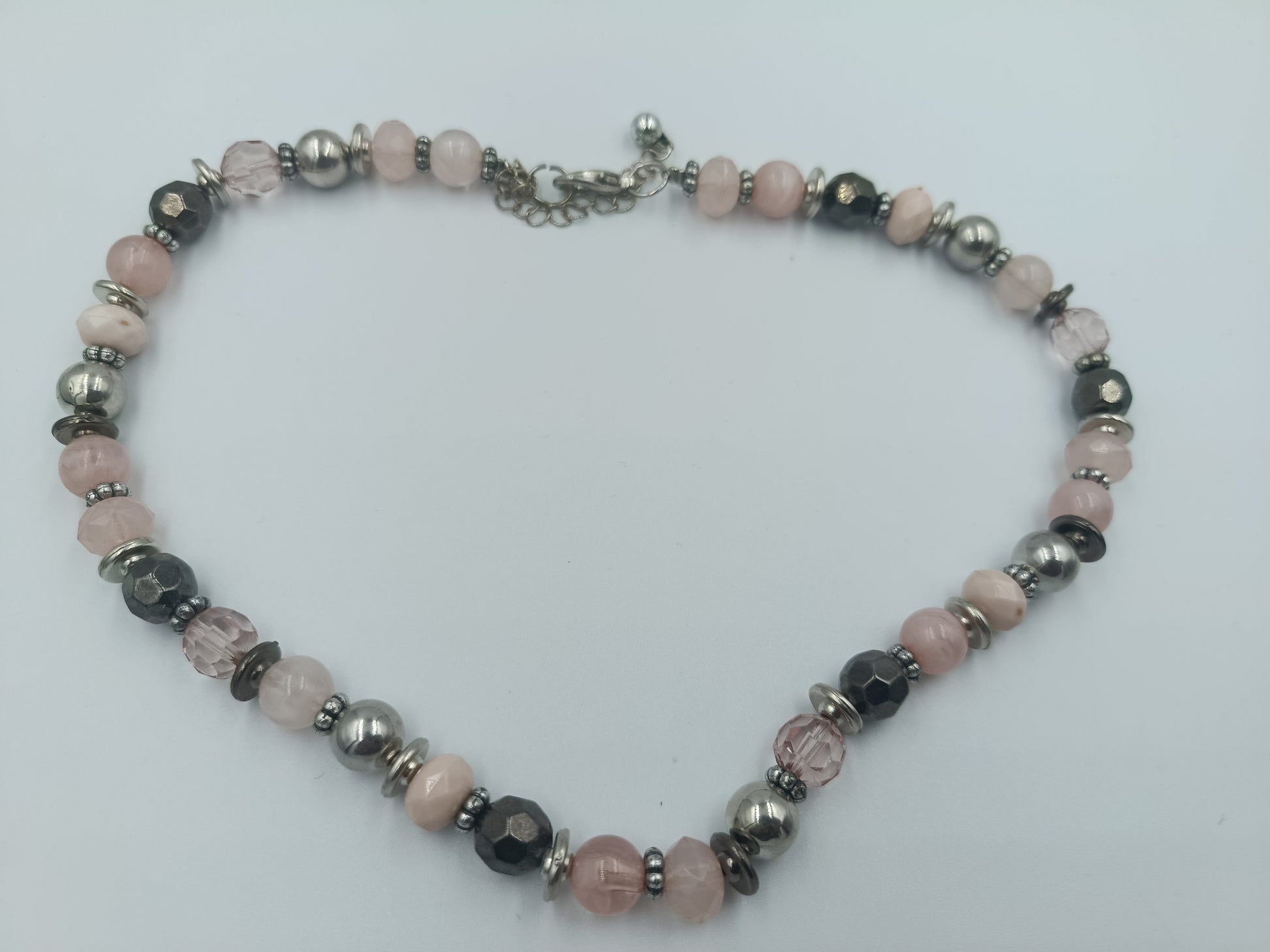 Elegante Halskette aus polierten Rosenquarz-Perlen in zarten Rosétönen. Die Kombination aus Silber- und Hämatit-Elementen sorgt für einen schönen Kontrast und verleiht der Kette einen edlen Look.