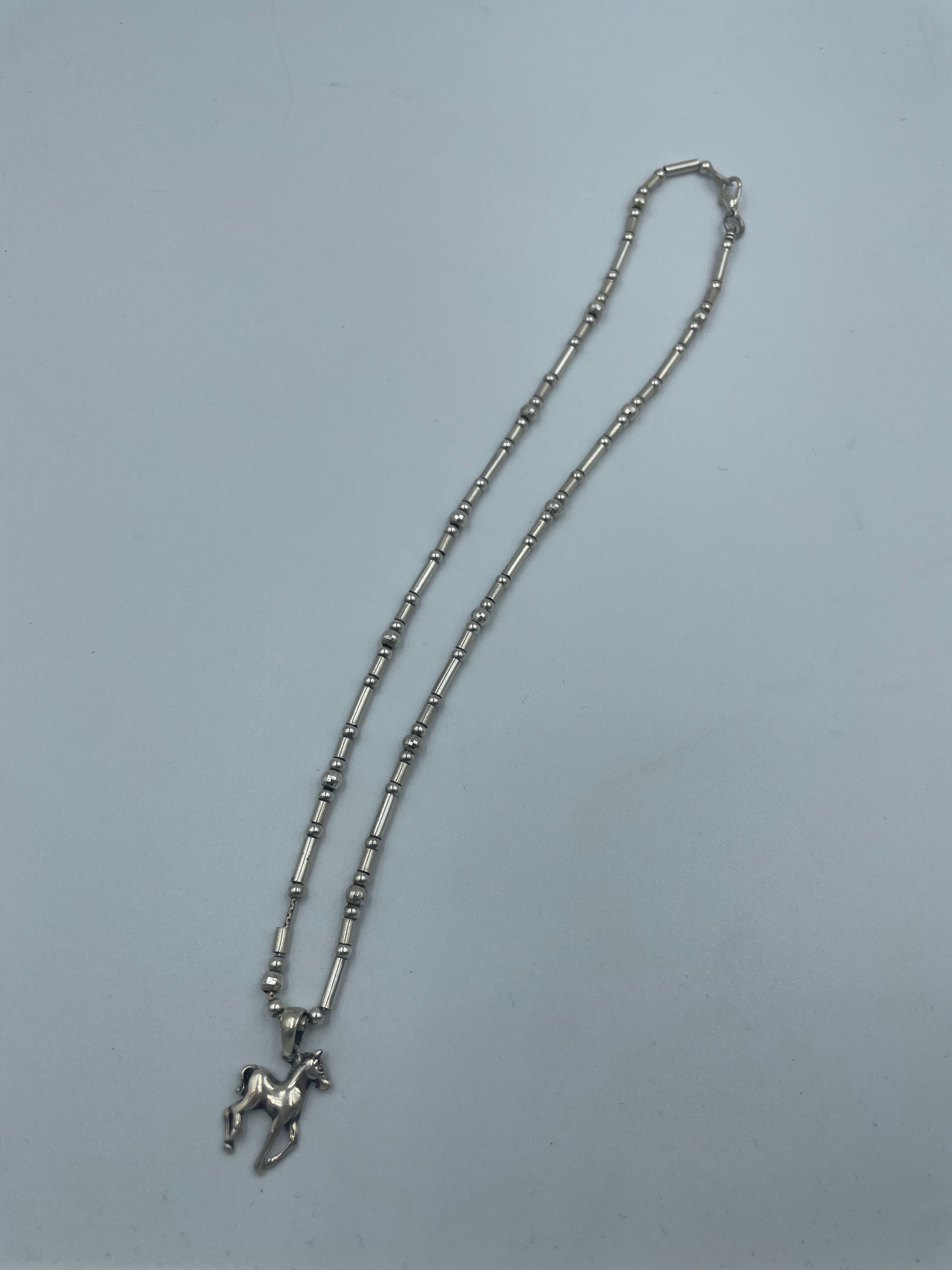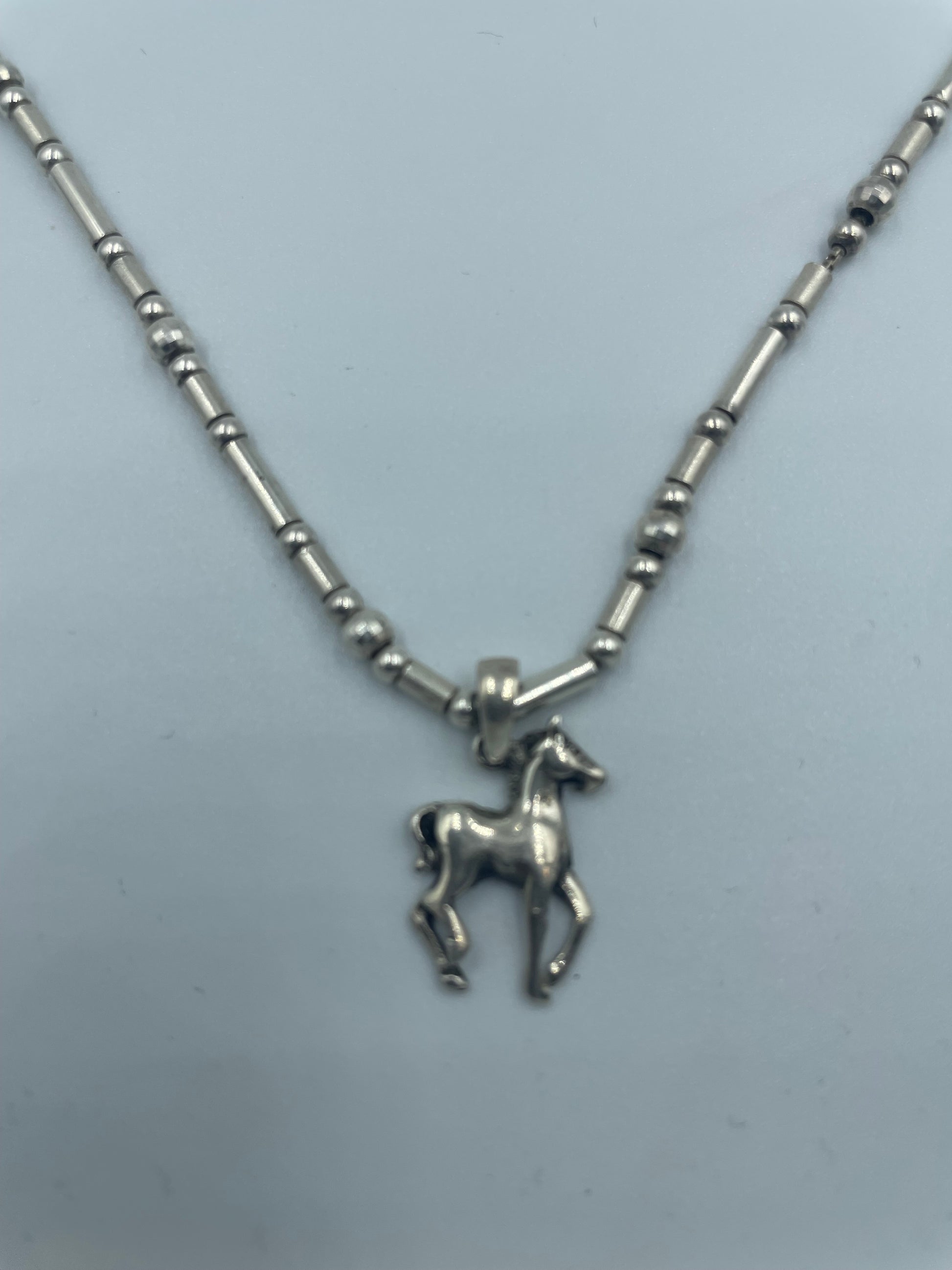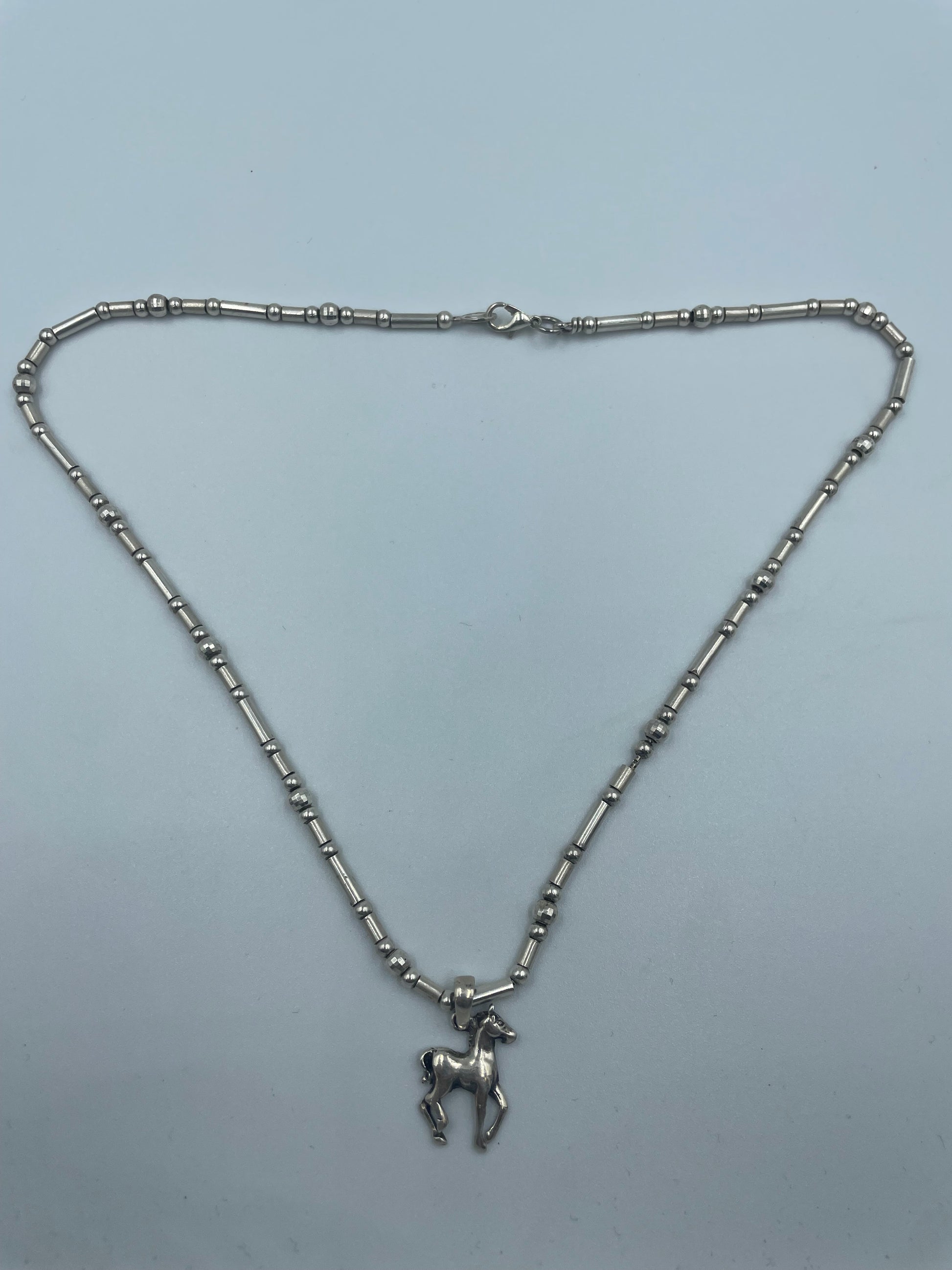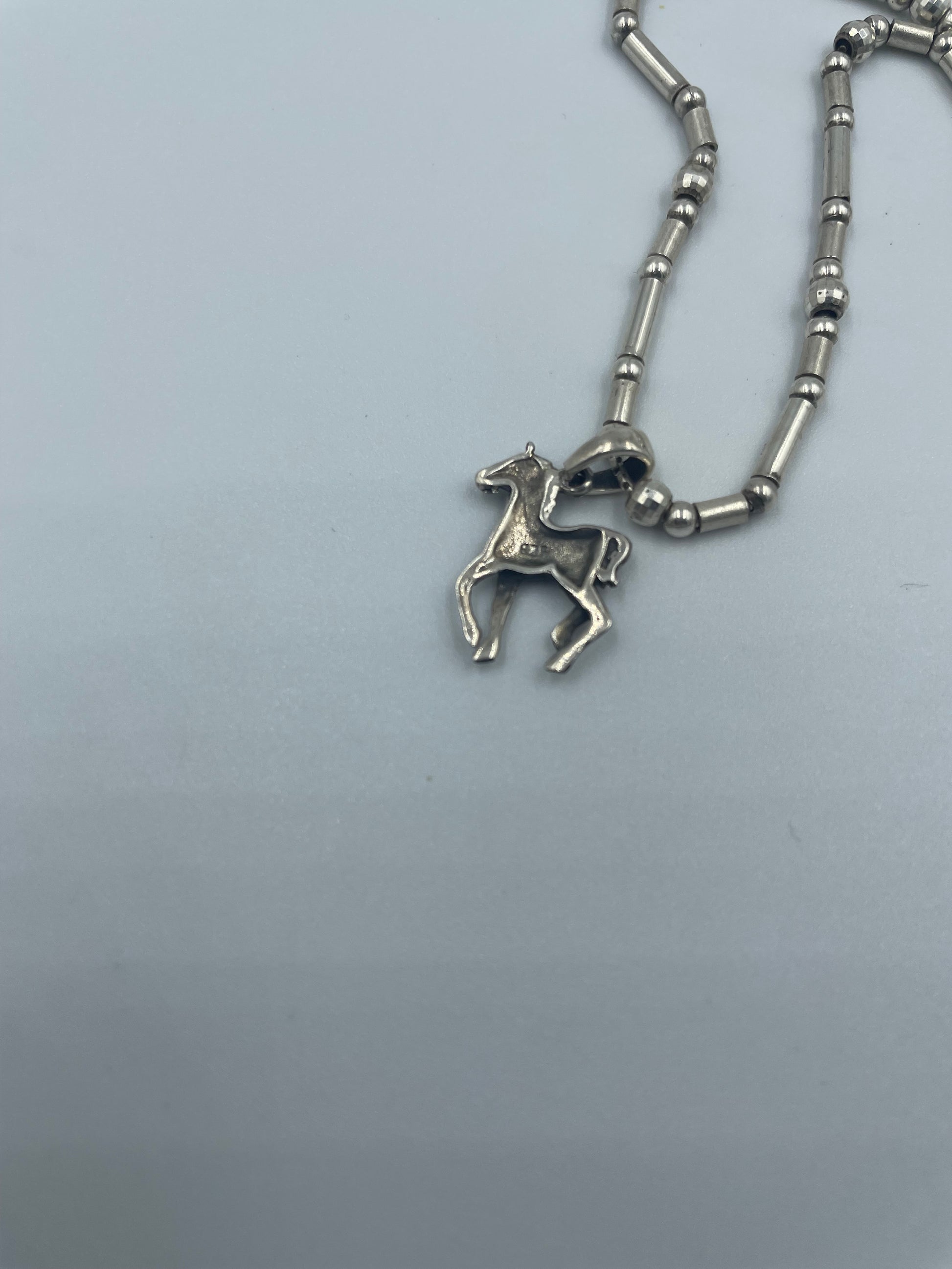 Diese elegante Halskette überzeugt durch ihren zeitlosen Charme und den detailreich gearbeiteten Pferde-Anhänger aus 925er Silber. Die klare Linienführung und das edle Silber unterstreichen die feine Handwerkskunst und machen dieses Schmuckstück zu einem besonderen Accessoire für Tierliebhaber und Sammler.