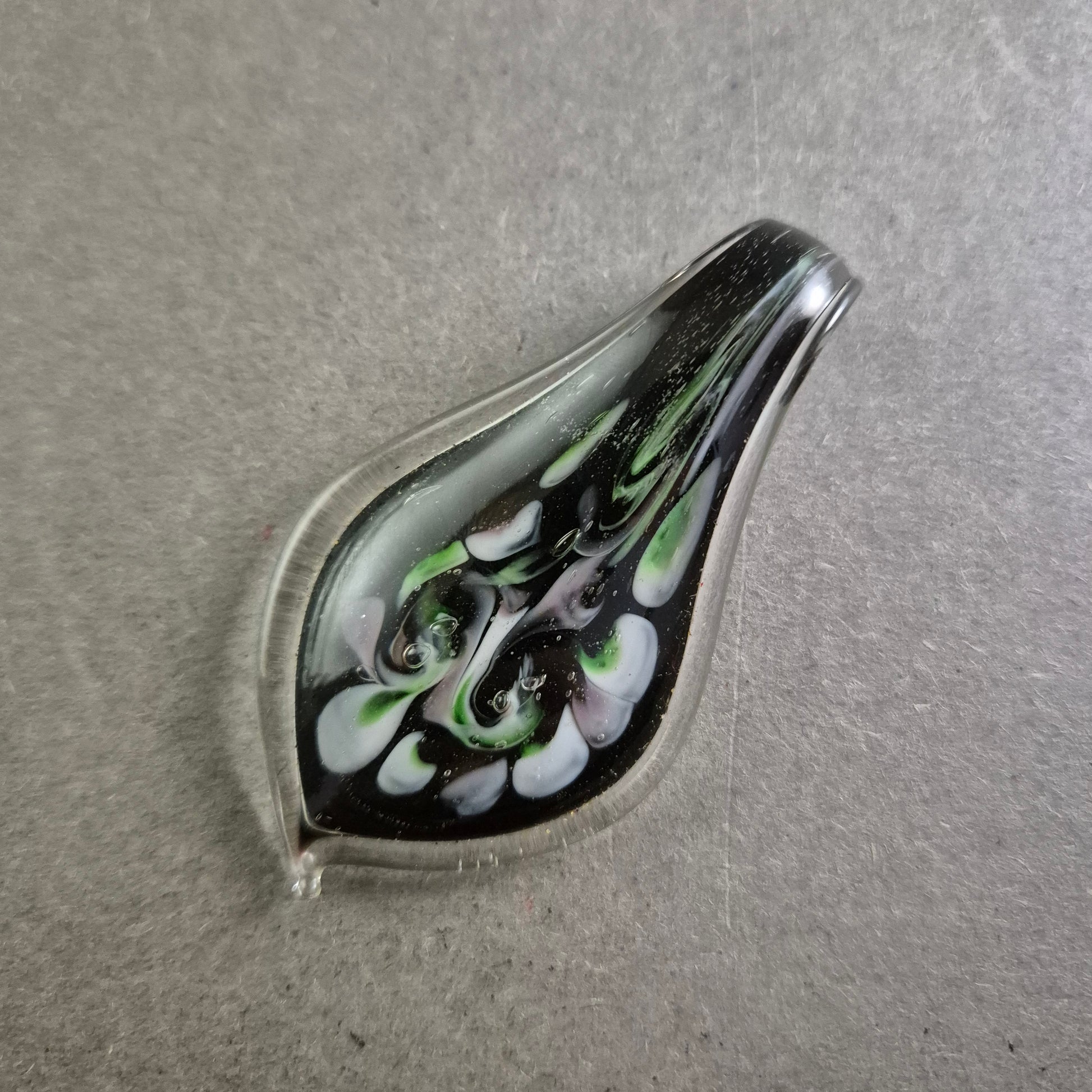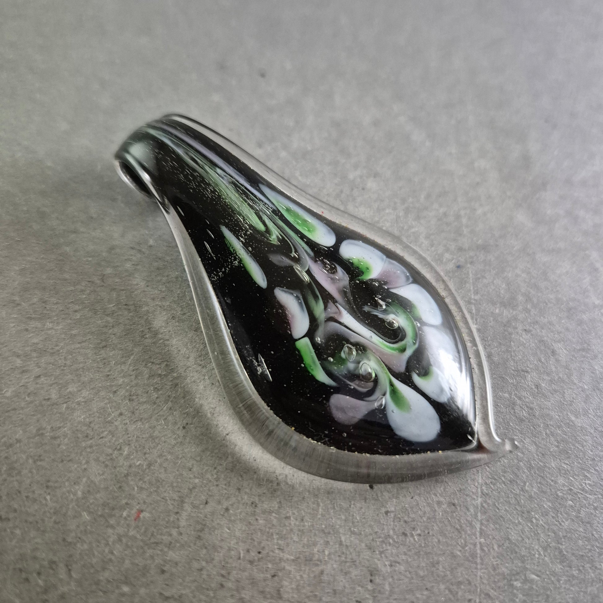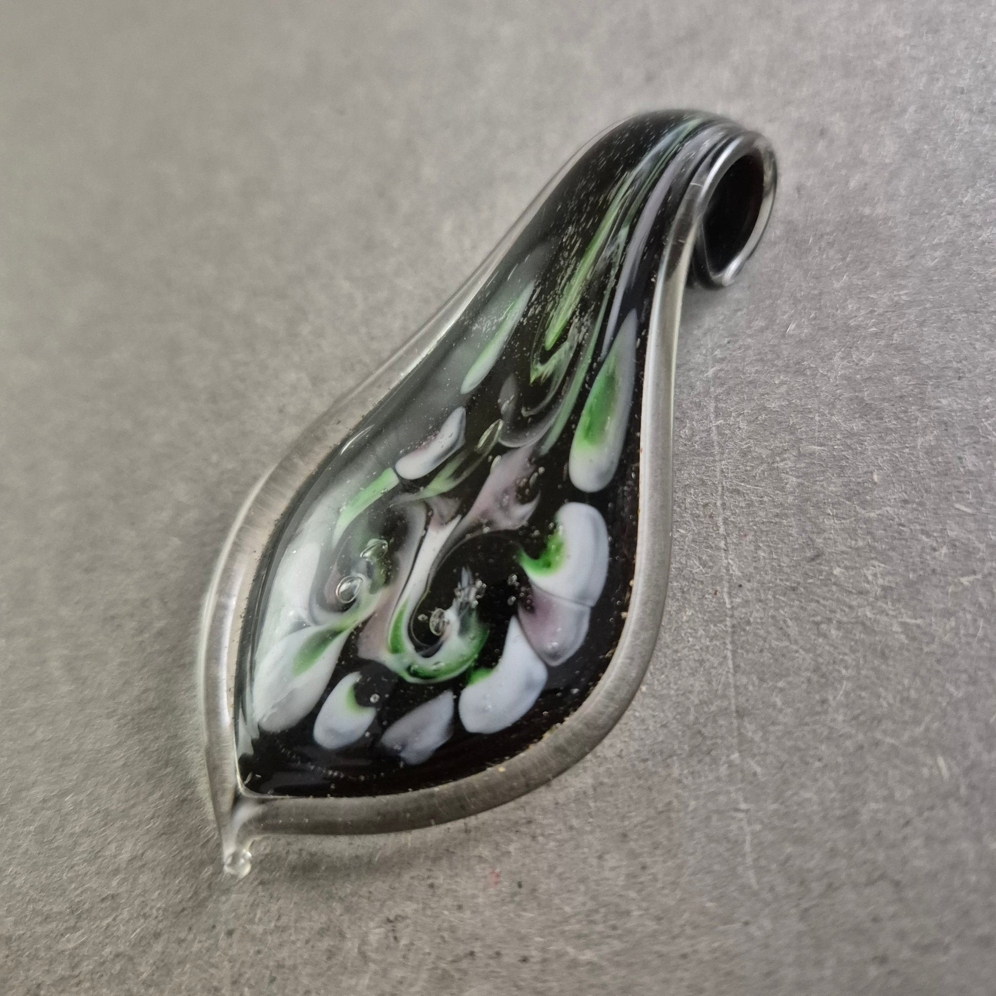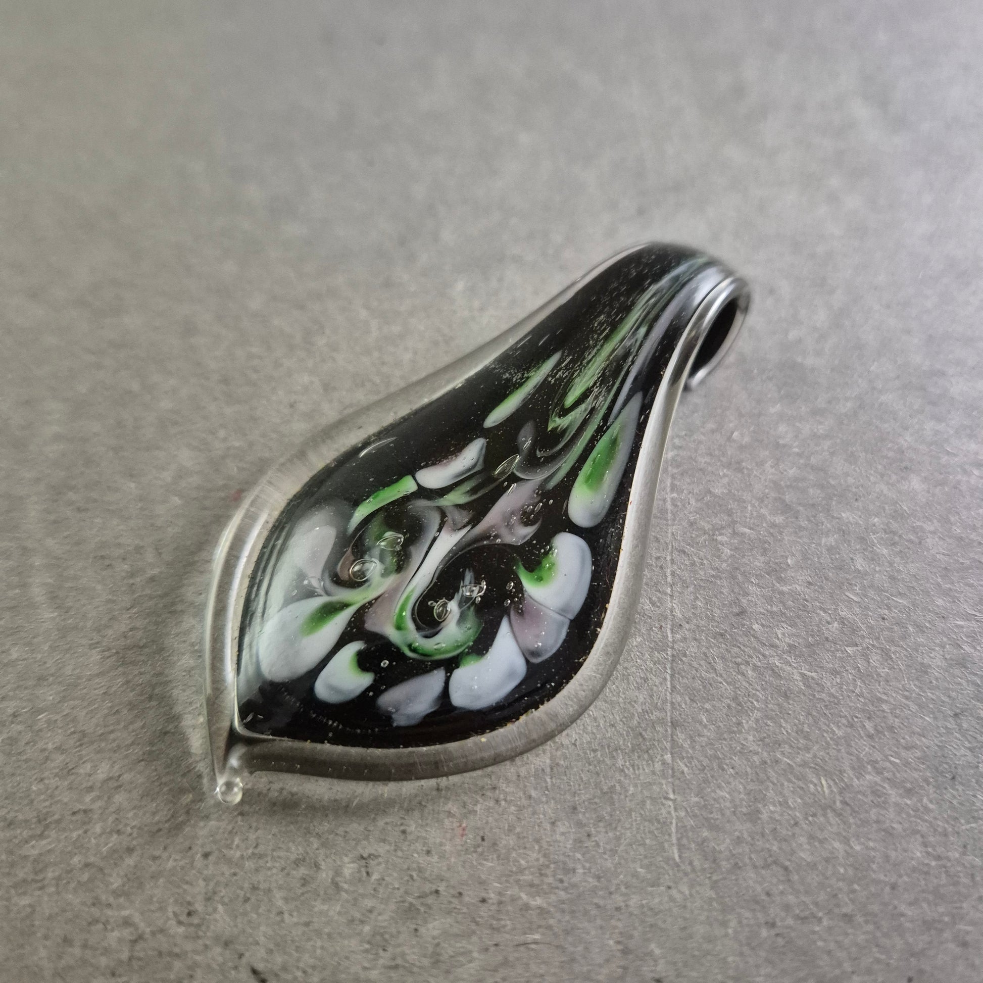 Dieser auffällige Glasanhänger in Tropfenform besticht durch sein kunstvolles Design in Schwarz mit grünen und weißen Wirbeln. Die geschwungene Form mit transparenter Umrandung verleiht dem Anhänger eine moderne, elegante Ausstrahlung. Ideal als Statement-Stück an einer schlichten Kette.