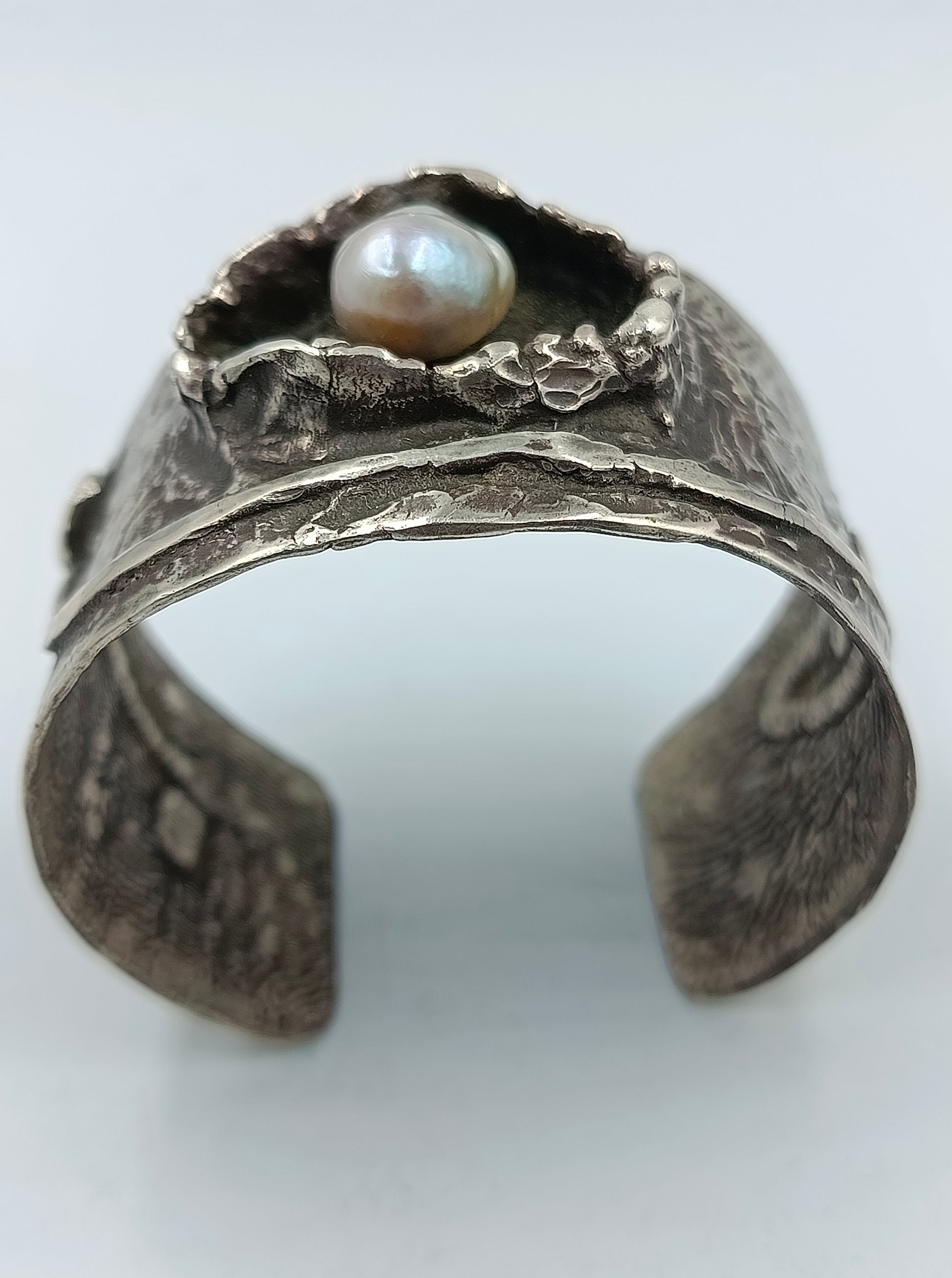 Ein außergewöhnlich schönes handgefertigtes Silberarmband, kunstvoll gearbeitet mit organischer Struktur und einer edlen weißen Perle als Mittelpunkt. Das massive Design und die fein gearbeitete Oberfläche verleihen diesem Stück eine besondere Ausdruckskraft – ein echtes Unikat handwerklicher Schmuckkunst.
