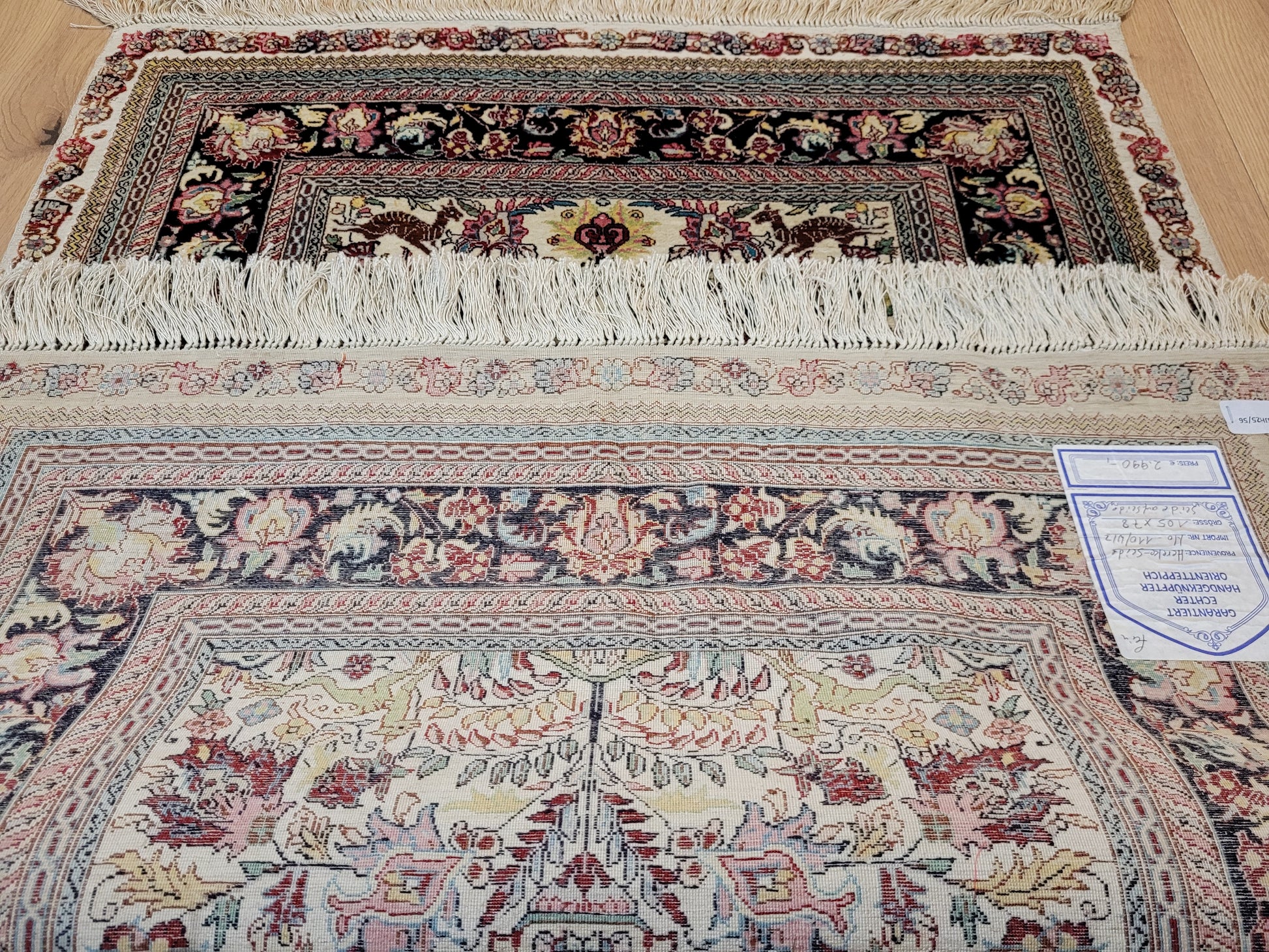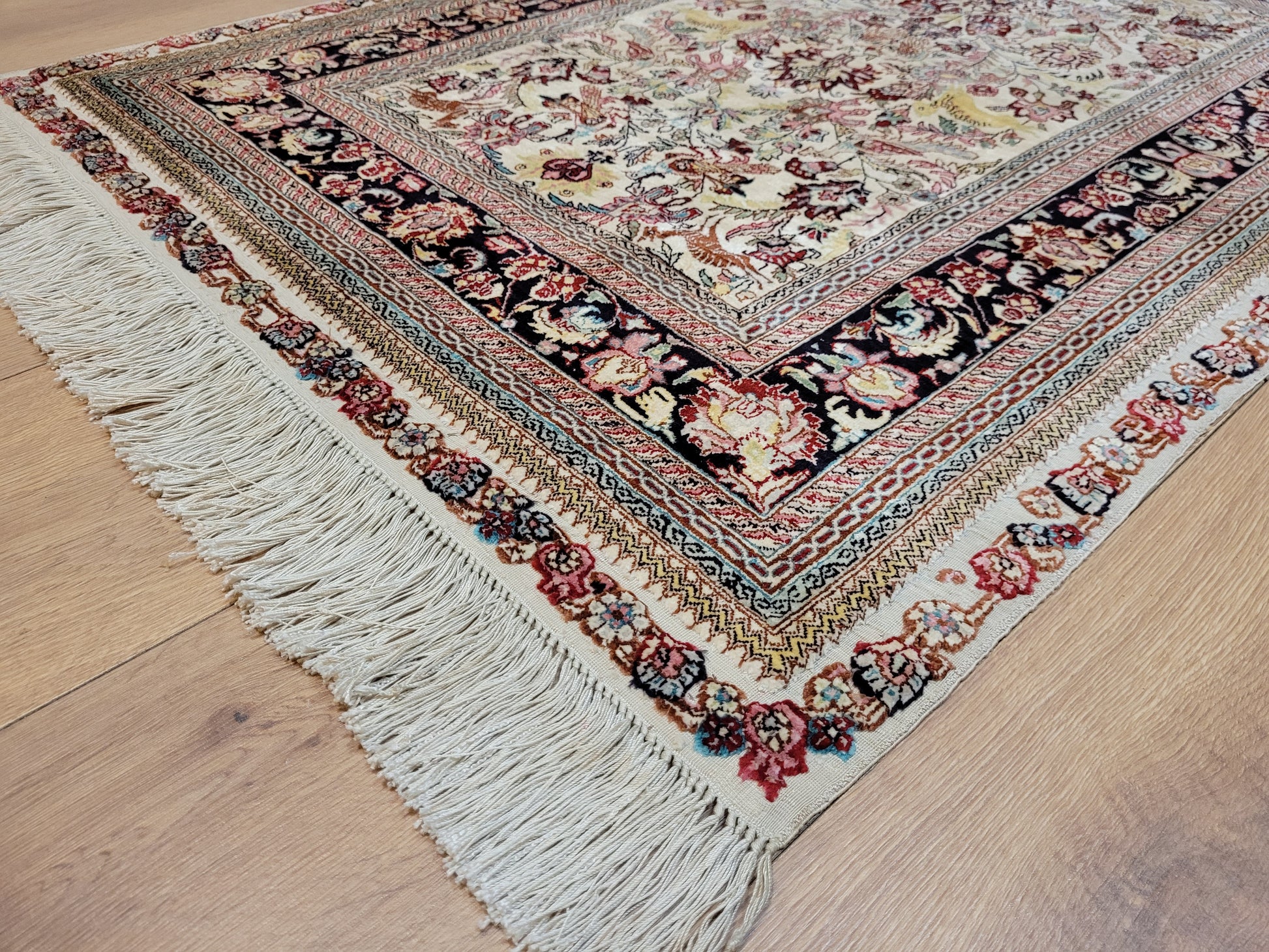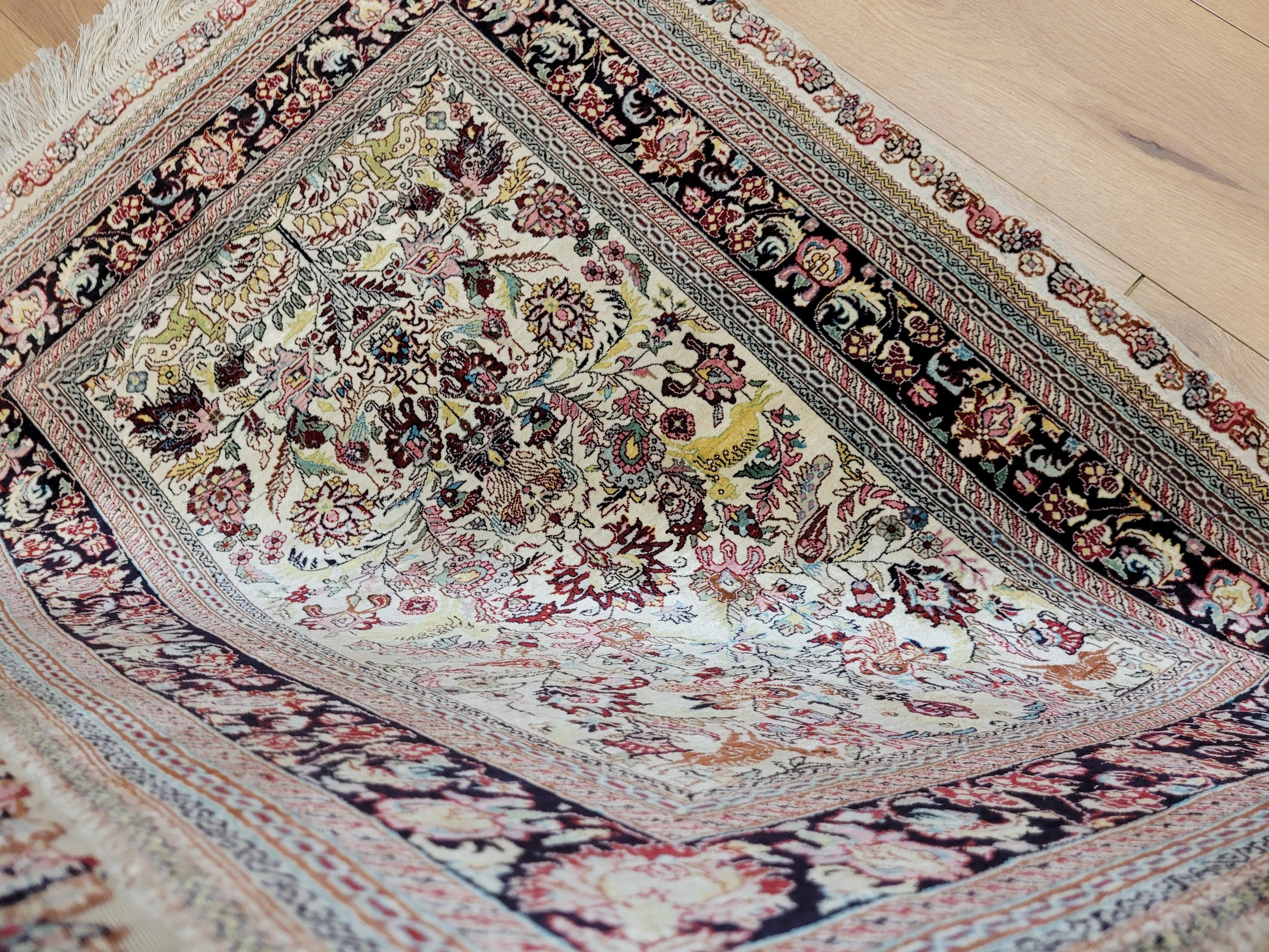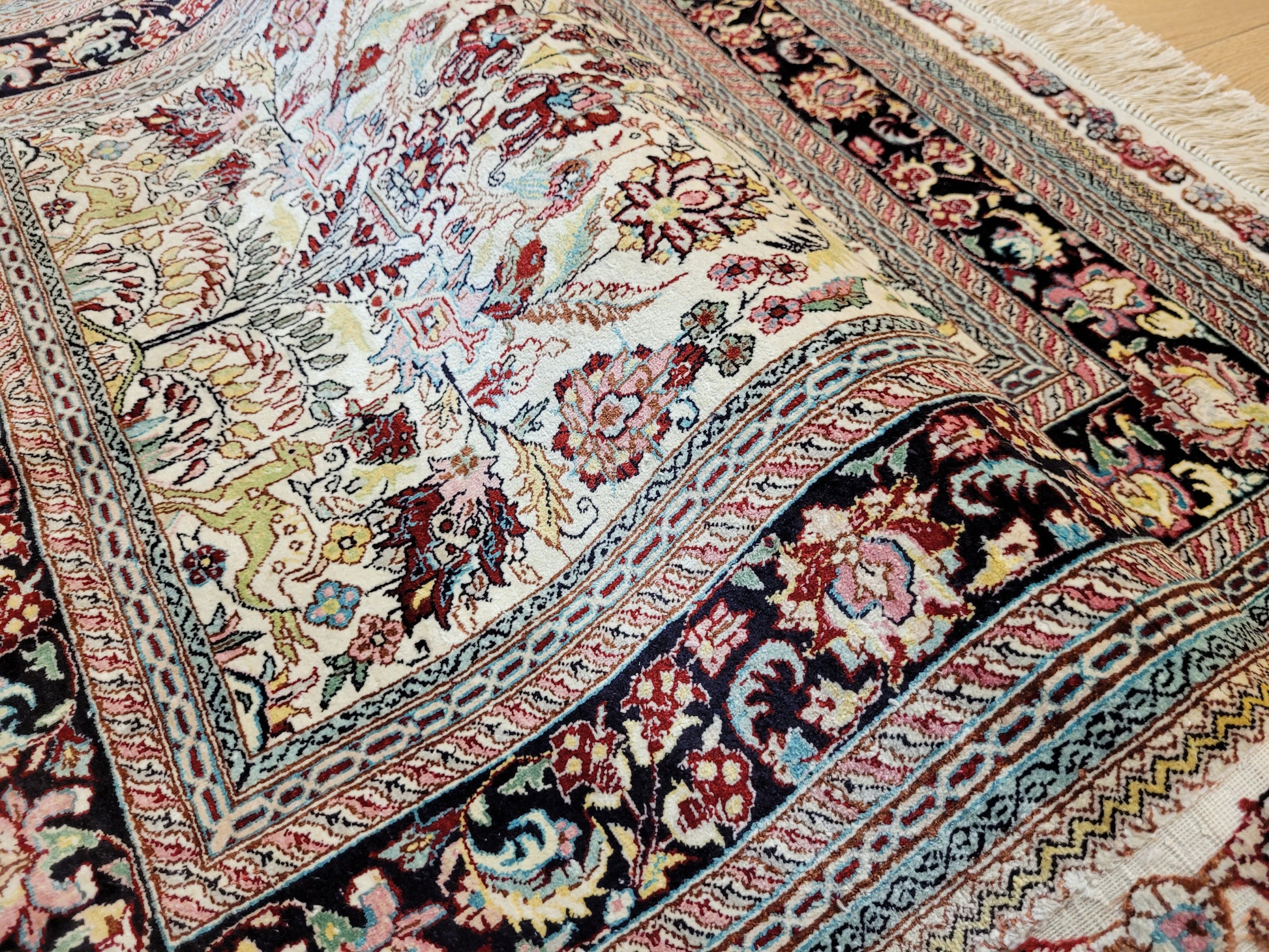 hier präsentieren wir Ihnen einen erlesenen Hereke Seidenteppich, handgeknüpft aus reiner Seide auf Seide. Diese aufwendige Knüpftechnik sorgt für außergewöhnliche Feinheit, seidigen Glanz und hohe Detailtreue.