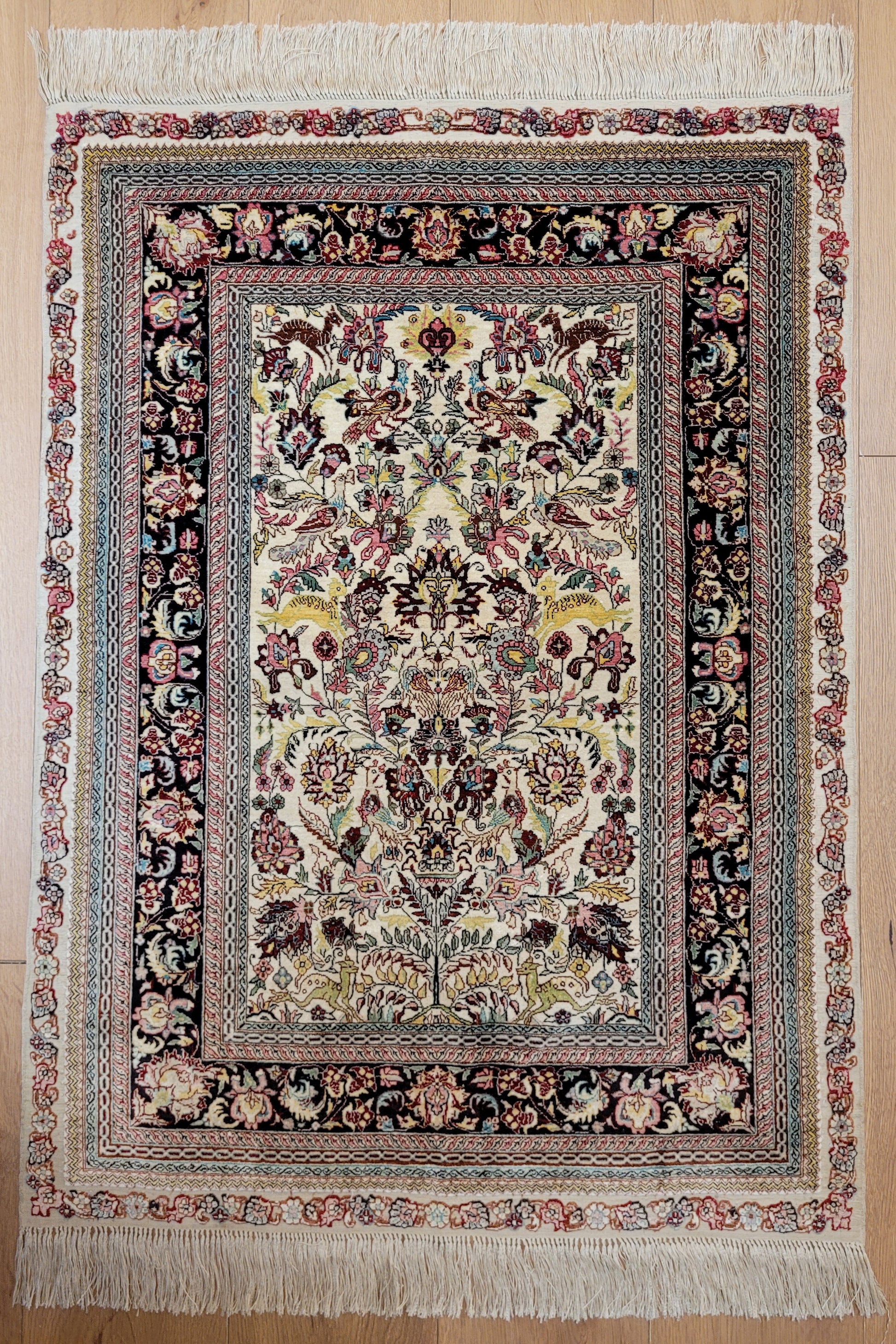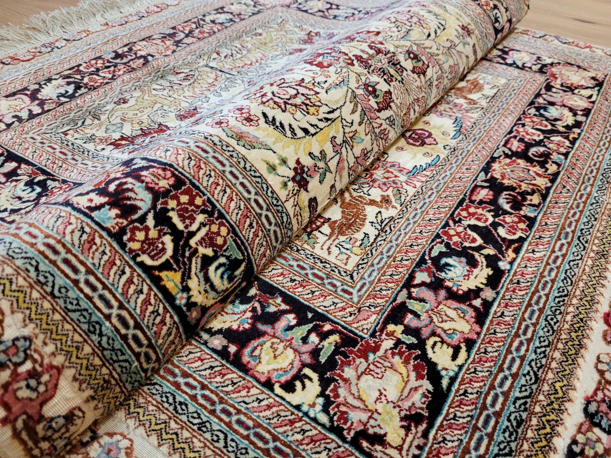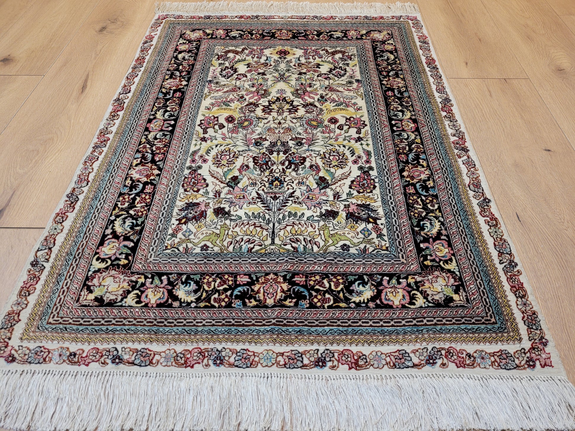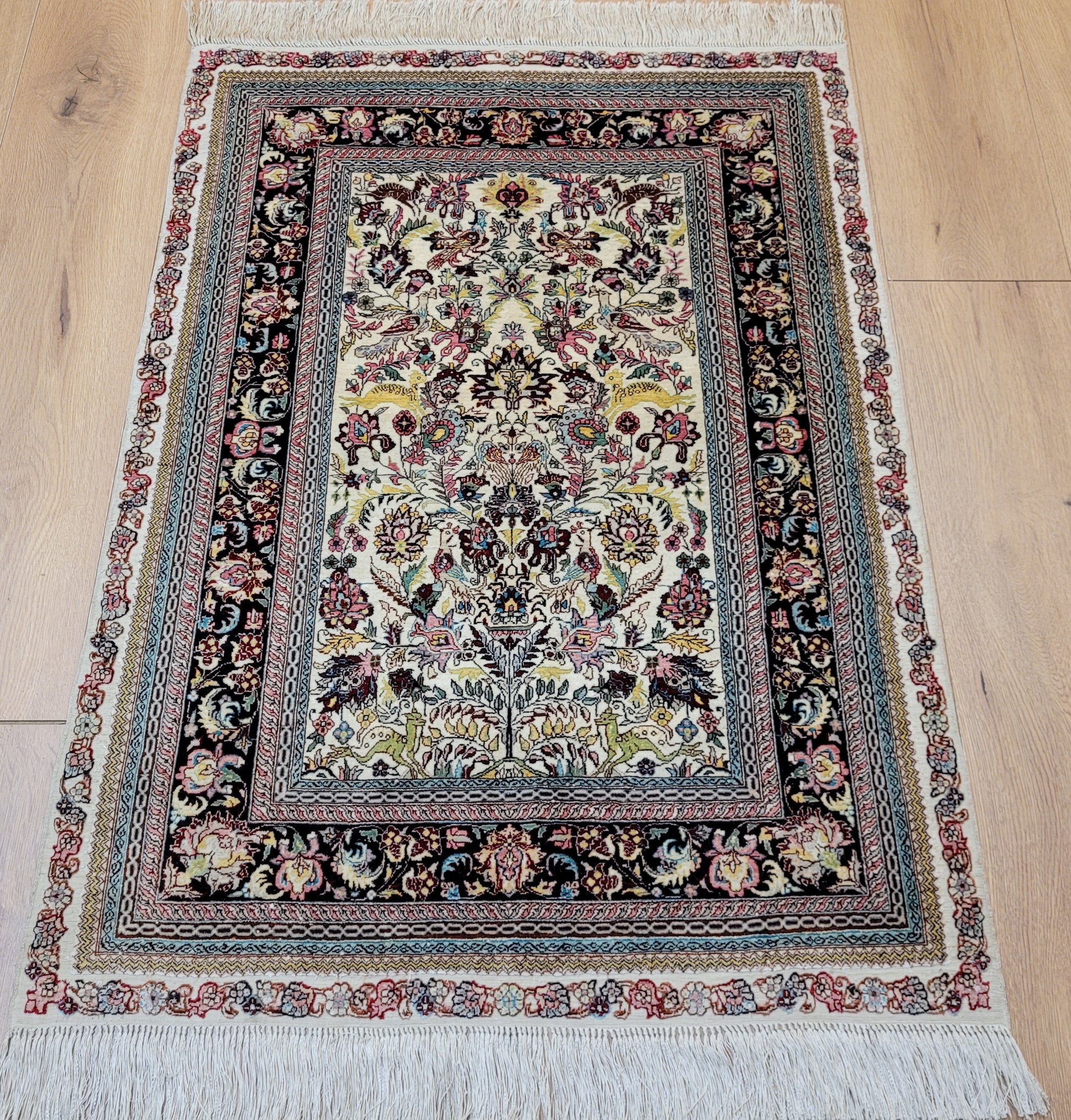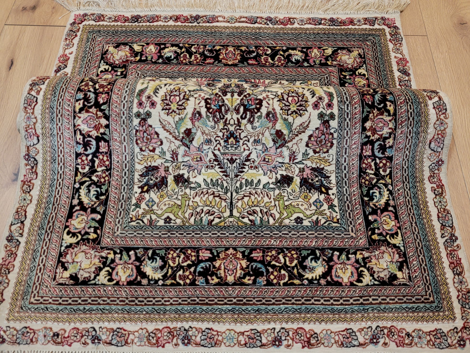 hier präsentieren wir Ihnen einen erlesenen Hereke Seidenteppich, handgeknüpft aus reiner Seide auf Seide. Diese aufwendige Knüpftechnik sorgt für außergewöhnliche Feinheit, seidigen Glanz und hohe Detailtreue.