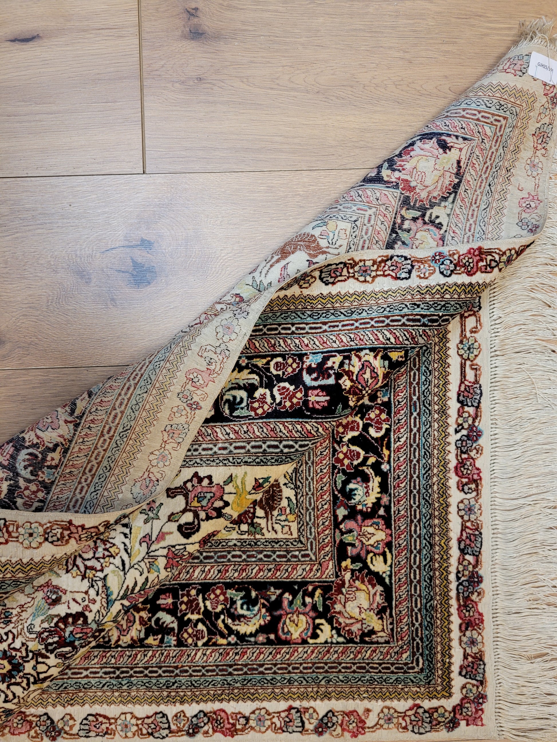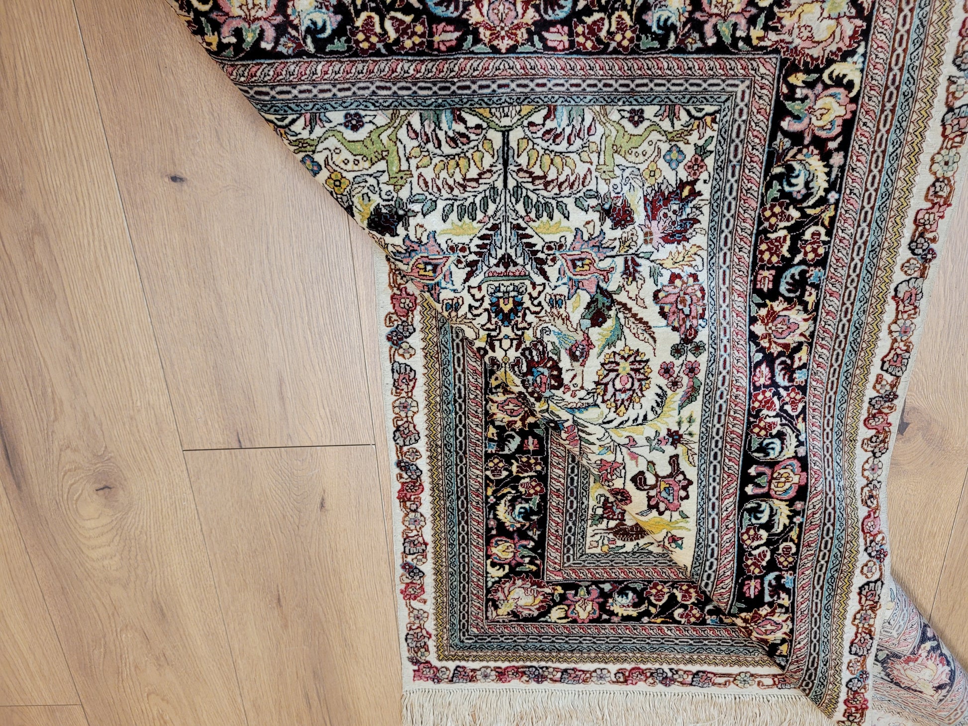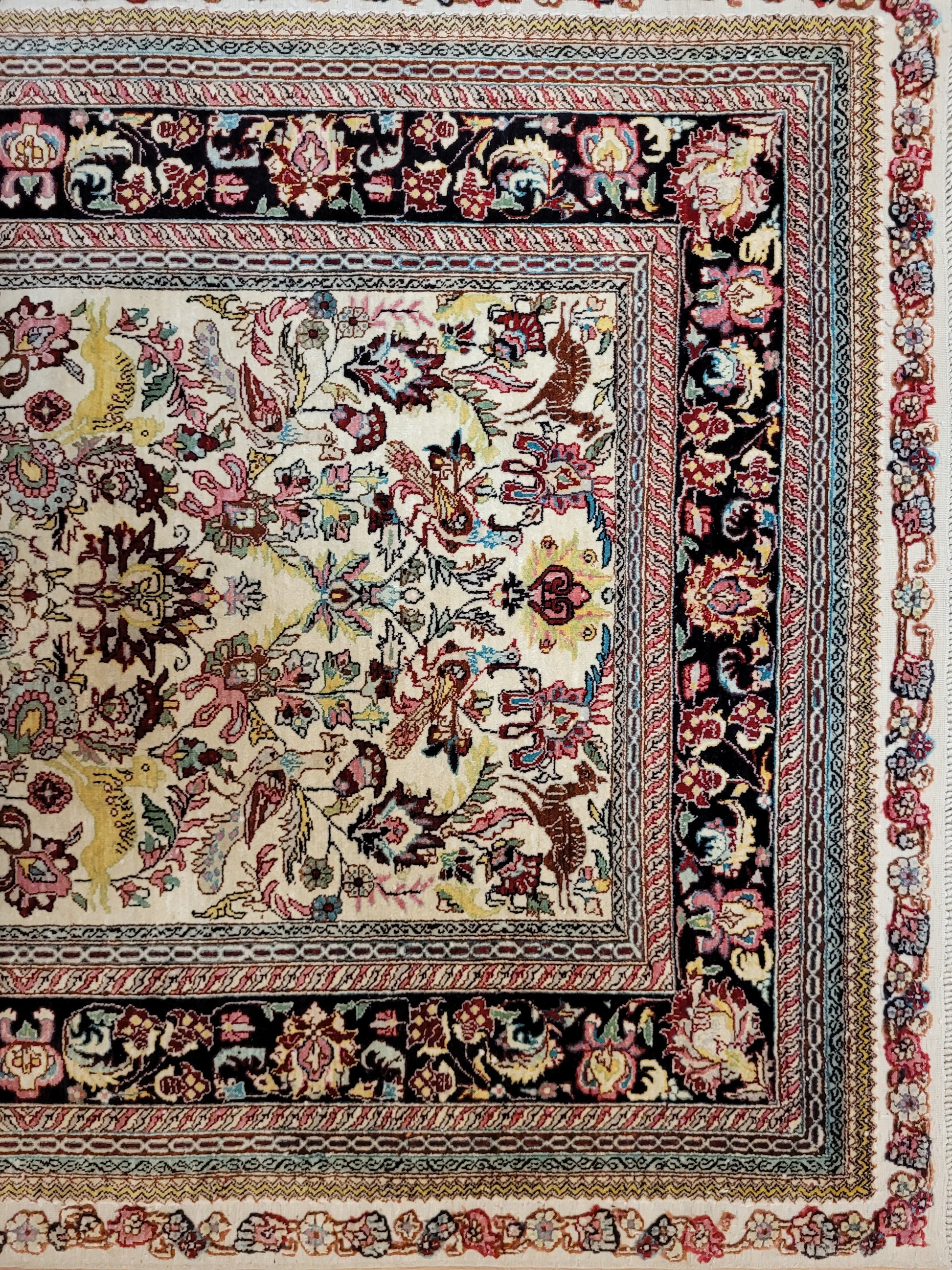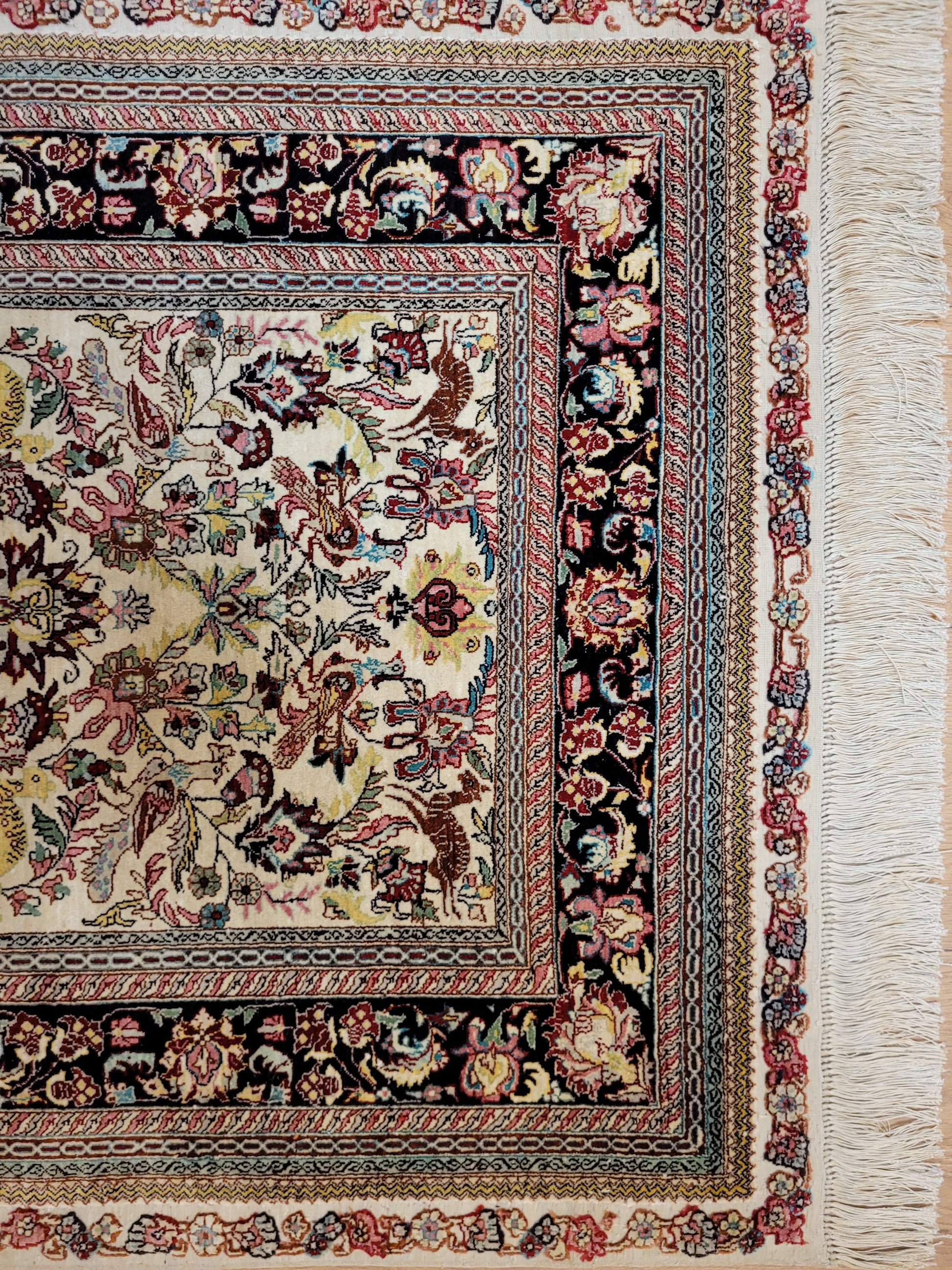 hier präsentieren wir Ihnen einen erlesenen Hereke Seidenteppich, handgeknüpft aus reiner Seide auf Seide. Diese aufwendige Knüpftechnik sorgt für außergewöhnliche Feinheit, seidigen Glanz und hohe Detailtreue.