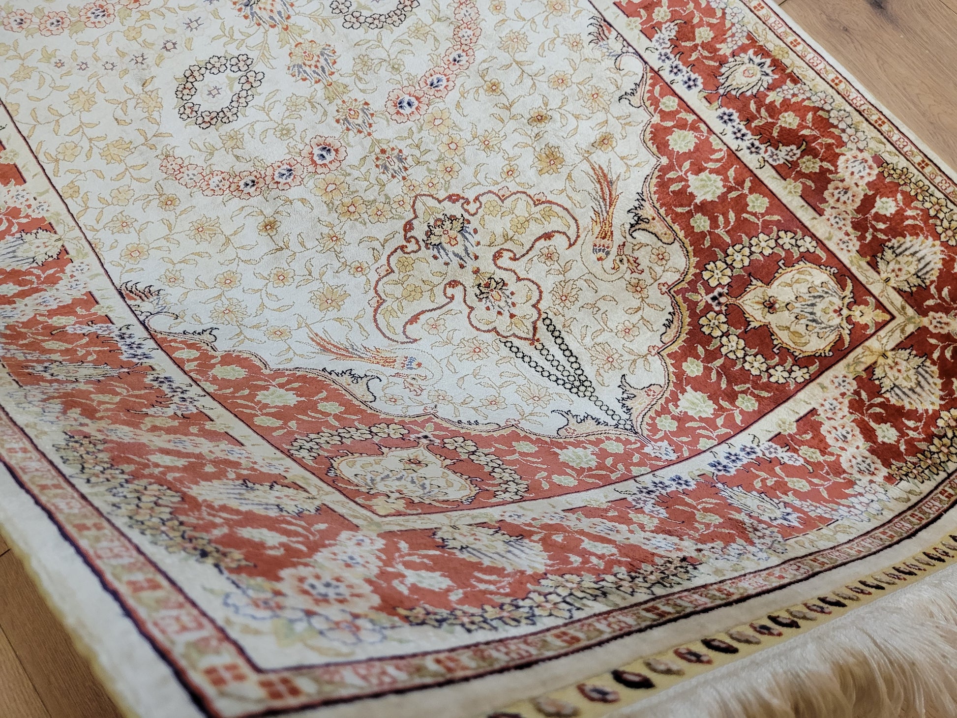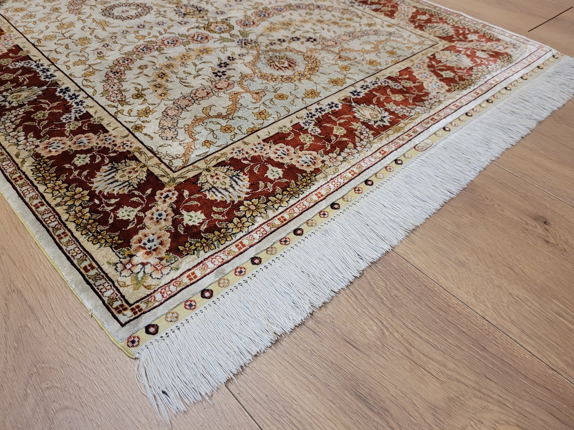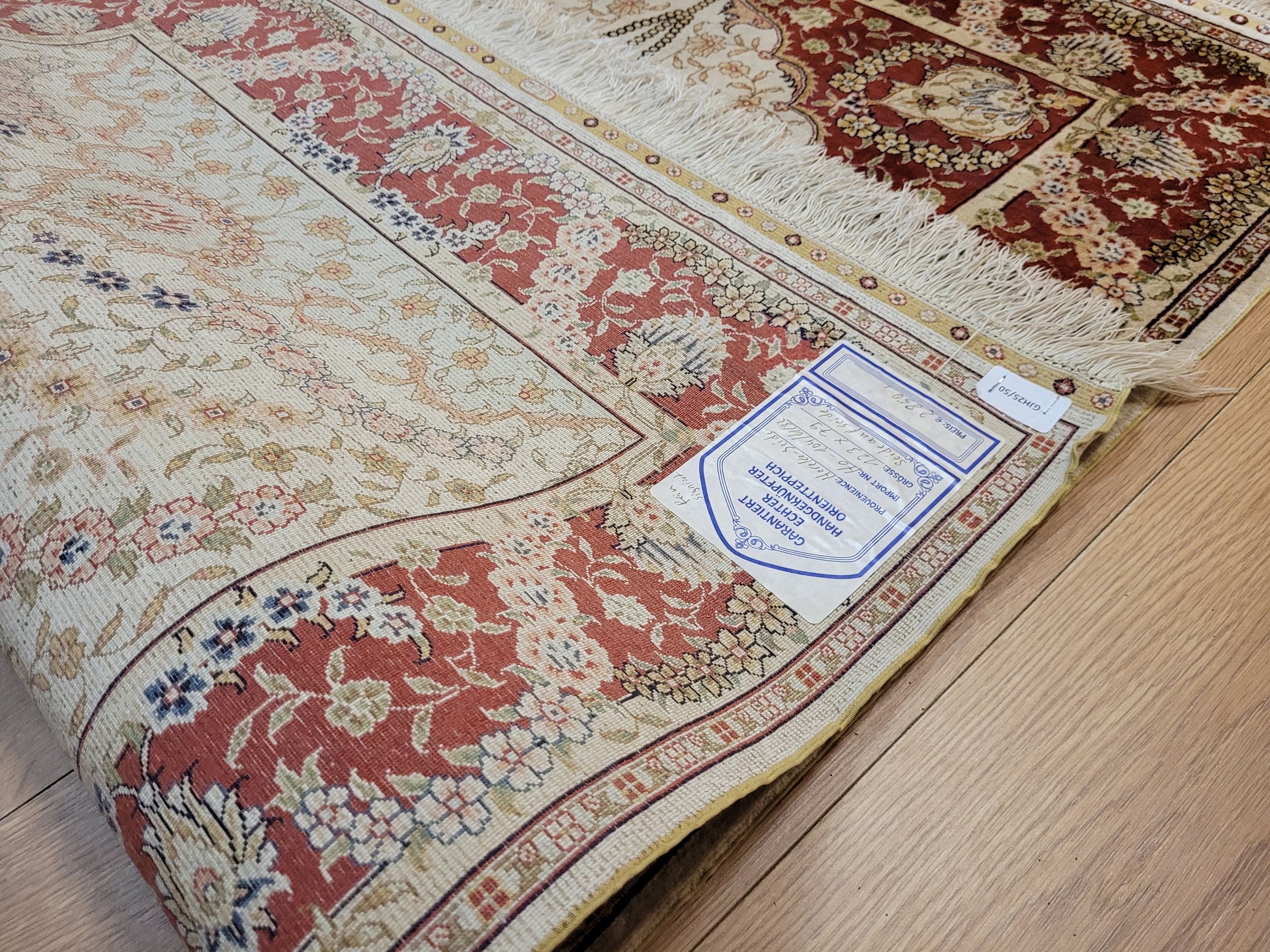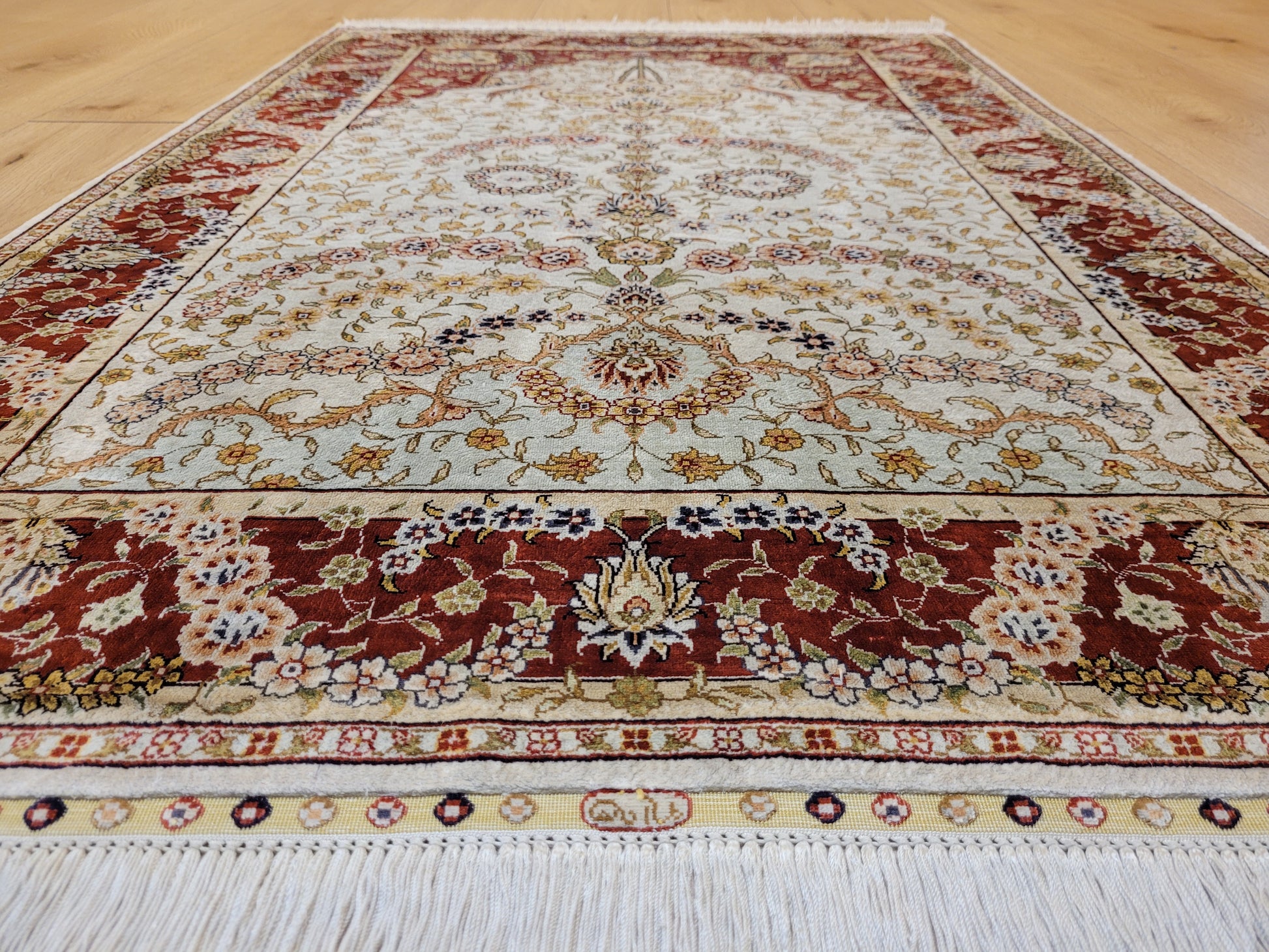angeboten wird ein erlesener Hereke Teppich aus reiner Seide auf Seide, handgeknüpft in feiner Knüpfung und signiert. Im Zentrum des hellen Fondfeldes entfaltet sich ein zartes Blütenmuster, das von stilisierten Paradiesvögeln flankiert wird. Die umlaufende Bordüre in kräftigem Rot mit floralen Ranken verleiht dem Teppich eine edle Rahmung und betont die kunstvolle Ausstrahlung.