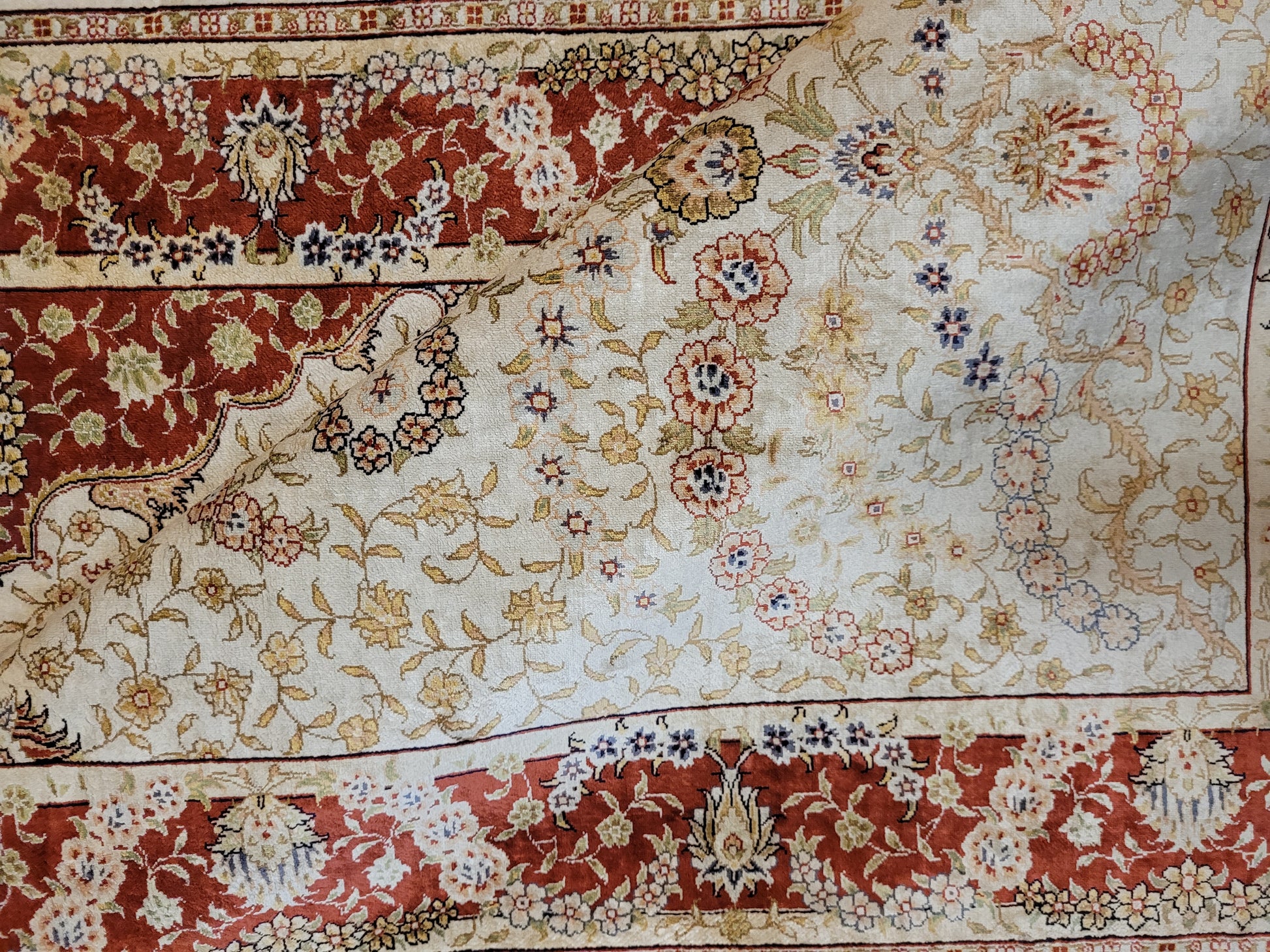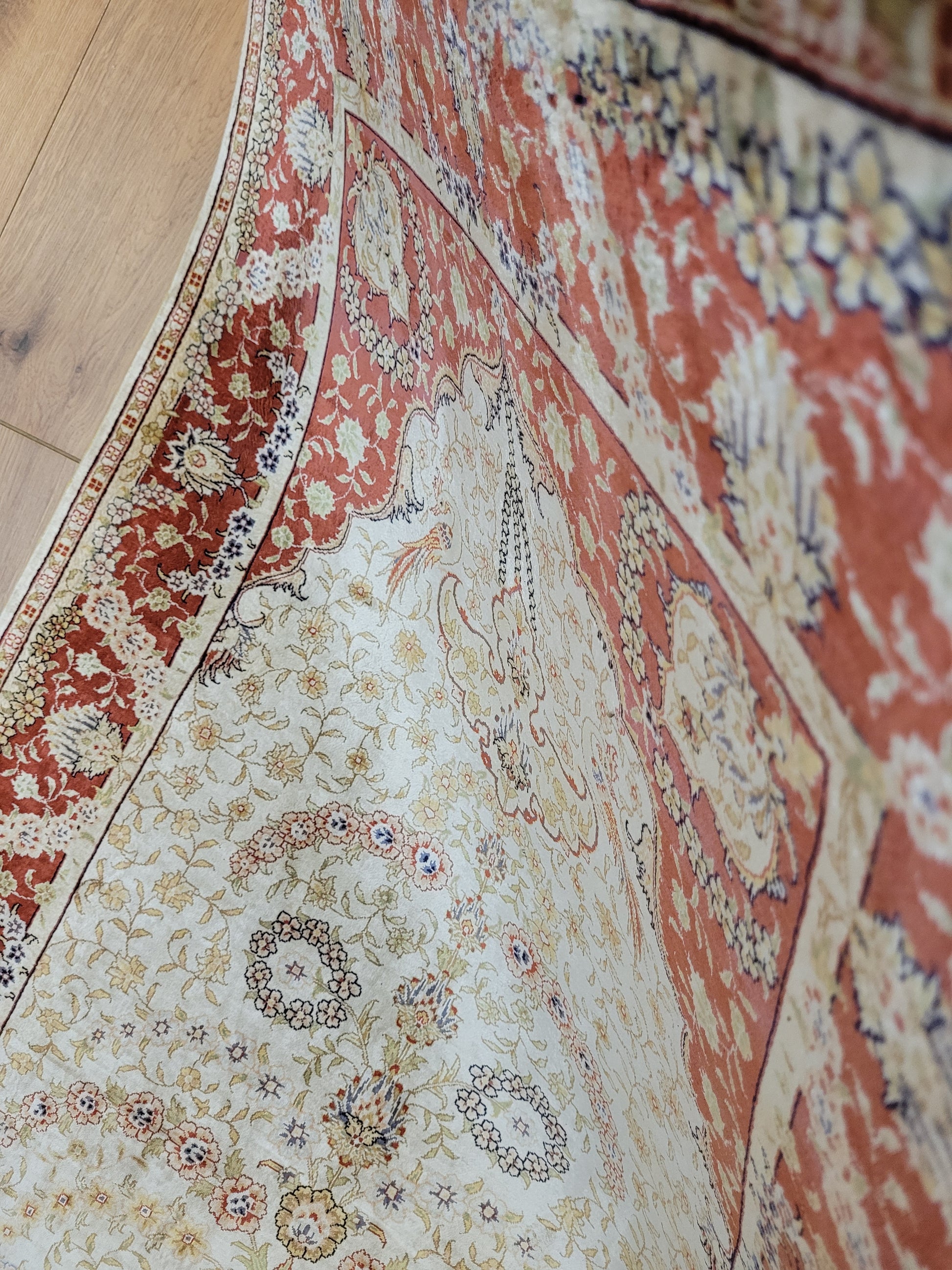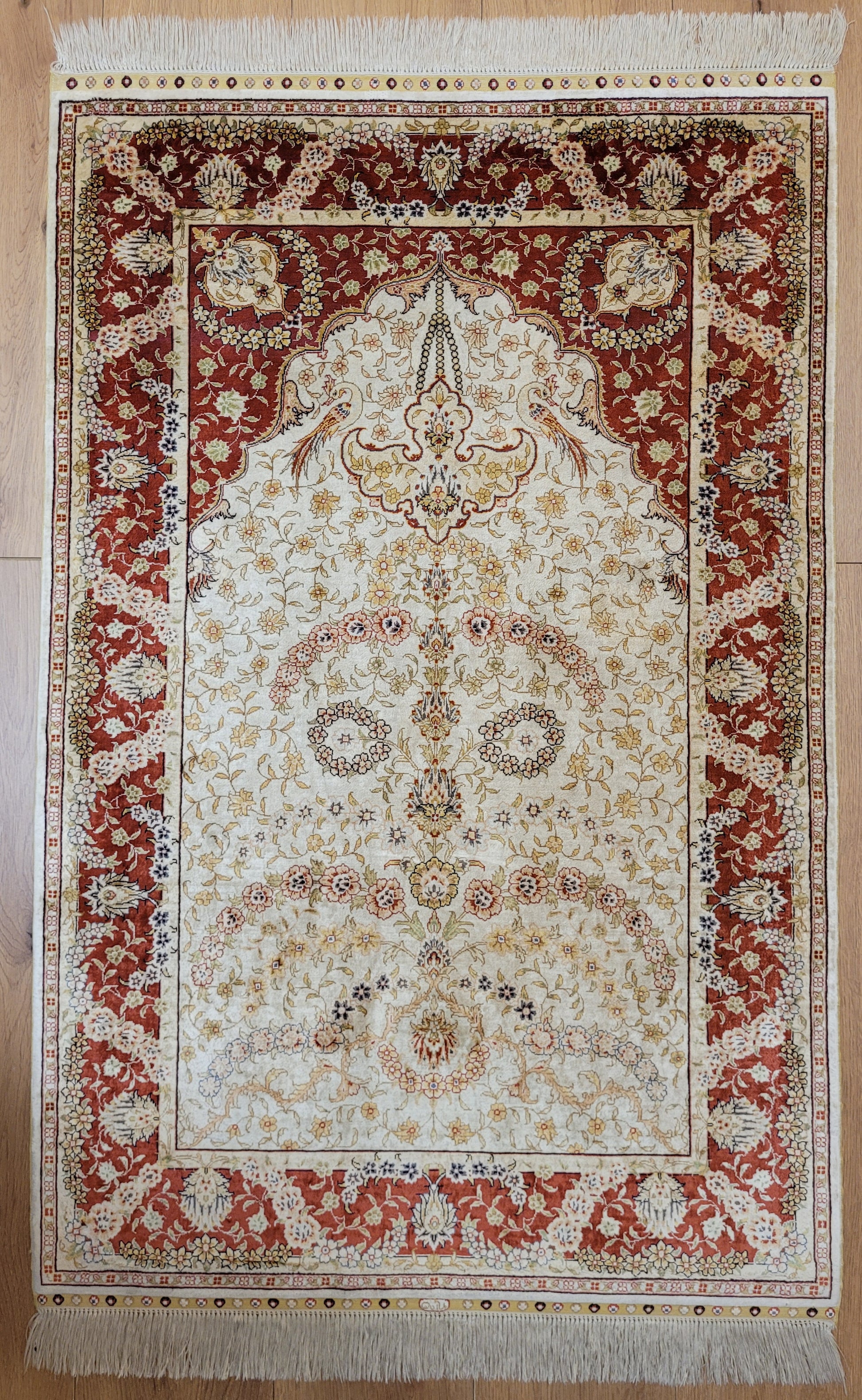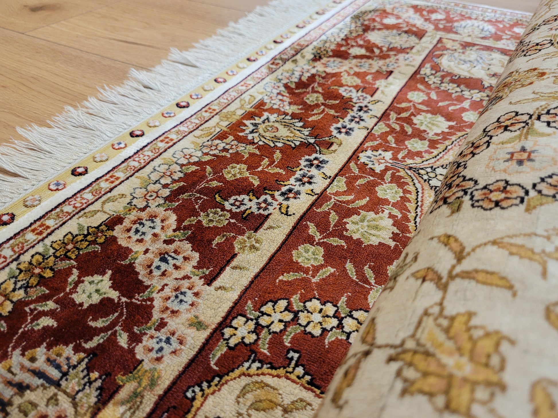 angeboten wird ein erlesener Hereke Teppich aus reiner Seide auf Seide, handgeknüpft in feiner Knüpfung und signiert. Im Zentrum des hellen Fondfeldes entfaltet sich ein zartes Blütenmuster, das von stilisierten Paradiesvögeln flankiert wird. Die umlaufende Bordüre in kräftigem Rot mit floralen Ranken verleiht dem Teppich eine edle Rahmung und betont die kunstvolle Ausstrahlung.