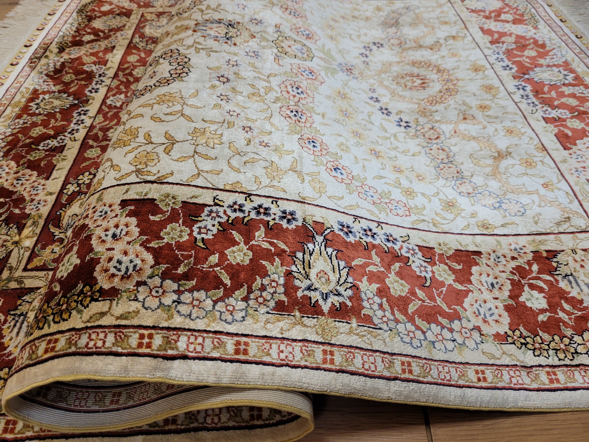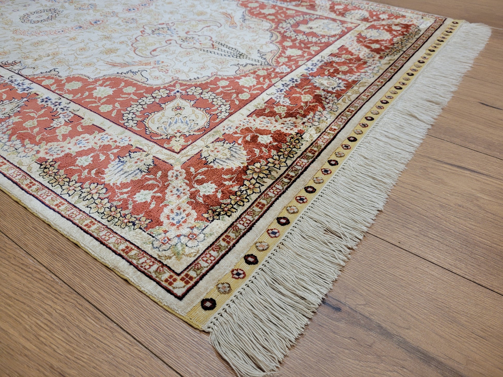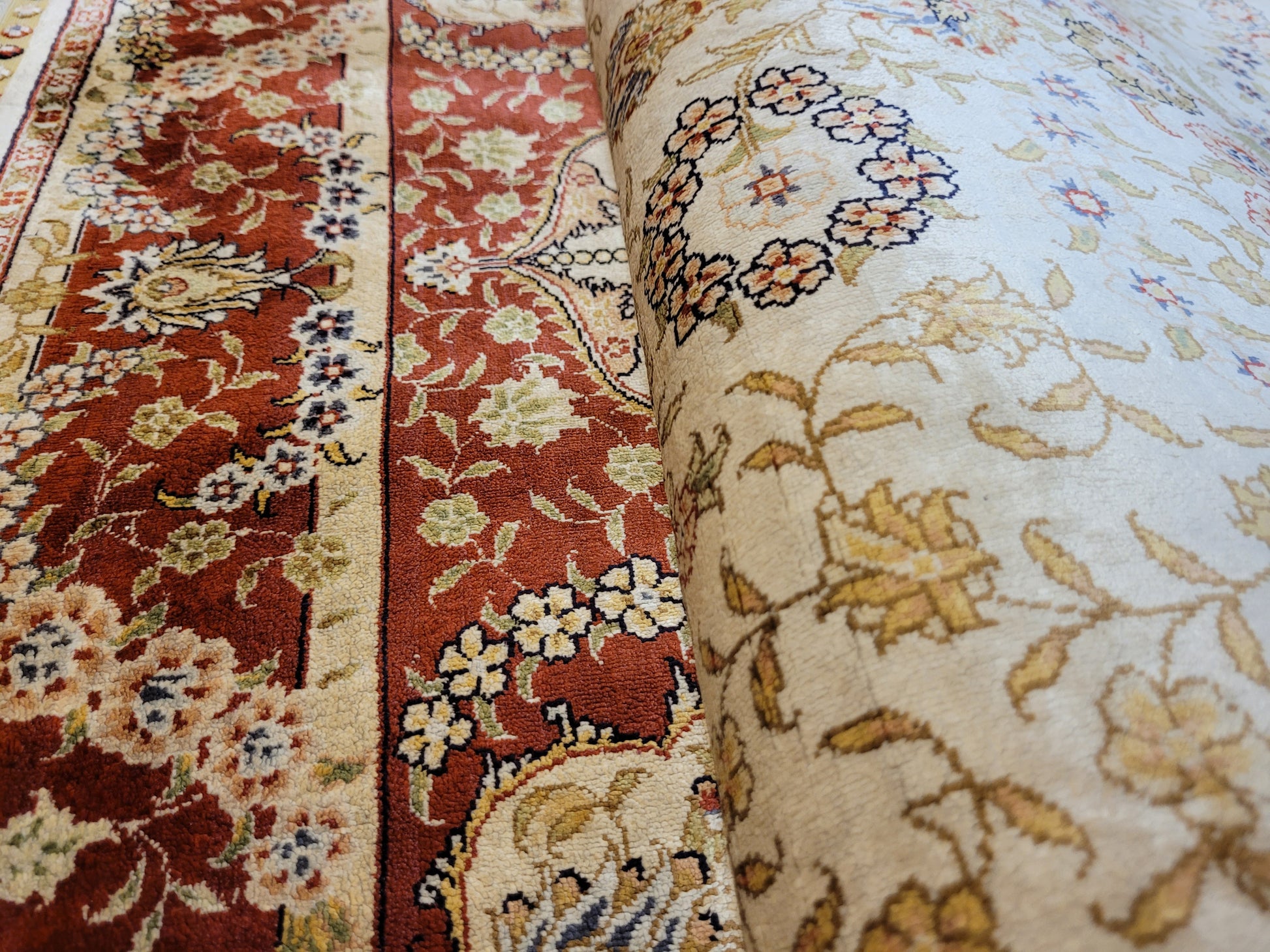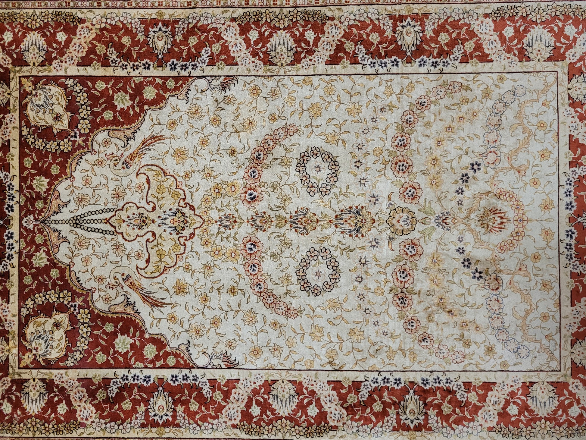 angeboten wird ein erlesener Hereke Teppich aus reiner Seide auf Seide, handgeknüpft in feiner Knüpfung und signiert. Im Zentrum des hellen Fondfeldes entfaltet sich ein zartes Blütenmuster, das von stilisierten Paradiesvögeln flankiert wird. Die umlaufende Bordüre in kräftigem Rot mit floralen Ranken verleiht dem Teppich eine edle Rahmung und betont die kunstvolle Ausstrahlung.