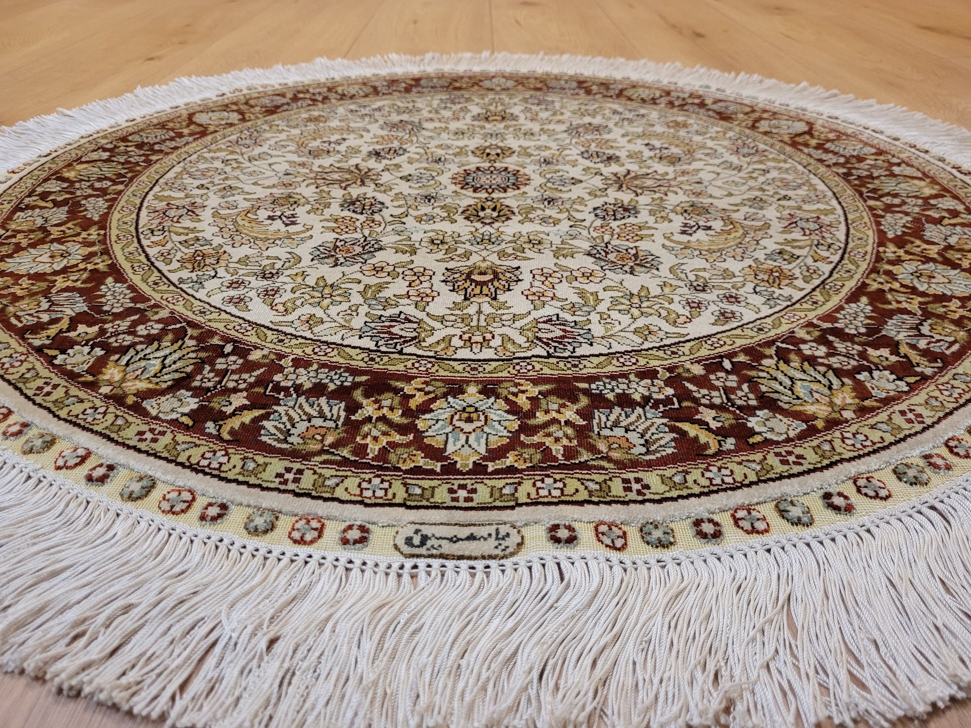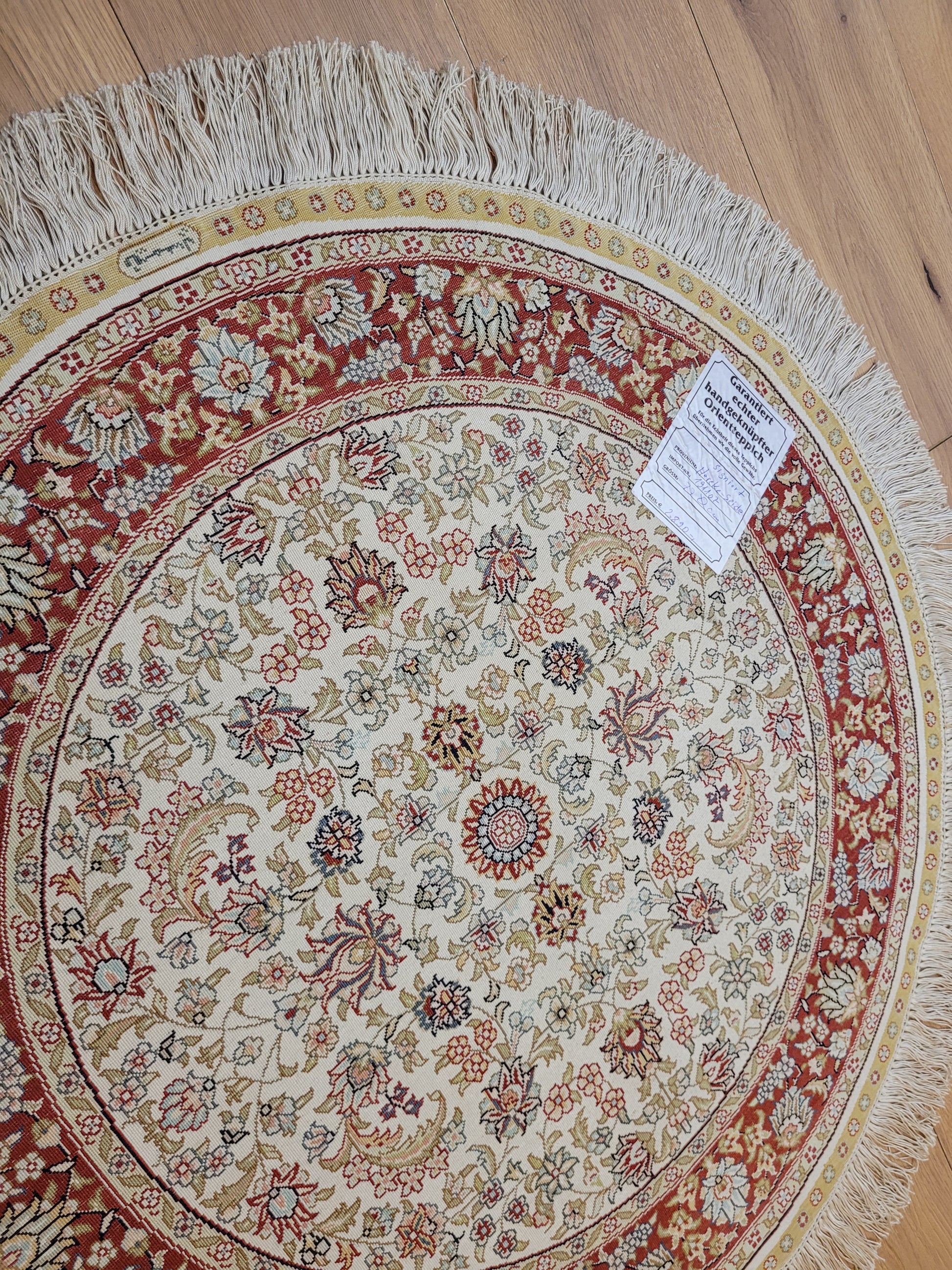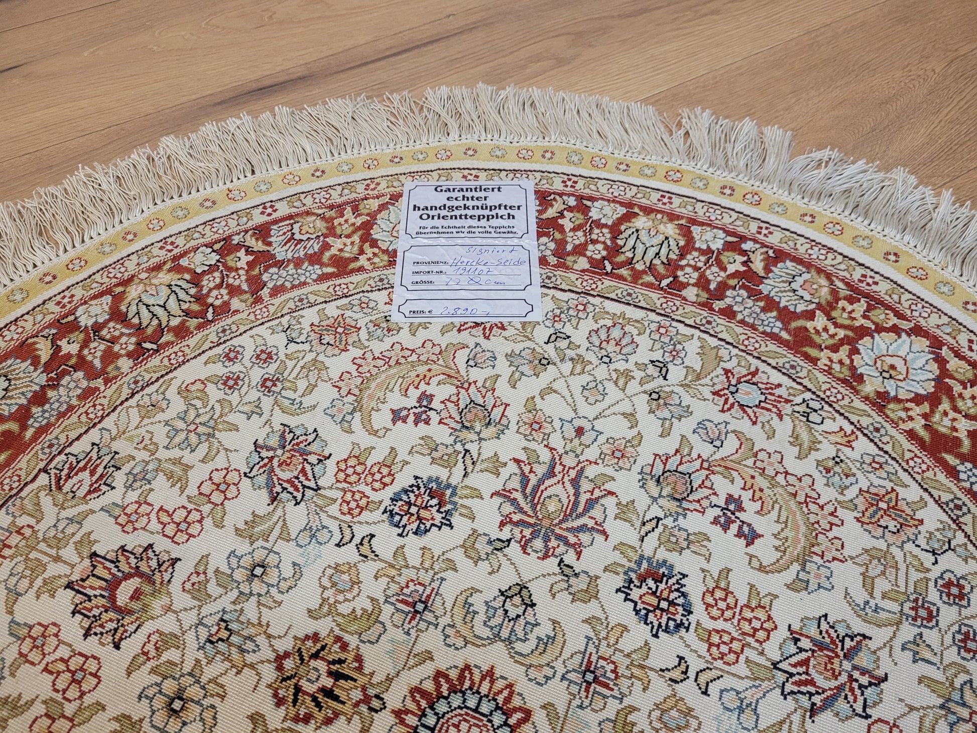 angeboten wird ein edler Hereke Teppich aus reiner Seide auf Seide, handgeknüpft in feiner Knüpfung und signiert. Das runde Format mit einem Durchmesser von 77 cm wird durch ein kunstvoll gestaltetes Zentralmedaillon betont, das von harmonisch angeordneten Blüten- und Rankenmotiven umgeben ist. Die Bordüre in warmem Rotbraun mit floralen Ornamenten rundet das elegante Gesamtbild perfekt ab.