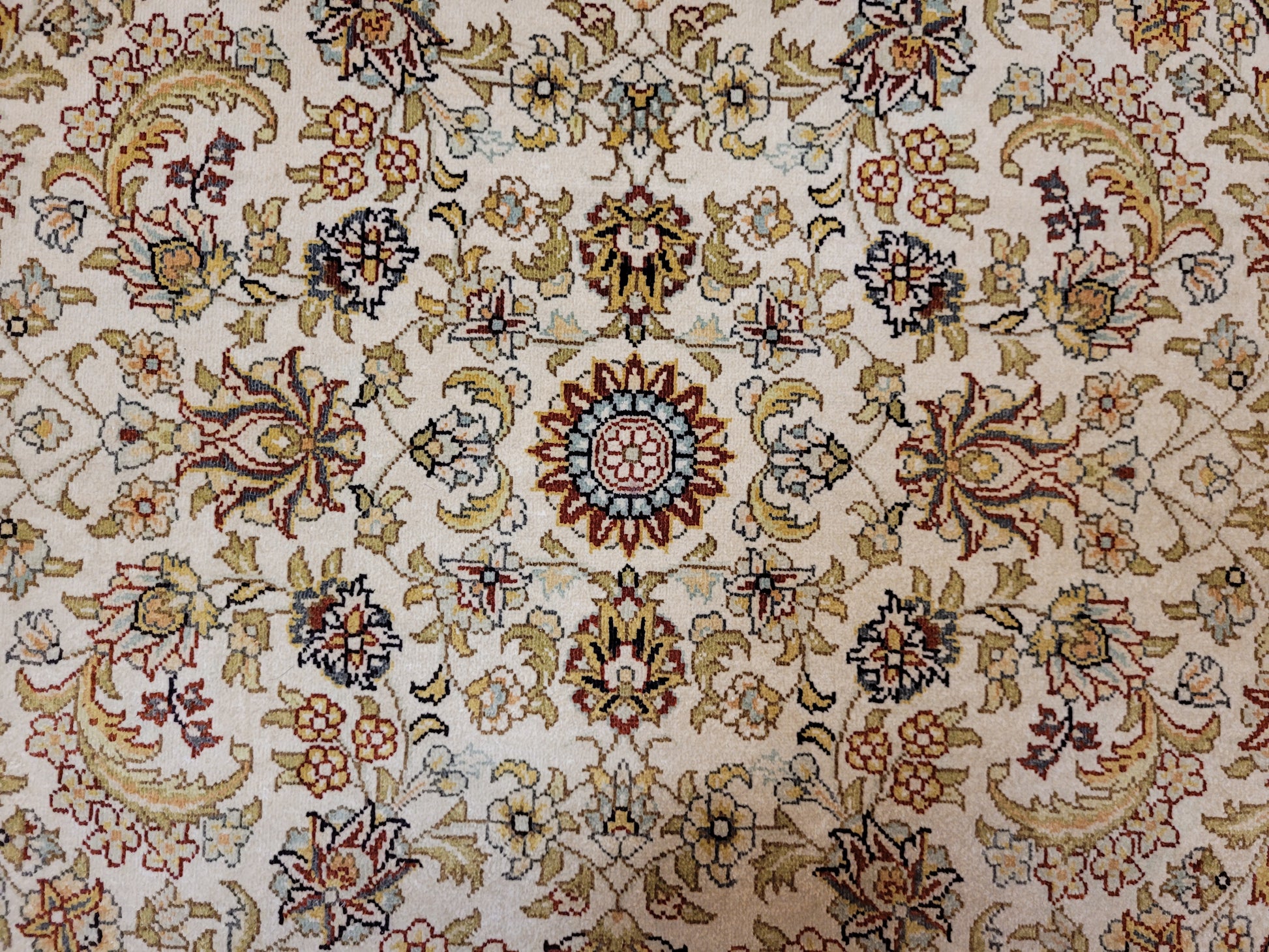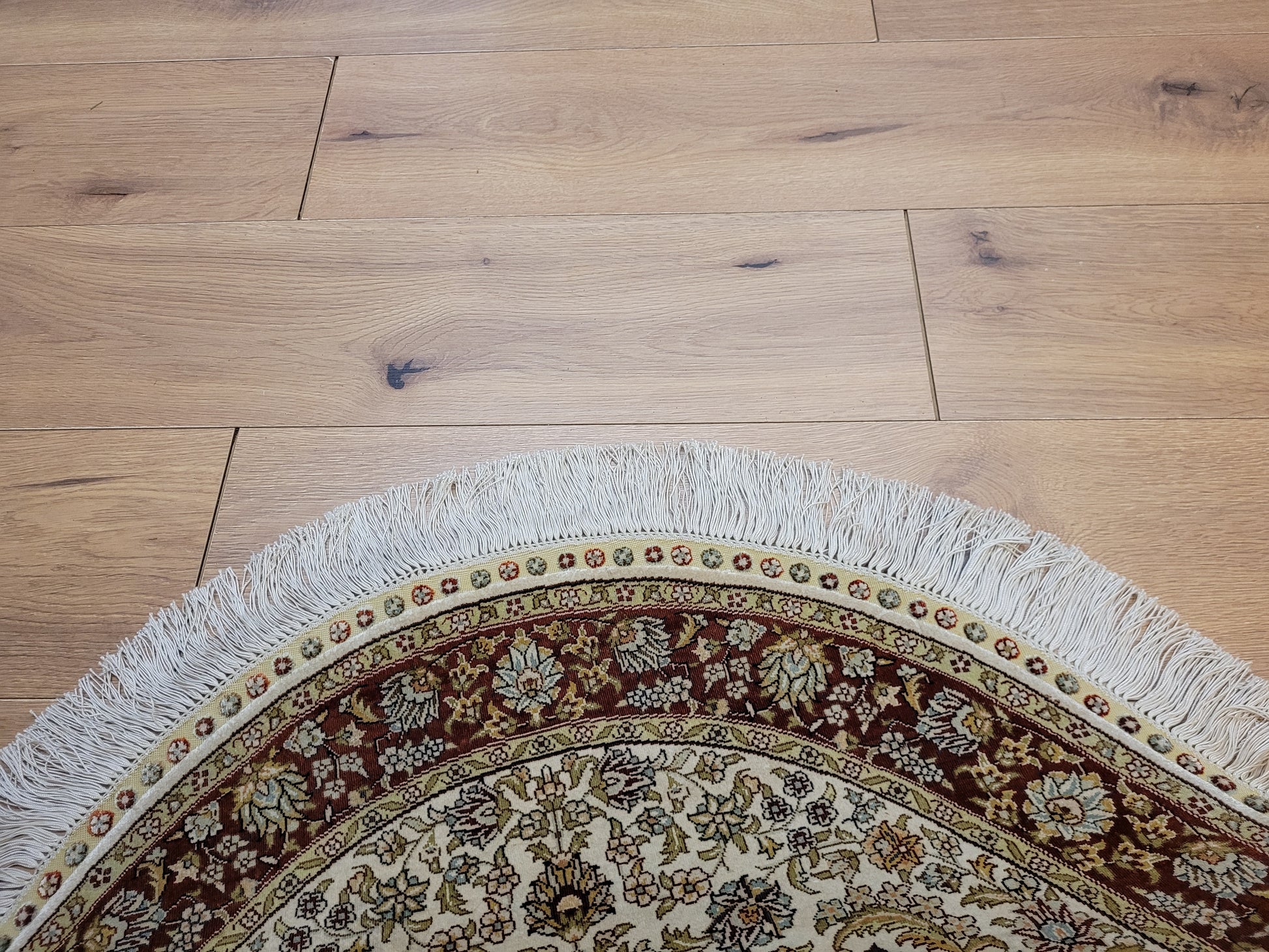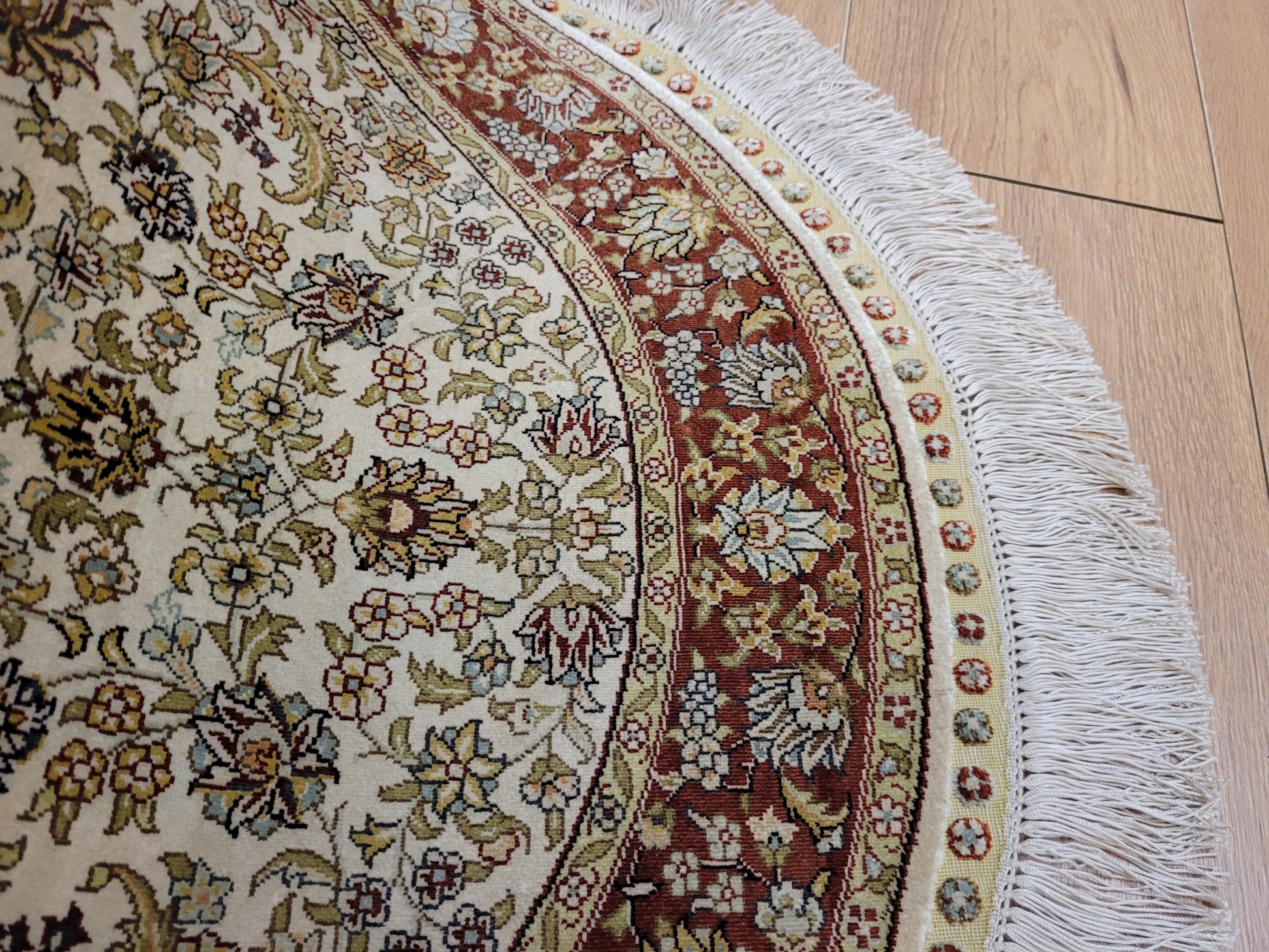 angeboten wird ein edler Hereke Teppich aus reiner Seide auf Seide, handgeknüpft in feiner Knüpfung und signiert. Das runde Format mit einem Durchmesser von 77 cm wird durch ein kunstvoll gestaltetes Zentralmedaillon betont, das von harmonisch angeordneten Blüten- und Rankenmotiven umgeben ist. Die Bordüre in warmem Rotbraun mit floralen Ornamenten rundet das elegante Gesamtbild perfekt ab.