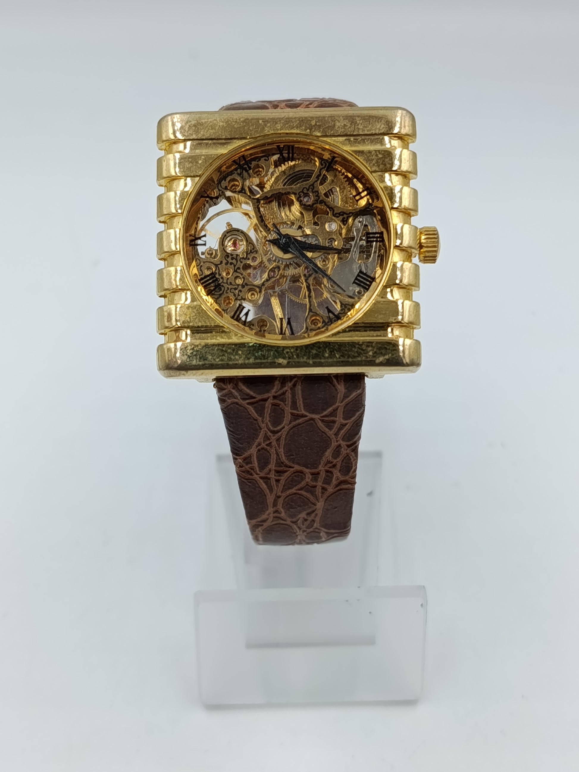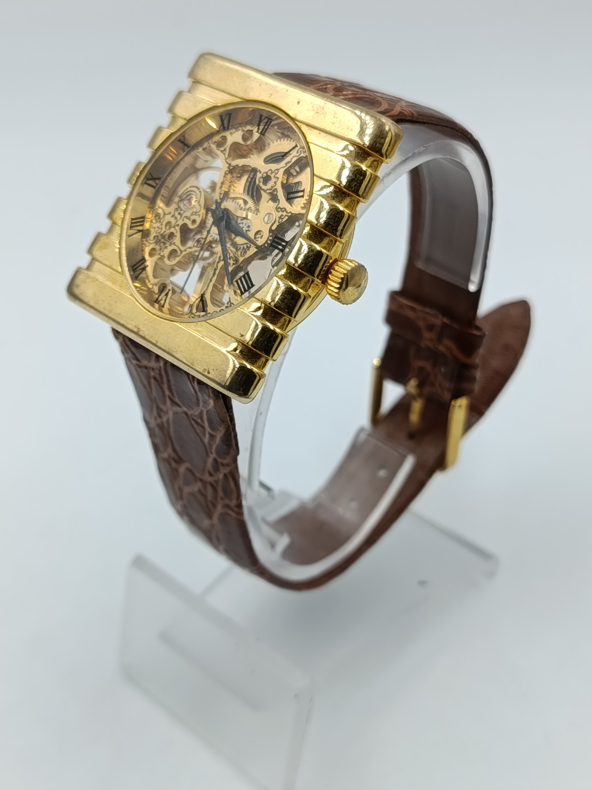 Elegante mechanische Armbanduhr im klassischen Goldton mit skelettiertem Zifferblatt. Das offene Uhrwerk ermöglicht faszinierende Einblicke in die Mechanik und zeigt die feinen Zahnräder in Bewegung. Das strukturierte Gehäuse in Kombination mit dem braunen Echtlederarmband verleiht der Uhr einen edlen und charaktervollen Look.