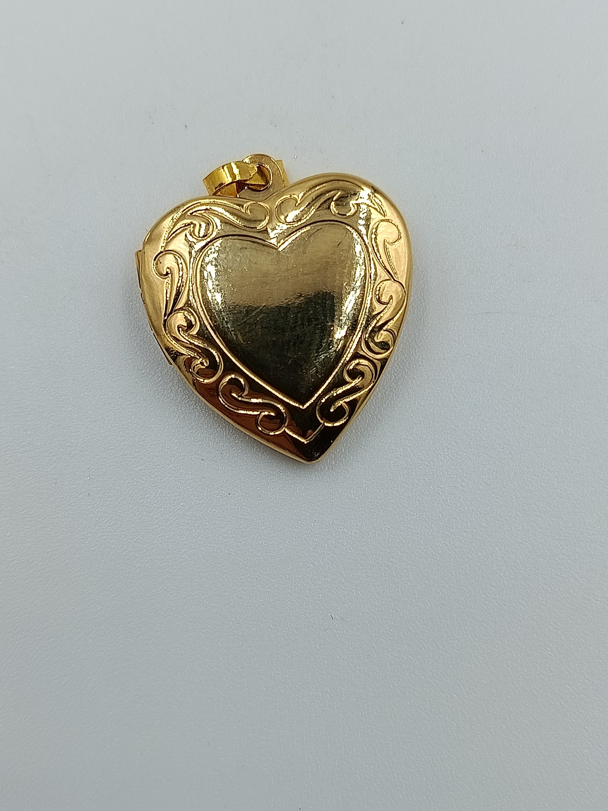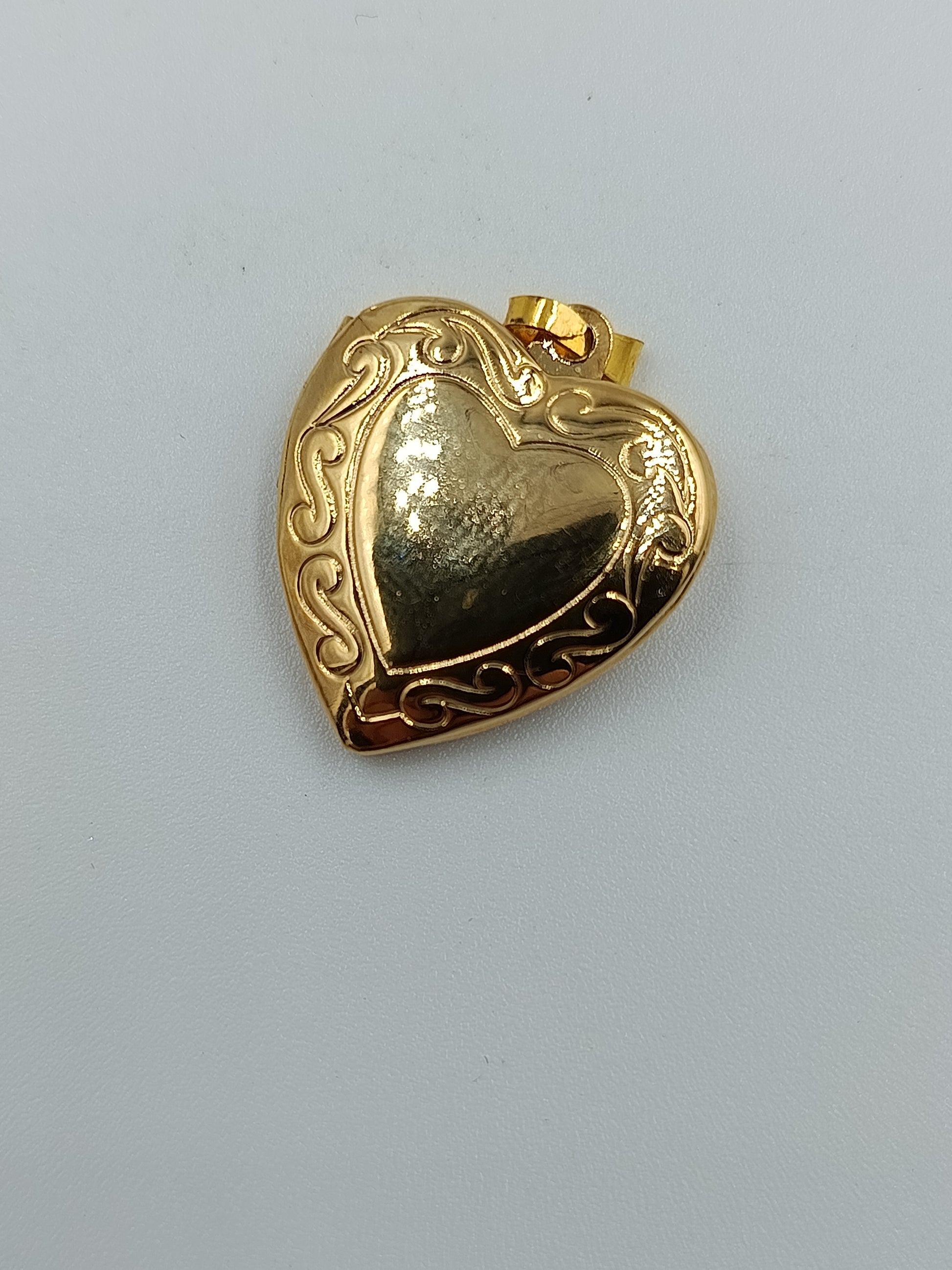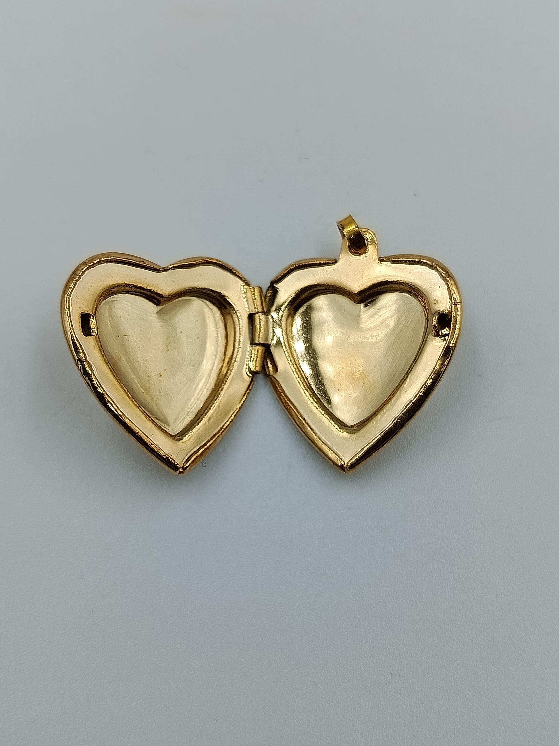 Klassisches, goldfarbenes Herz-Medaillon mit filigranen Verzierungen am Rand. Das Medaillon lässt sich aufklappen und bietet Platz für zwei kleine Fotos oder Erinnerungen – perfekt für einen ganz persönlichen Schmuckanhänger.