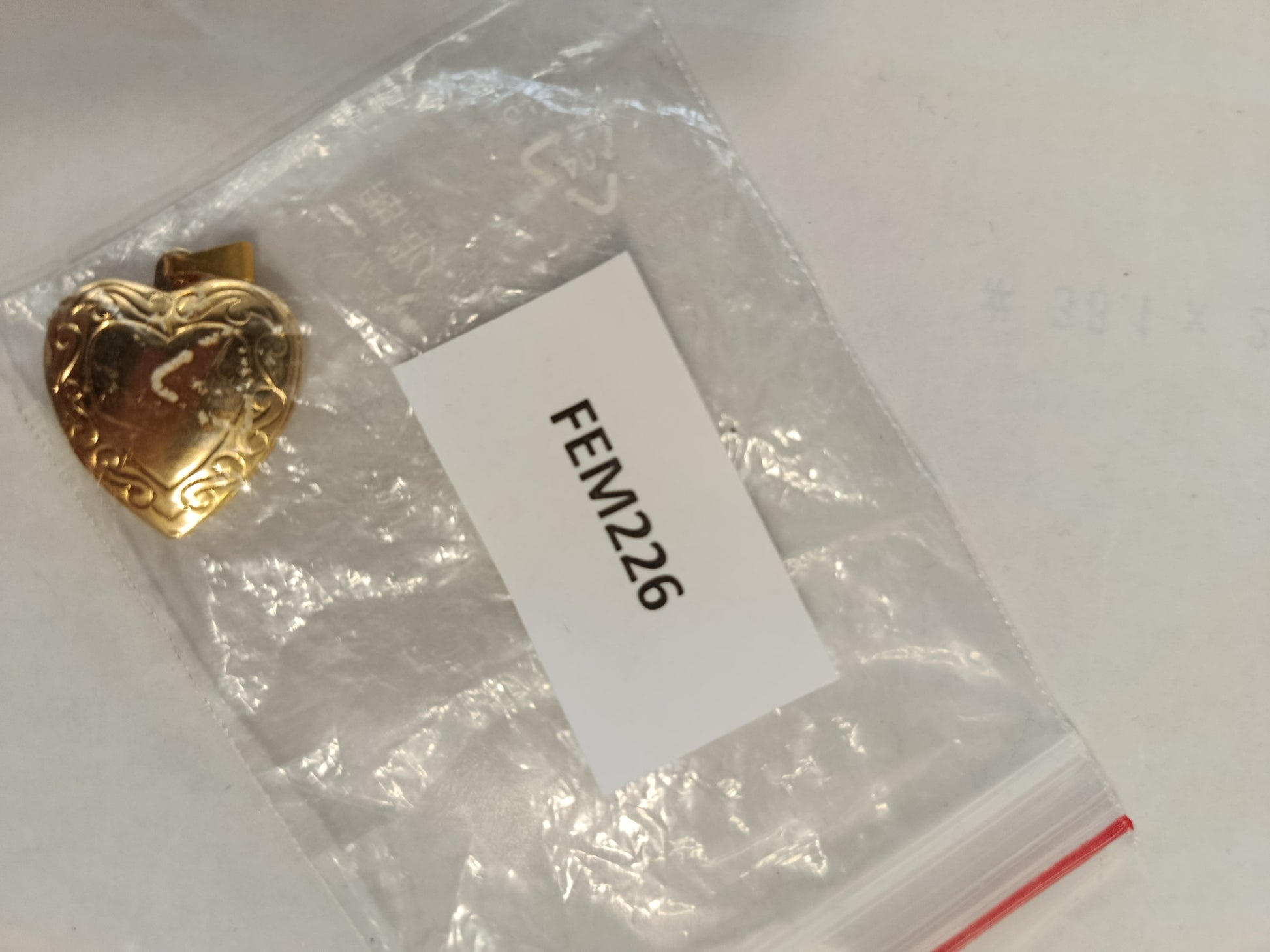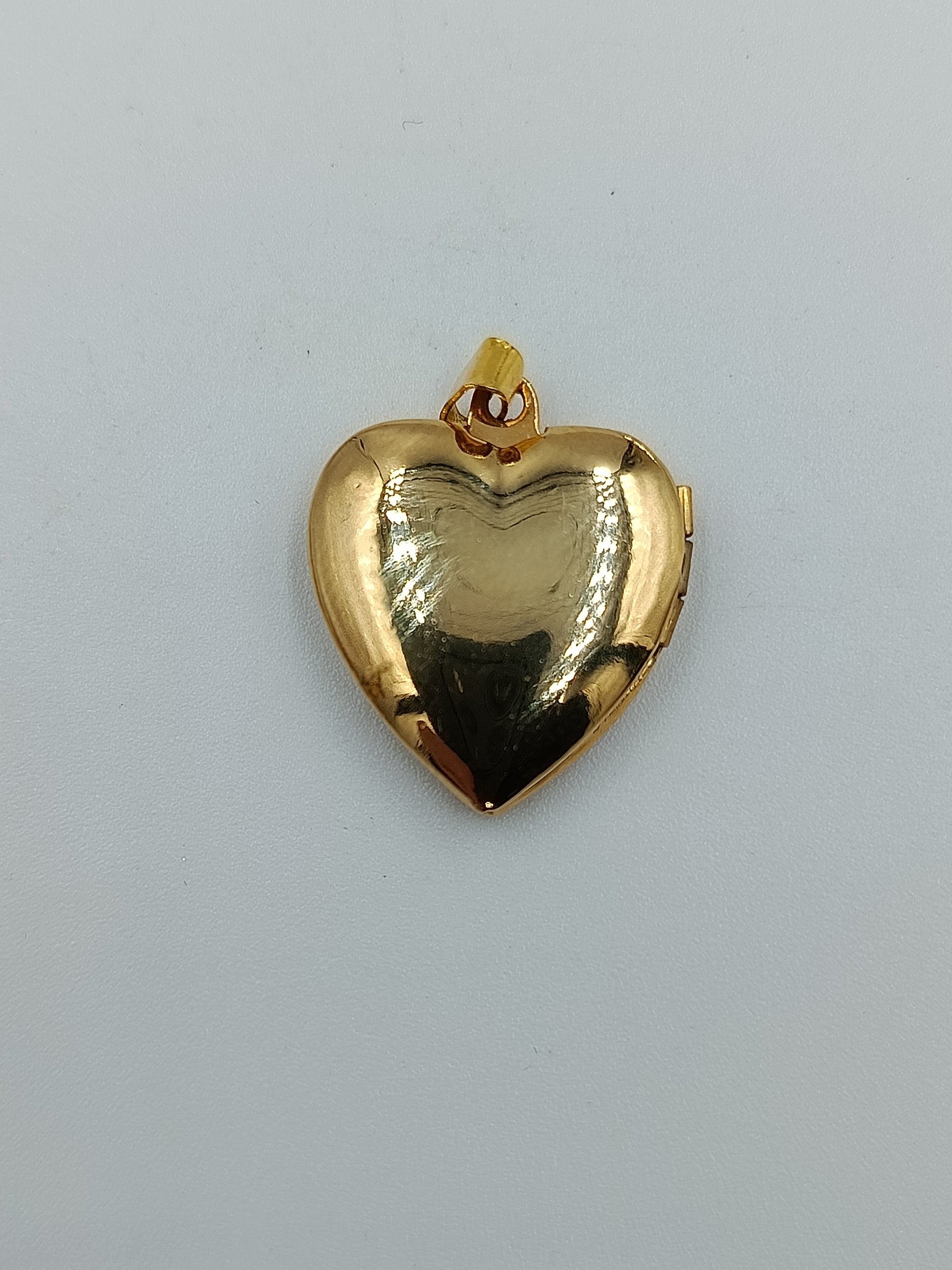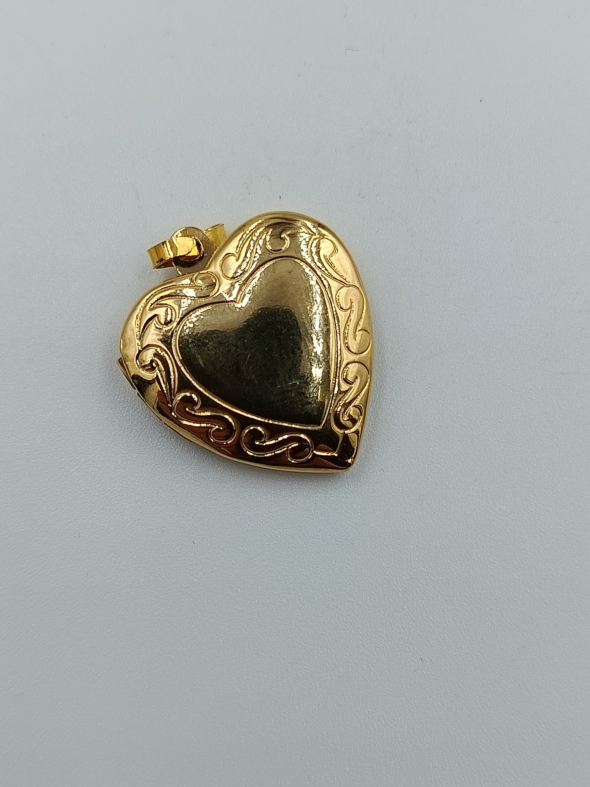 Klassisches, goldfarbenes Herz-Medaillon mit filigranen Verzierungen am Rand. Das Medaillon lässt sich aufklappen und bietet Platz für zwei kleine Fotos oder Erinnerungen – perfekt für einen ganz persönlichen Schmuckanhänger.