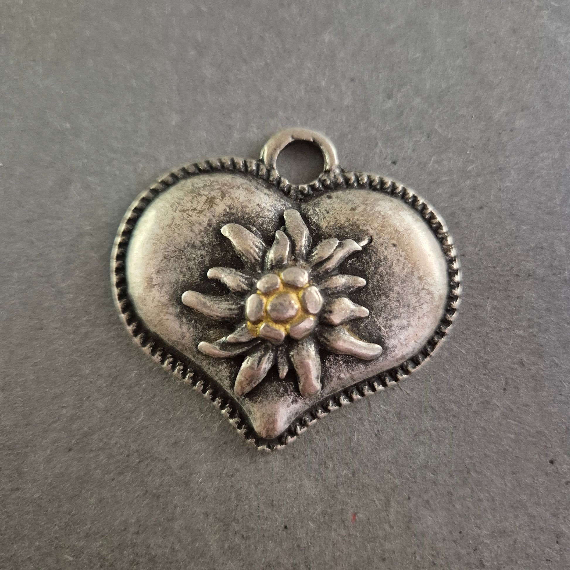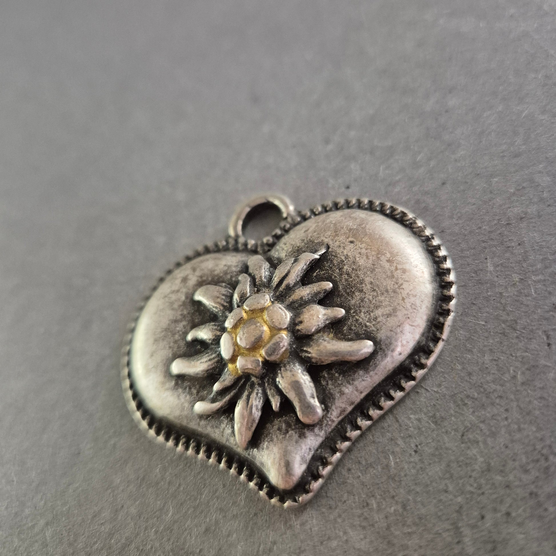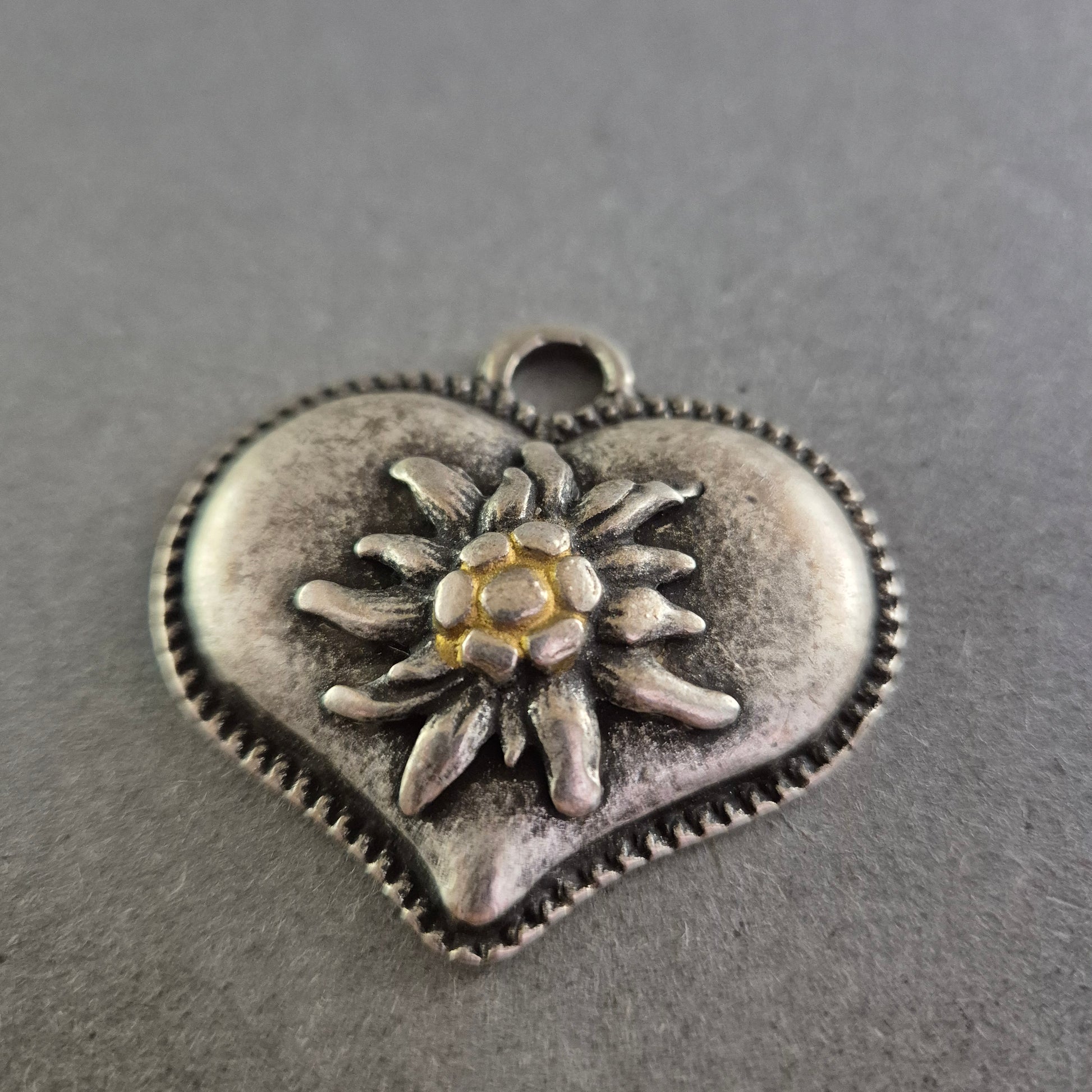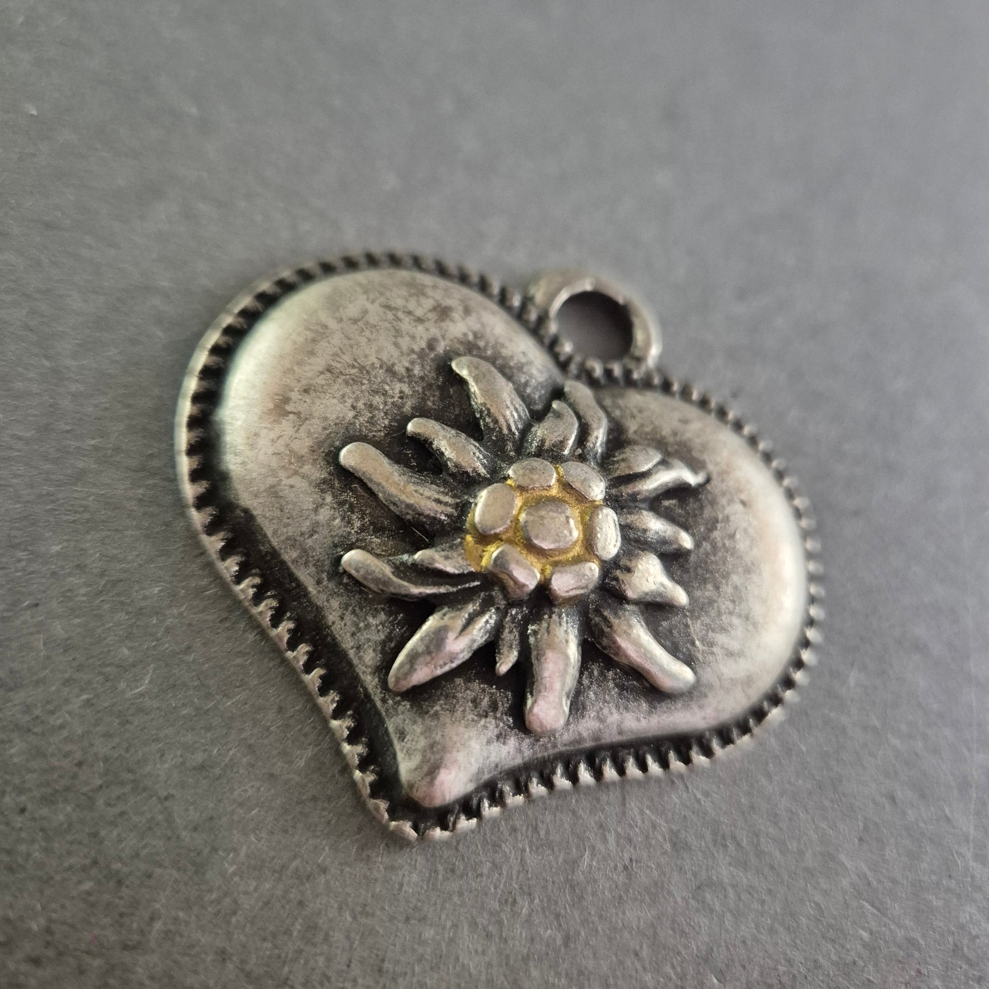 Dieser herzförmige Trachtenanhänger aus Metall ist mit einem plastisch gearbeiteten Edelweiß verziert – dem Symbol der Alpen. Die antik-silberne Optik und das detailreiche Design machen ihn zum idealen Accessoire für Trachtenmode, Sammlerstücke oder als besonderer Anhänger für Ketten oder Taschen. Die robuste Öse sorgt für einfaches Anbringen an Ketten oder Bändern.