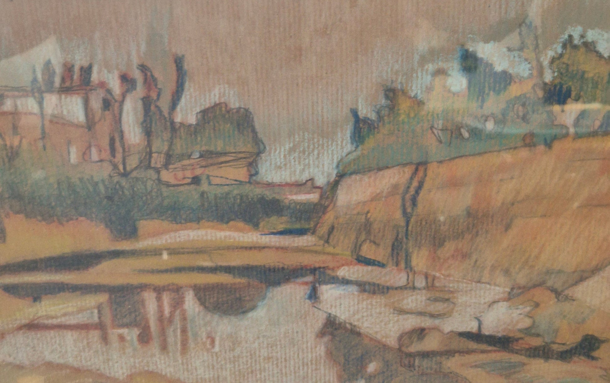 Diese stimmungsvolle Landschaftsszene zeigt ein idyllisches Flussufer mit sanften Erhebungen, spiegelnden Wasserflächen und einer zarten Andeutung von Architektur im Hintergrund. In weichen Naturtönen gehalten - Ocker, Grün, Beige und gedecktes Blau - lädt das Bild zur Ruhe und Kontemplation ein.