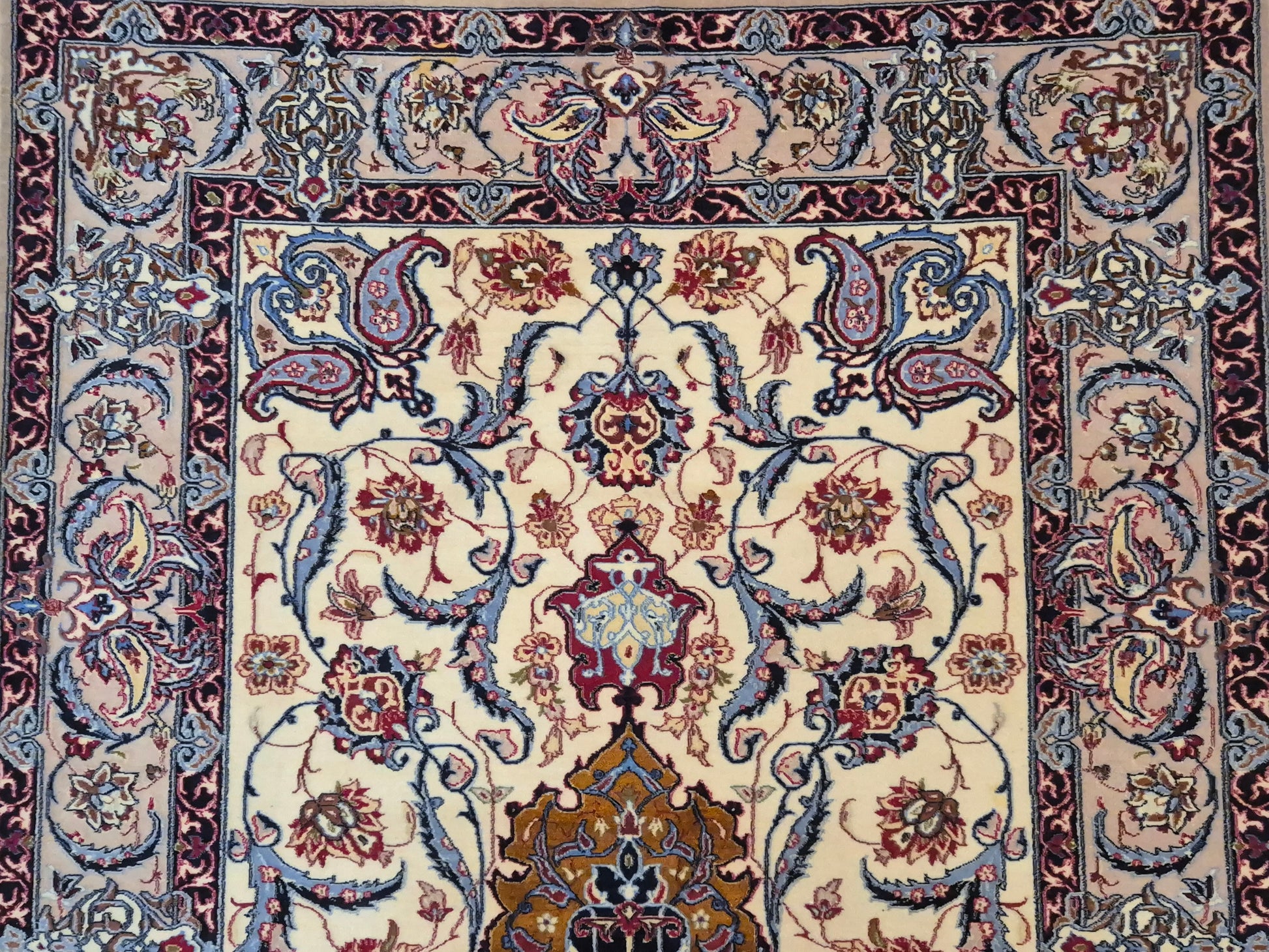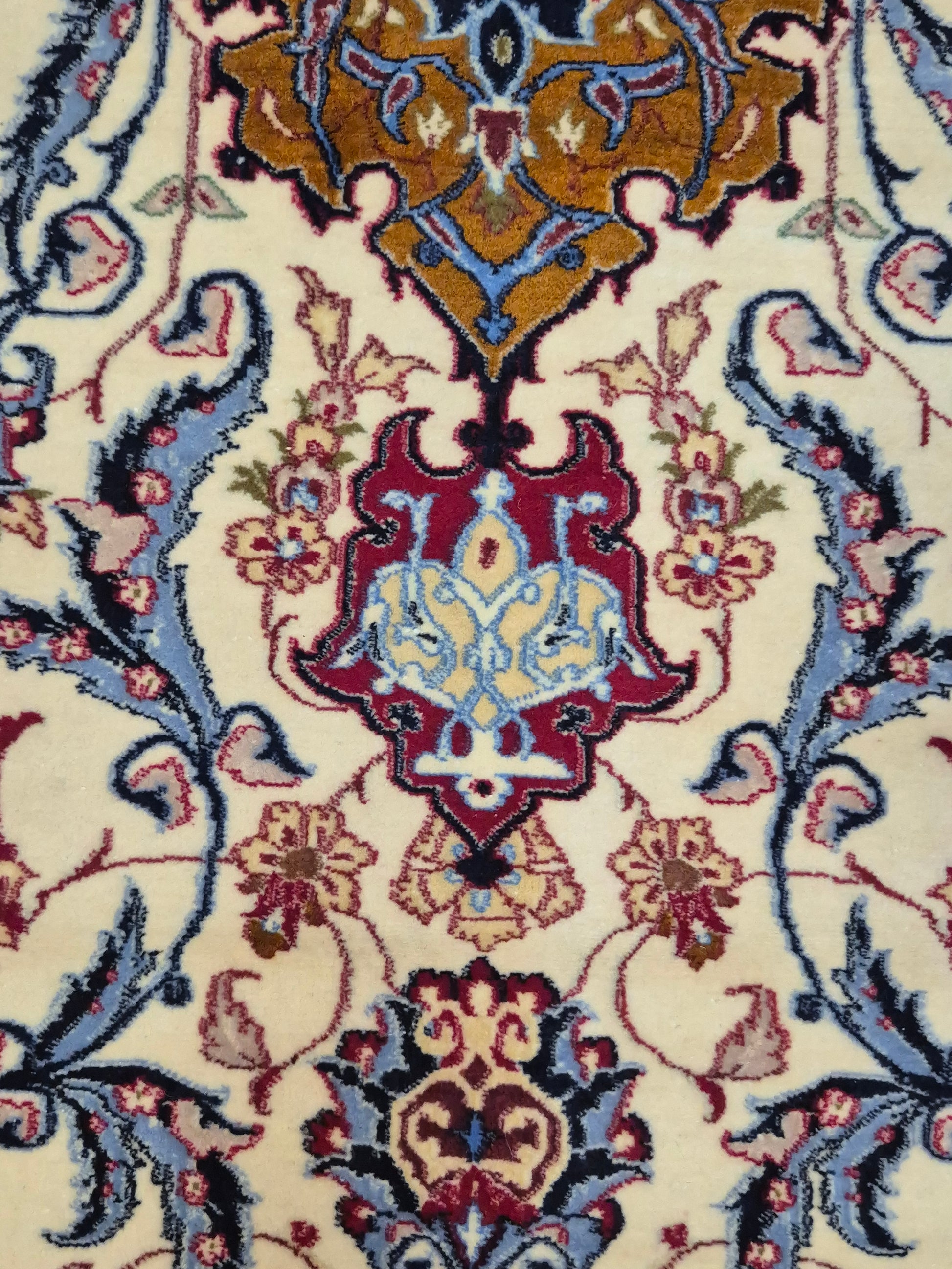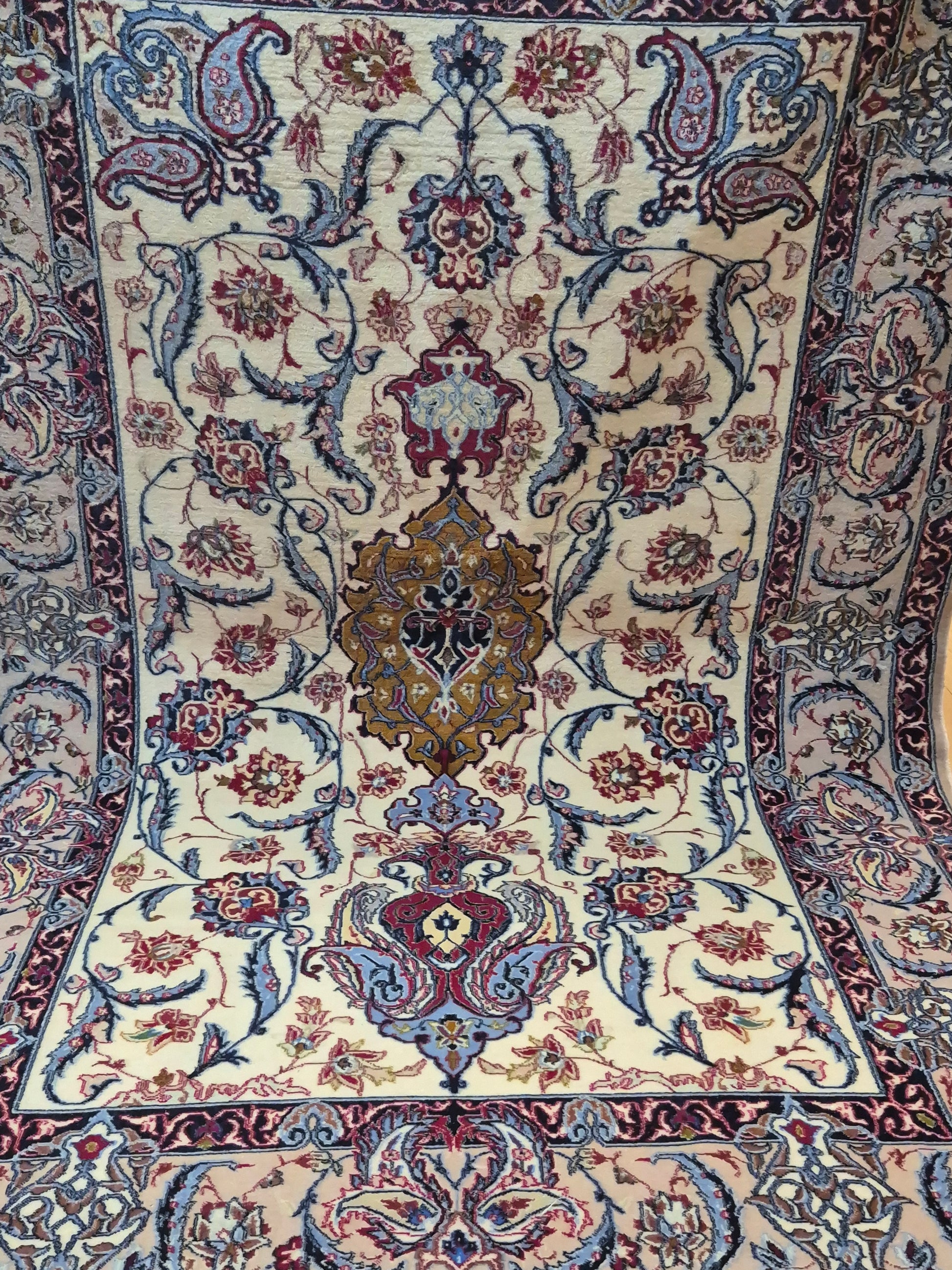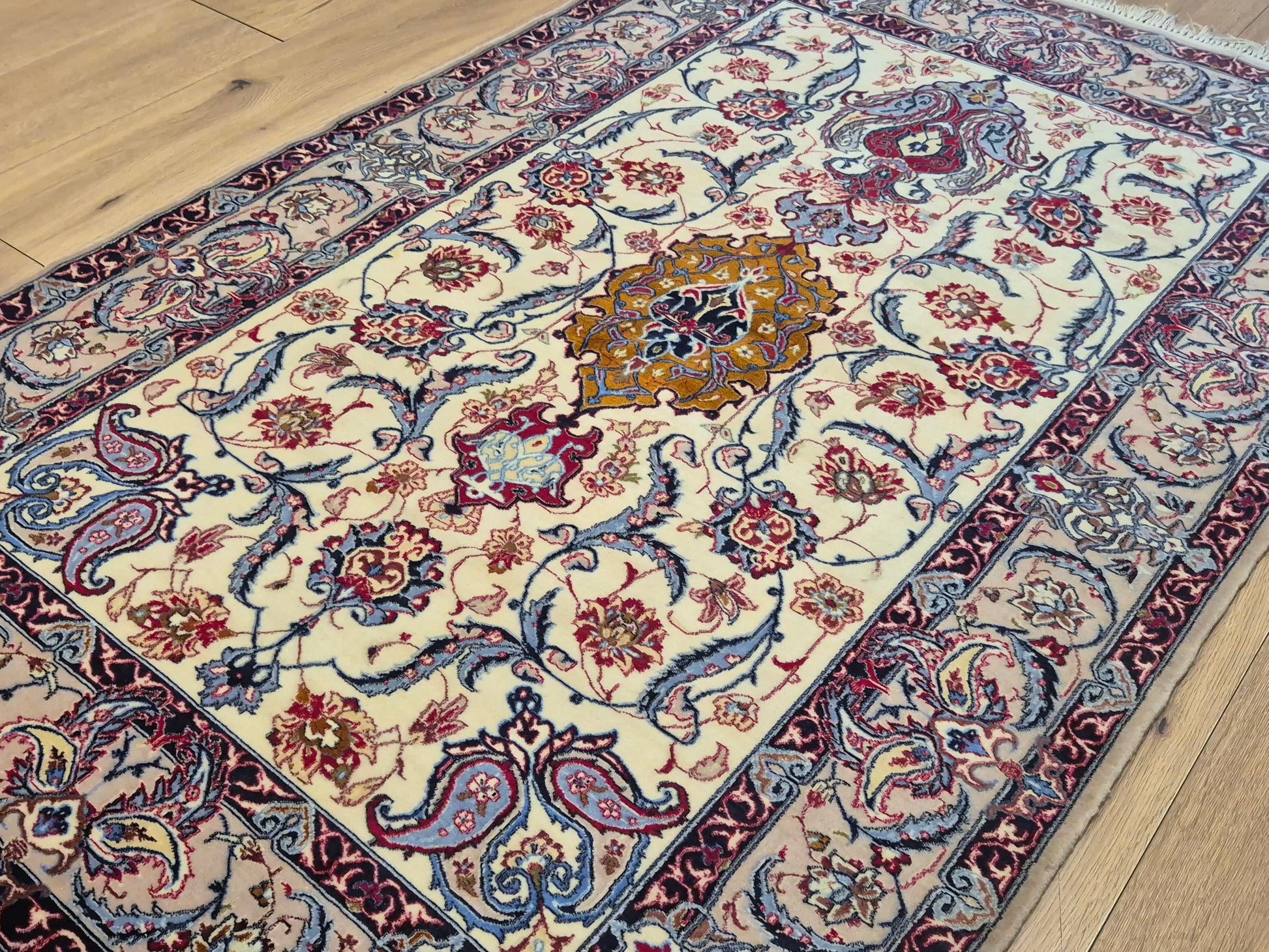 angeboten wird ein prachtvoller Isfahan Teppich aus edler Korkwolle auf Seide, fein und detailreich handgeknüpft. Im Zentrum befindet sich ein ornamentales Medaillon in Goldbraun und Bordeaux, umgeben von einem eleganten floralen Rankenwerk auf hellem Fond. Die Bordüre ist reich dekoriert mit kunstvollen Blütenornamenten und feinen Arabesken, die in harmonischen Farbkombinationen ausgeführt sind.