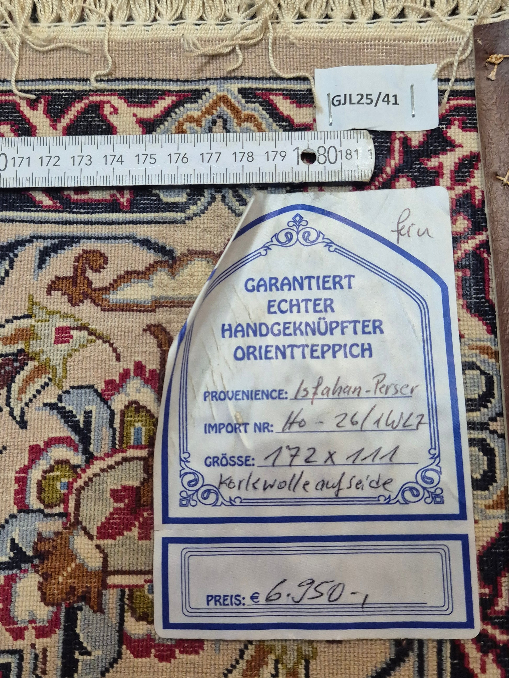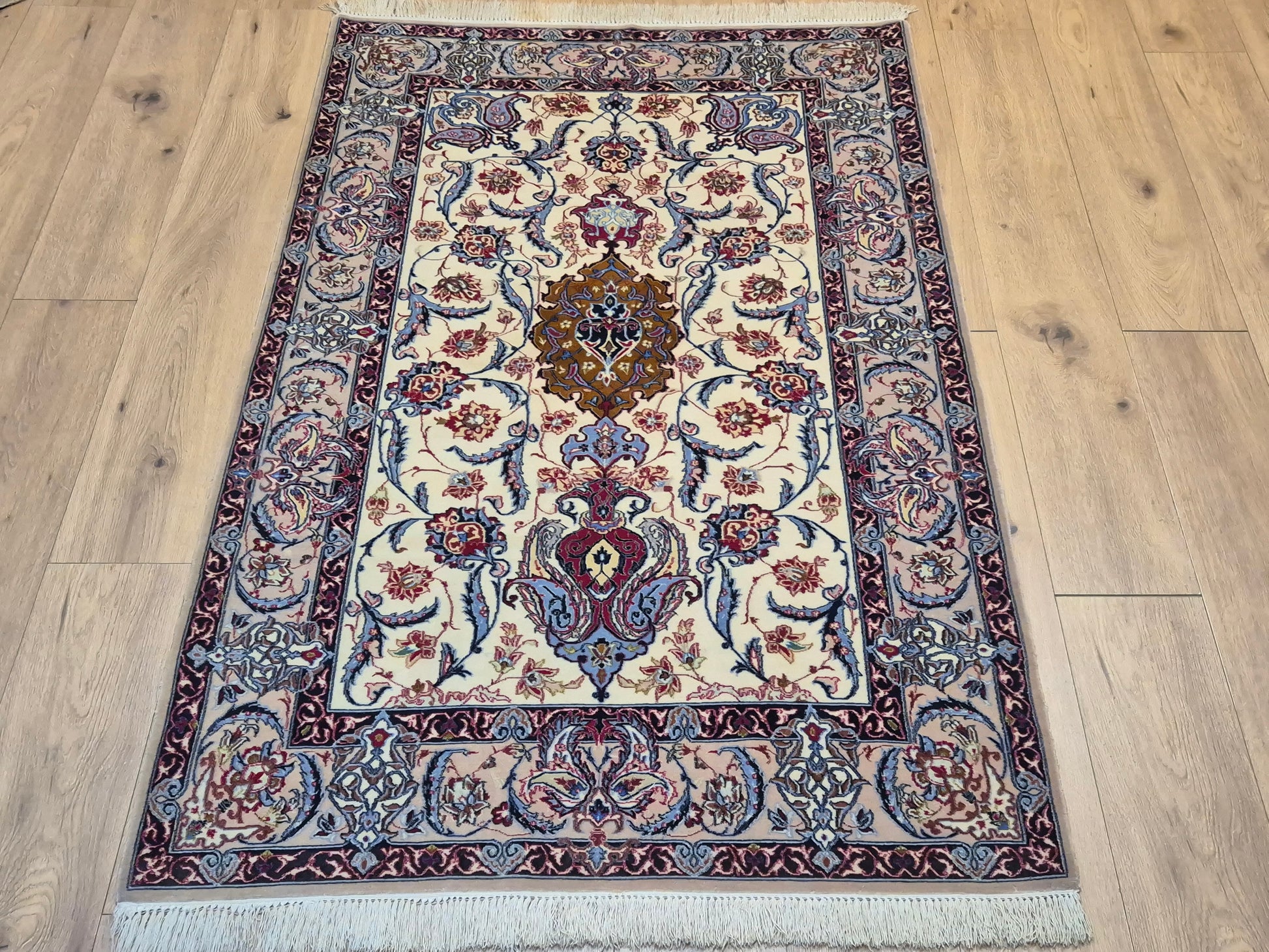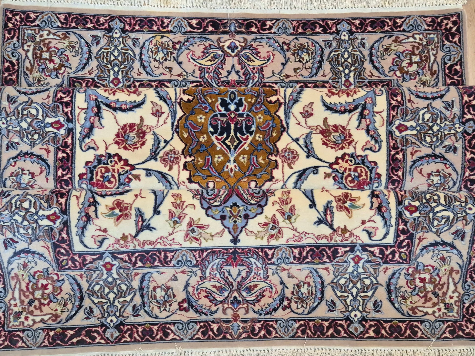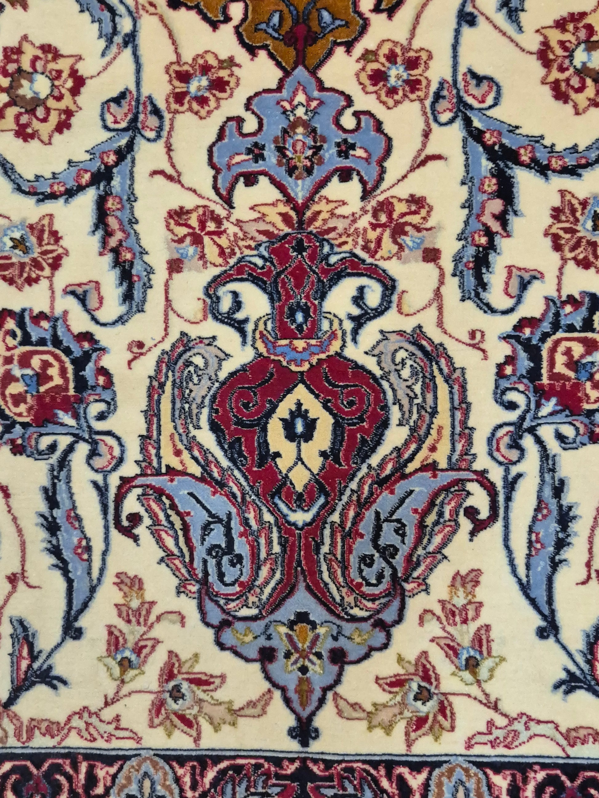 angeboten wird ein prachtvoller Isfahan Teppich aus edler Korkwolle auf Seide, fein und detailreich handgeknüpft. Im Zentrum befindet sich ein ornamentales Medaillon in Goldbraun und Bordeaux, umgeben von einem eleganten floralen Rankenwerk auf hellem Fond. Die Bordüre ist reich dekoriert mit kunstvollen Blütenornamenten und feinen Arabesken, die in harmonischen Farbkombinationen ausgeführt sind.
