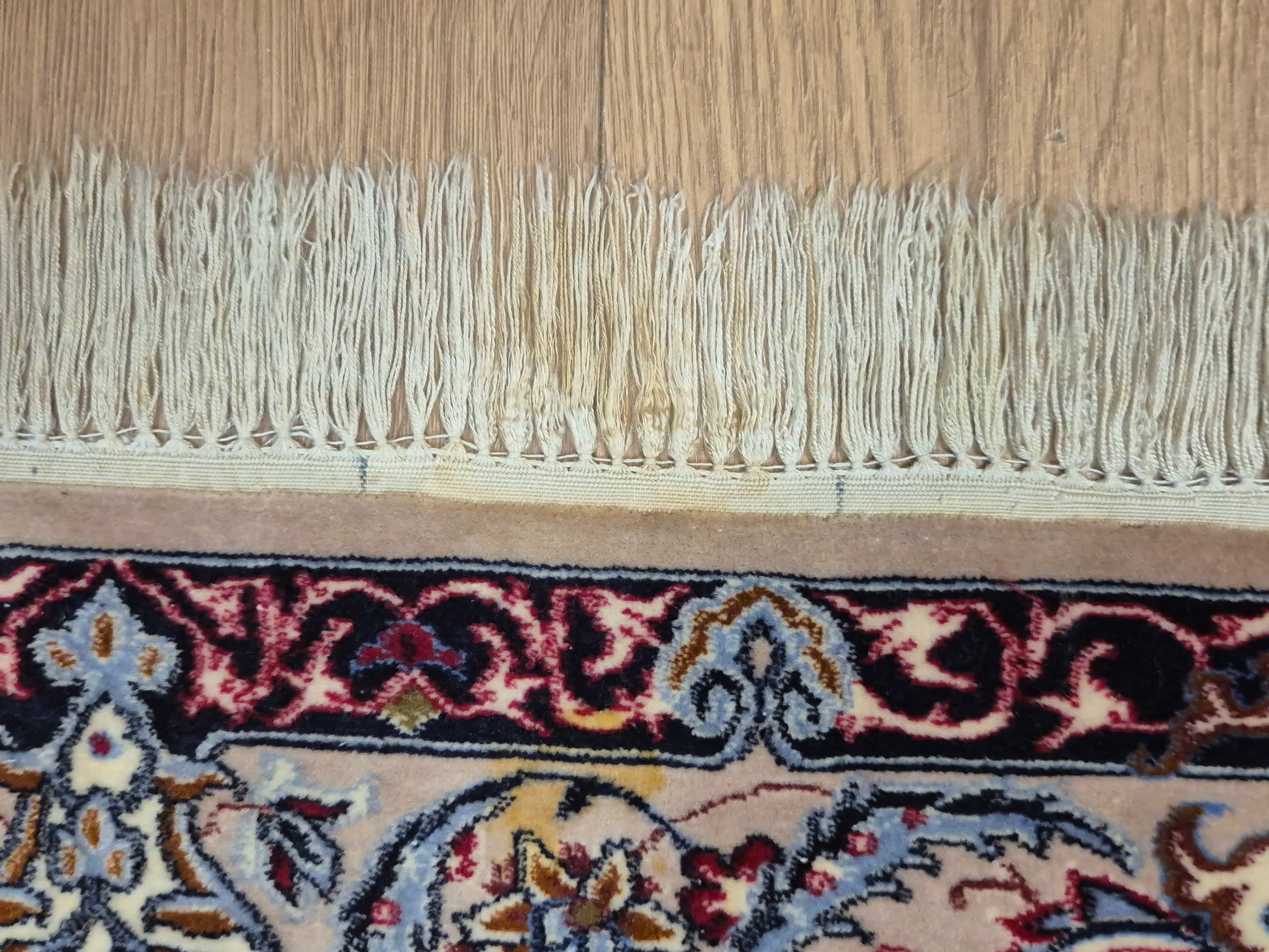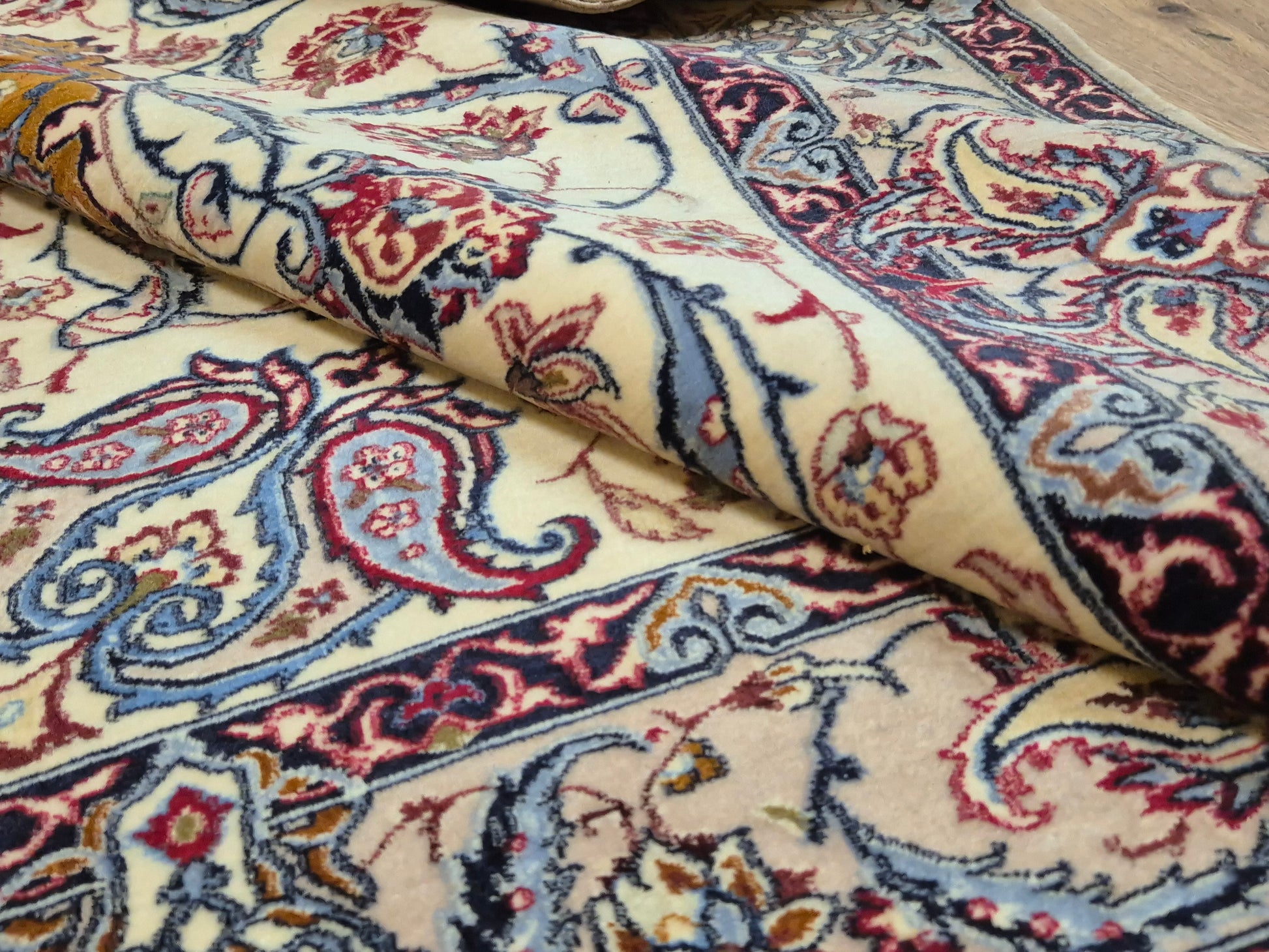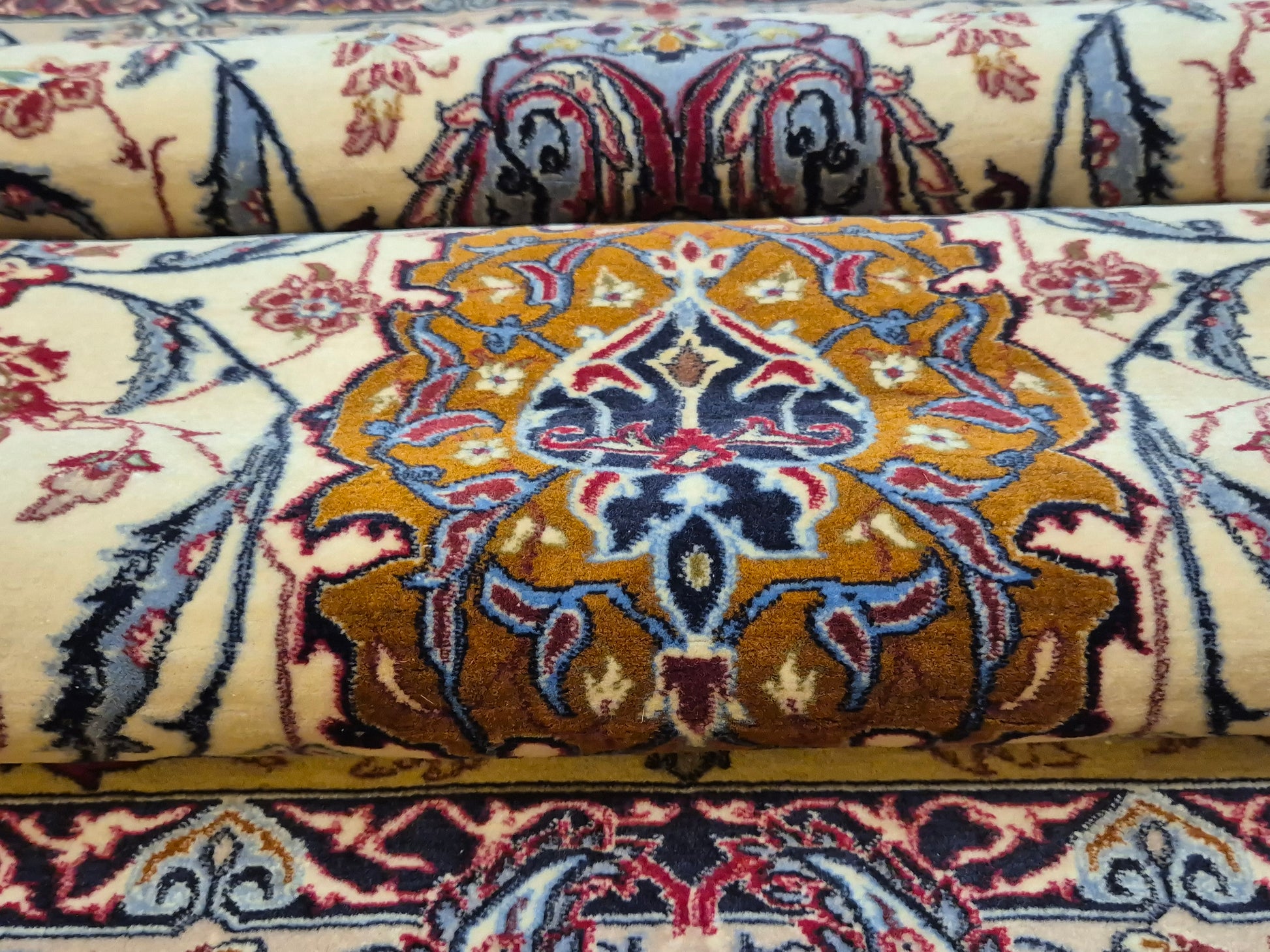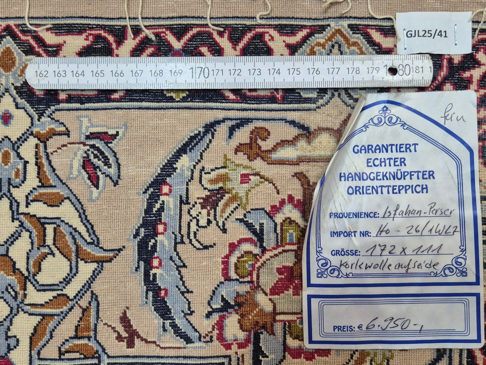 angeboten wird ein prachtvoller Isfahan Teppich aus edler Korkwolle auf Seide, fein und detailreich handgeknüpft. Im Zentrum befindet sich ein ornamentales Medaillon in Goldbraun und Bordeaux, umgeben von einem eleganten floralen Rankenwerk auf hellem Fond. Die Bordüre ist reich dekoriert mit kunstvollen Blütenornamenten und feinen Arabesken, die in harmonischen Farbkombinationen ausgeführt sind.