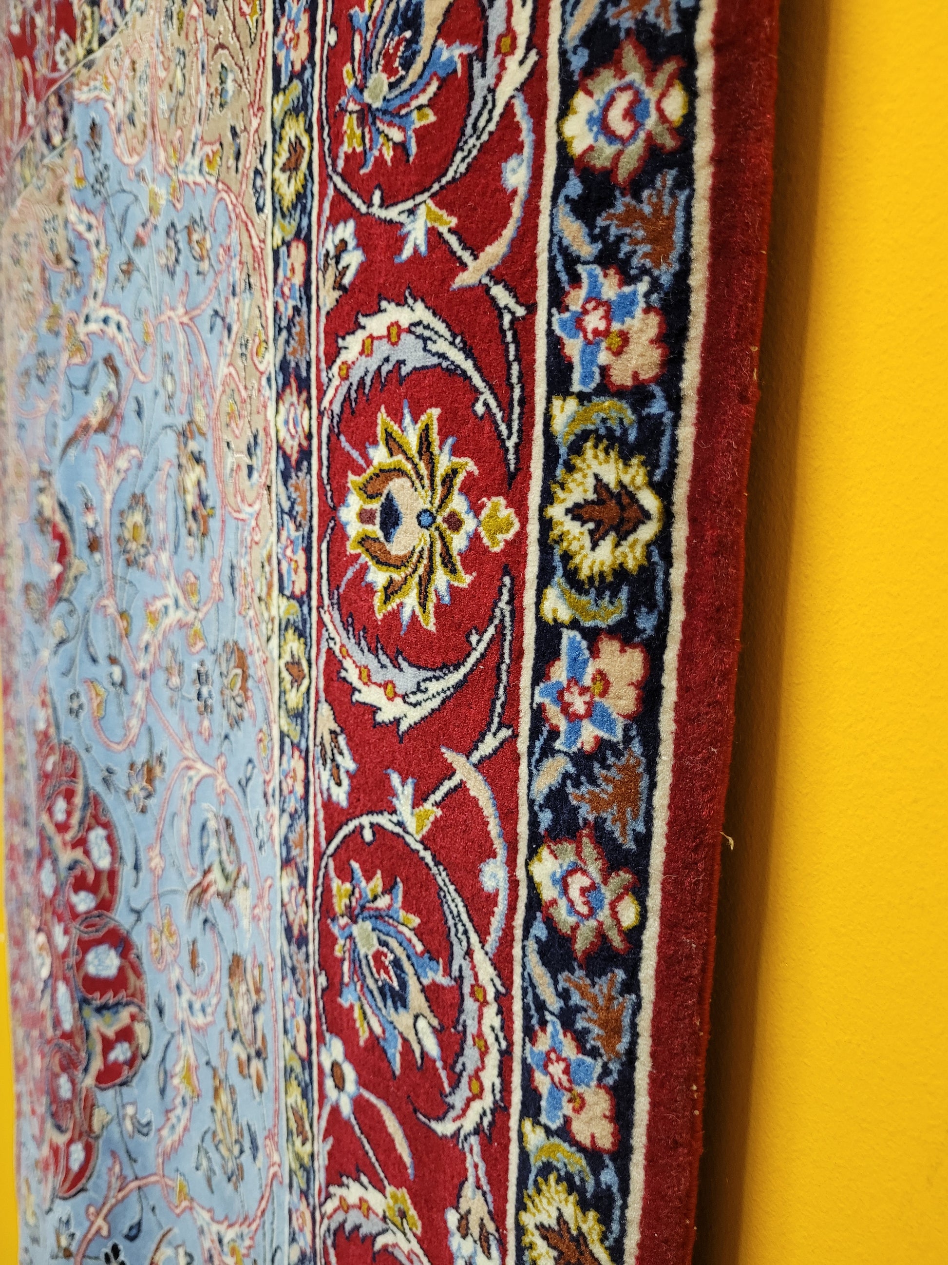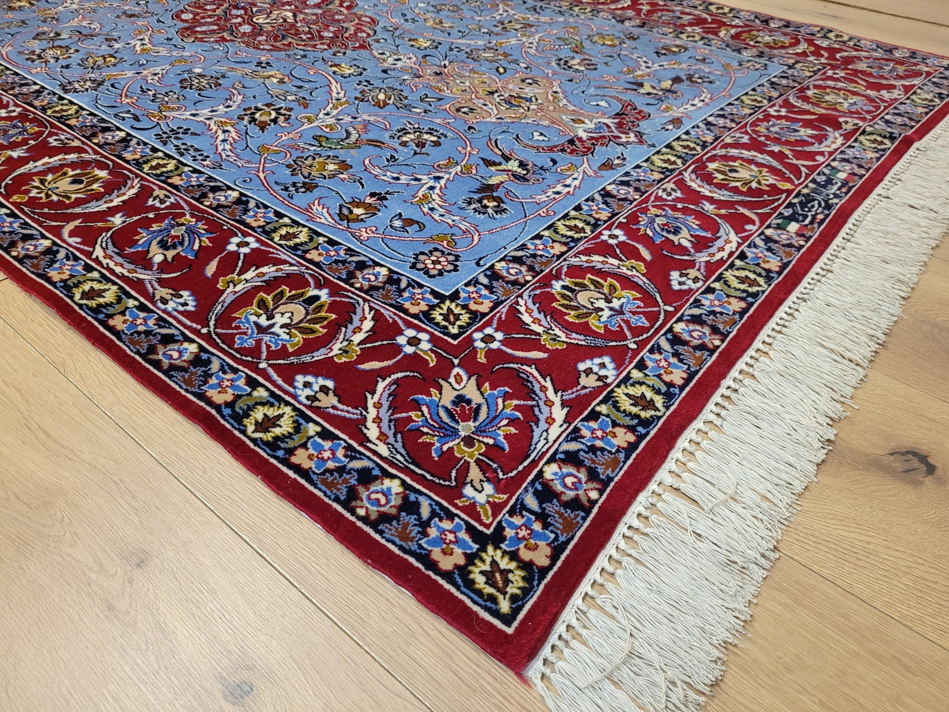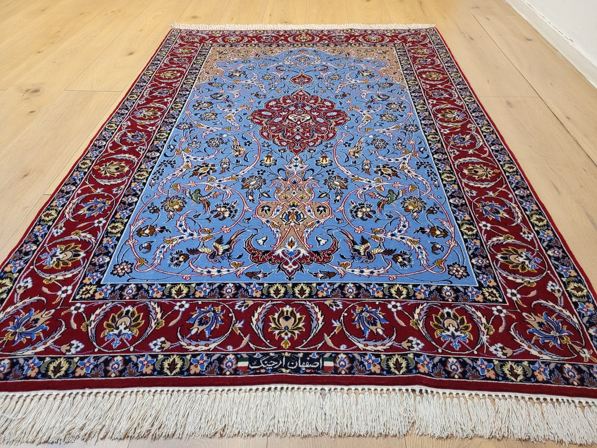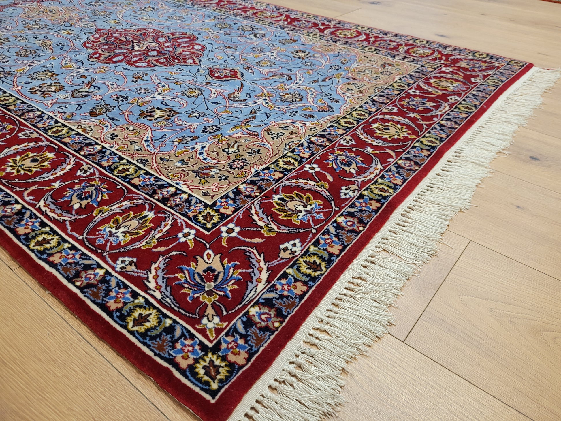 angeboten wird ein feiner Isfahan Teppich aus edler Korkwolle mit eingearbeiteten Seidenelementen, meisterhaft von Hand geknüpft. Dieser Teppich trägt eine Signatur und überzeugt durch sein klassisches orientalisches Design. Das Mittelmedaillon wird von floralen Ornamenten begleitet, wobei die harmonische Farbkombination aus hellem Blau und kräftigem Rot für besondere Strahlkraft sorgt. Eine detailreiche Bordüre rundet die elegante Komposition ab.