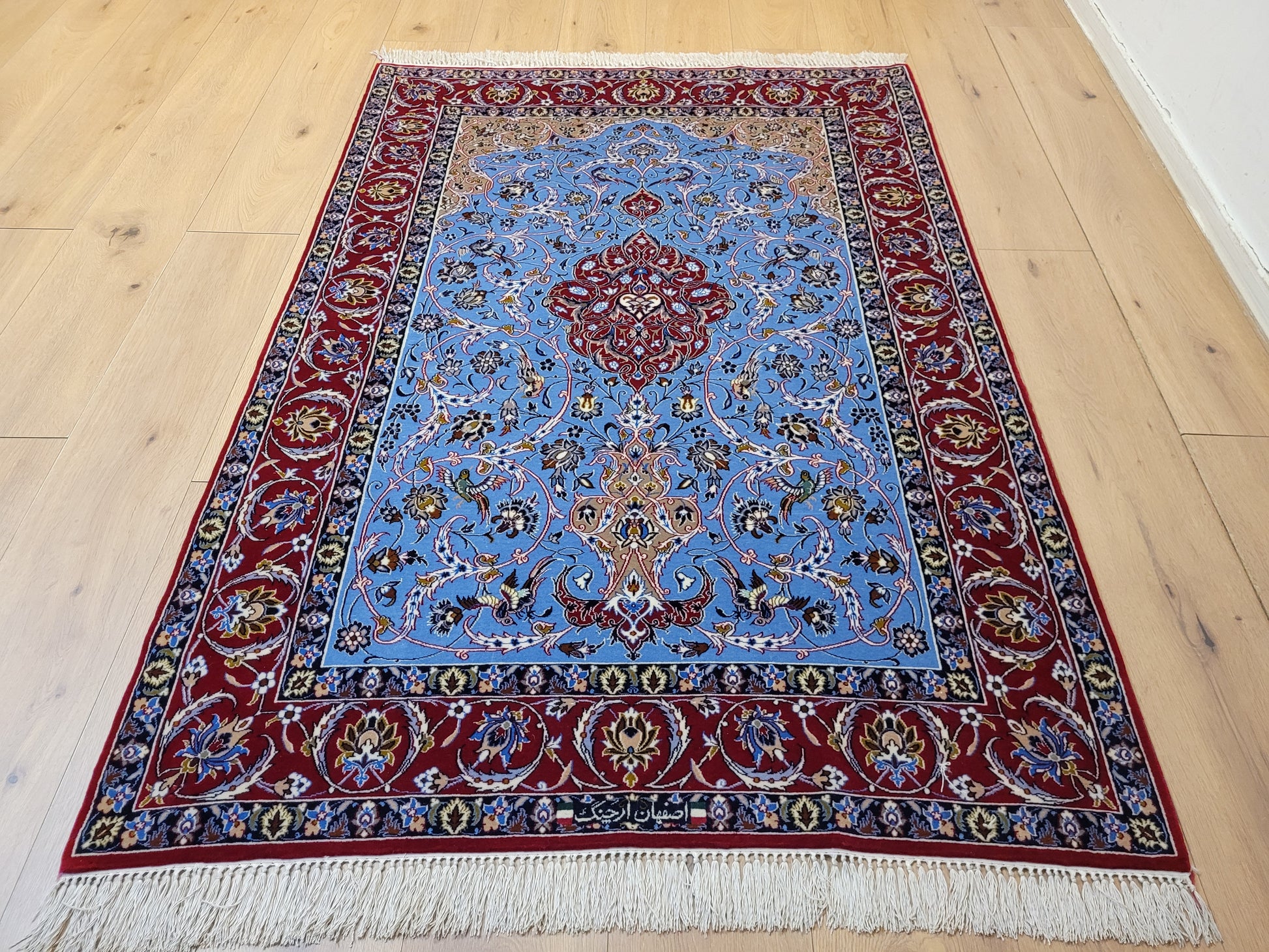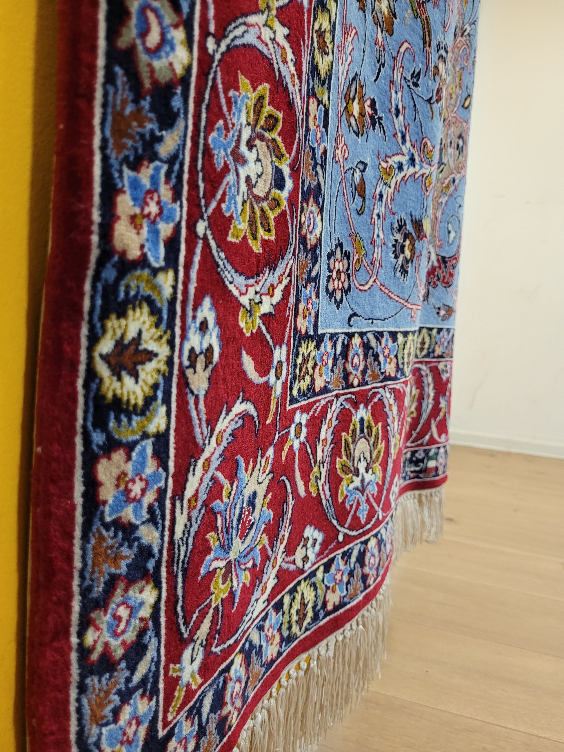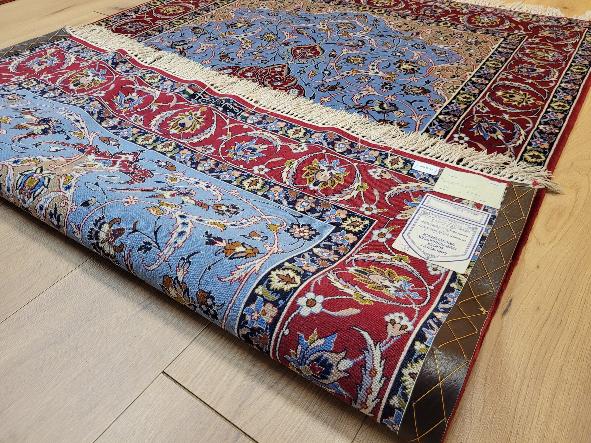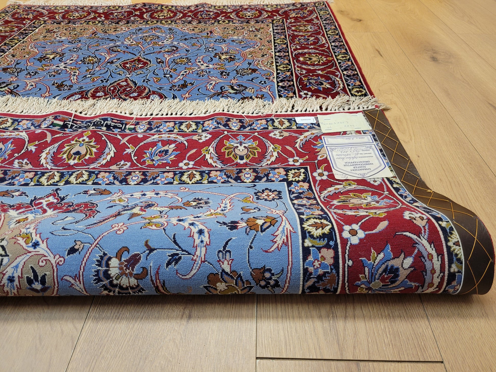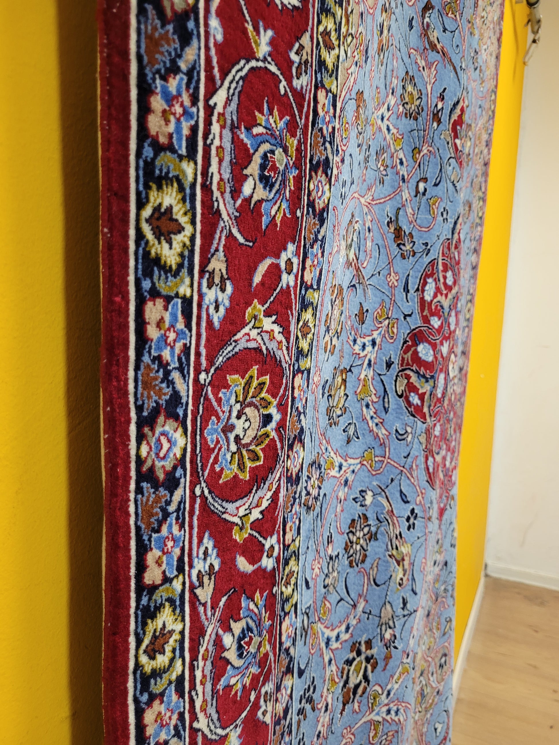 angeboten wird ein feiner Isfahan Teppich aus edler Korkwolle mit eingearbeiteten Seidenelementen, meisterhaft von Hand geknüpft. Dieser Teppich trägt eine Signatur und überzeugt durch sein klassisches orientalisches Design. Das Mittelmedaillon wird von floralen Ornamenten begleitet, wobei die harmonische Farbkombination aus hellem Blau und kräftigem Rot für besondere Strahlkraft sorgt. Eine detailreiche Bordüre rundet die elegante Komposition ab.