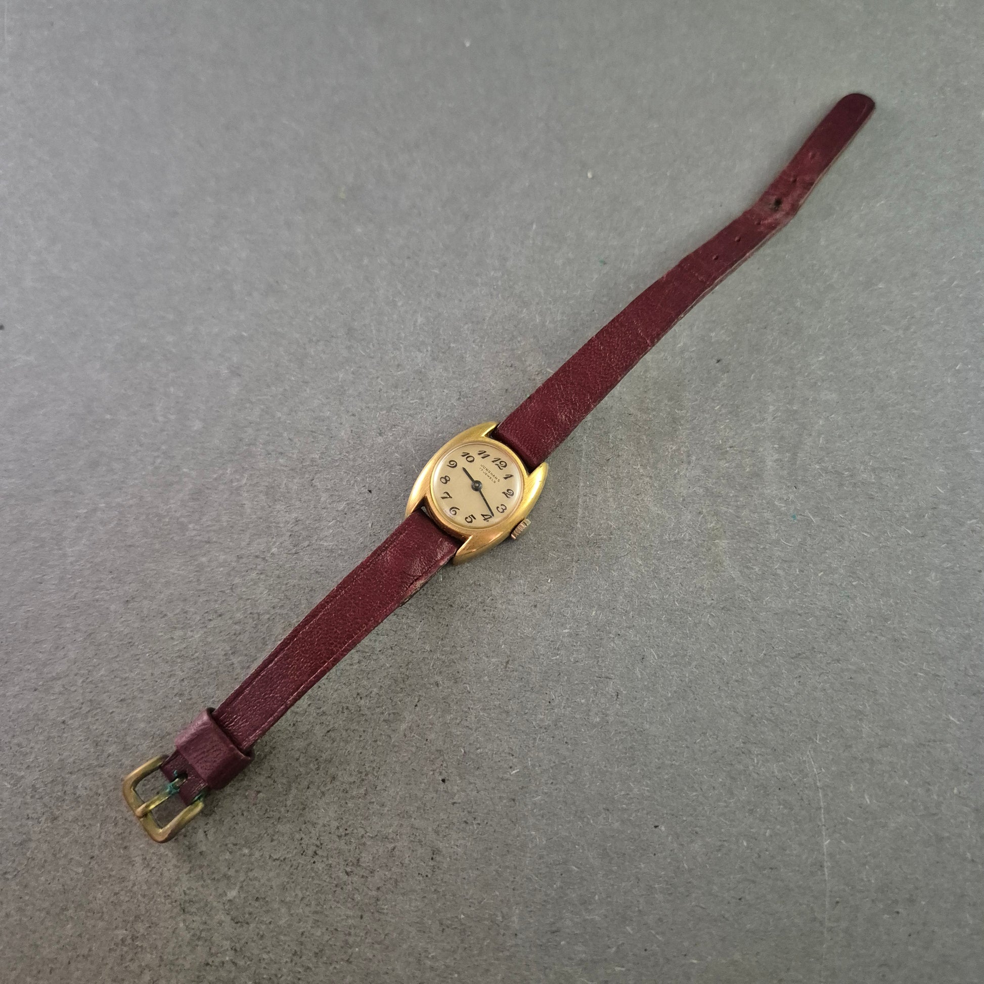 Material: Vergoldetes Gehäuse, Edelstahlboden, Lederarmband