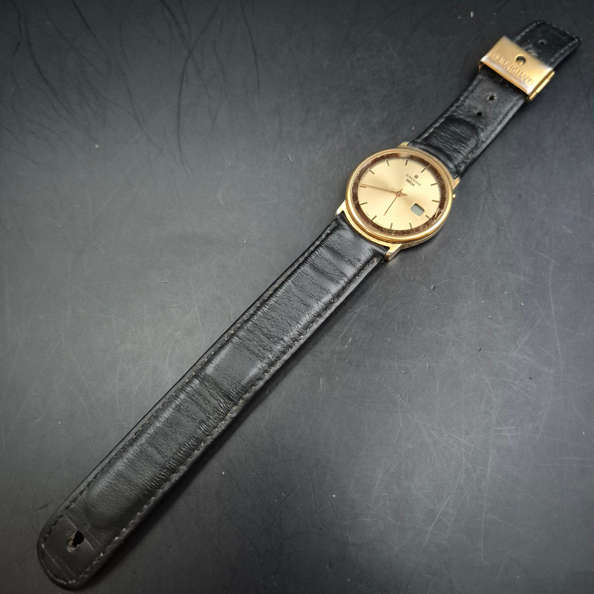 Diese klassische Herren Uhr der renommierten Marke Junghans präsentiert sich im eleganten Design mit goldfarbenem Gehäuse und schlichtem Zifferblatt. Die Uhr gehört zur „Mega“-Reihe, bekannt für ihre Funktechnologie und Präzision. Das schwarze Echtlederarmband sorgt für angenehmen Tragekomfort. Wichtiger Hinweis: Die Uhr ist aktuell nicht funktionsfähig.