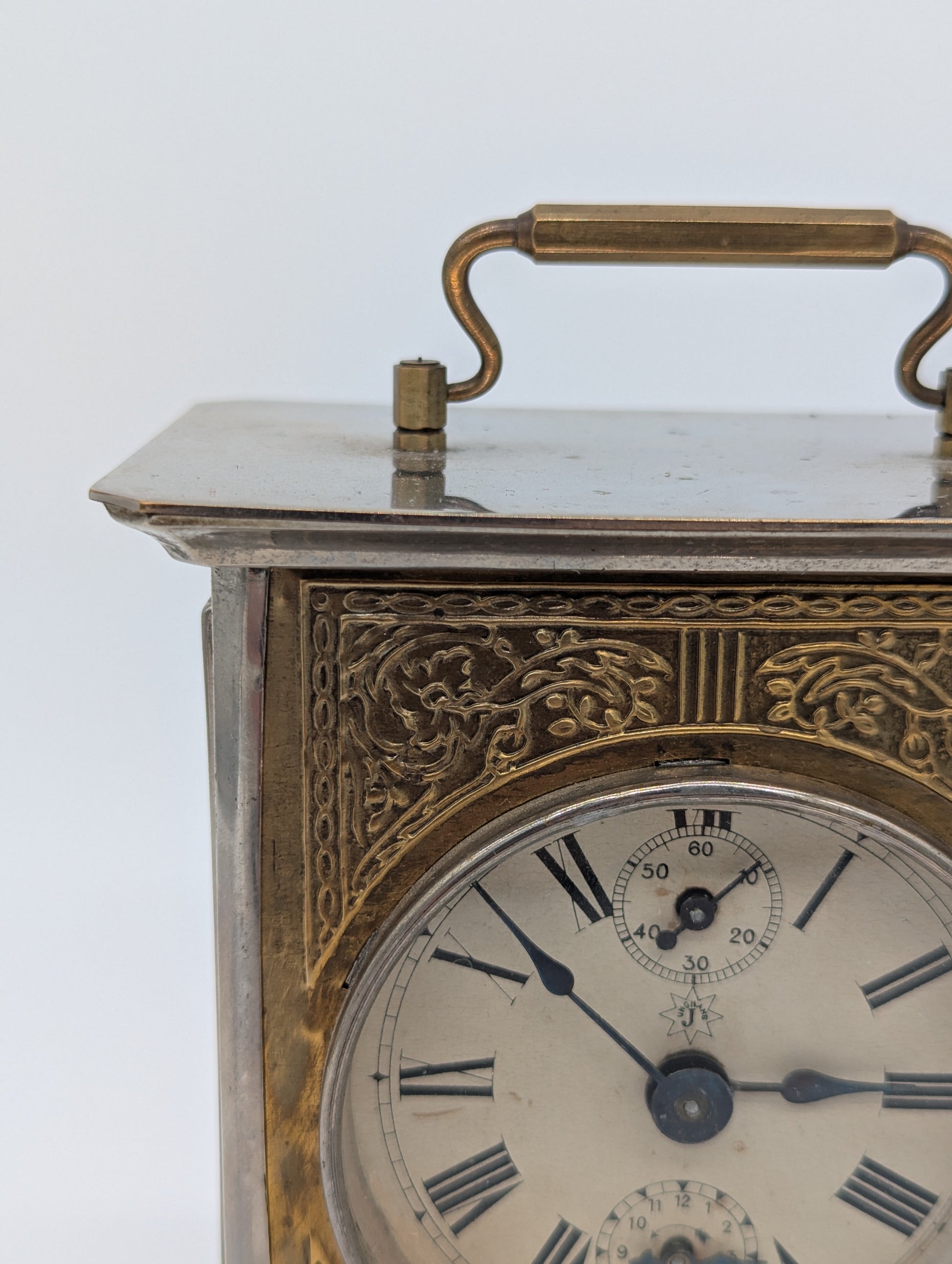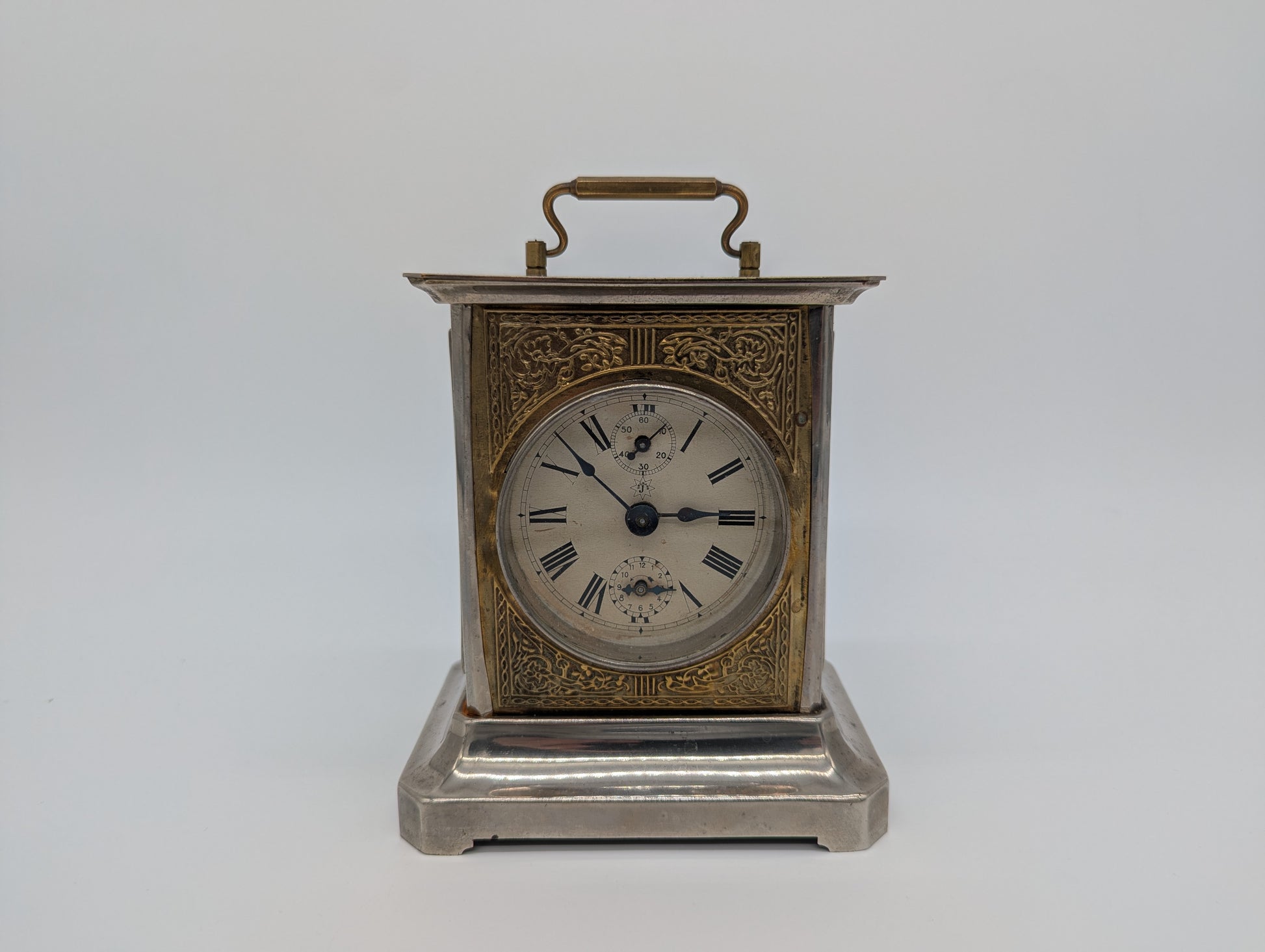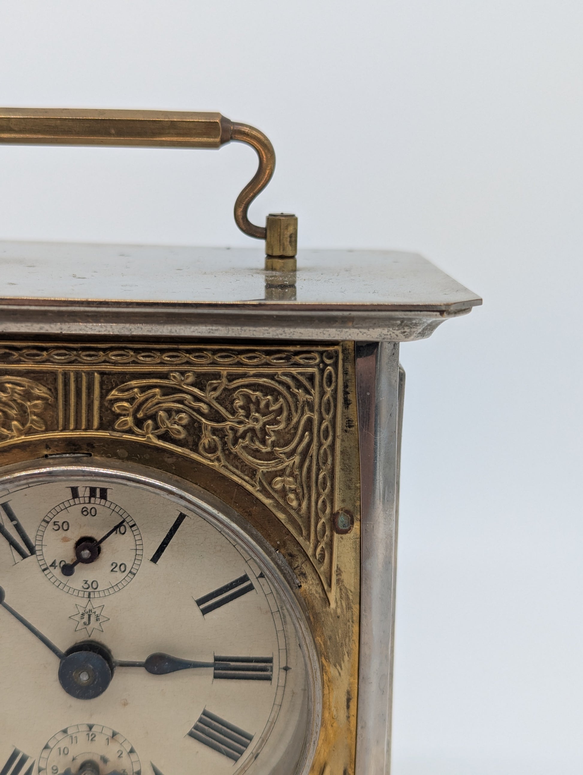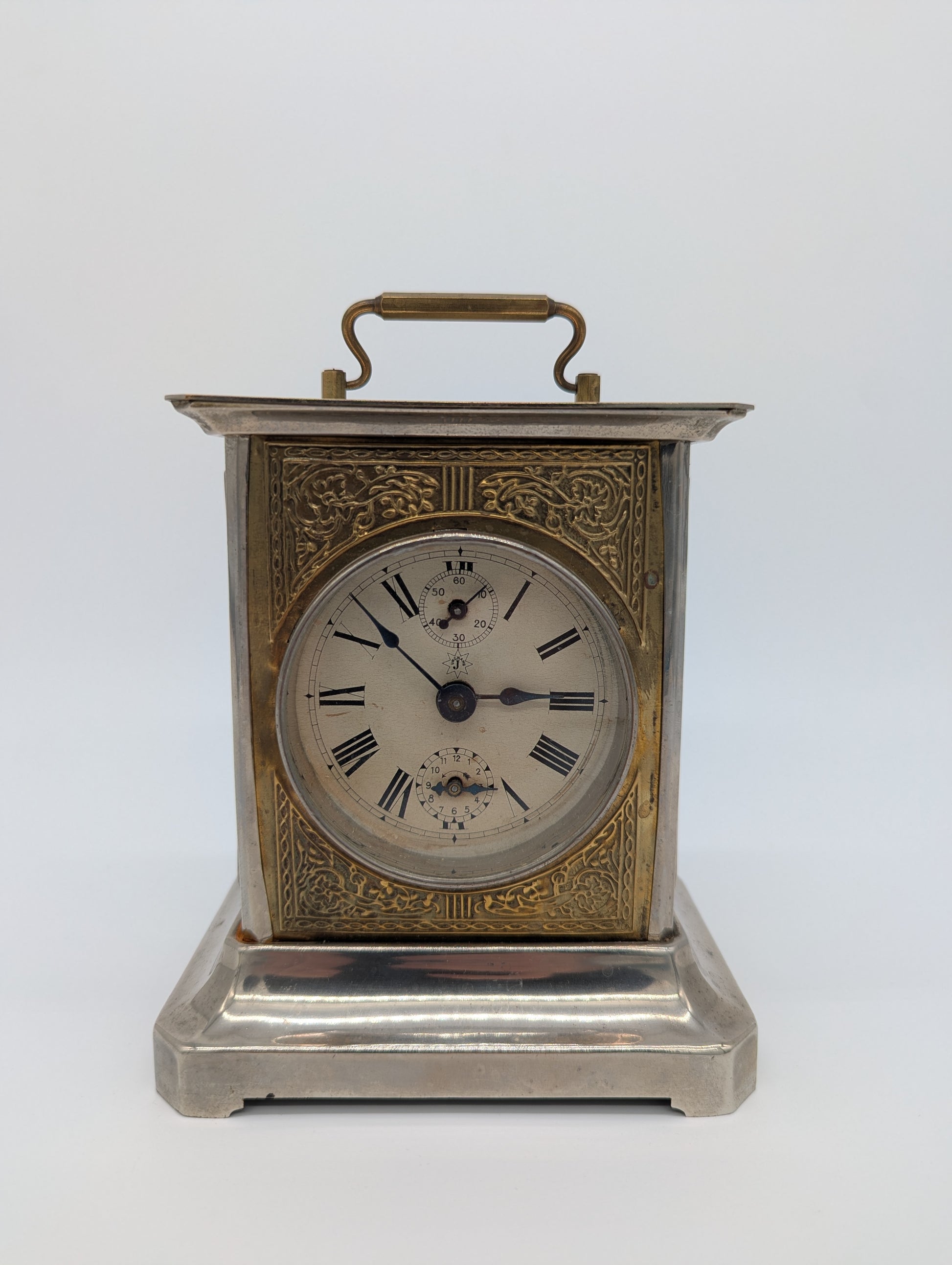 Angeboten wird eine antike Tischuhr der renommierten Marke Junghans, gefertigt in Deutschland. Die Uhr ist im Stil einer klassischen Kutschenuhr gehalten und besticht durch ihr massives Metallgehäuse mit einem versilberten Sockel sowie einem reich verzierten Messingrahmen rund um das Zifferblatt. Auf der Oberseite befindet sich ein Tragegriff aus Messing, der die Uhr zusätzlich ziert.