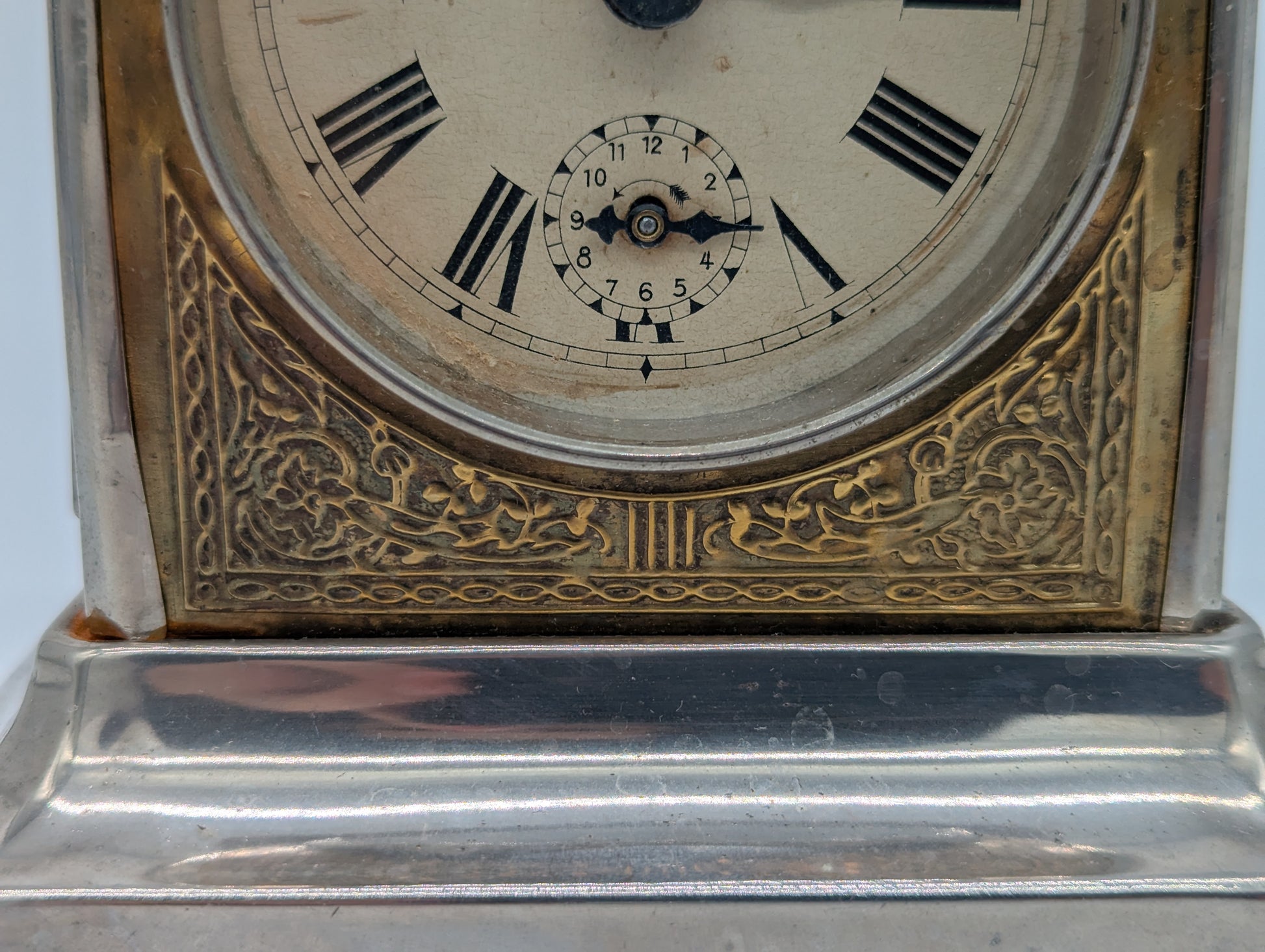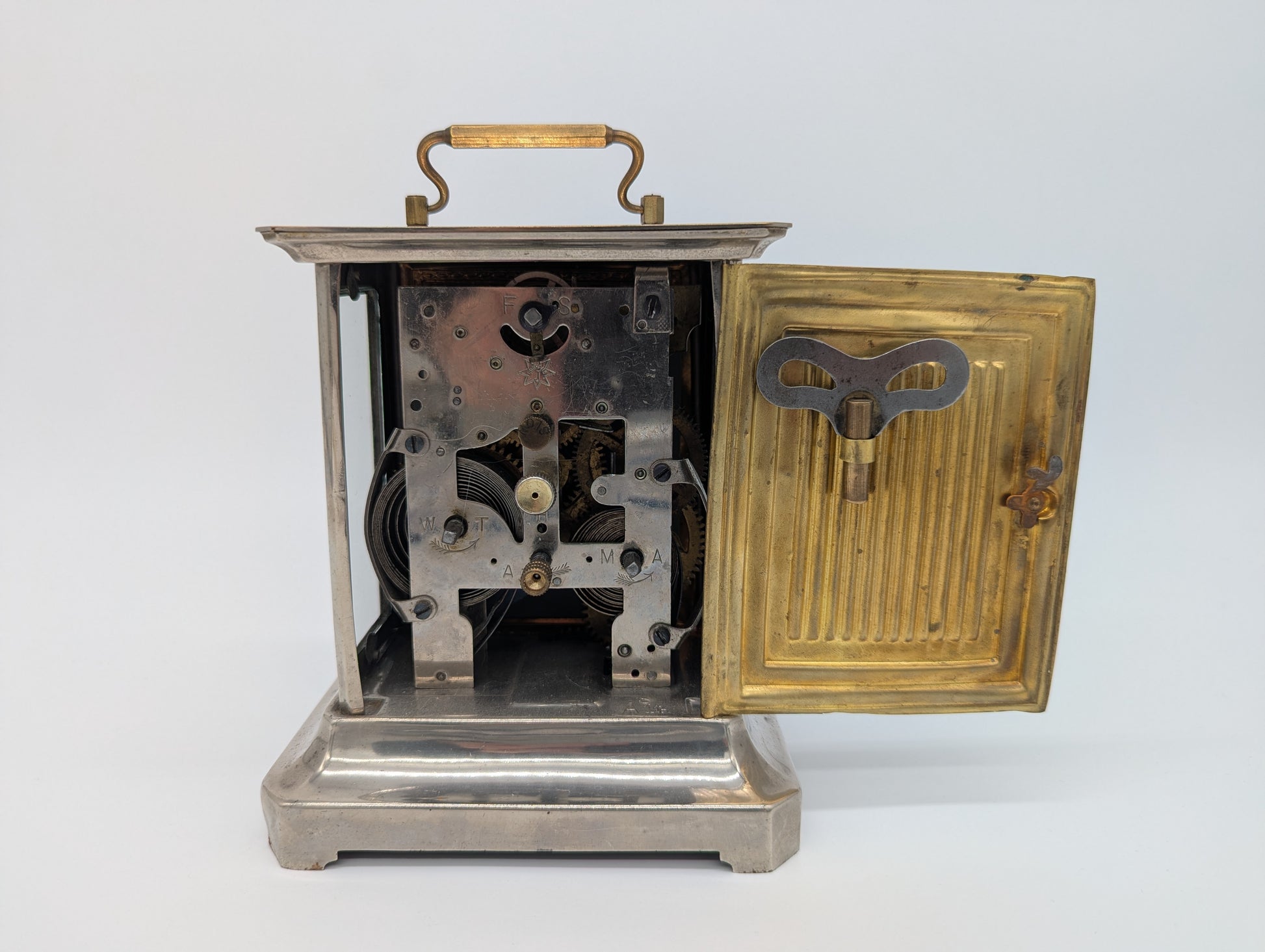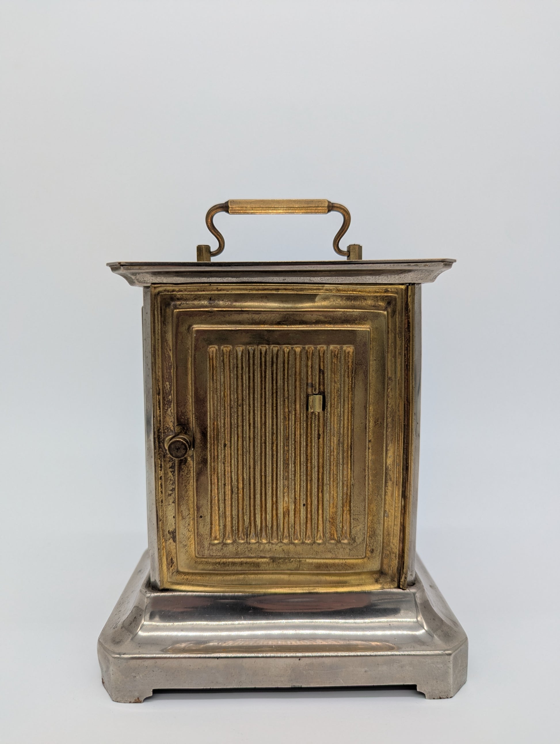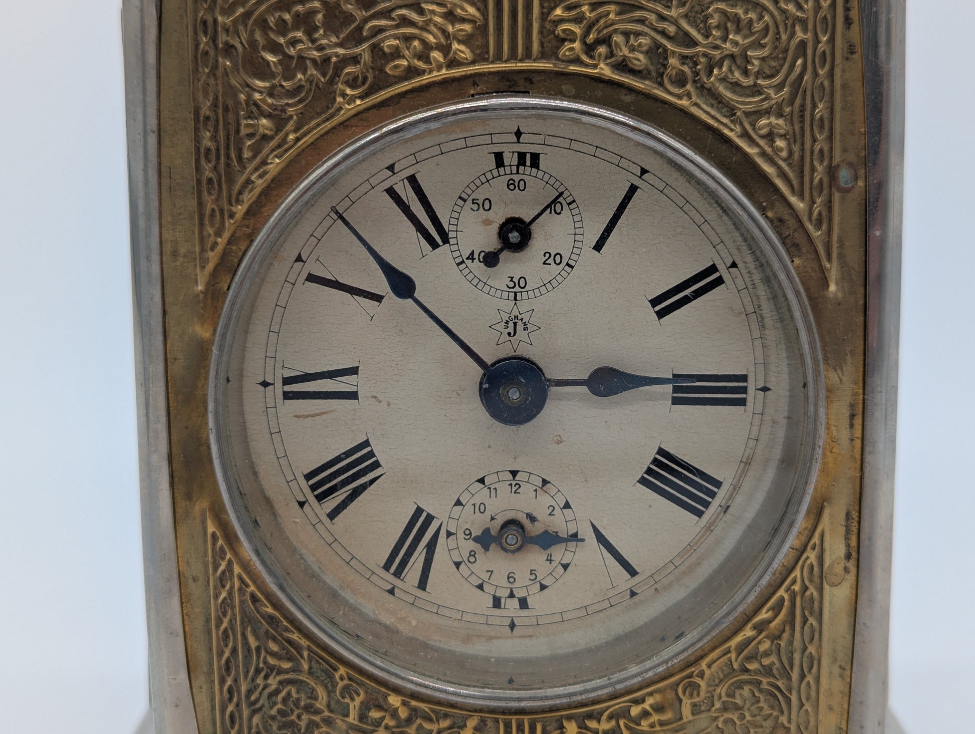 Angeboten wird eine antike Tischuhr der renommierten Marke Junghans, gefertigt in Deutschland. Die Uhr ist im Stil einer klassischen Kutschenuhr gehalten und besticht durch ihr massives Metallgehäuse mit einem versilberten Sockel sowie einem reich verzierten Messingrahmen rund um das Zifferblatt. Auf der Oberseite befindet sich ein Tragegriff aus Messing, der die Uhr zusätzlich ziert.